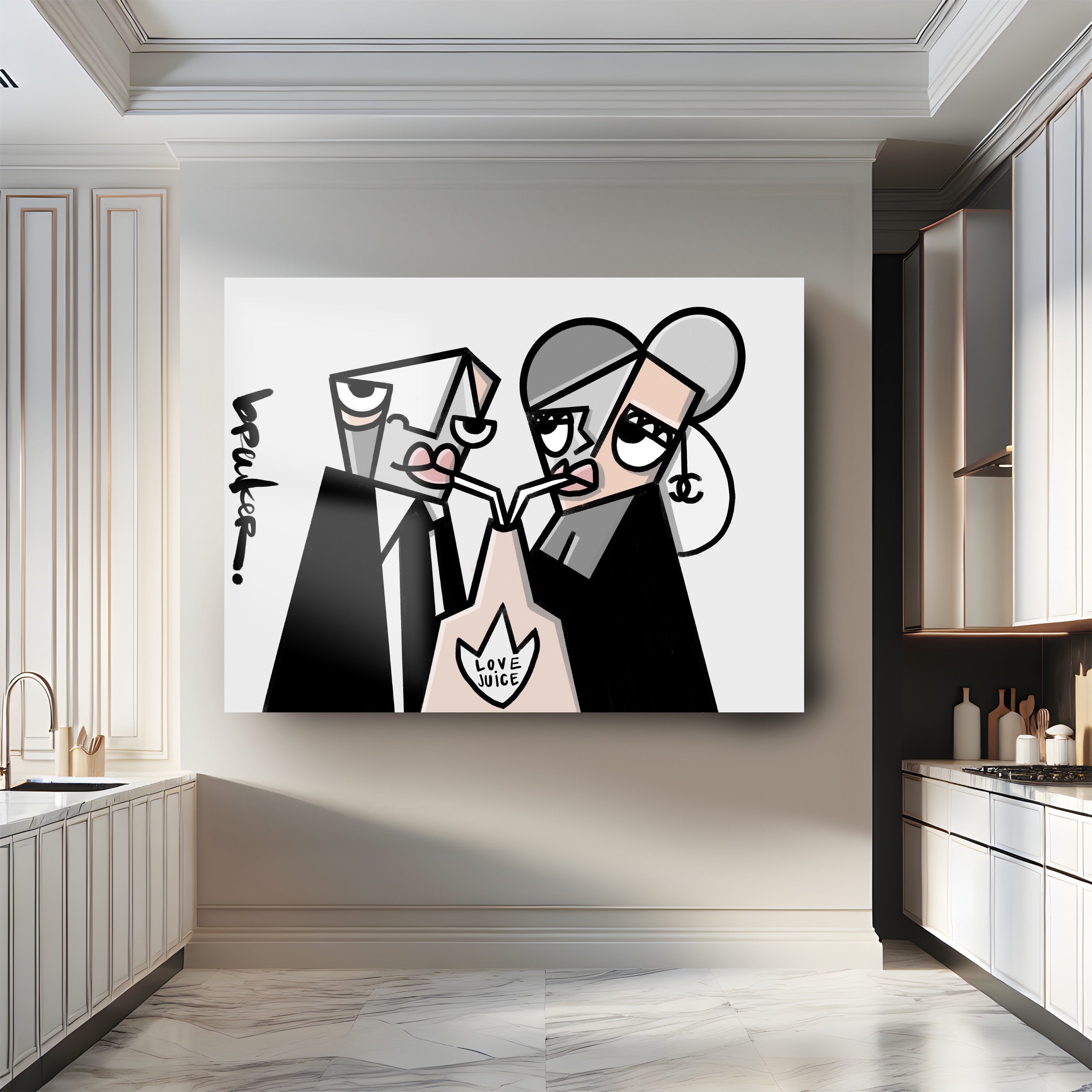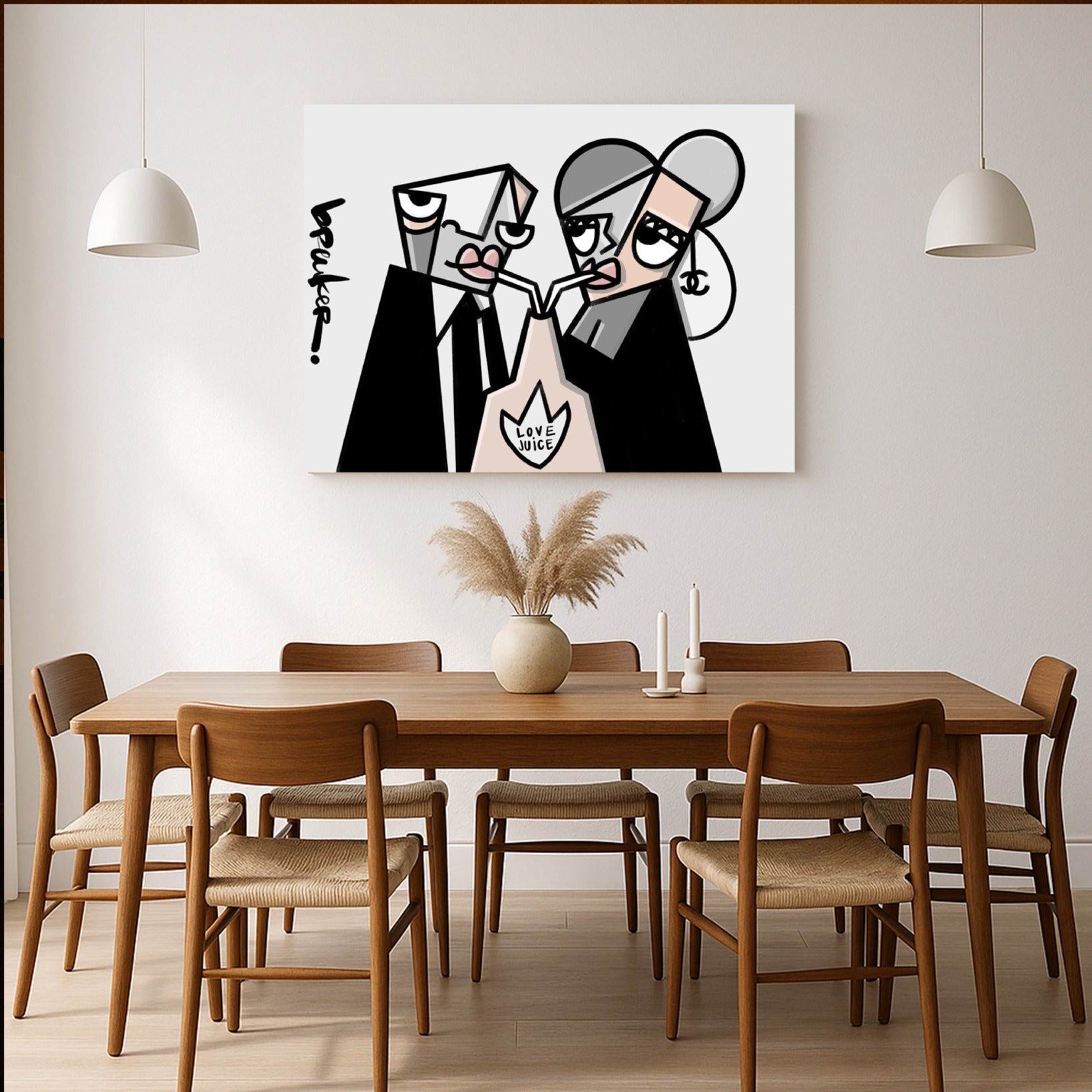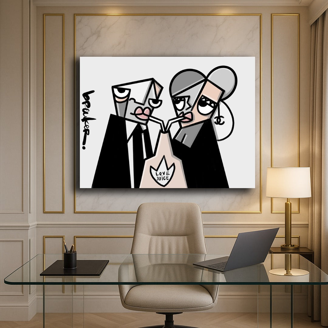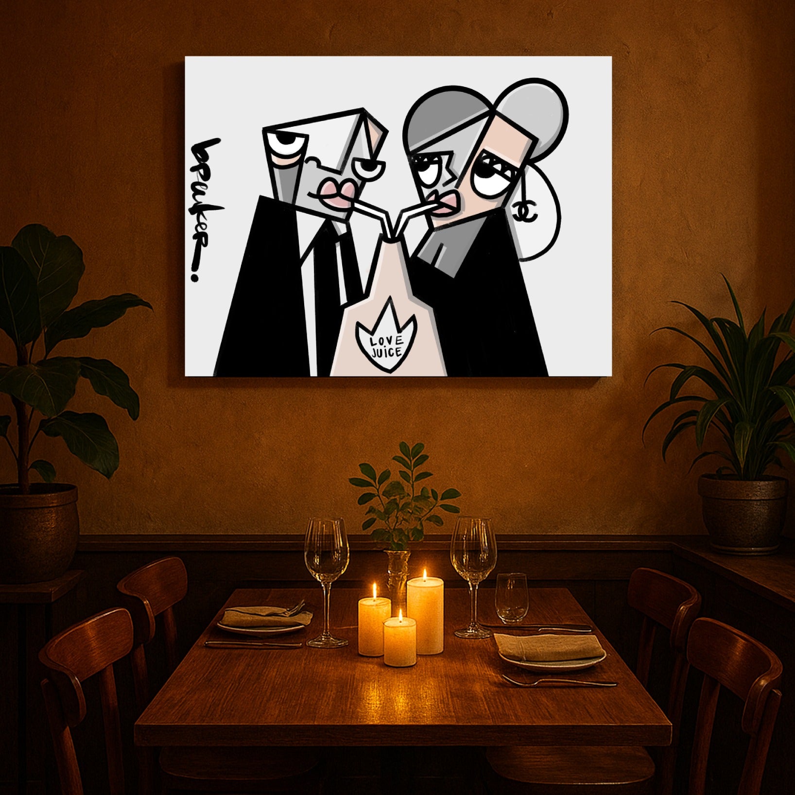 Love Juice is een werk uit de Le Ligne-collectie waarin intimiteit niet wordt uitgelegd, maar gesuggereerd. Twee figuren, opgebouwd uit strakke lijnen en geometrische vormen, leunen naar elkaar toe. Hun lichamen raken elkaar nauwelijks, maar de spanning is voelbaar.