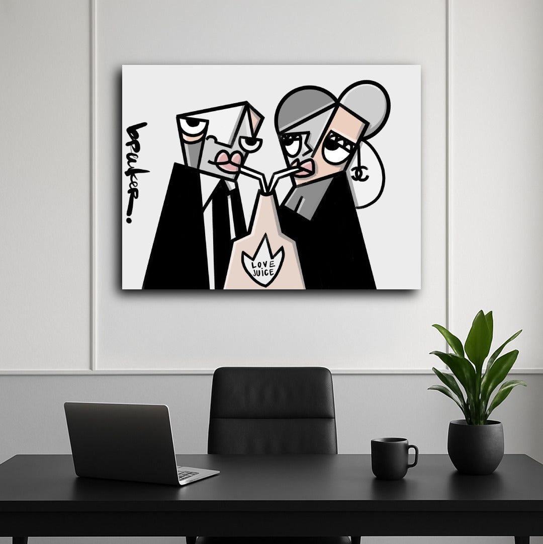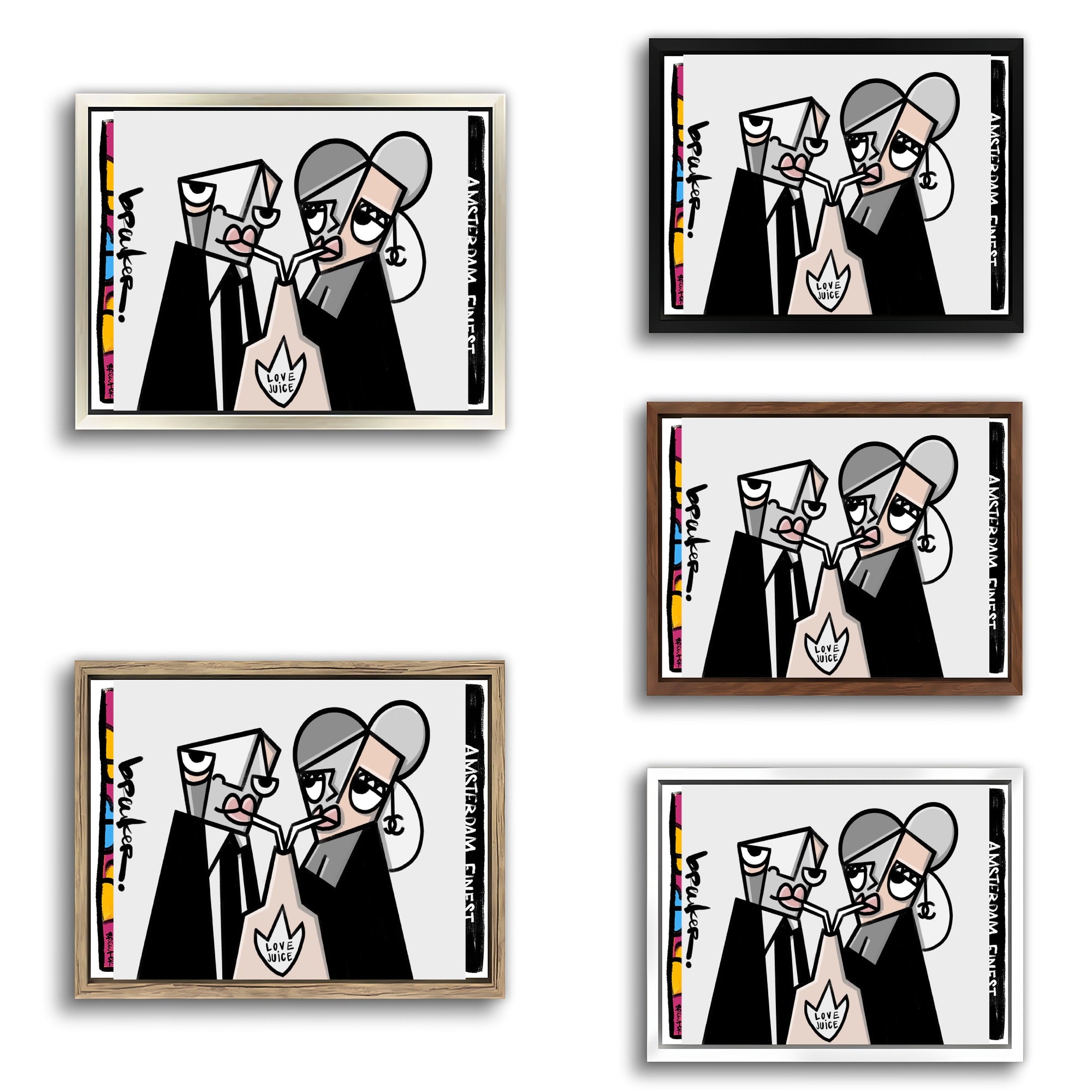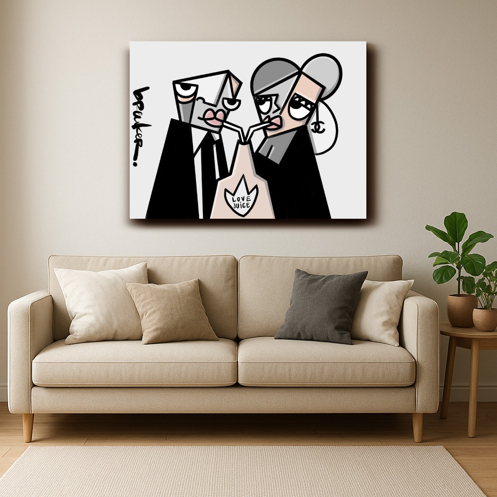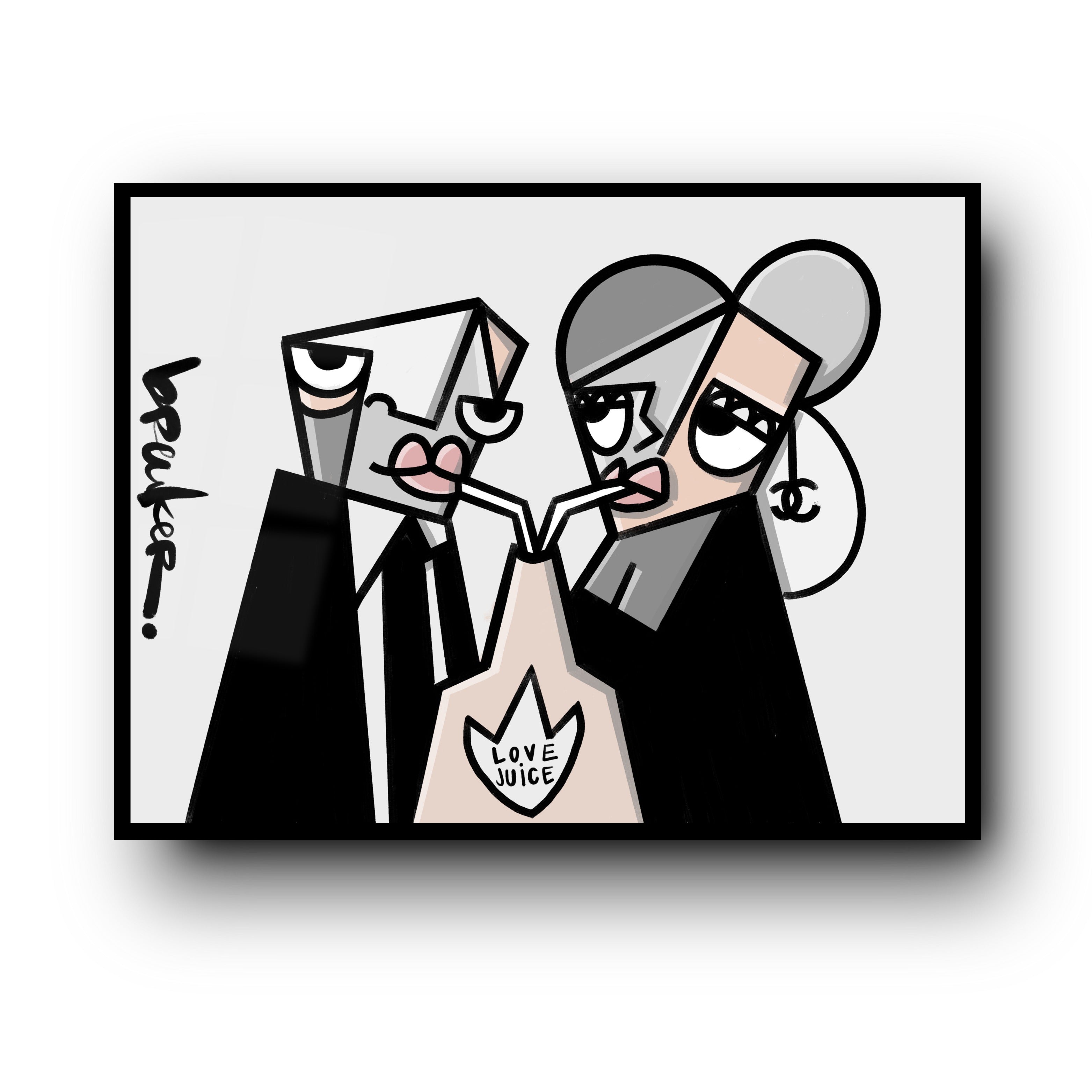 Love Juice is een werk uit de Le Ligne-collectie waarin intimiteit niet wordt uitgelegd, maar gesuggereerd. Twee figuren, opgebouwd uit strakke lijnen en geometrische vormen, leunen naar elkaar toe. Hun lichamen raken elkaar nauwelijks, maar de spanning is voelbaar.