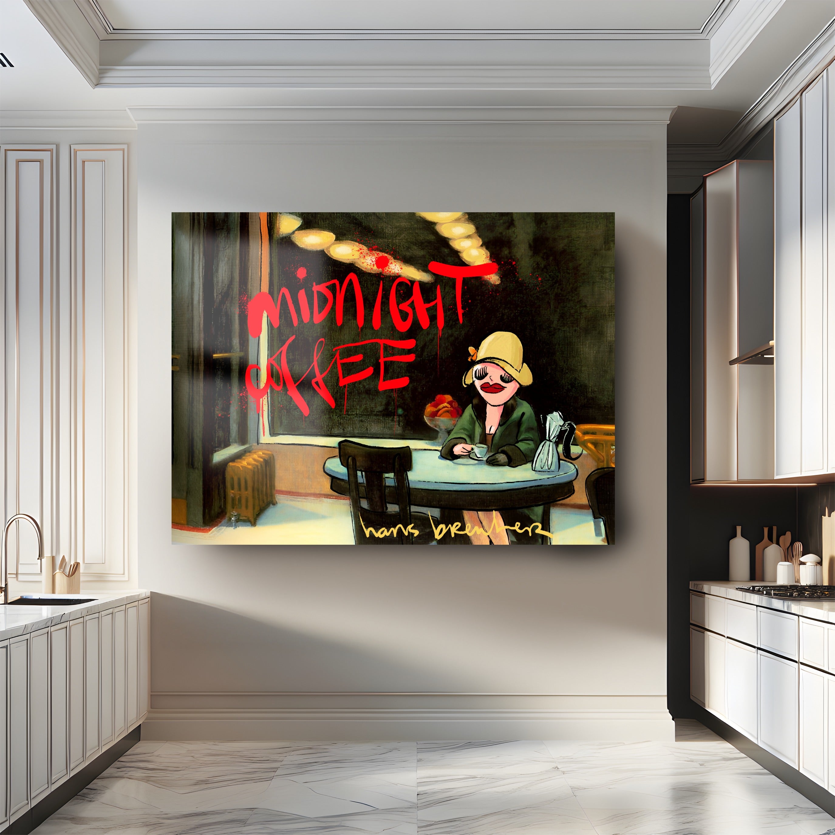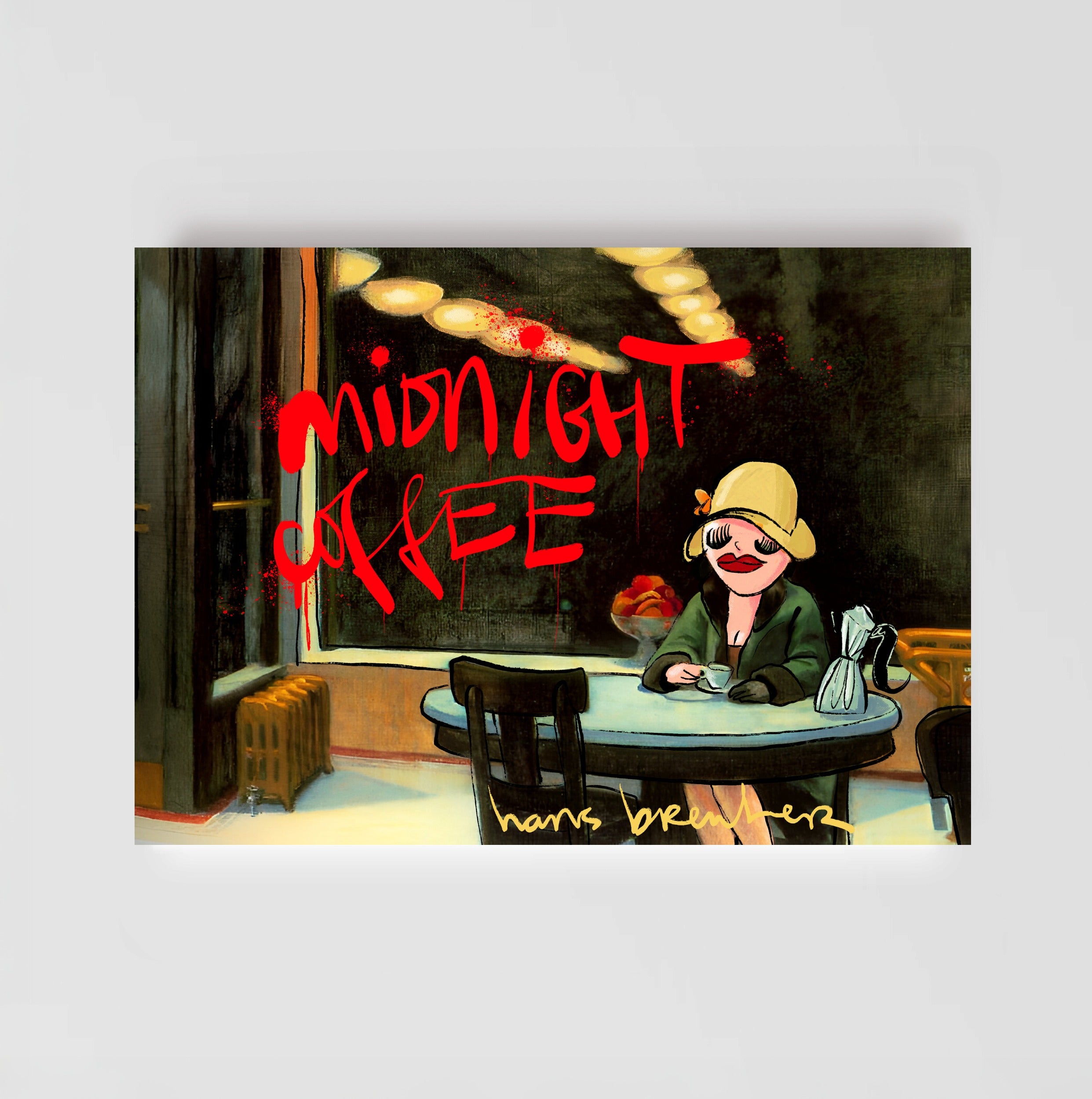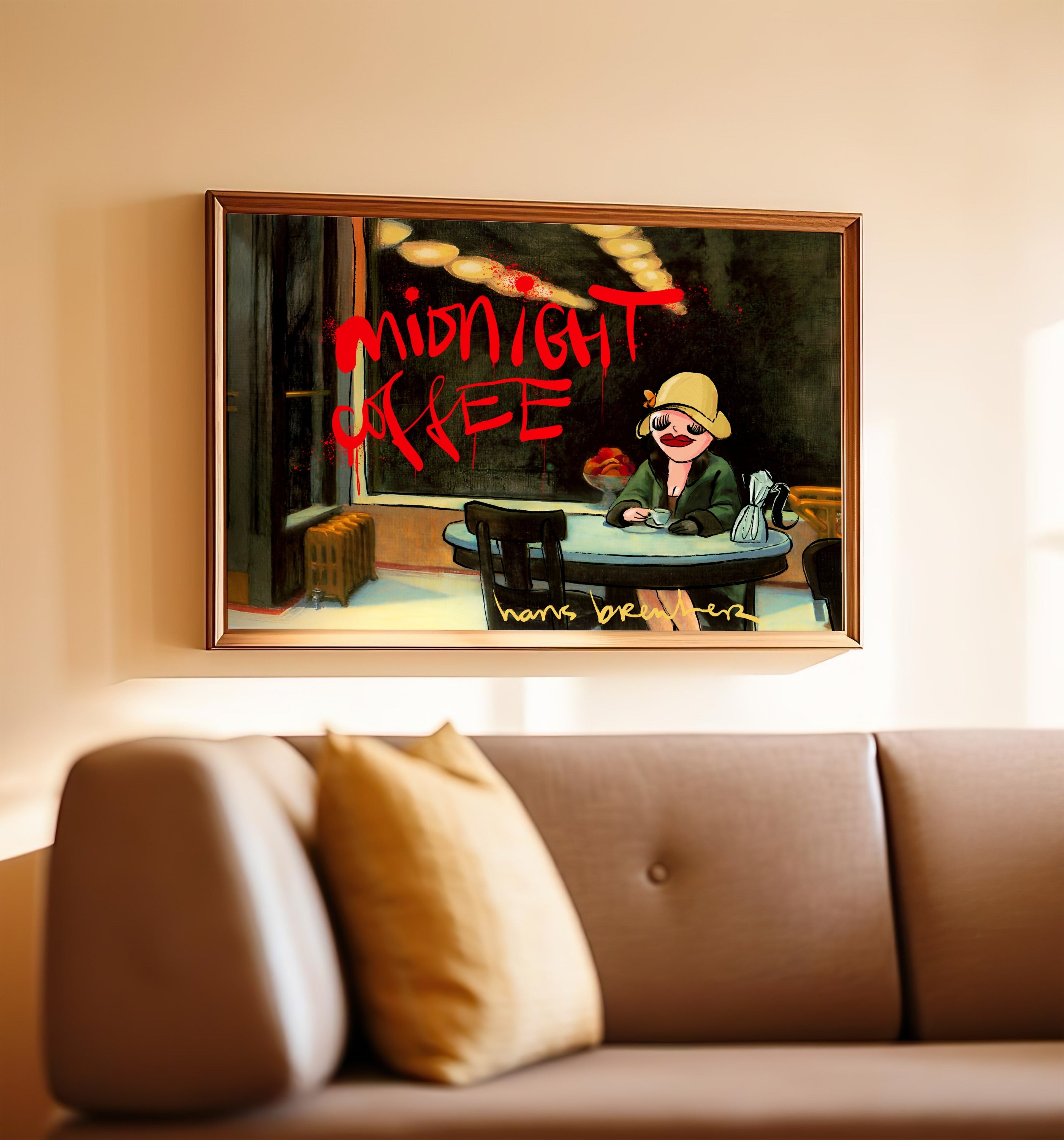 De stilte van de nacht. Een leeg café. Één gast, één espresso—en een muur van gedachten. Midnight Coffee is mijn eigentijdse ode aan Edward Hopper: dezelfde filmische rust en het gevoel van “tussen twee werelden in”, maar met mijn speelse lijnen, krachtige contouren en een vette graffiti-signature over het beeld. Het resultaat is klassiek én street in één: melancholie met een glimlach.