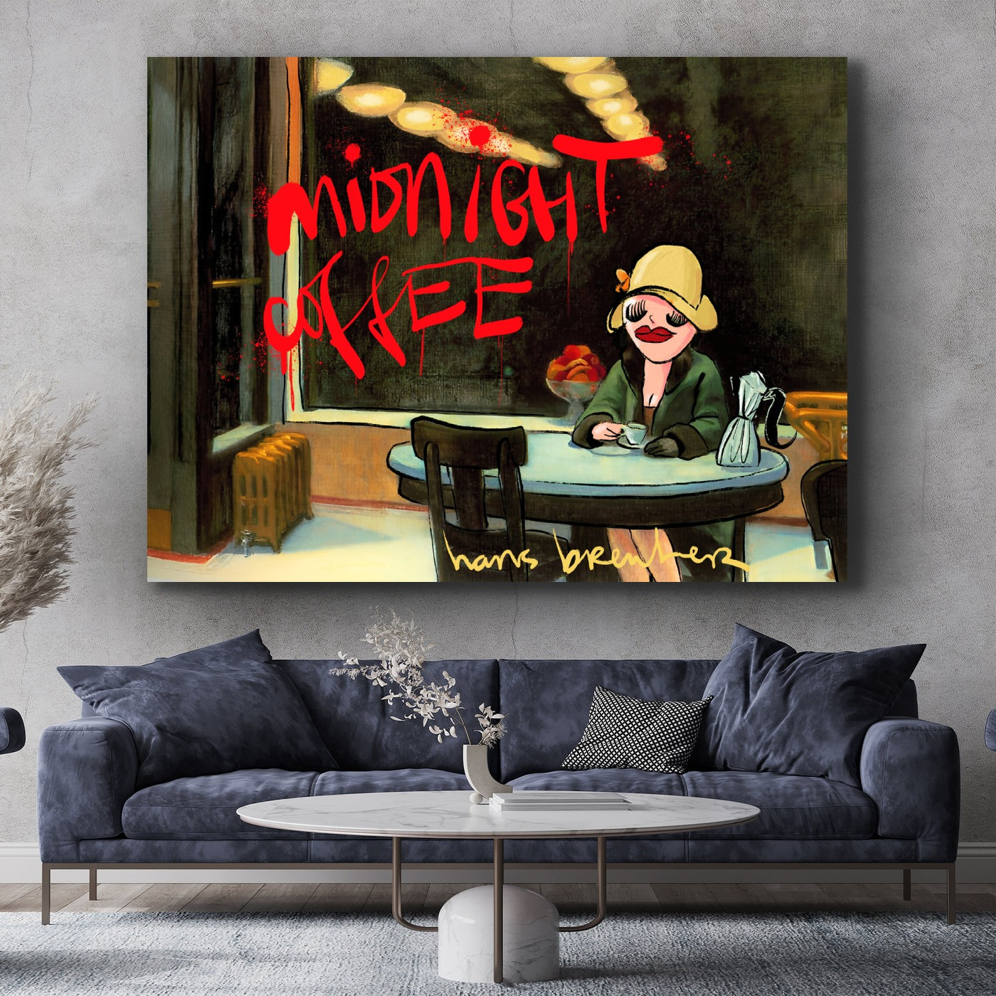 Statement met subtiliteit: de handgeschreven “MIDNIGHT COFFEE” brengt urban energie in een tijdloos tafereel.