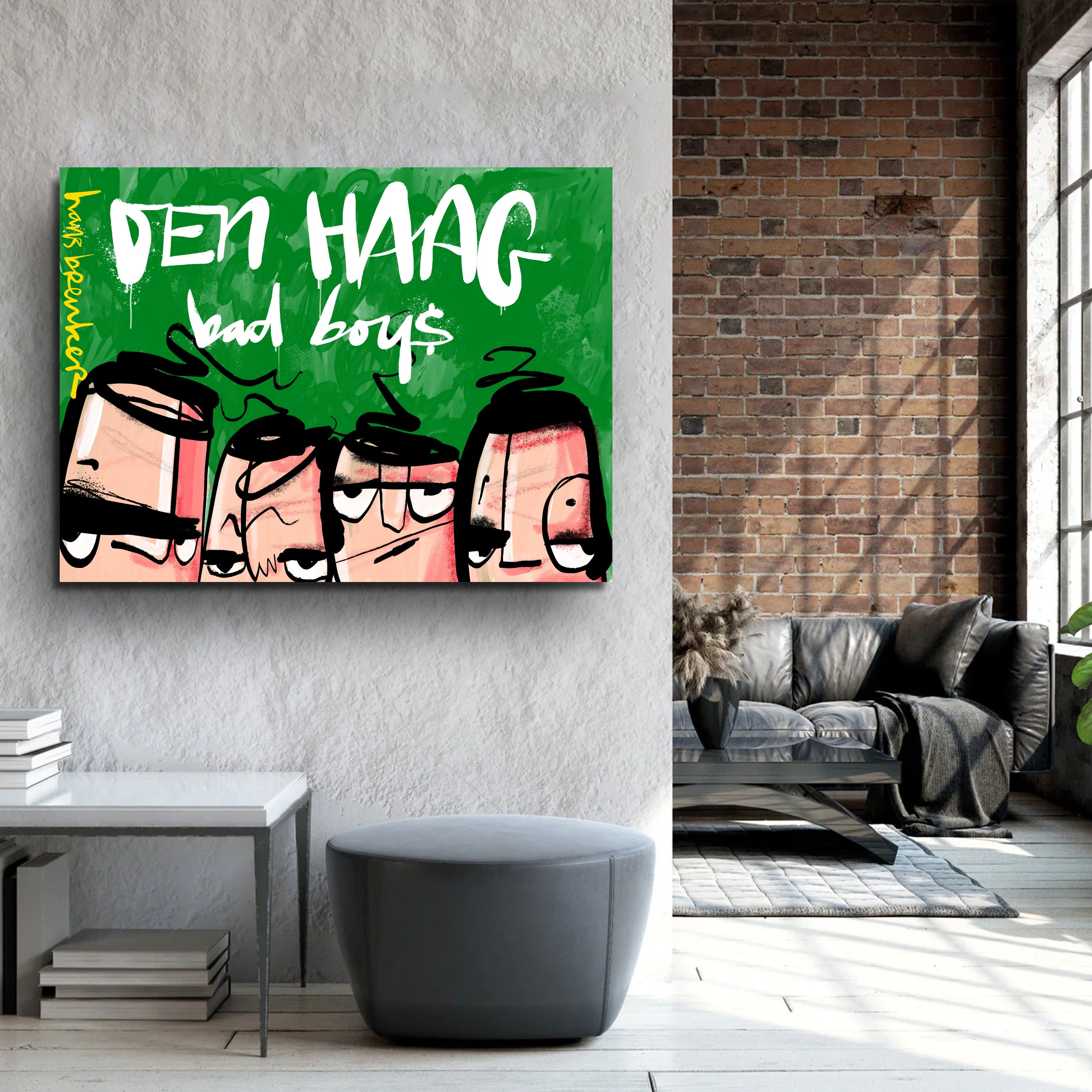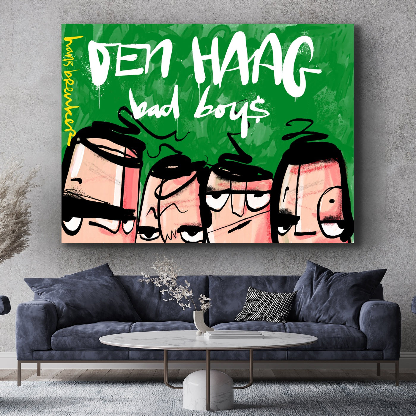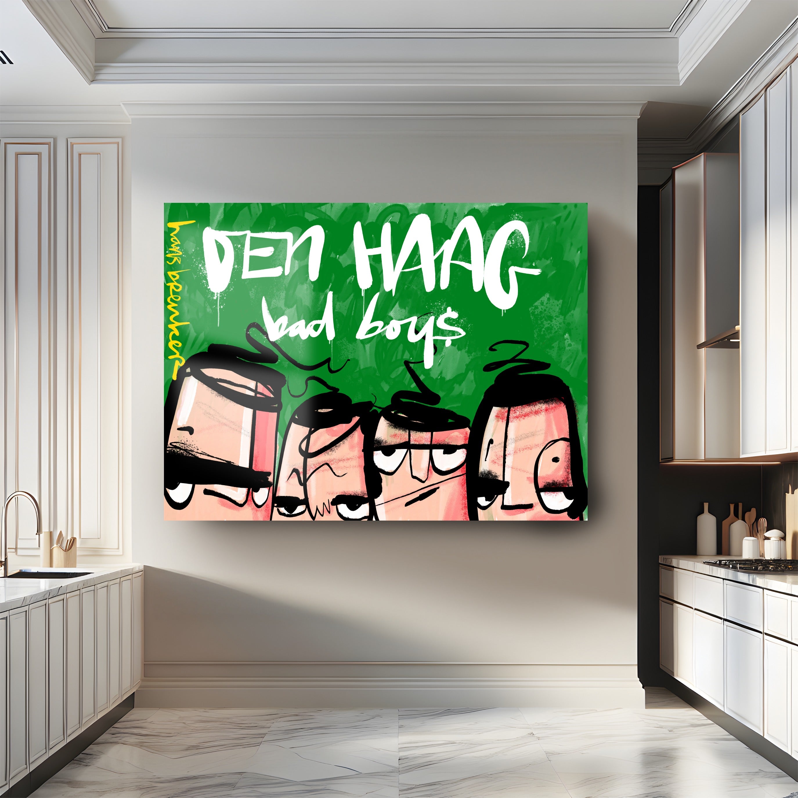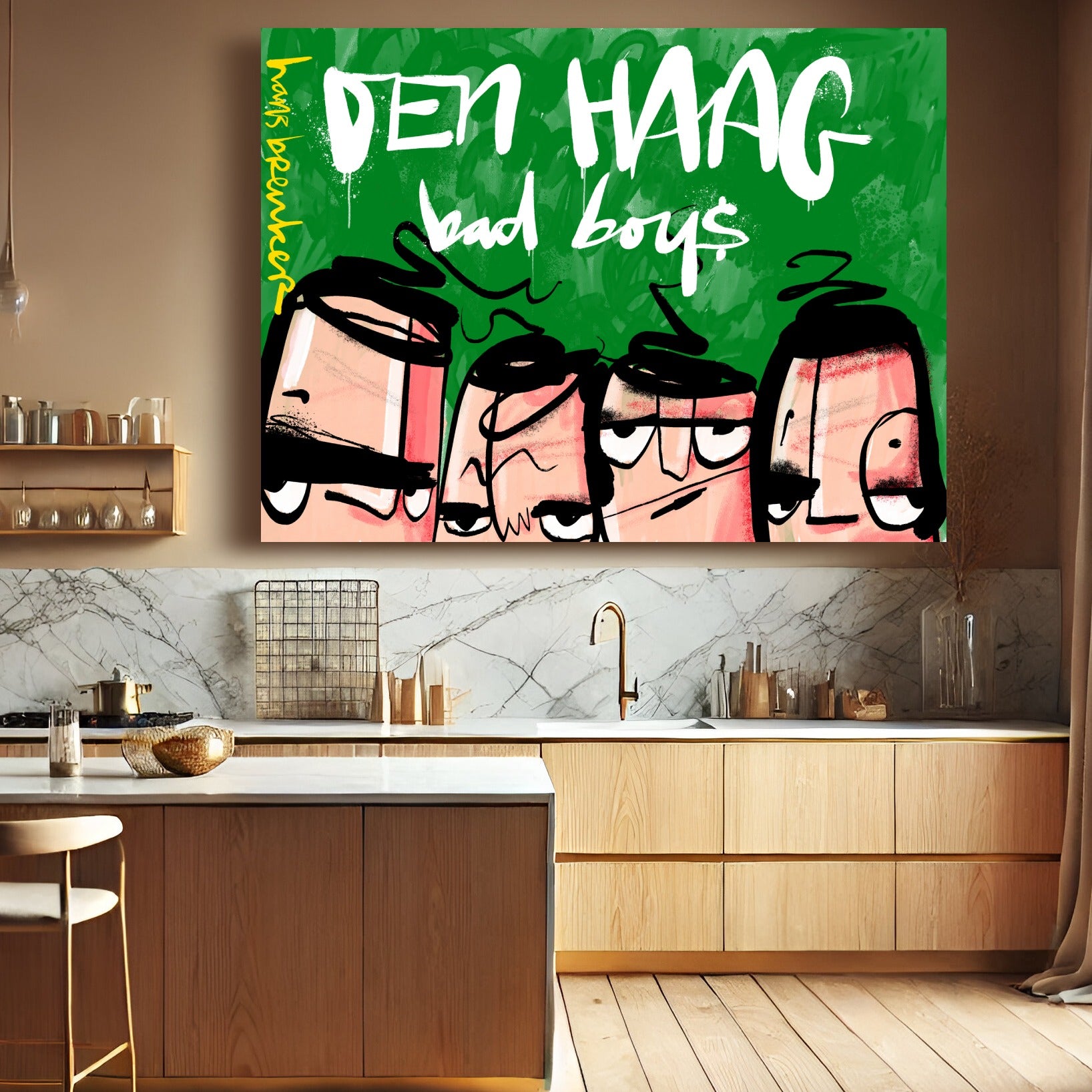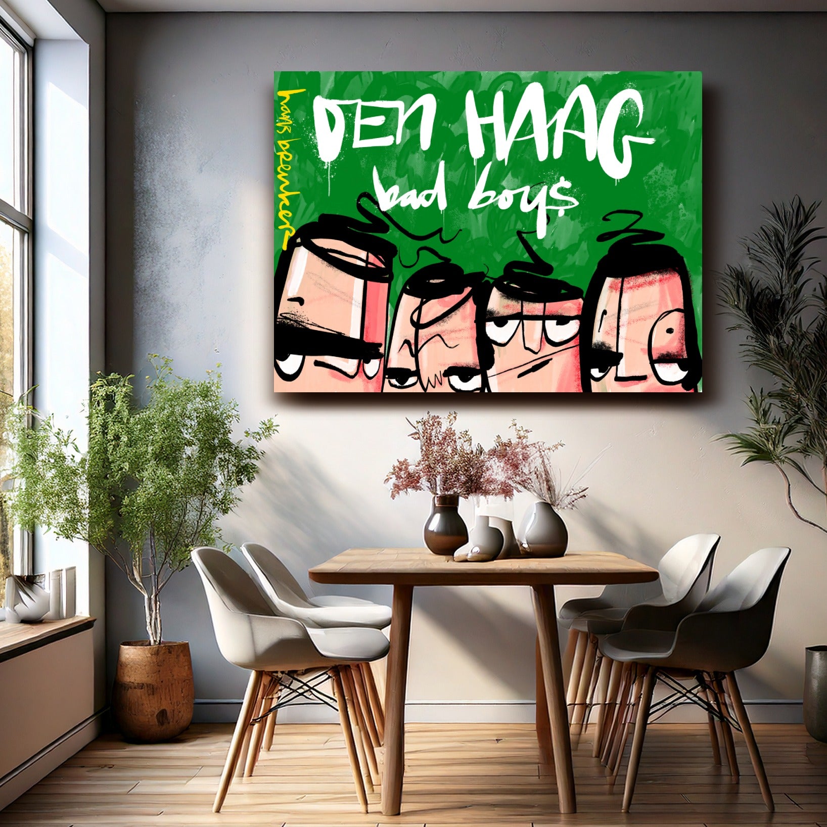 Dieses Gemälde aus Den Haag eignet sich ideal als eindrucksvolle Wanddekoration für Wohnzimmer, Büro, Hobbyraum oder Restaurant . Der grüne Hintergrund harmoniert überraschend gut mit Beton, Holz und neutralen Tönen und verleiht einem ruhigen Raum sofort Atmosphäre und Energie. Hängen Sie es über das Sofa, im Flur oder hinter die Bar – und Sie haben im Nu einen Gesprächsanlass. Jeder wird darin einen typischen Den-Haag-Bewohner erkennen.