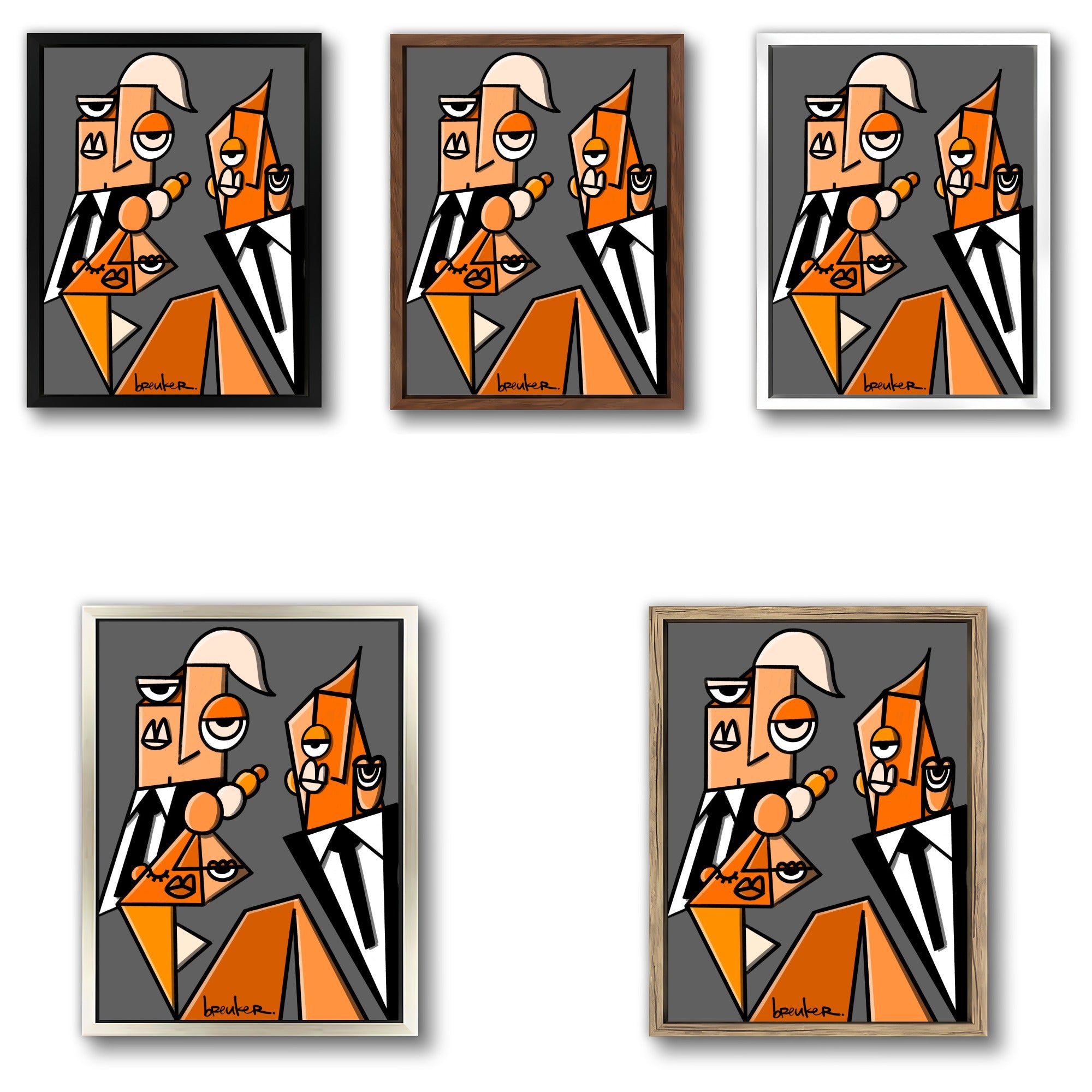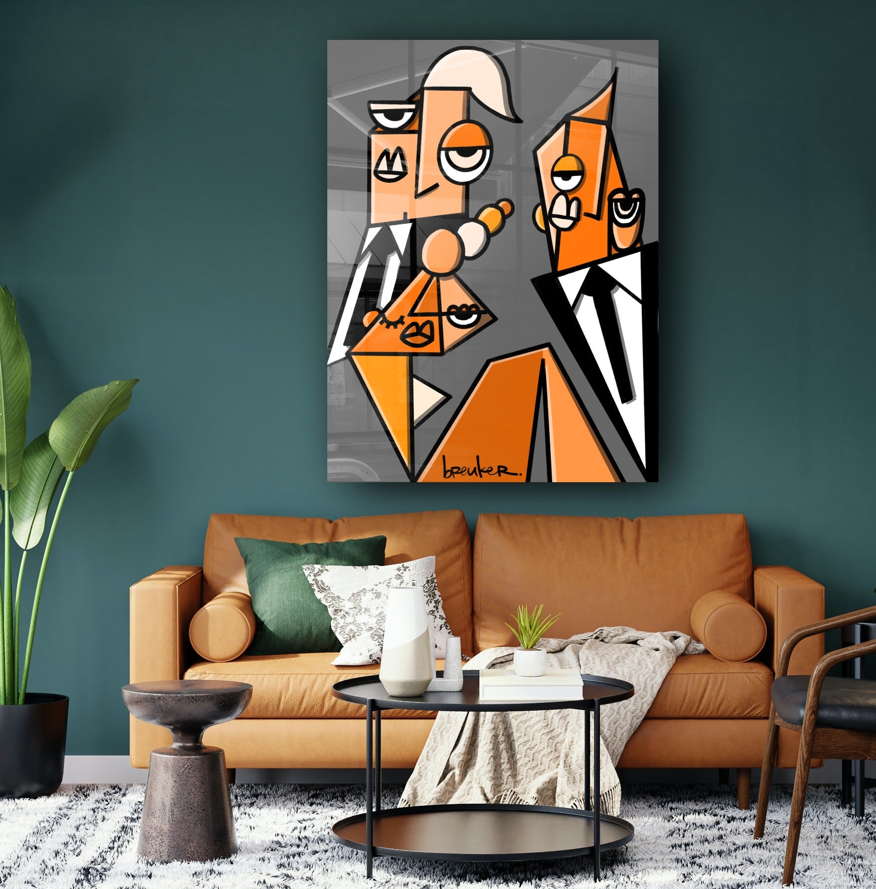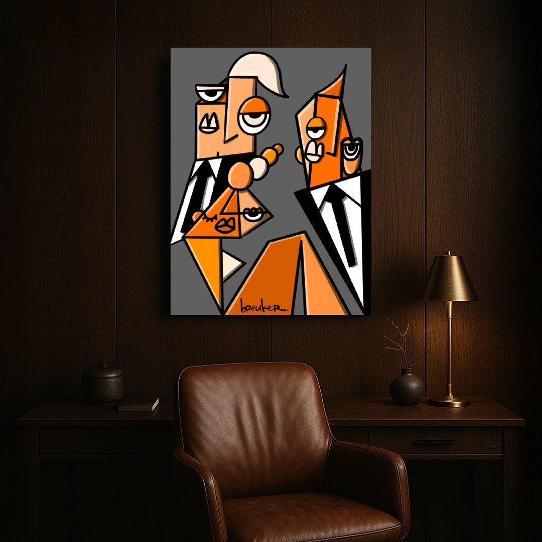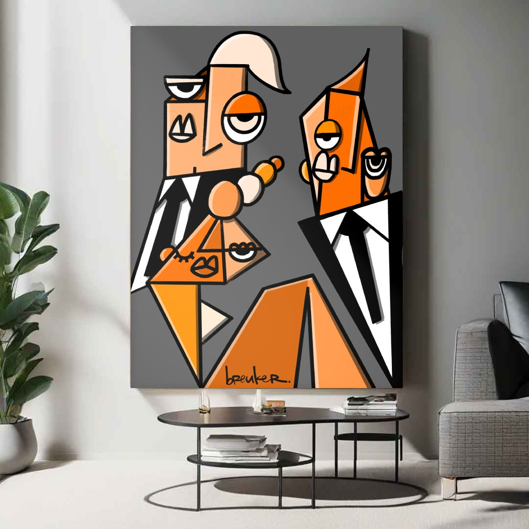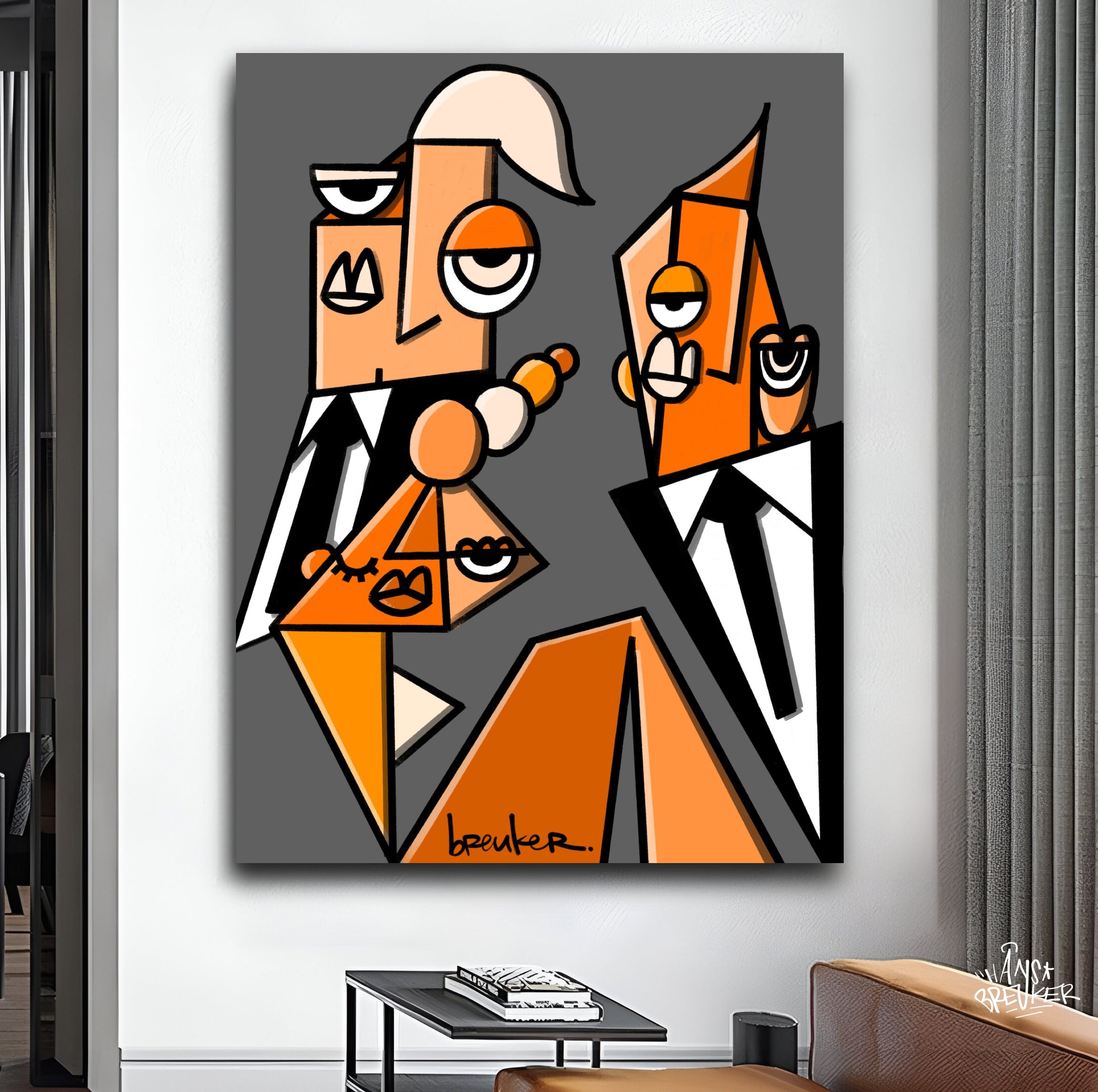 Mit klaren Linien, kantigen Formen und einer warmen Farbpalette aus Orange, Creme und Schwarz erschafft Hans Breuker eine Szene, die gleichermaßen elegant und leicht absurd wirkt. Die Gesichter sind wie Puzzles zusammengesetzt: Augen, die etwas zu viel wissen, Münder, die nichts sagen müssen. Das ist keine Geselligkeit, das ist Haltung.