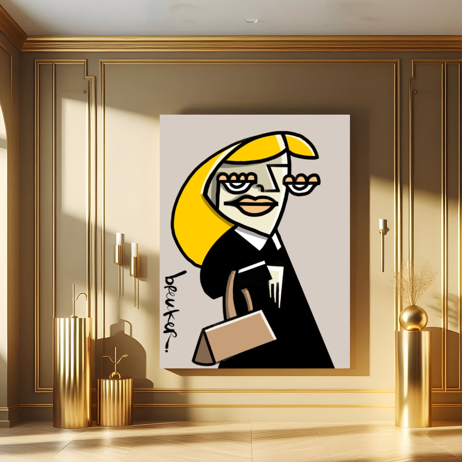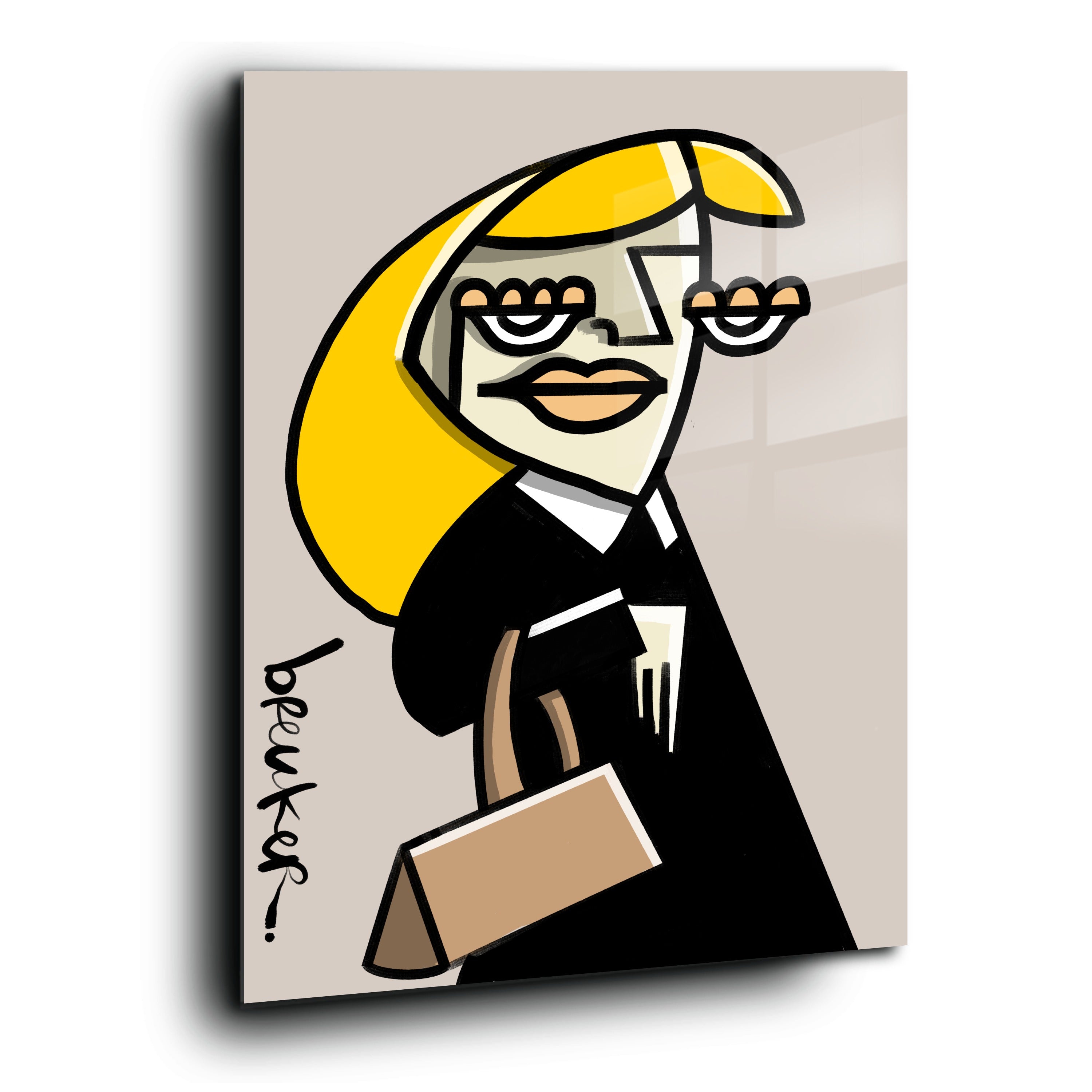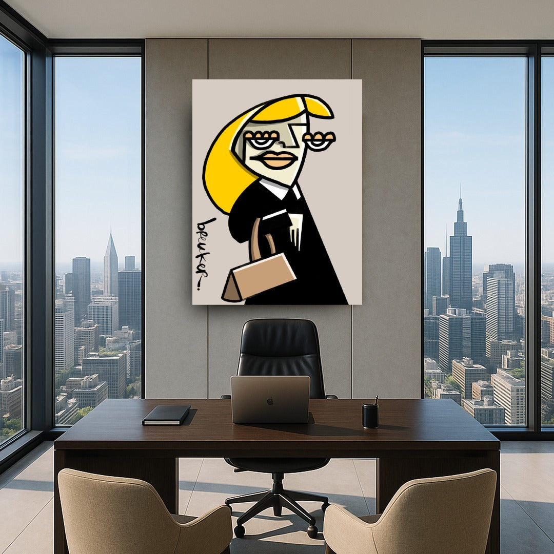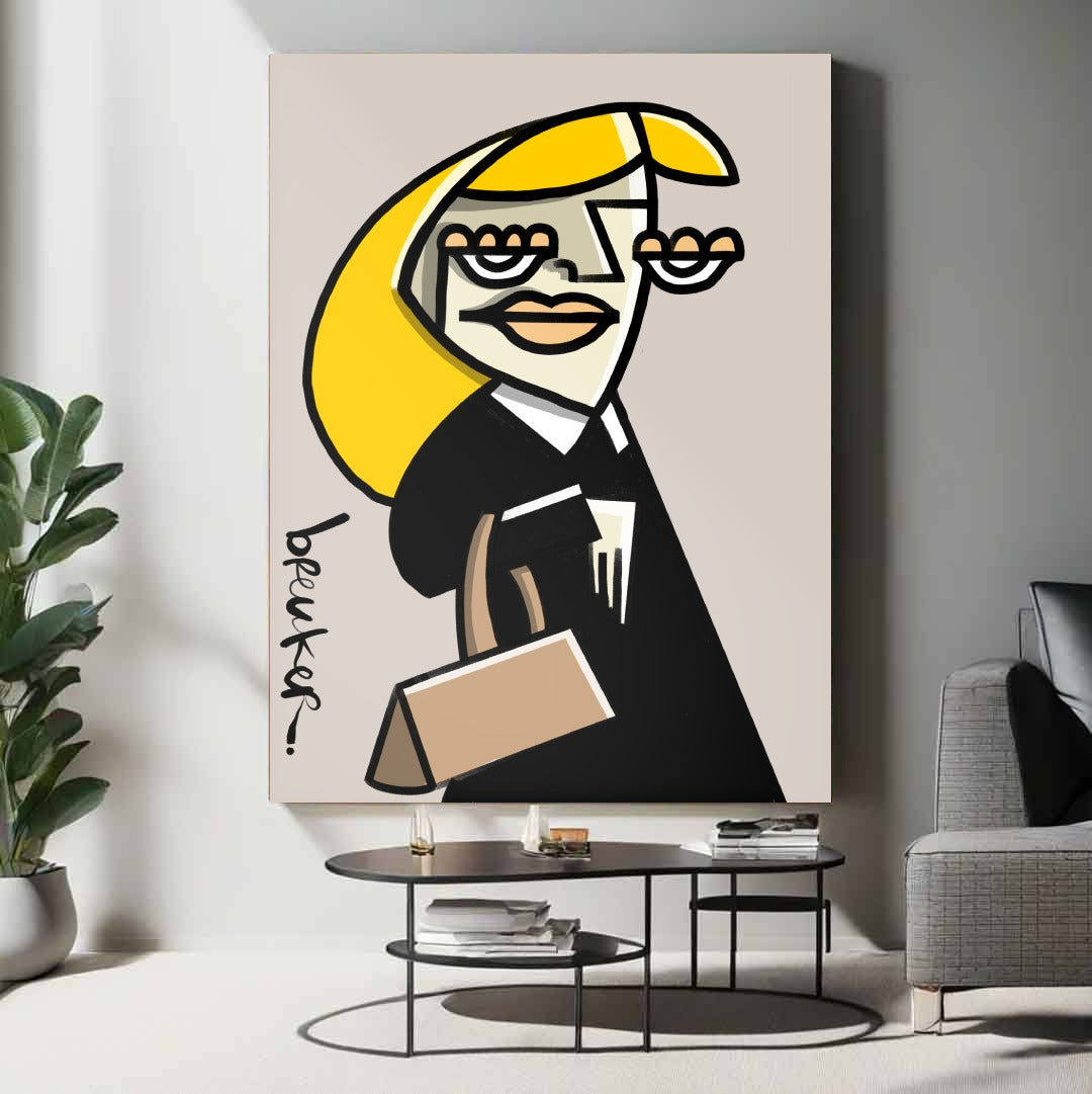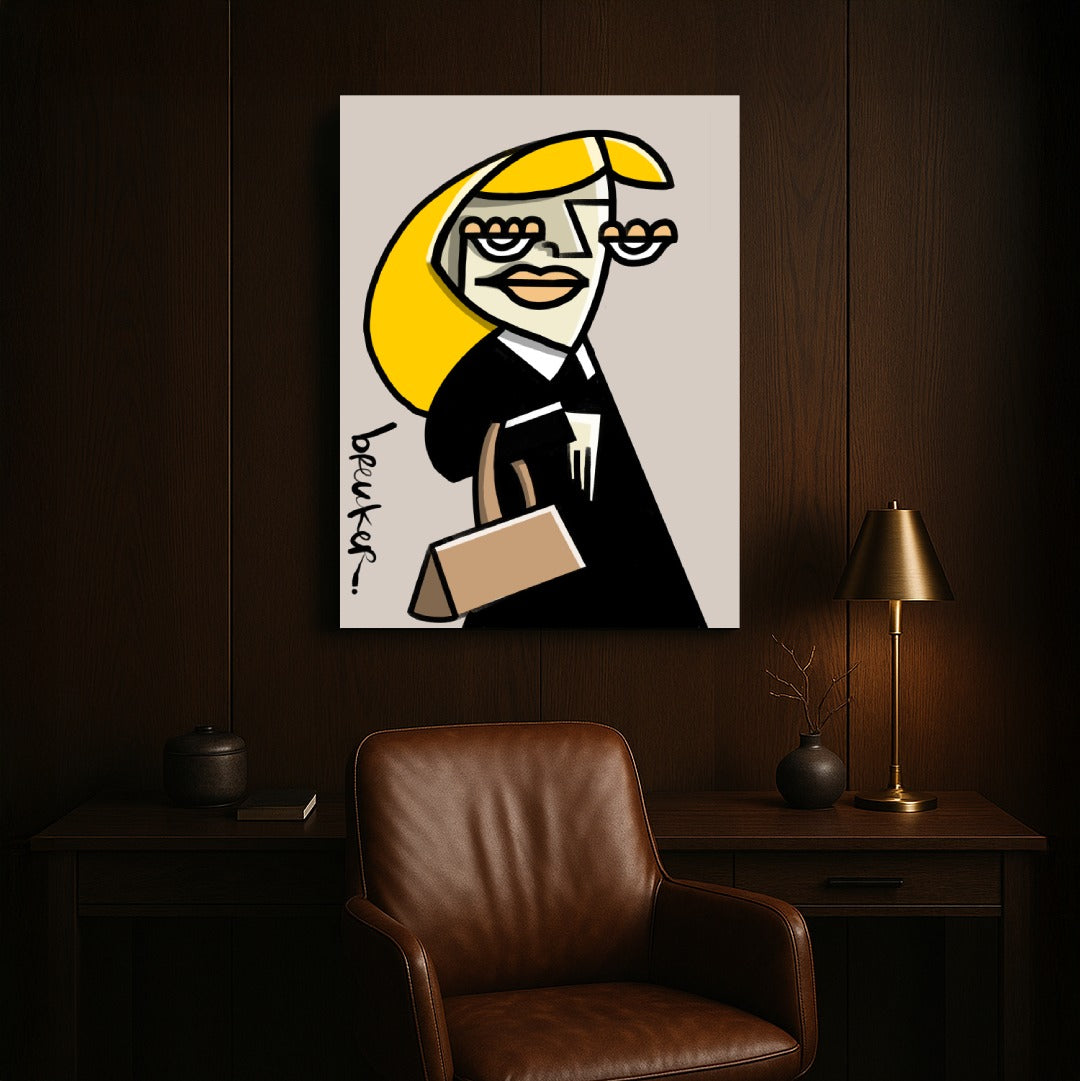 Obwohl die Formen kantig und beinahe abstrakt wirken, bleibt das Werk erkennbar und strahlt Persönlichkeit aus. Das Gesicht ist kein Porträt, sondern ein Statement. Die Linien lenken den Blick direkt auf die Augen, die Lippen, die Tasche – und lassen Raum für Ihre eigene Interpretation von Ruhm, Ironie und Begehren.