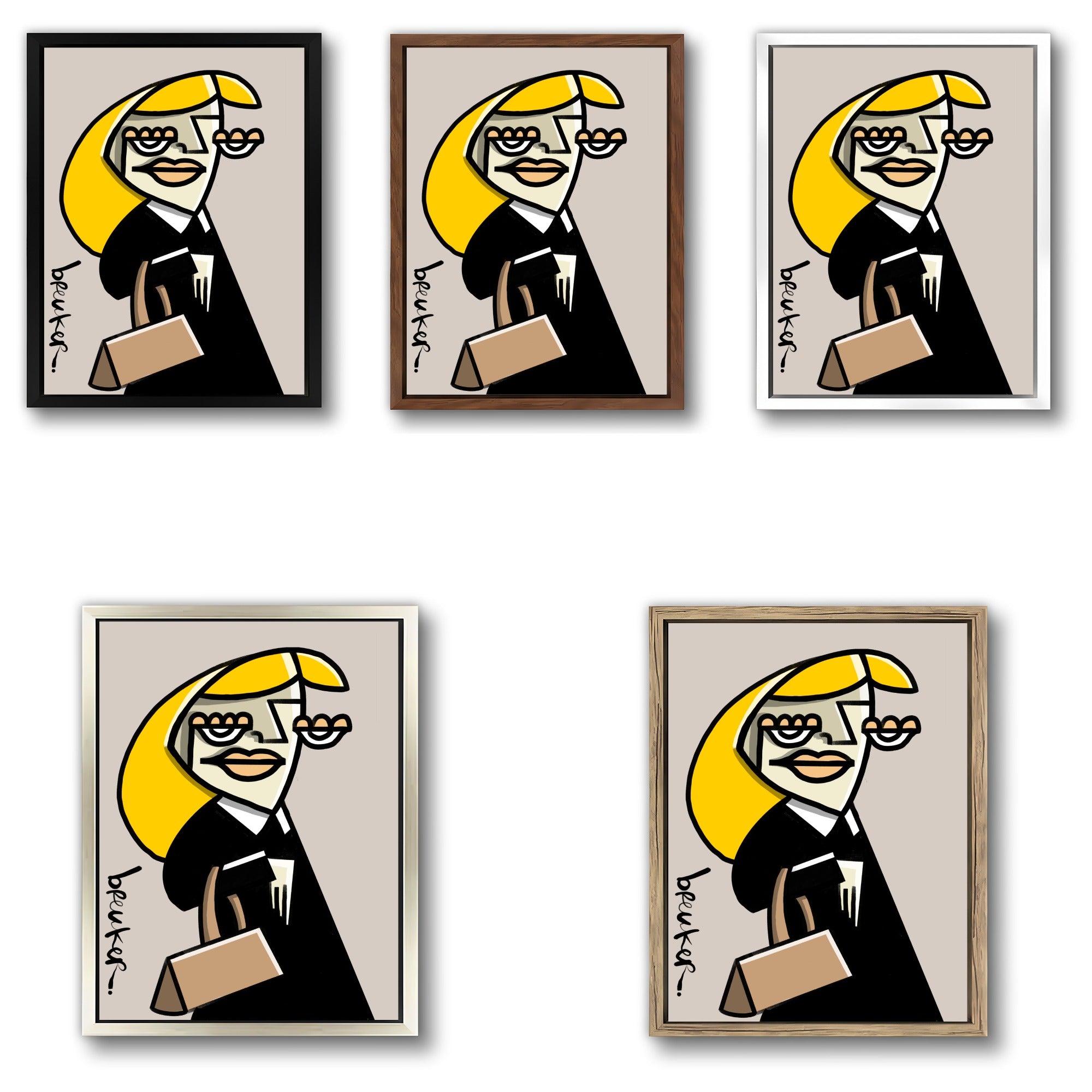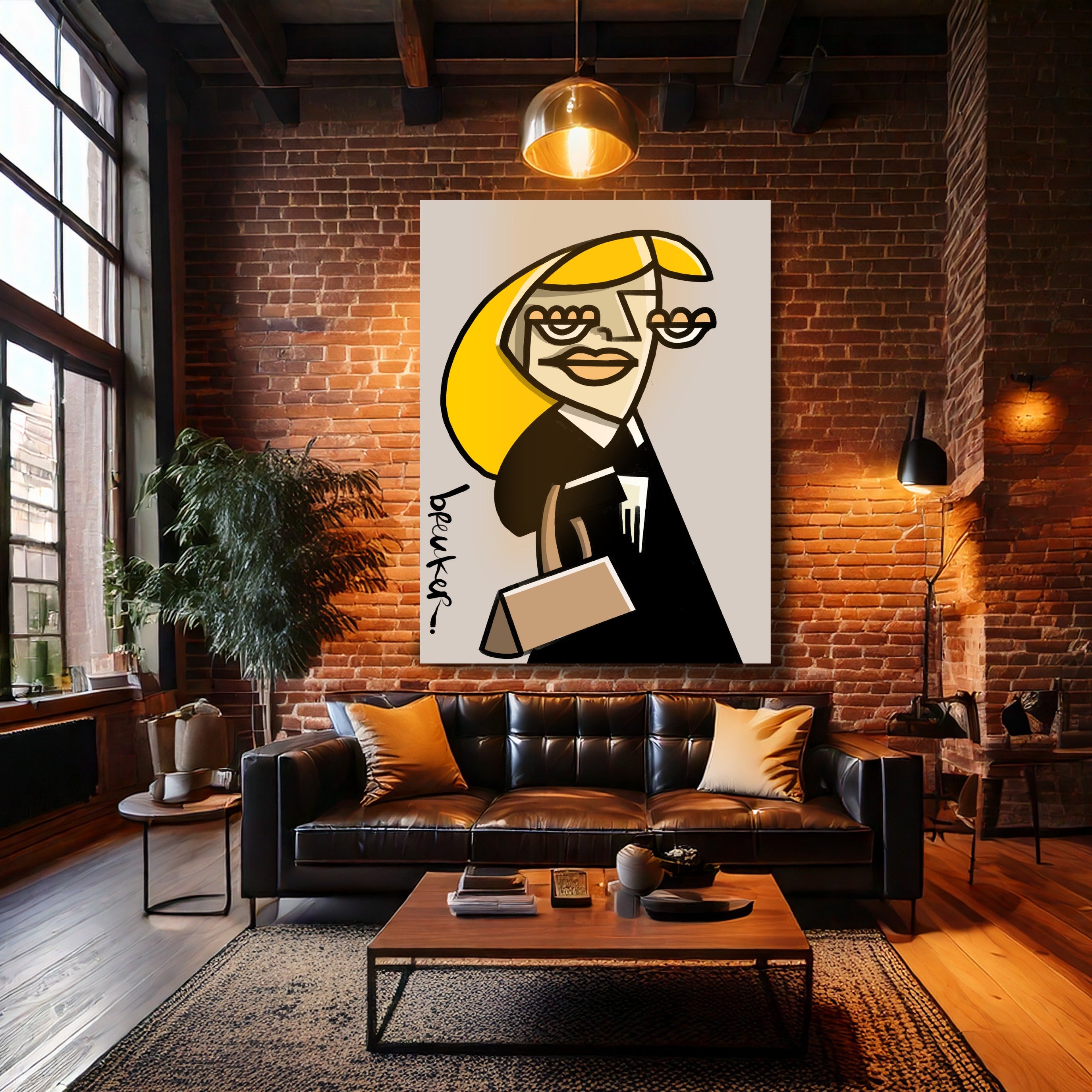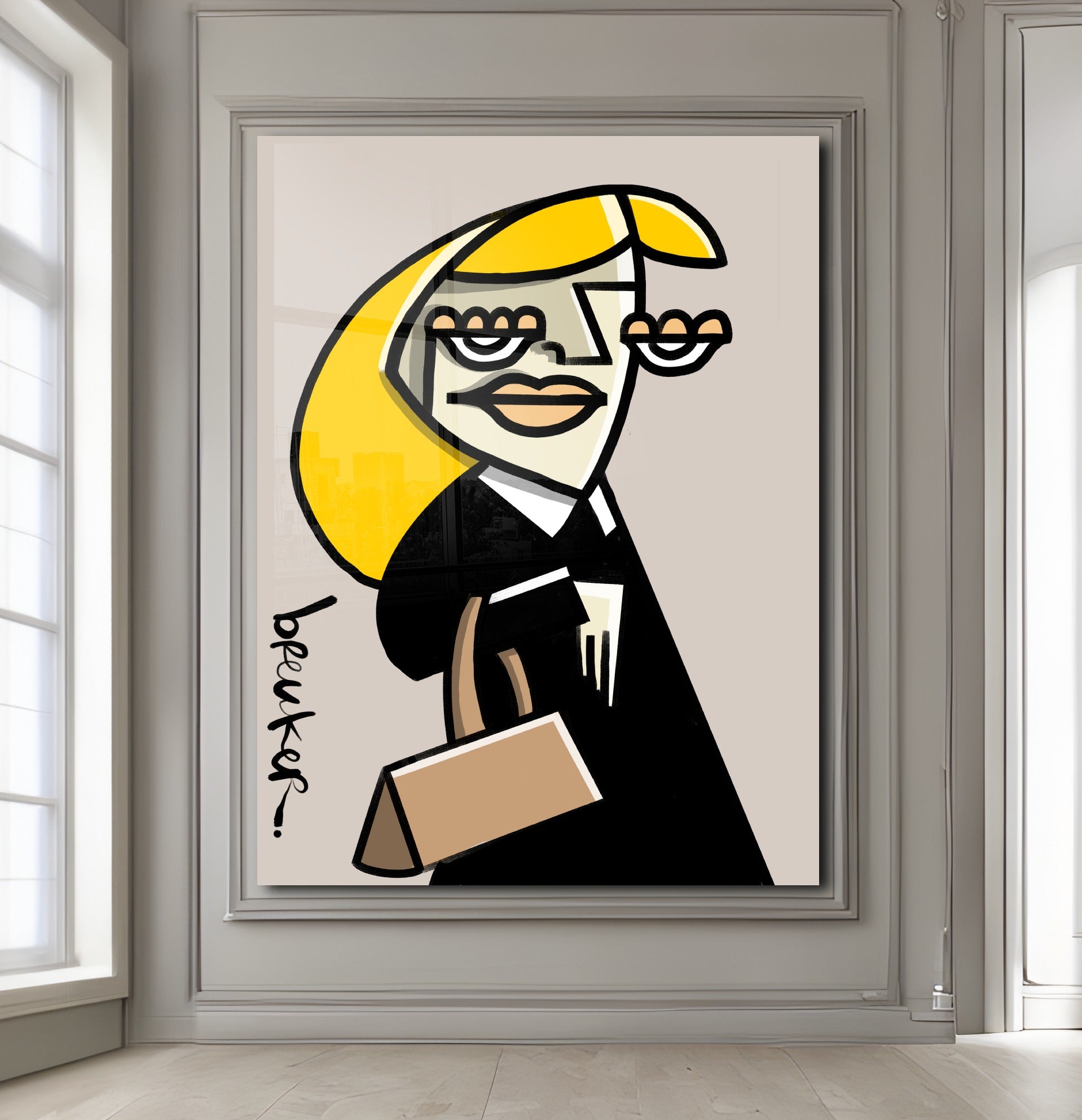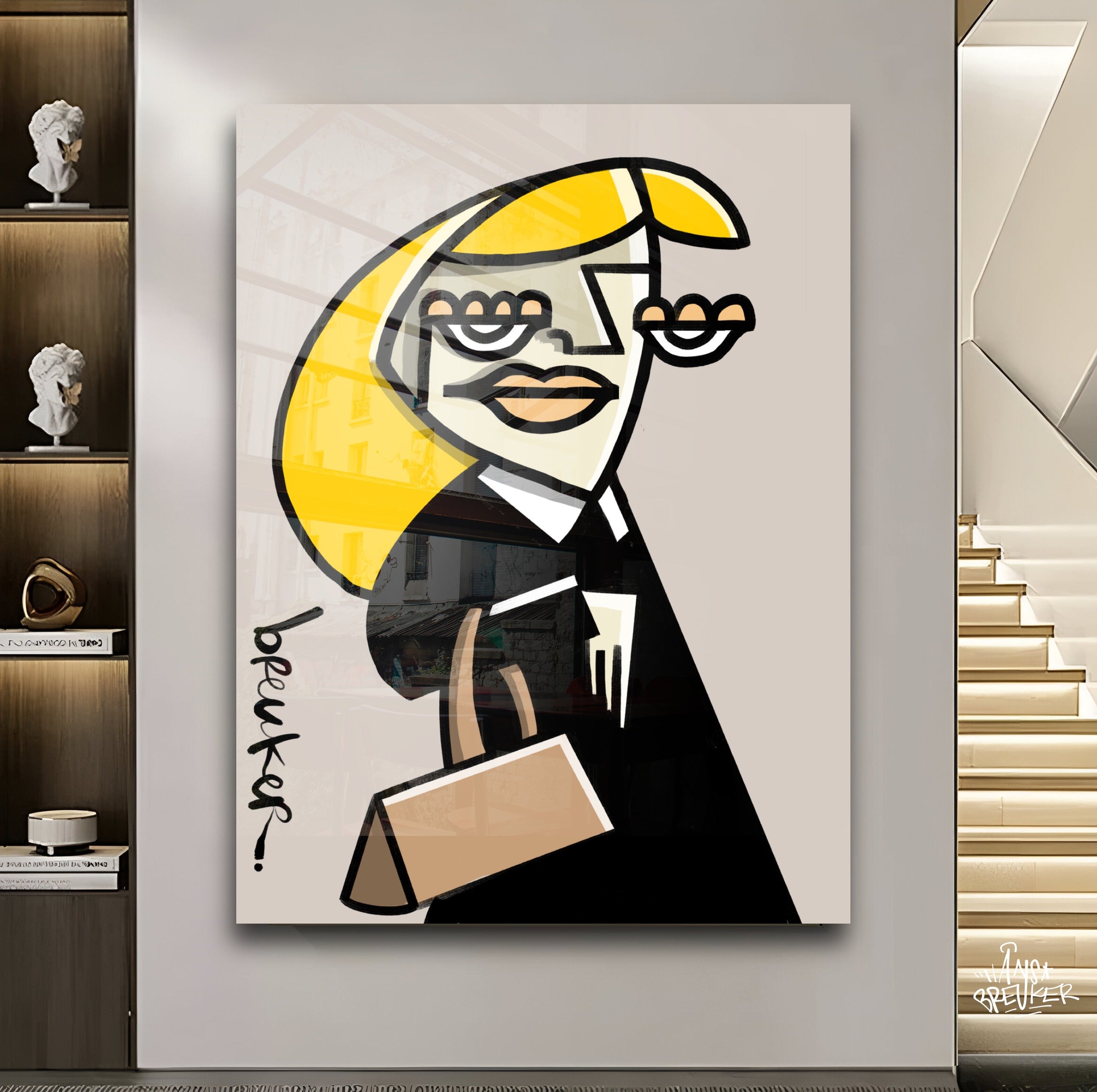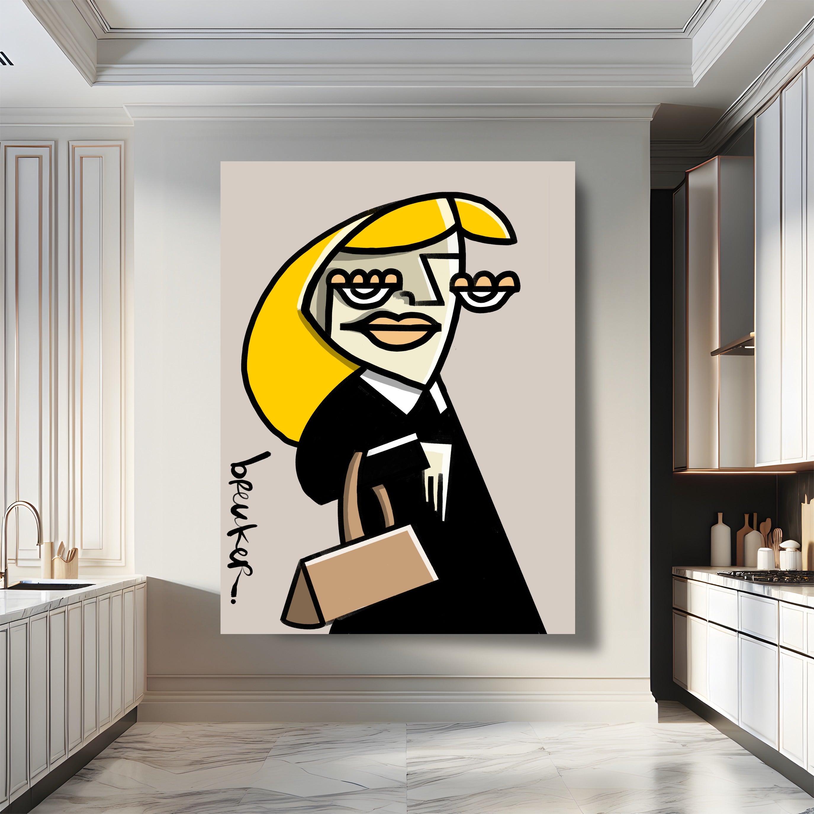 Obwohl die Formen kantig und beinahe abstrakt wirken, bleibt das Werk erkennbar und strahlt Persönlichkeit aus. Das Gesicht ist kein Porträt, sondern ein Statement. Die Linien lenken den Blick direkt auf die Augen, die Lippen, die Tasche – und lassen Raum für Ihre eigene Interpretation von Ruhm, Ironie und Begehren.
