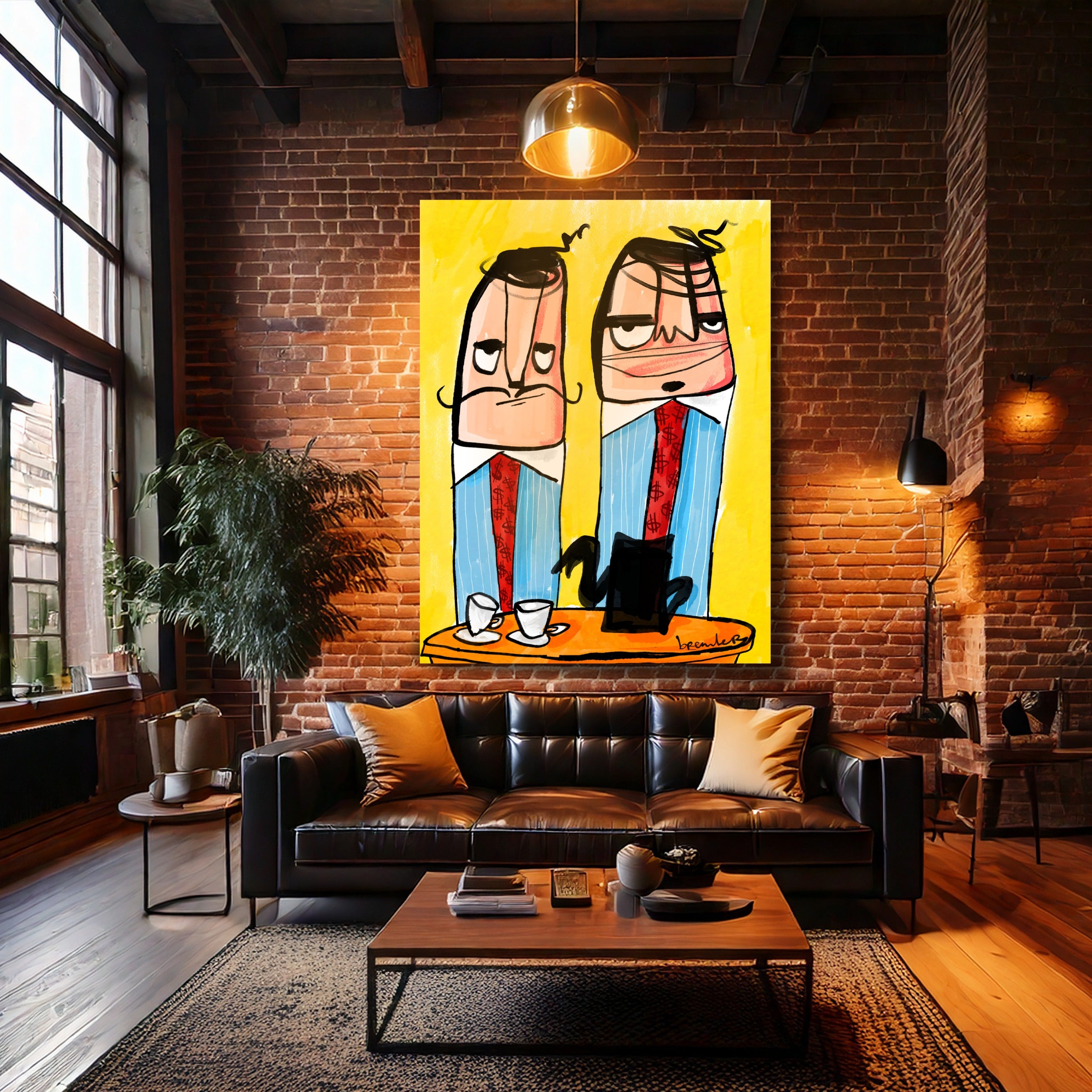 De warme gele achtergrond straalt energie en optimisme uit, terwijl de karakters juist dat rauwe randje geven. Het contrast maakt dit kunstwerk perfect voor ruimtes waar gewerkt, gedacht en besloten wordt.