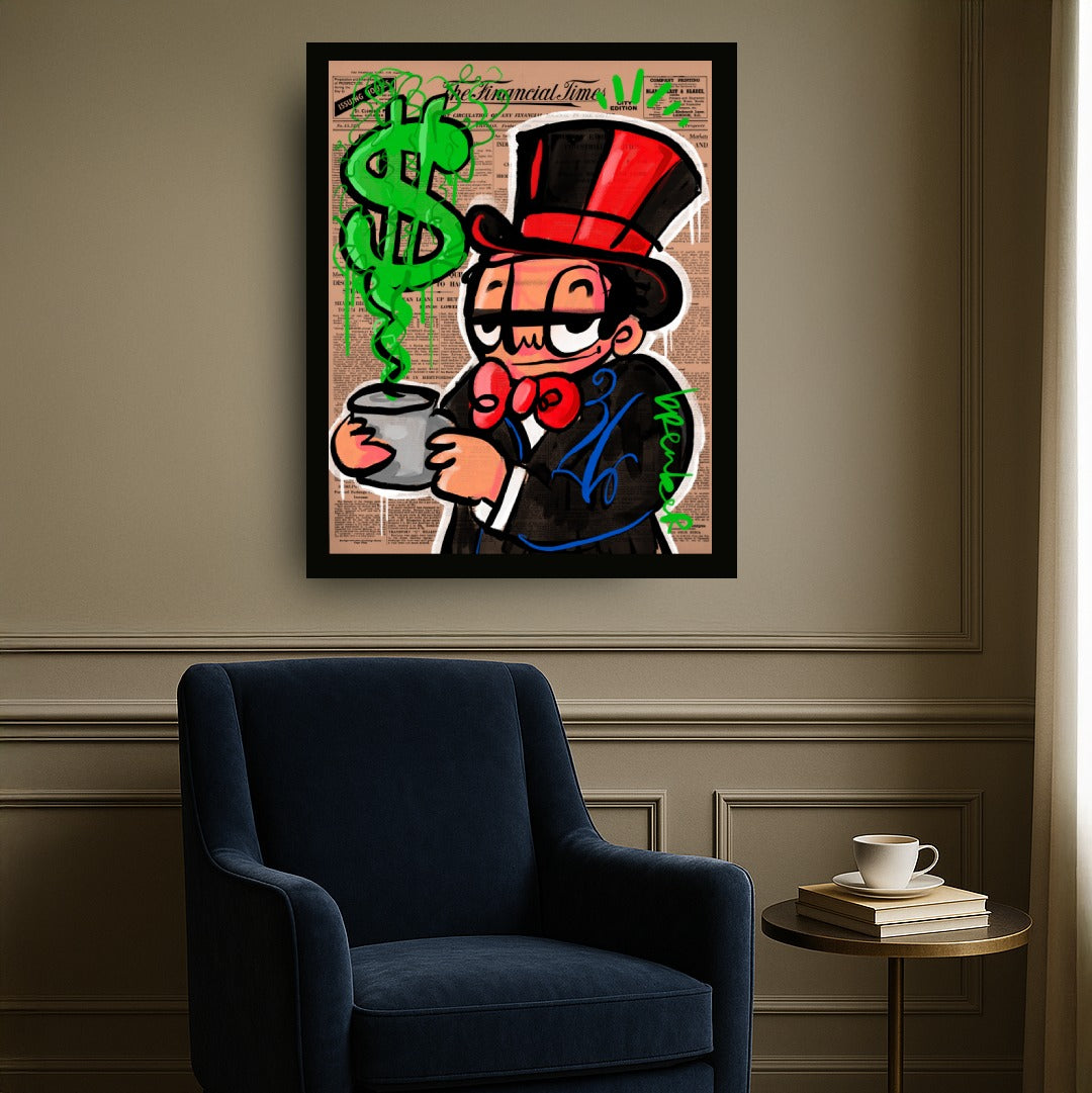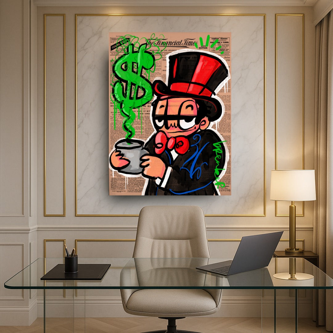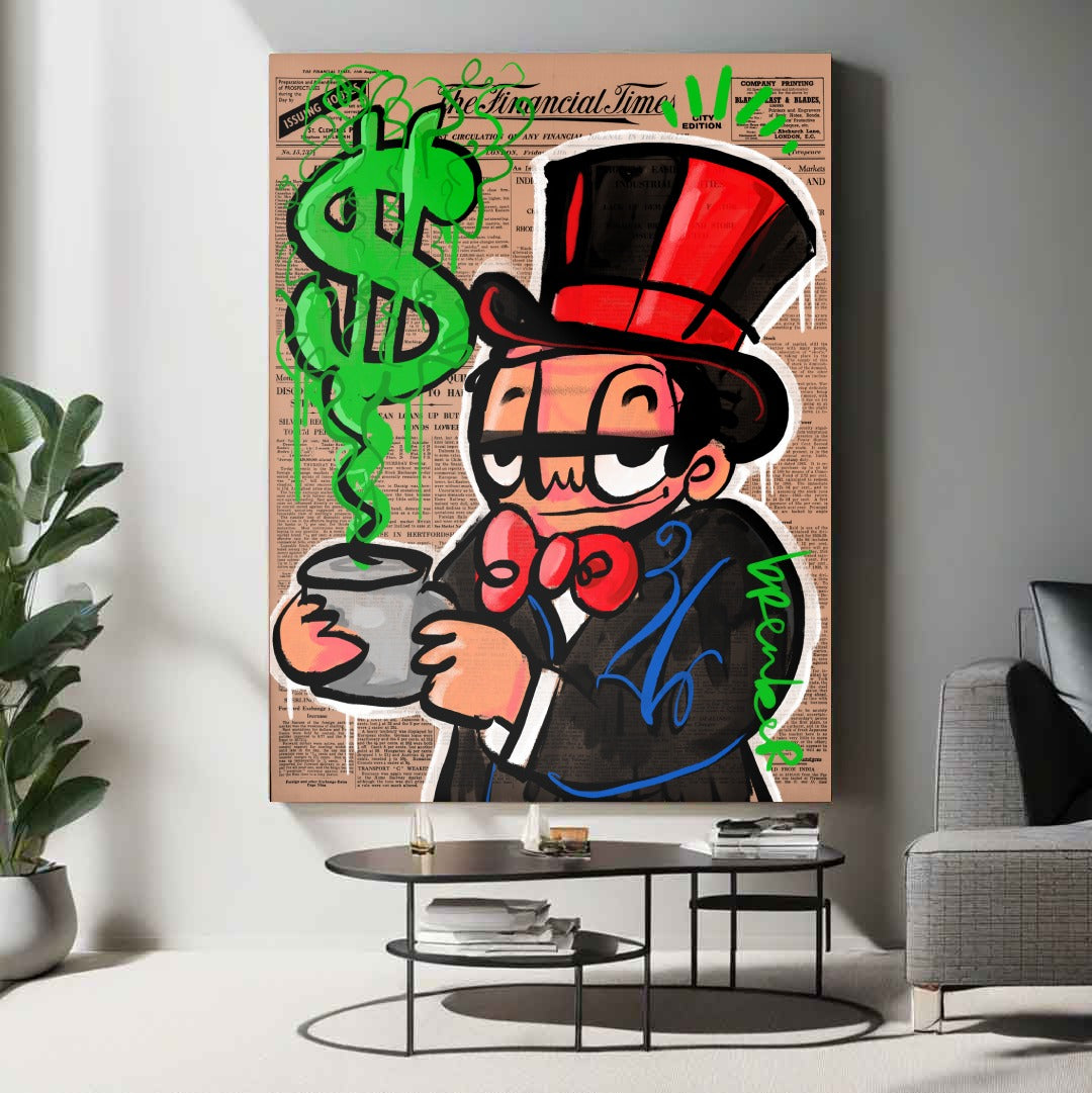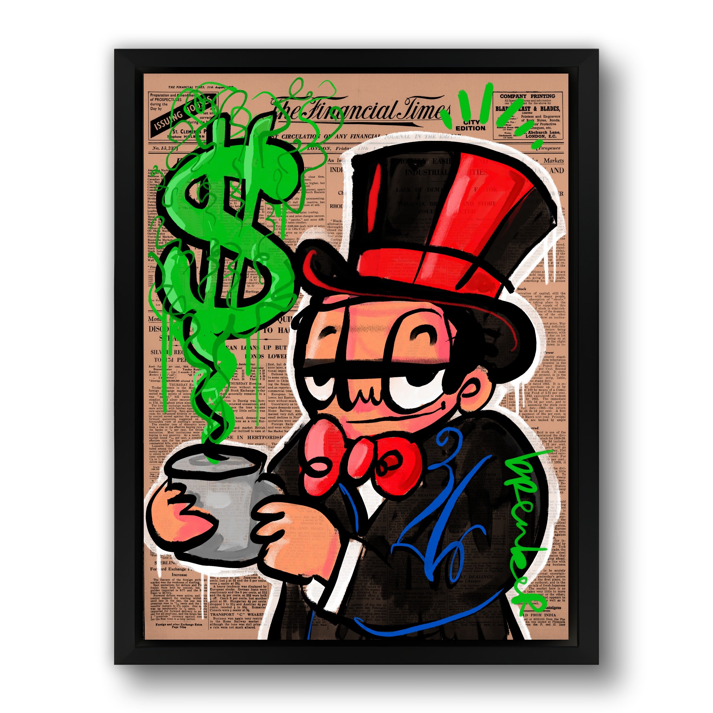 Morgens schnell Geld verdienen. Mr. Cash auf einer alten Ausgabe der Financial Times. Für alle, die morgens nur an zwei Dinge denken: Kaffee und Bargeld.