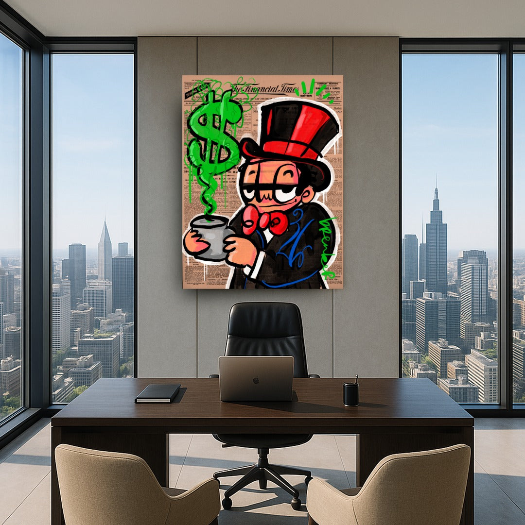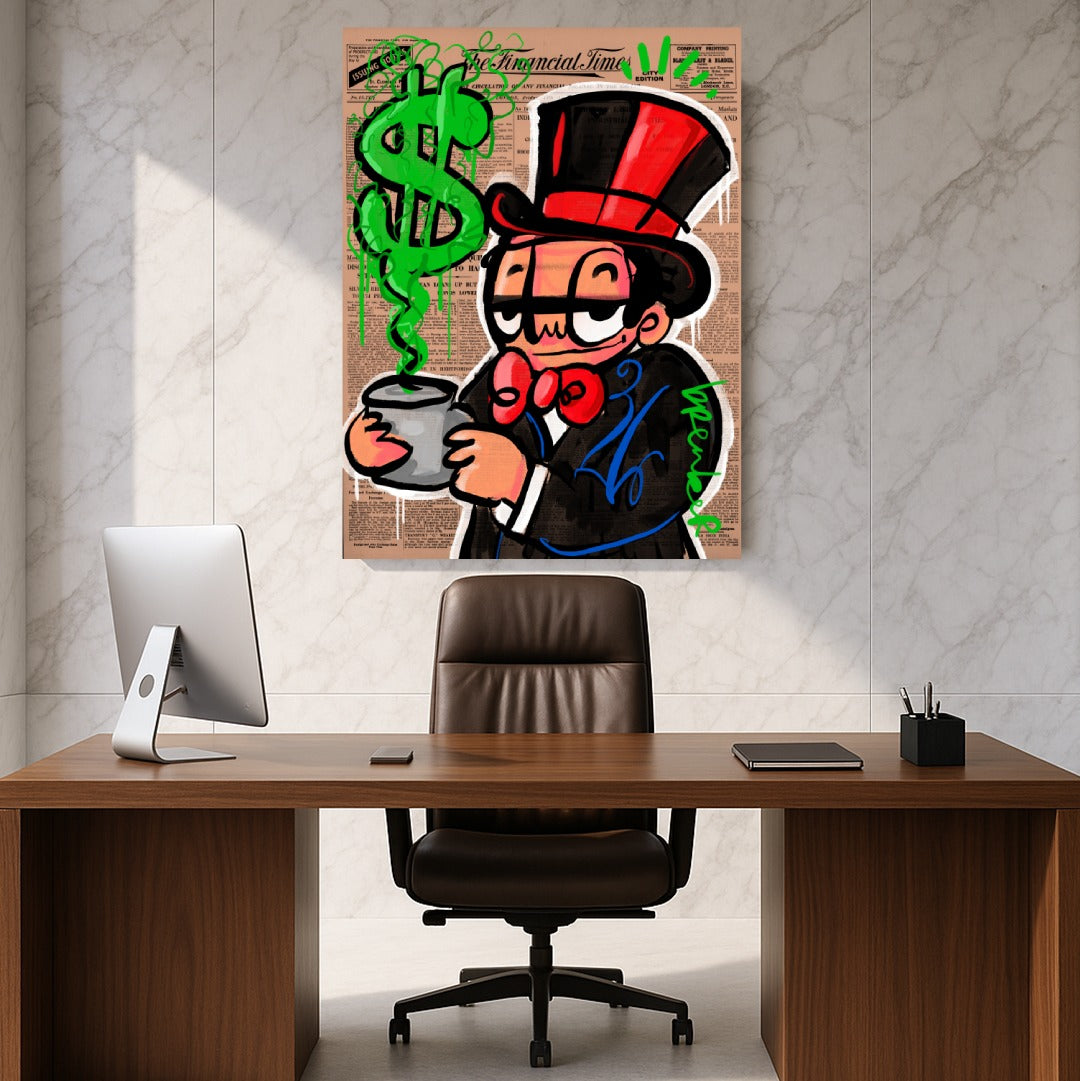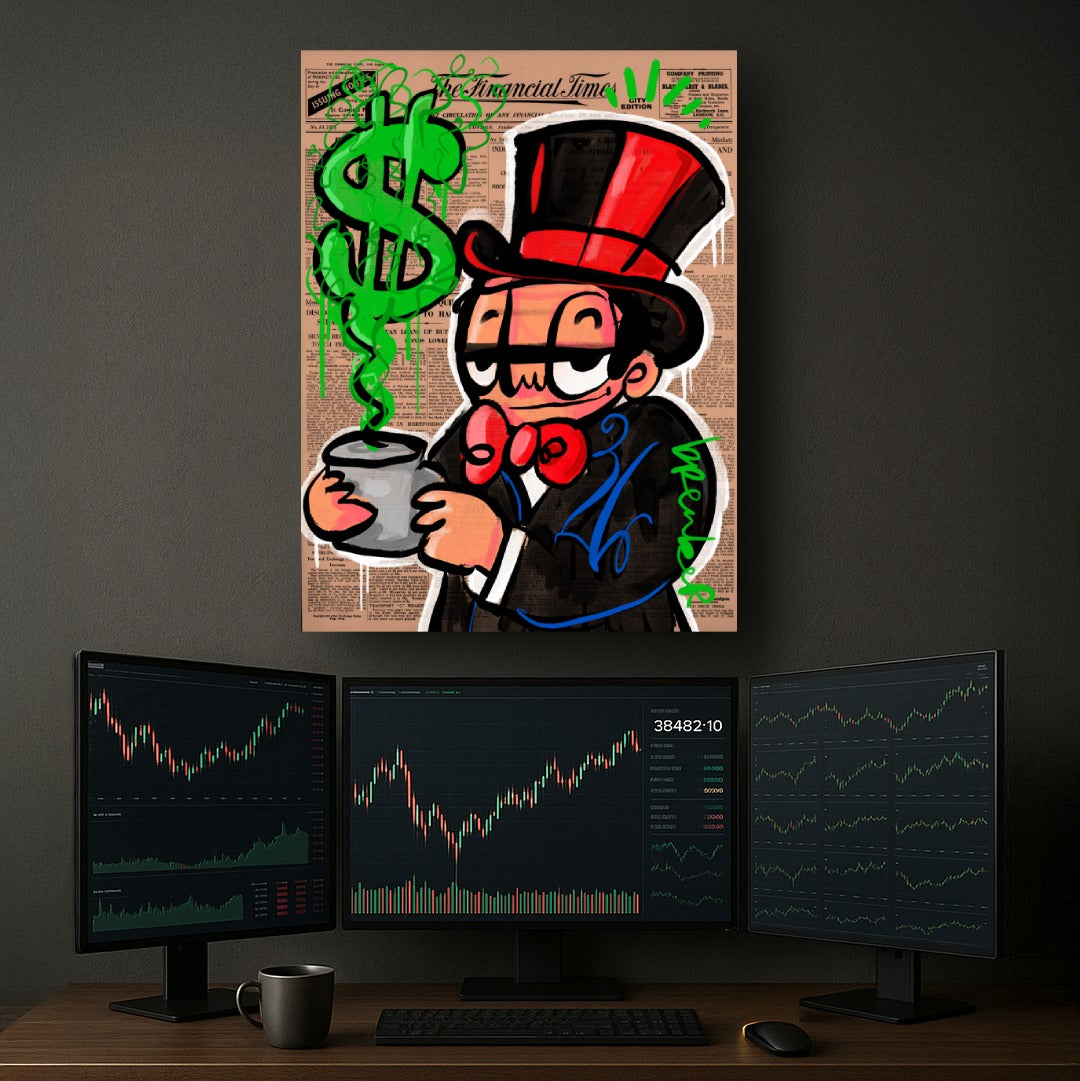 Morgens schnell Geld verdienen. Mr. Cash auf einer alten Ausgabe der Financial Times. Für alle, die morgens nur an zwei Dinge denken: Kaffee und Bargeld.