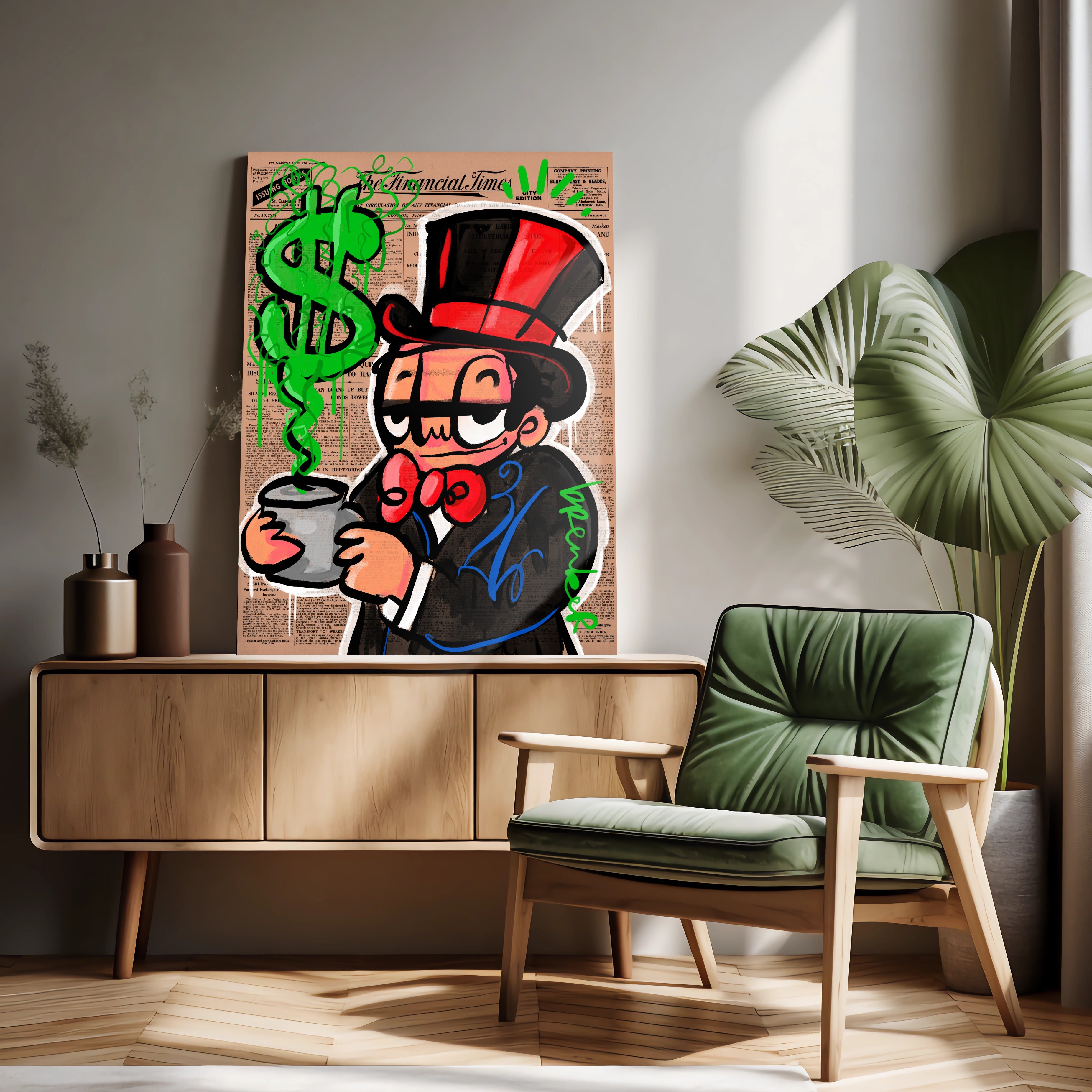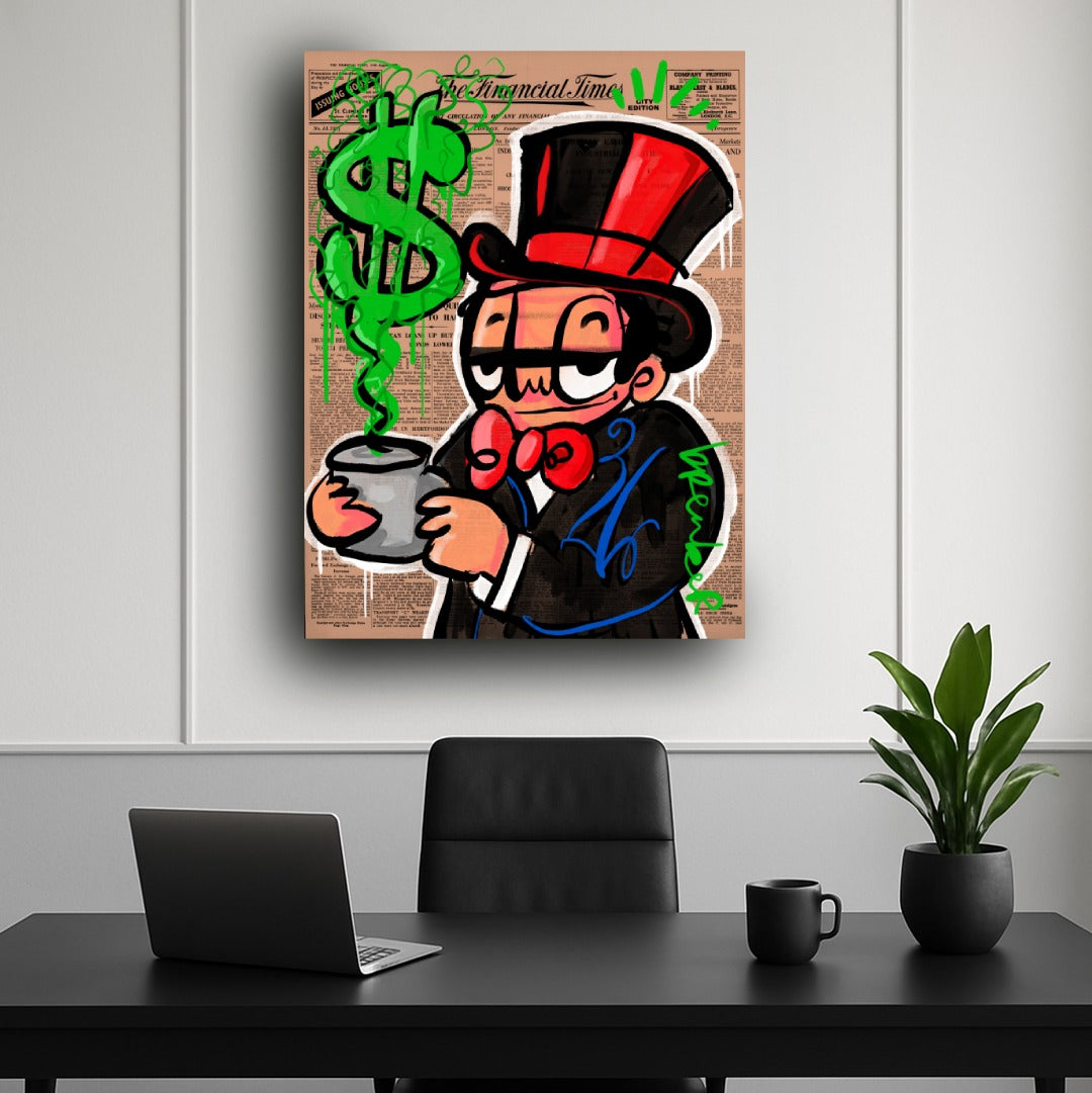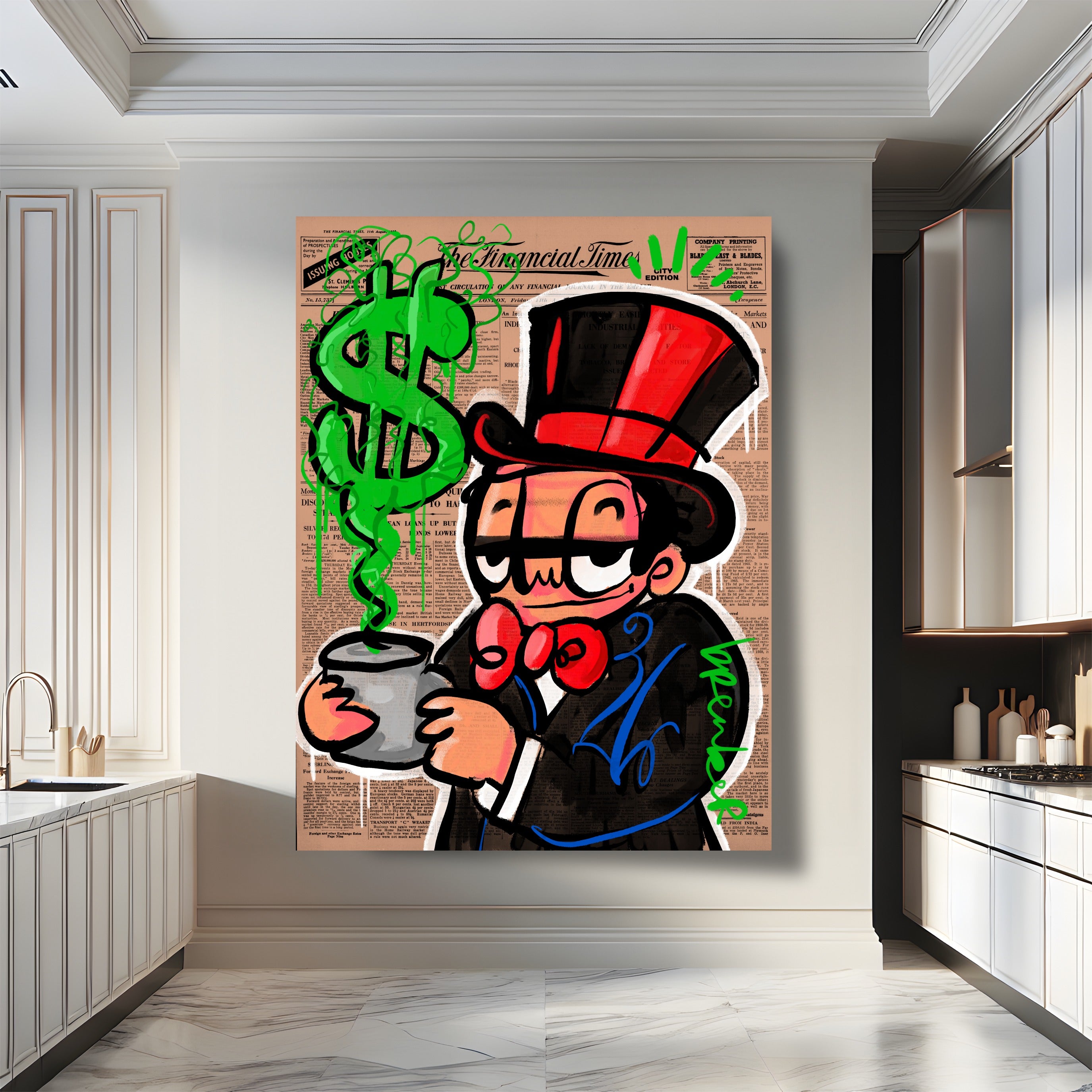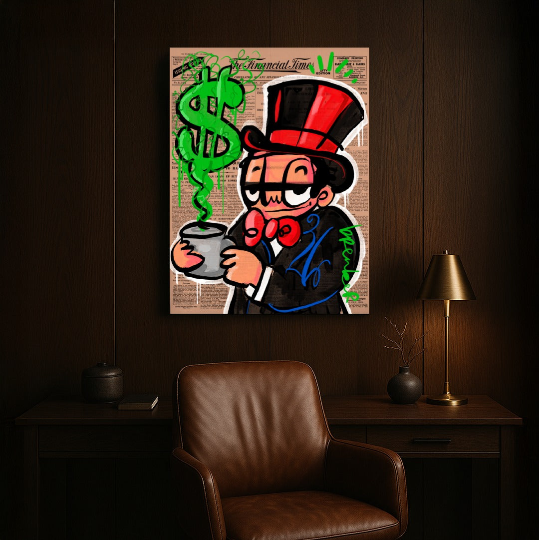 Morgens schnell Geld verdienen. Mr. Cash auf einer alten Ausgabe der Financial Times. Für alle, die morgens nur an zwei Dinge denken: Kaffee und Bargeld.