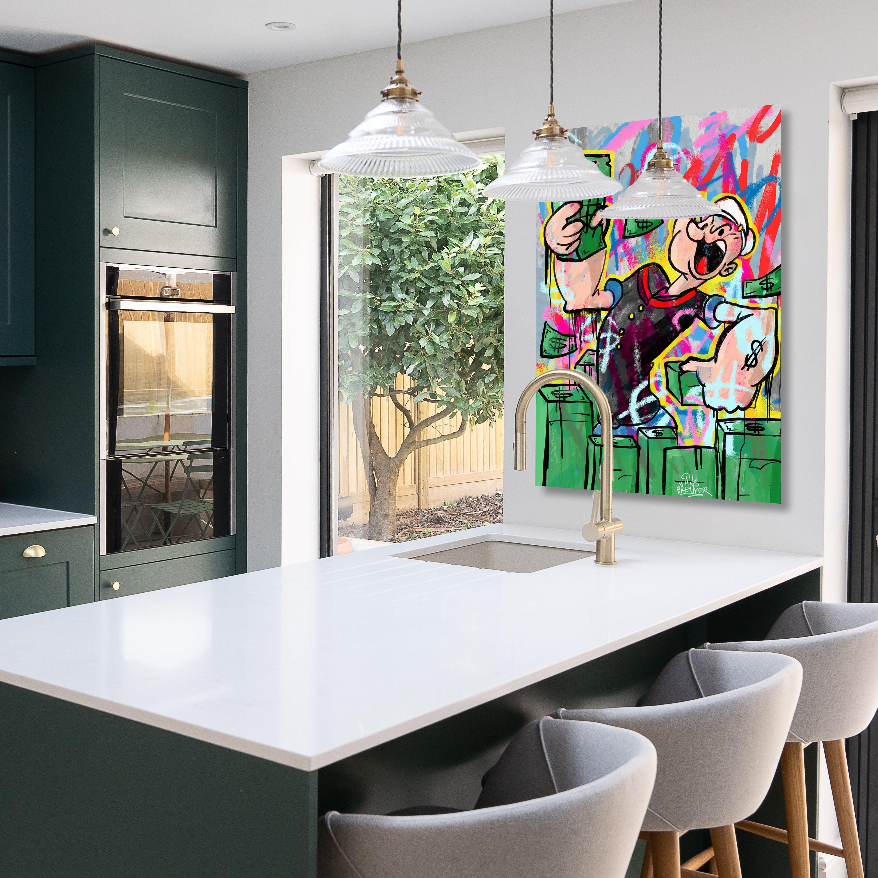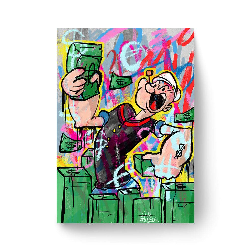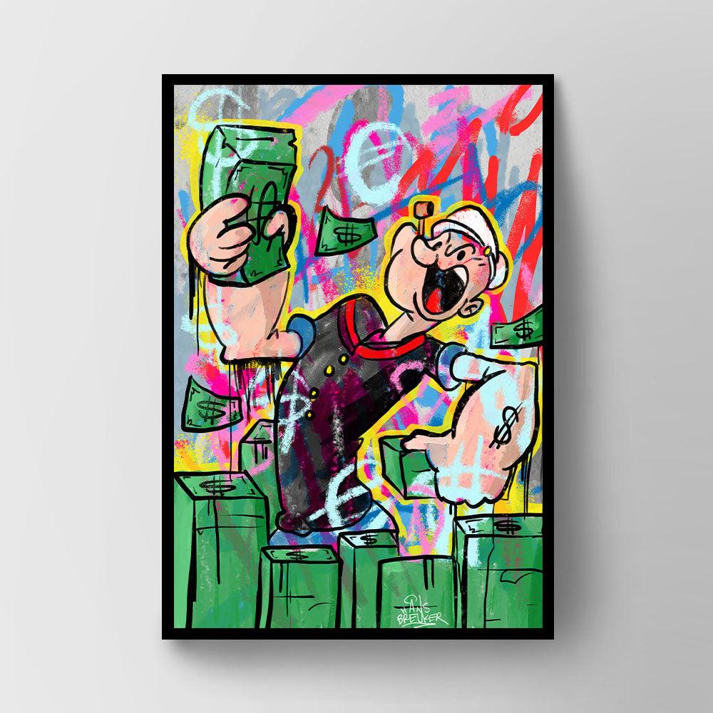 Popeye-Mix mit Street Art und einem dicken Stapel Geldscheinen auf Graffiti-Hintergrund.