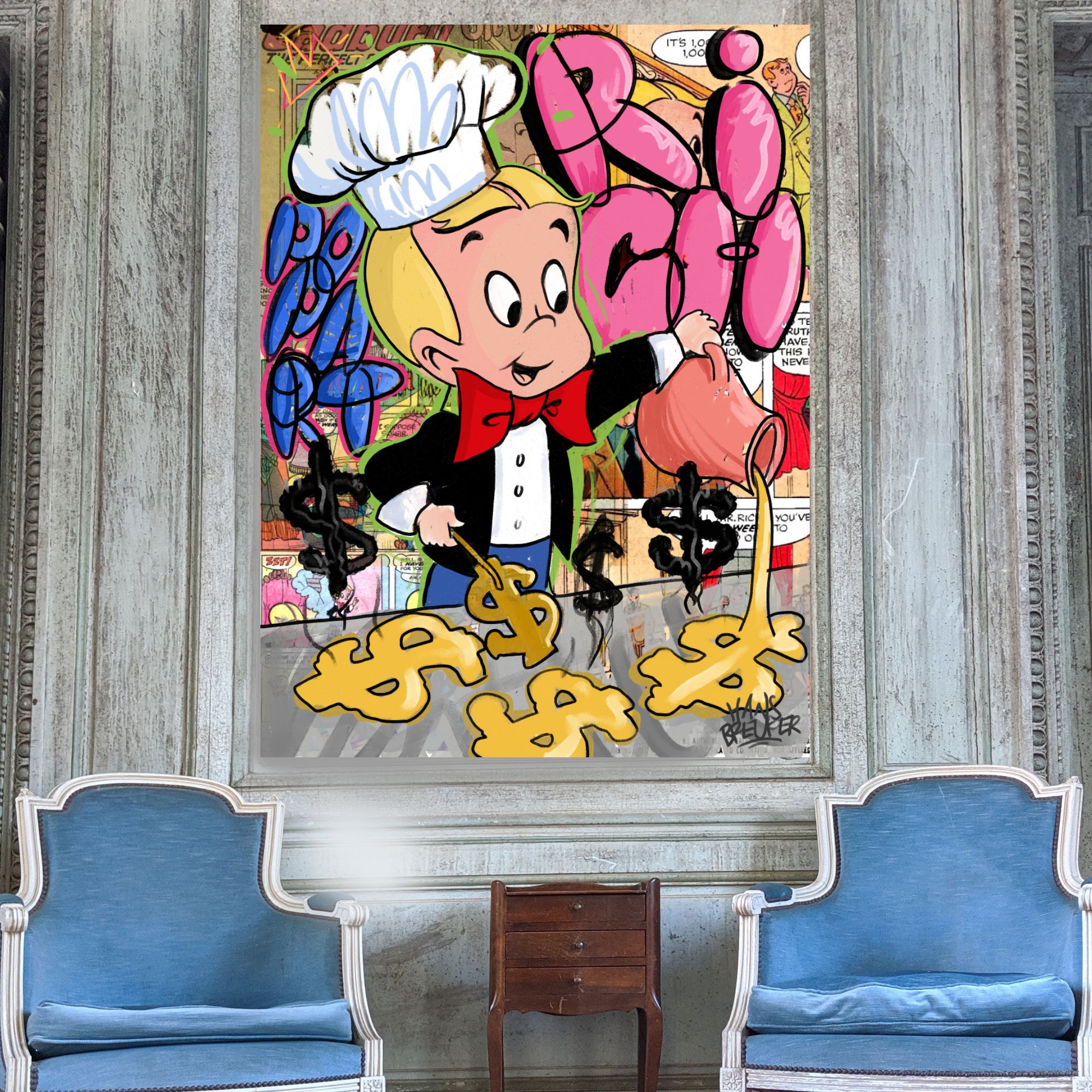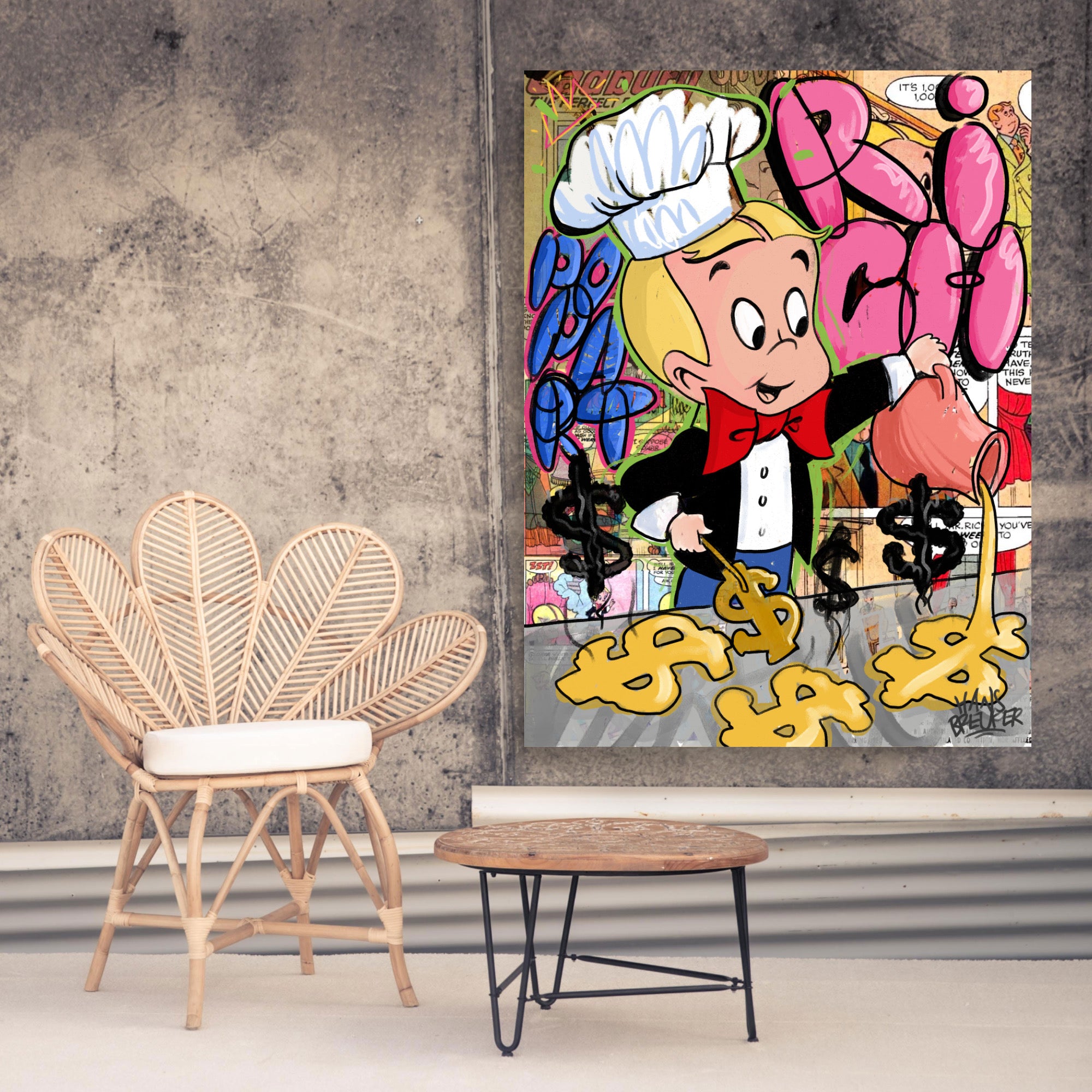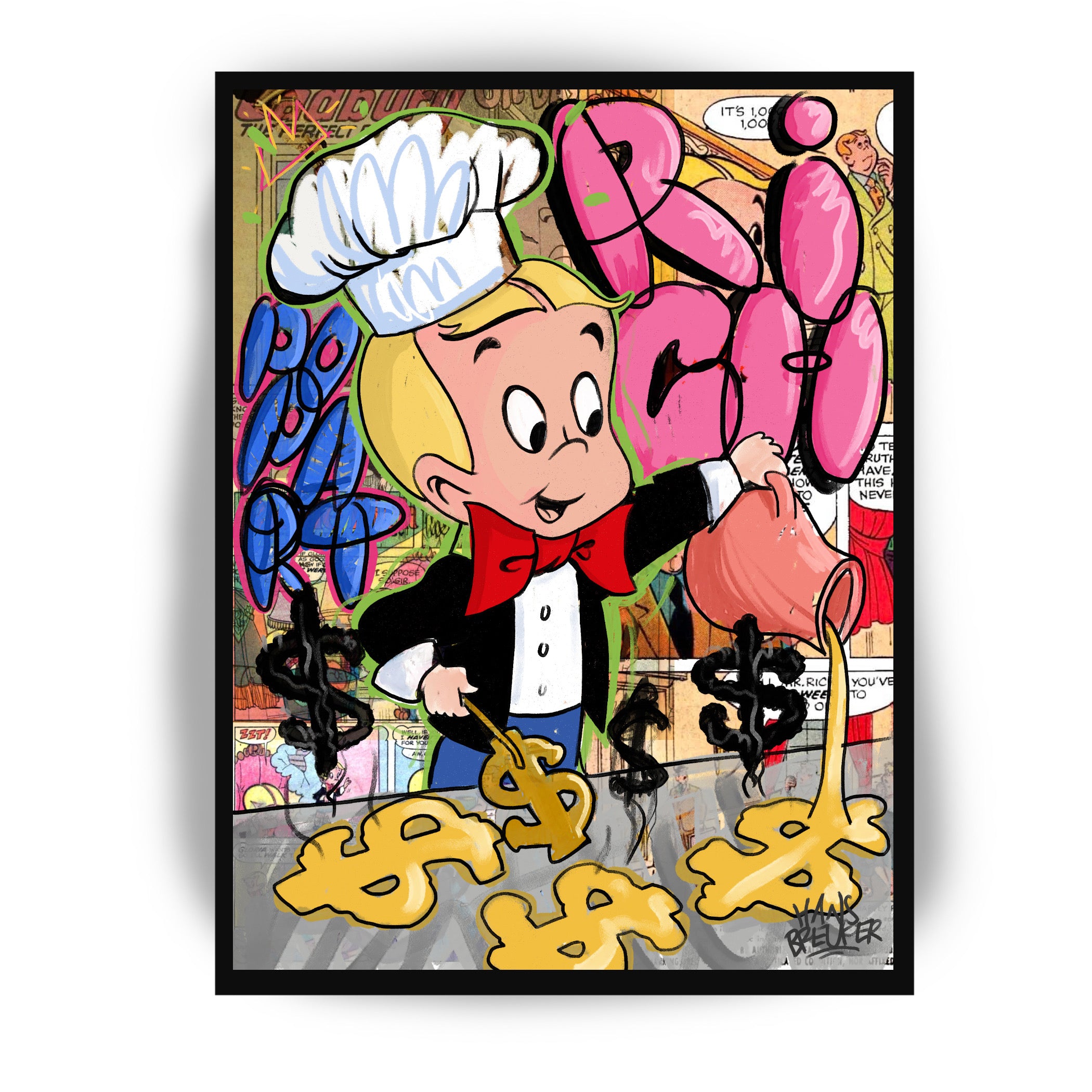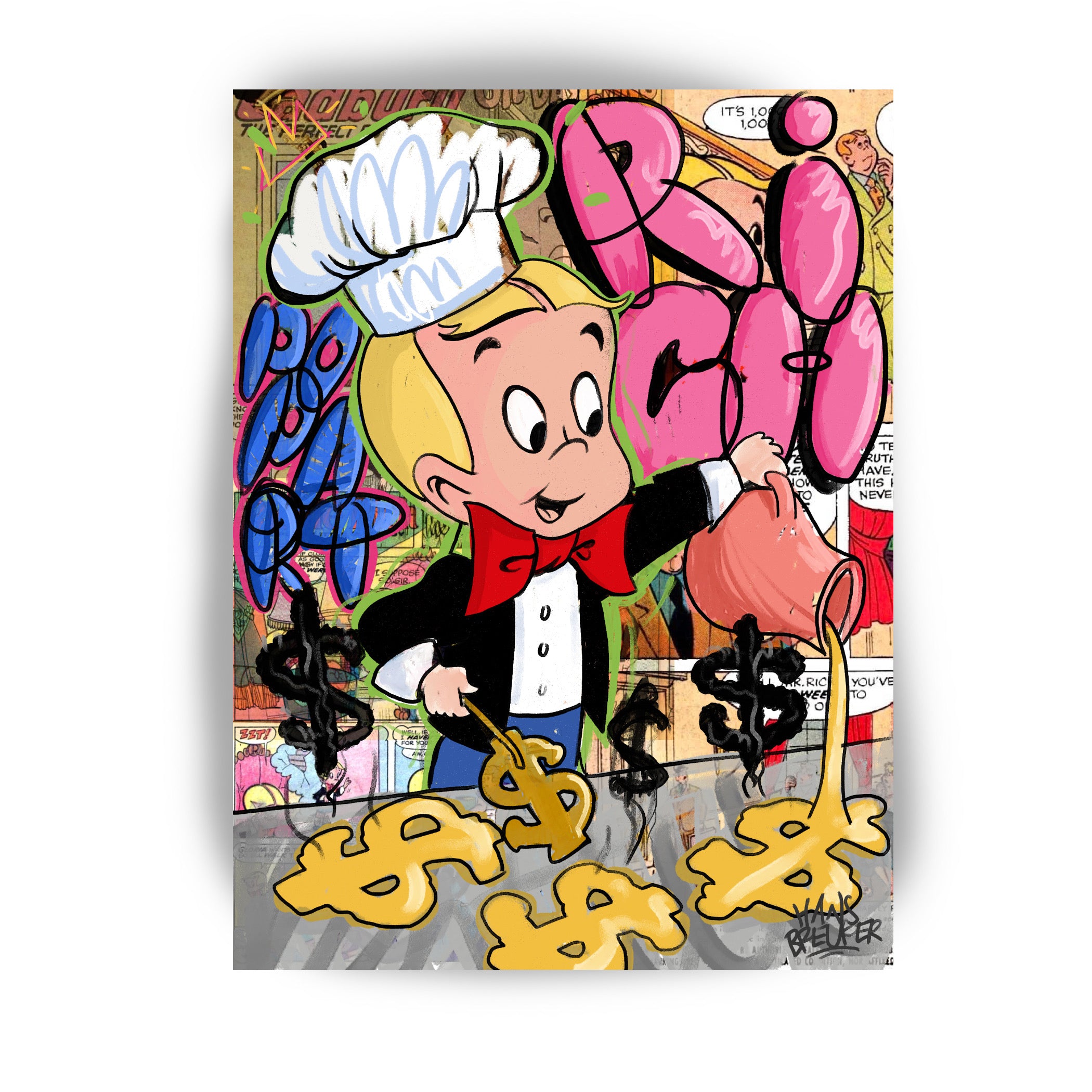 Das Kunstwerk: „Rich Breakfast“ nimmt Sie mit auf eine Reise durch die reiche Welt von Richie Rich, dem reichsten Kind der Welt. Hans Breuker hat diesen beliebten Charakter mit leuchtenden Farben, scharfen Linien und einer verspielten Ästhetik, die für die Pop-Art-Bewegung charakteristisch ist, zum Leben erweckt. Die Kombination aus der ikonischen Figur Richie Rich und dem Vintage-Comic-Hintergrund erinnert an eine Ära jugendlicher Abenteuer und grenzenloser Fantasie.