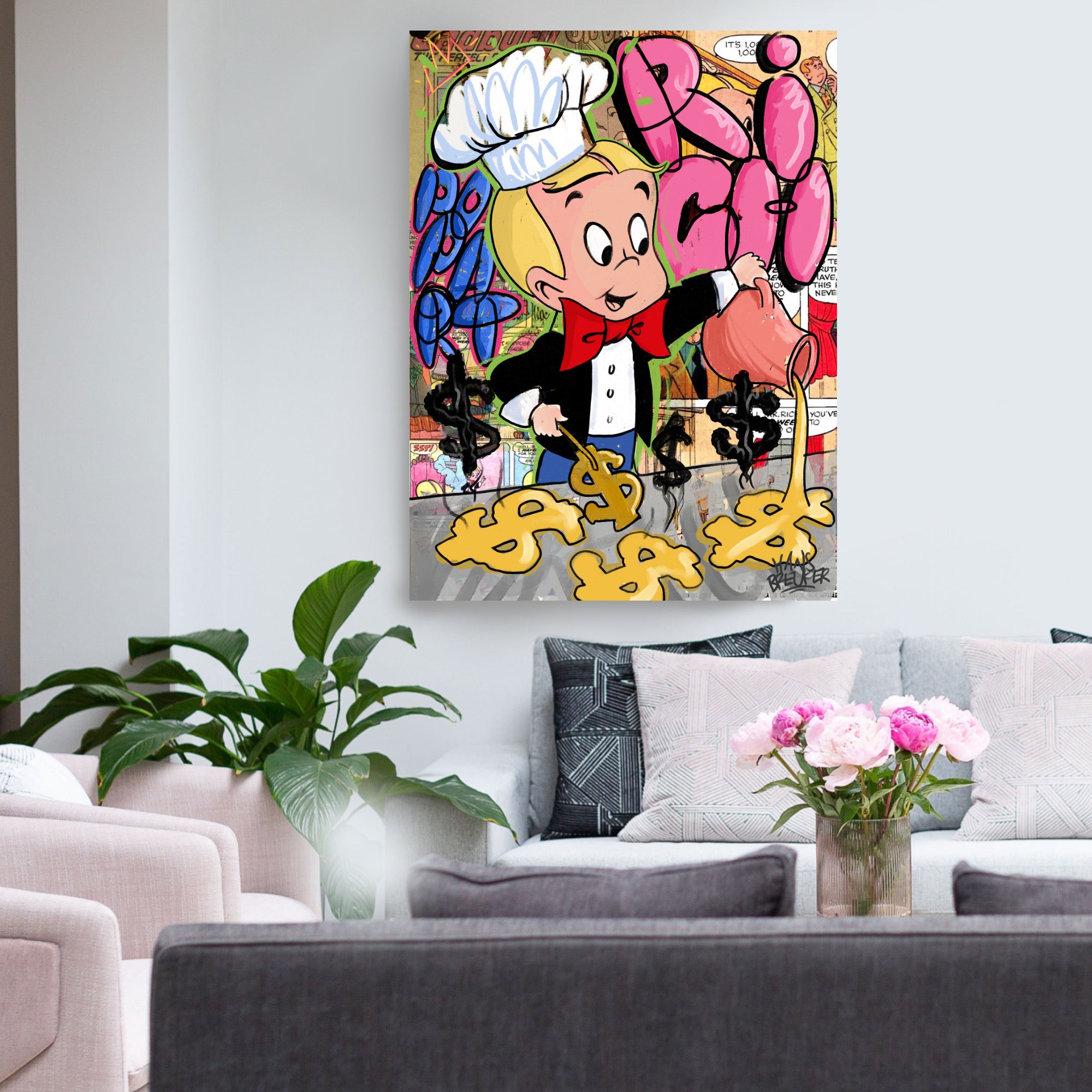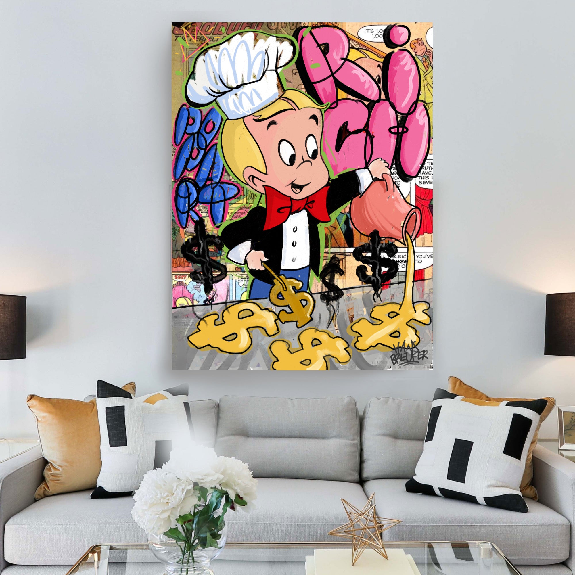 Abmessungen und Verfügbarkeit: „Rich Breakfast“ ist in verschiedenen Größen erhältlich, um perfekt in Ihren Wohnraum zu passen. Ob Sie sich für ein auffälliges Großformat oder ein intimeres Kunstwerk entscheiden, Sie können die Magie von Richie Rich in Ihren Alltag bringen. Erhältlich auf Poster, Leinwand und Plexiglas