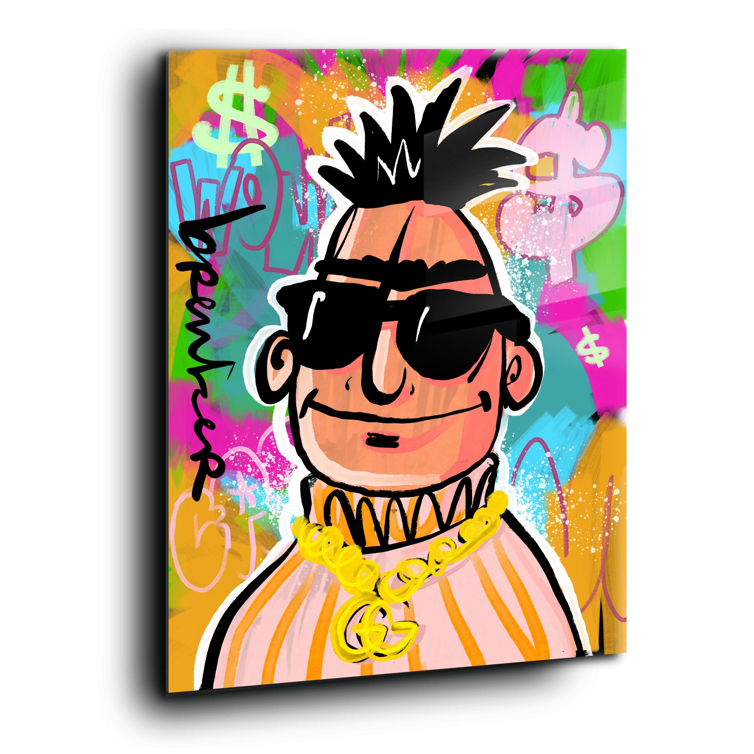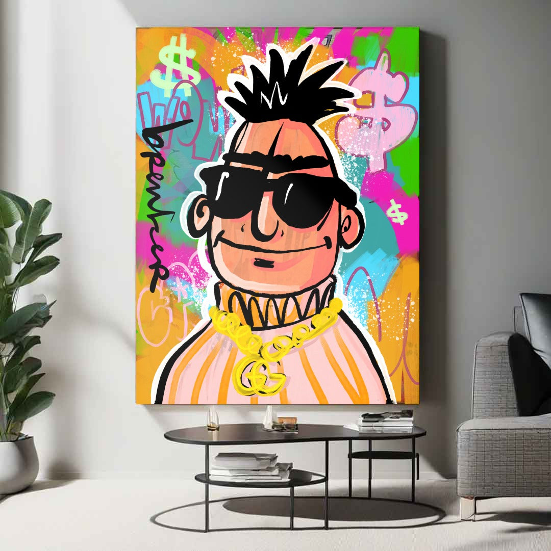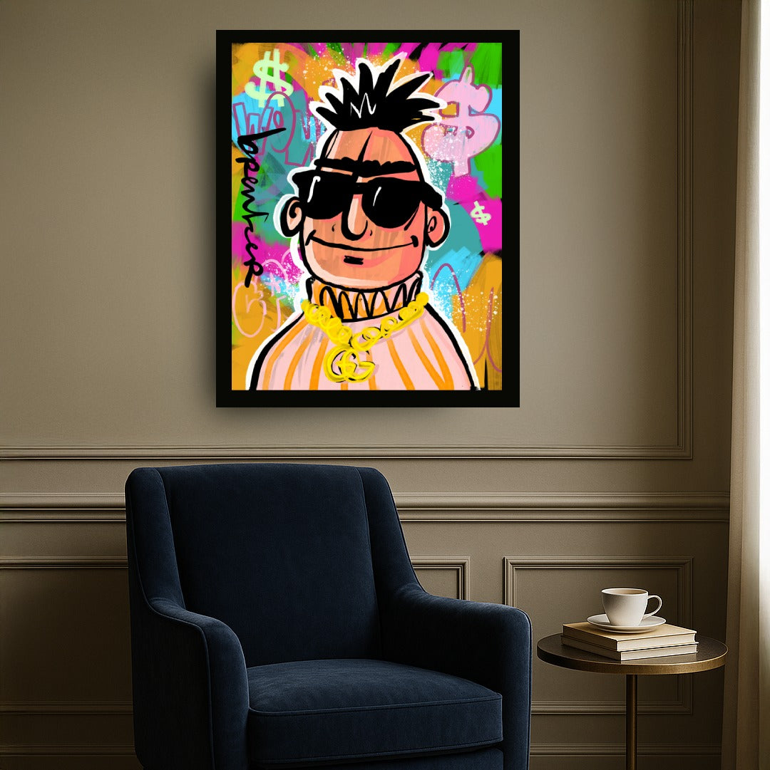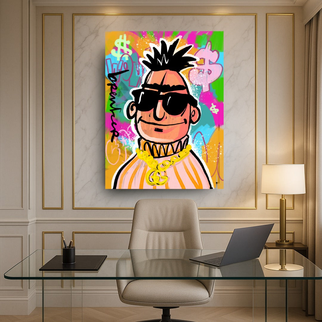 Bert Bad Boy ist dein neuer Lieblingsheld der Pop-Art: ein ausdrucksstarkes, farbenfrohes Porträt mit urbanem Flair, luxuriösen Details und einer Prise cartoonhafter Frechheit. Mit seiner übergroßen Sonnenbrille, der Goldkette und dem lässigen Grinsen ist Bert das ultimative Symbol für modernen Selbstbewusstsein – eine Figur, die jedem Raum sofort eine besondere Ausstrahlung verleiht.