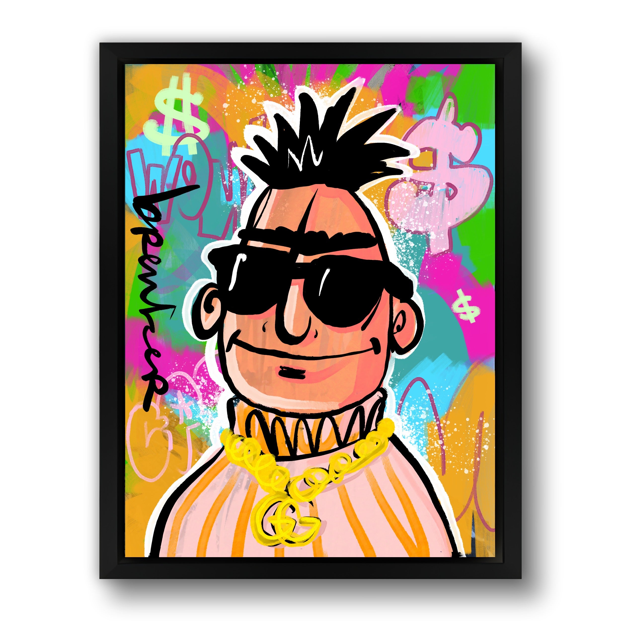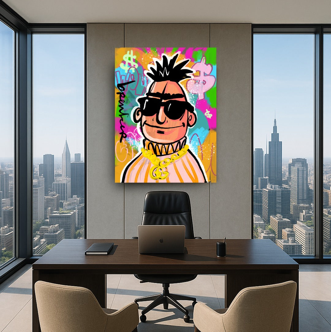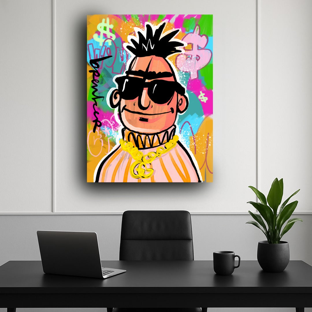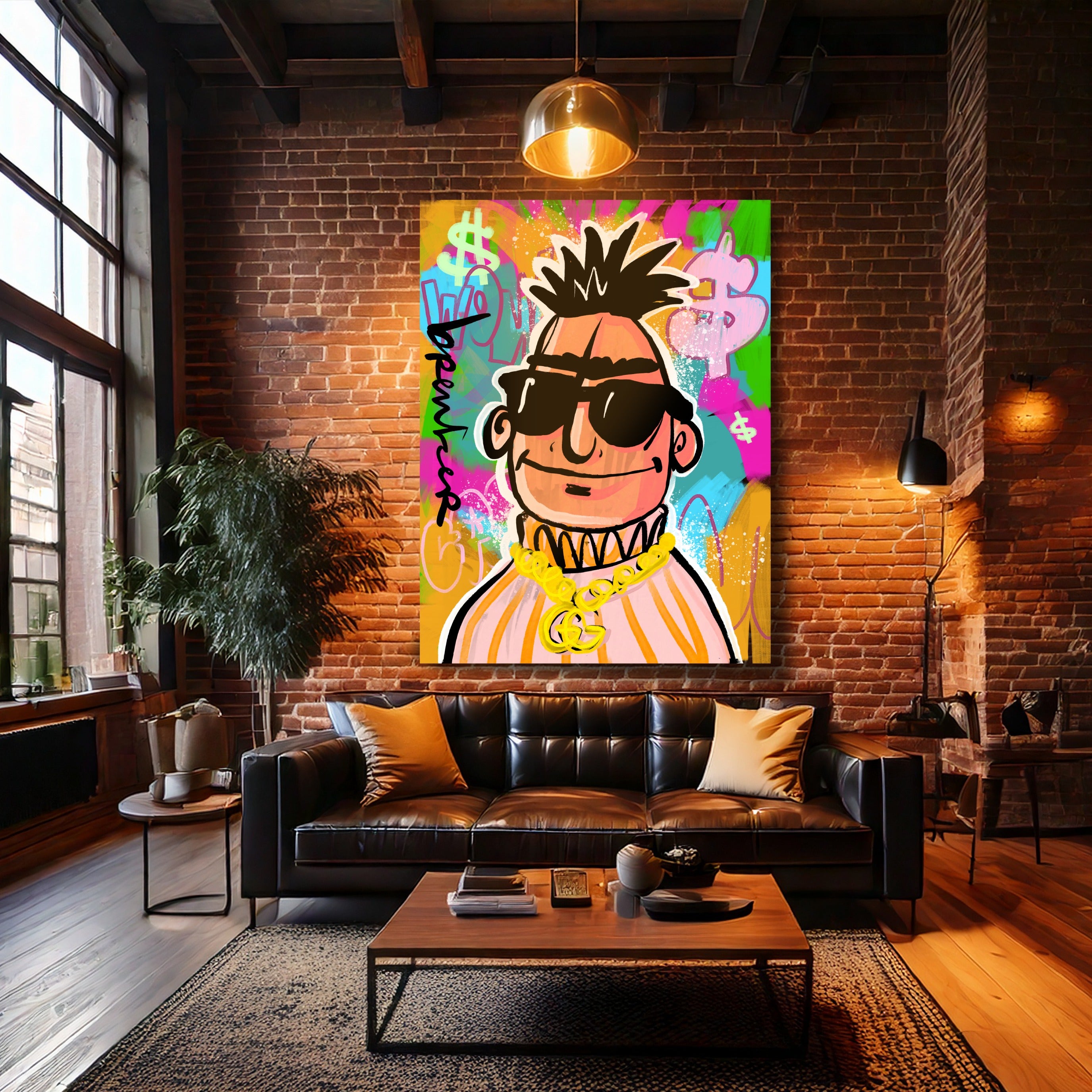 Bert Bad Boy ist dein neuer Lieblingsheld der Pop-Art: ein ausdrucksstarkes, farbenfrohes Porträt mit urbanem Flair, luxuriösen Details und einer Prise cartoonhafter Frechheit. Mit seiner übergroßen Sonnenbrille, der Goldkette und dem lässigen Grinsen ist Bert das ultimative Symbol für modernen Selbstbewusstsein – eine Figur, die jedem Raum sofort eine besondere Ausstrahlung verleiht.
