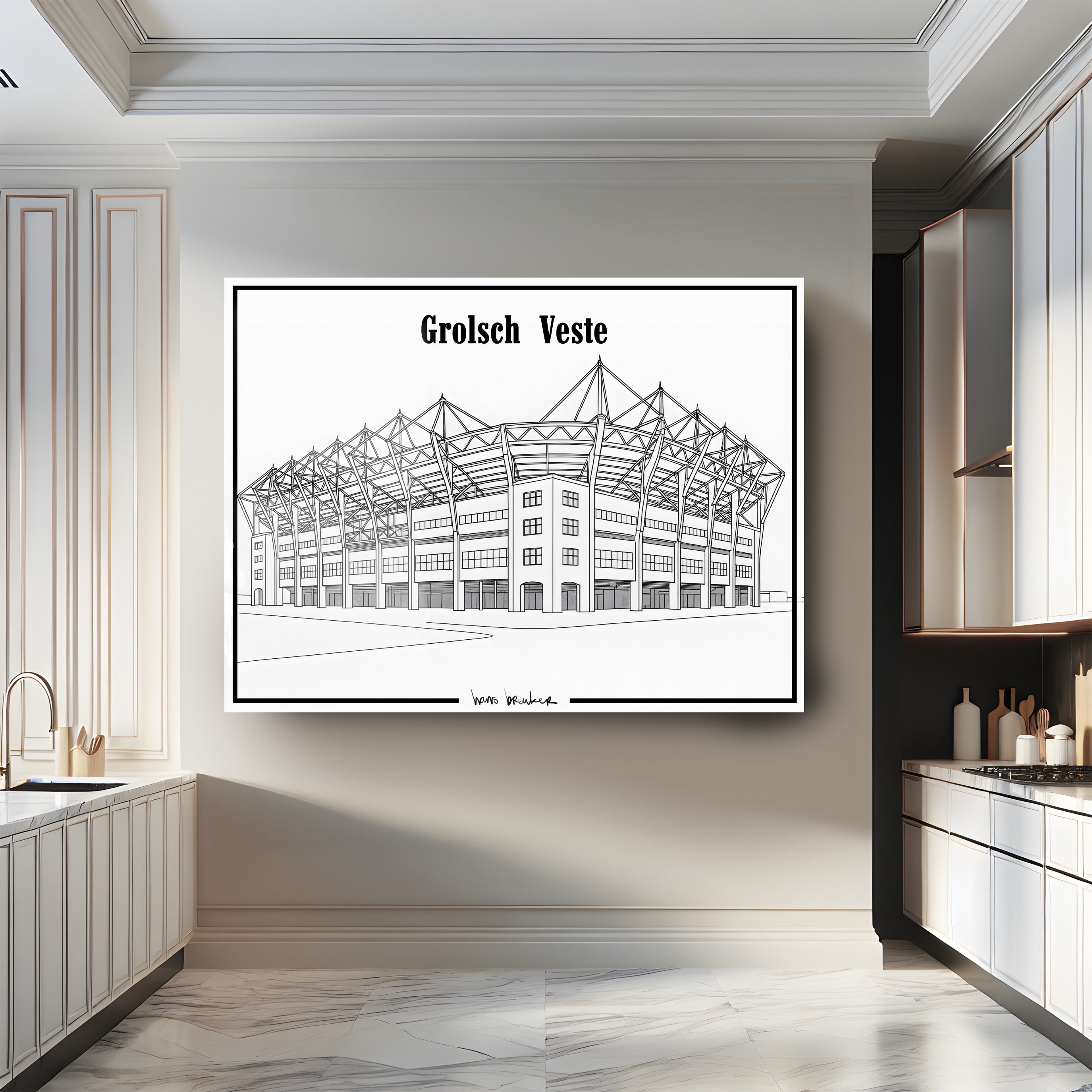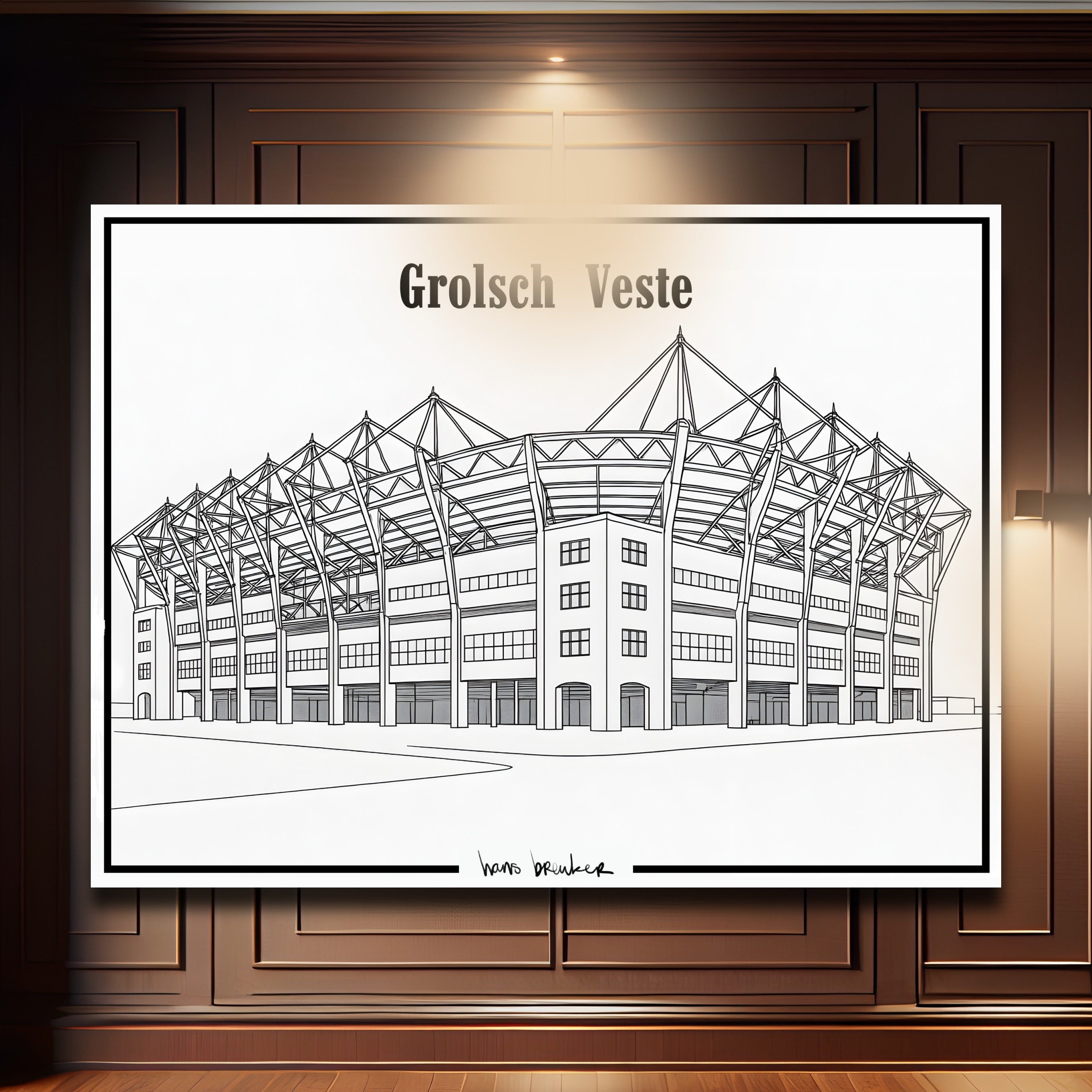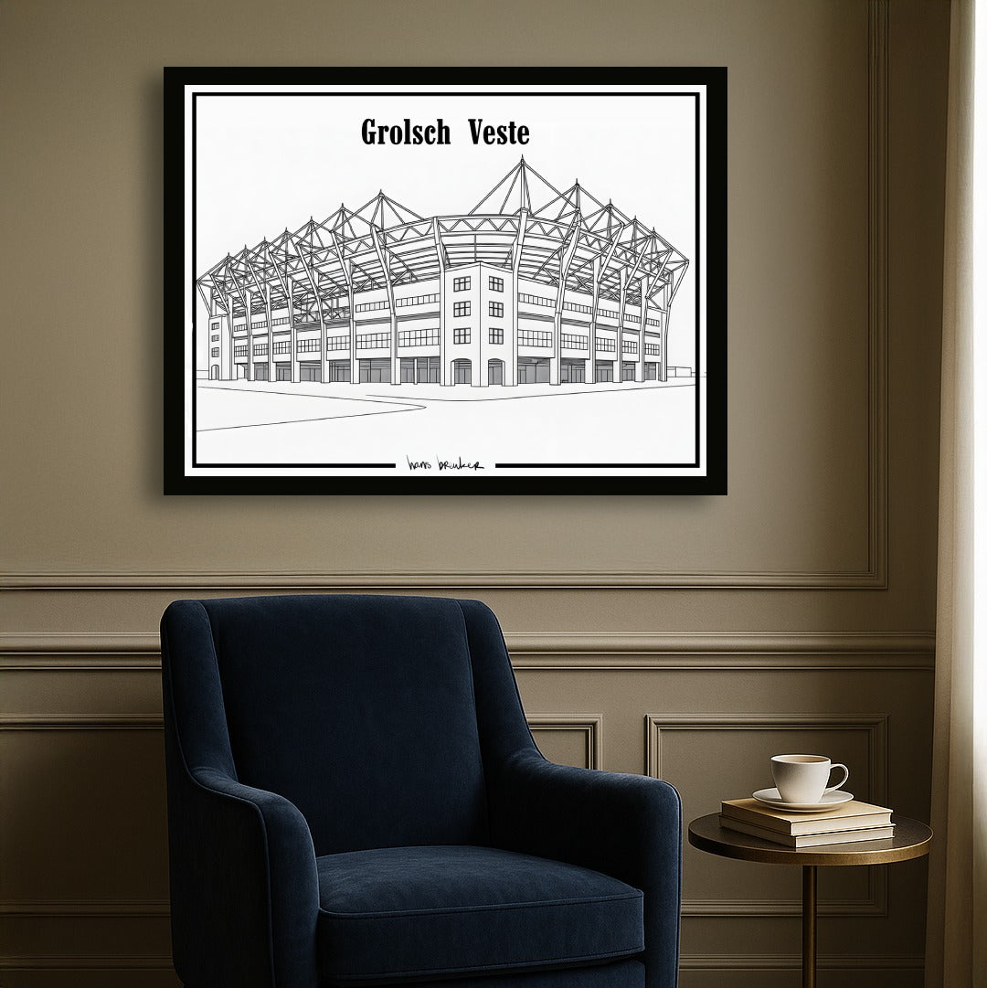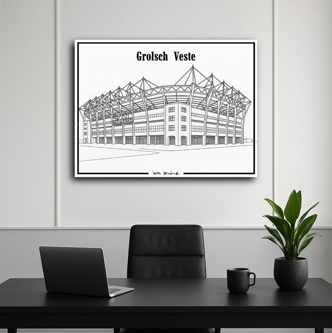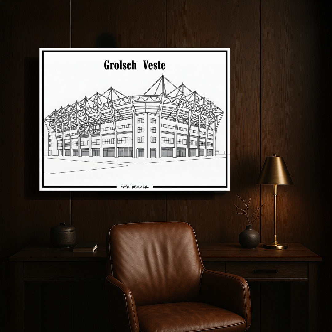 Diese elegante Strichzeichnung des Grolsch-Veste-Stadions reduziert den Stolz von Twente auf pure, klare Einfachheit. Mit dünnen, präzisen Linien und einem architektonischen Ansatz fängt dieses Werk die ikonischen Formen des Stadions schnörkellos ein – klar, minimalistisch und unglaublich stilvoll.