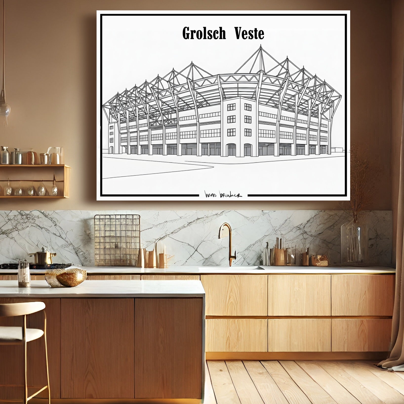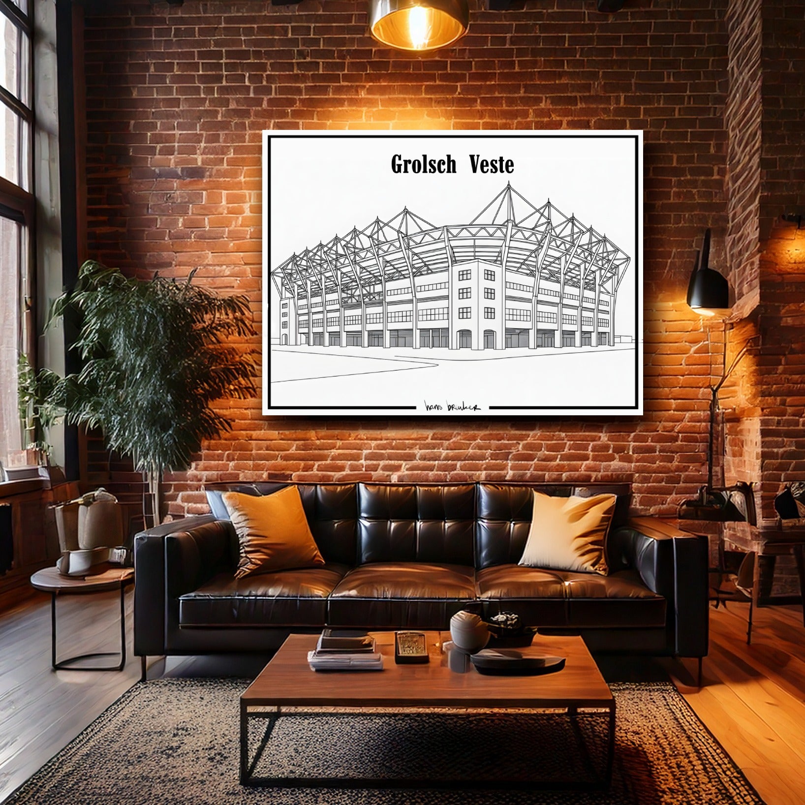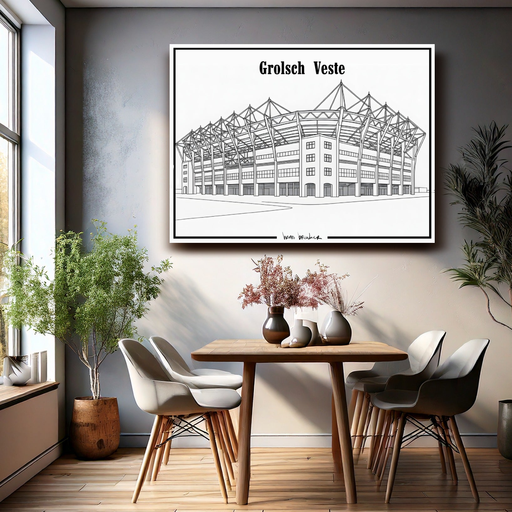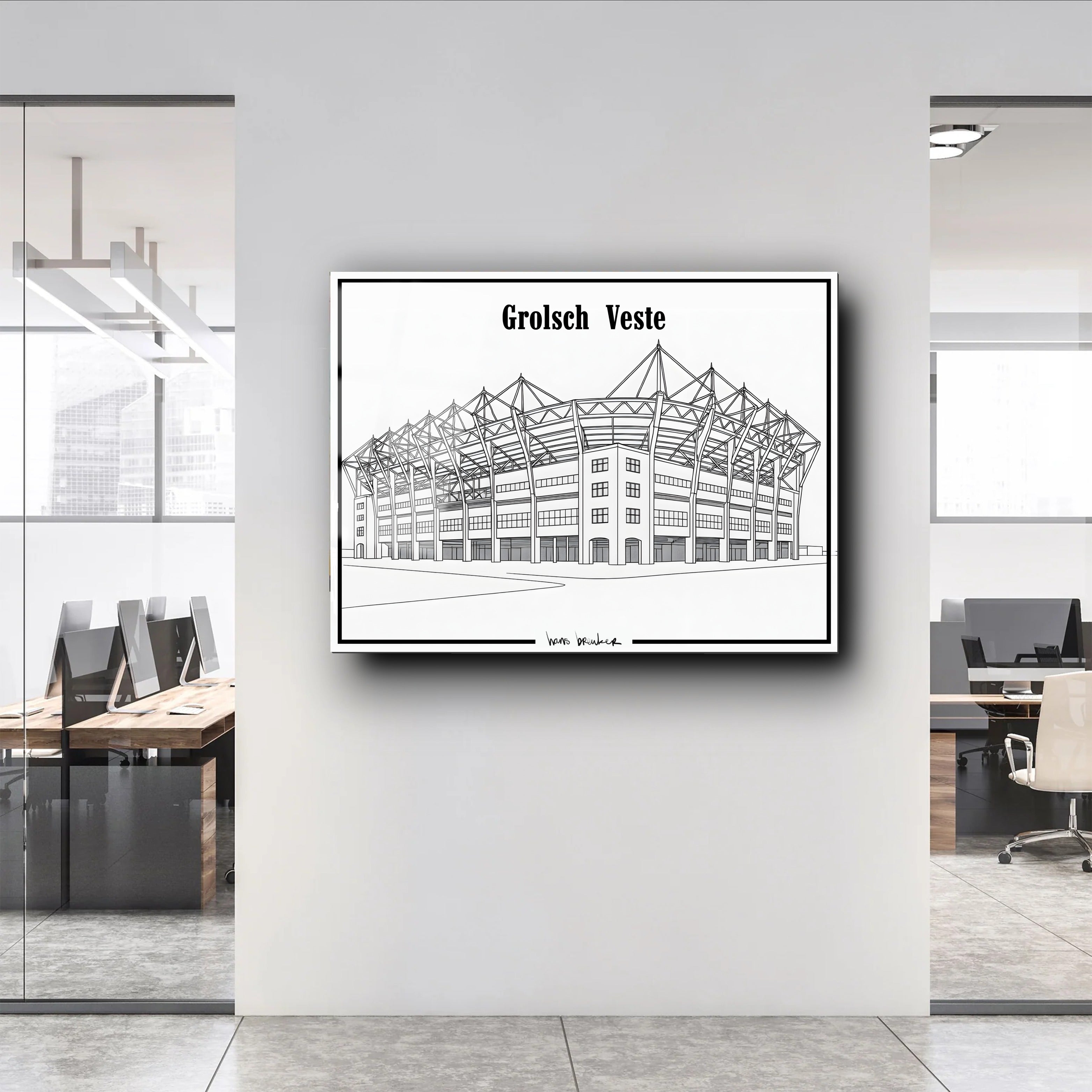Diese elegante Strichzeichnung des Grolsch-Veste-Stadions reduziert den Stolz von Twente auf pure, klare Einfachheit. Mit dünnen, präzisen Linien und einem architektonischen Ansatz fängt dieses Werk die ikonischen Formen des Stadions schnörkellos ein – klar, minimalistisch und unglaublich stilvoll.