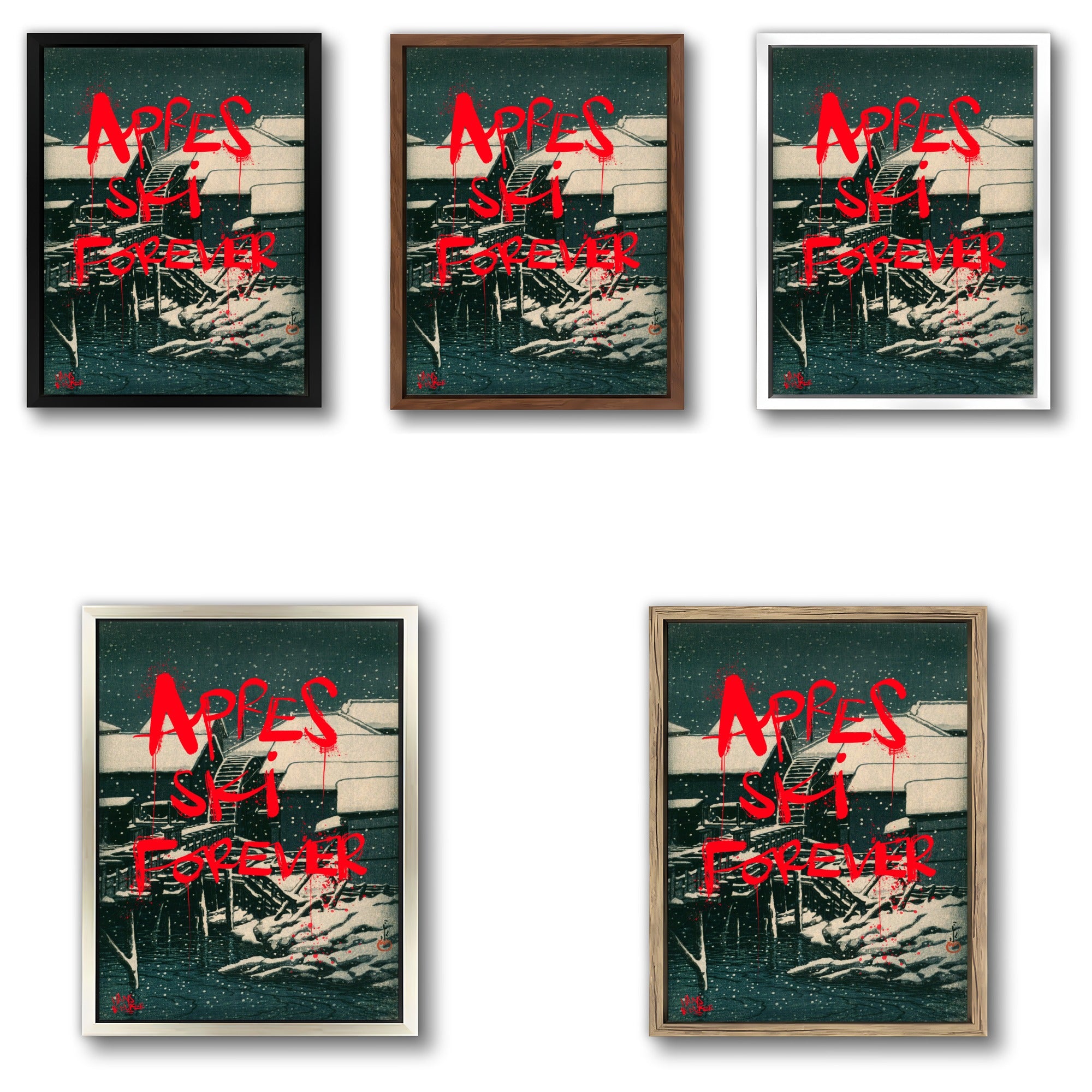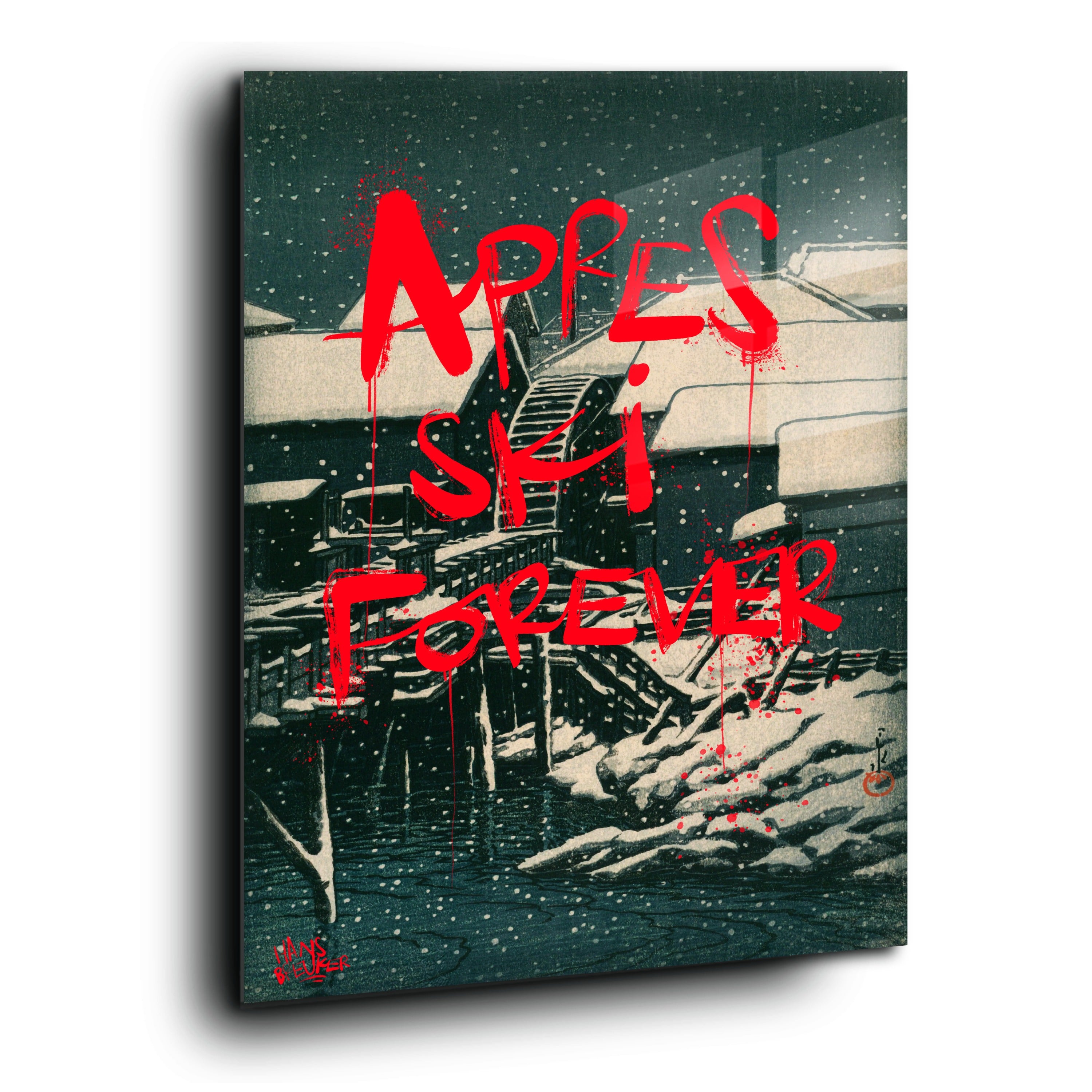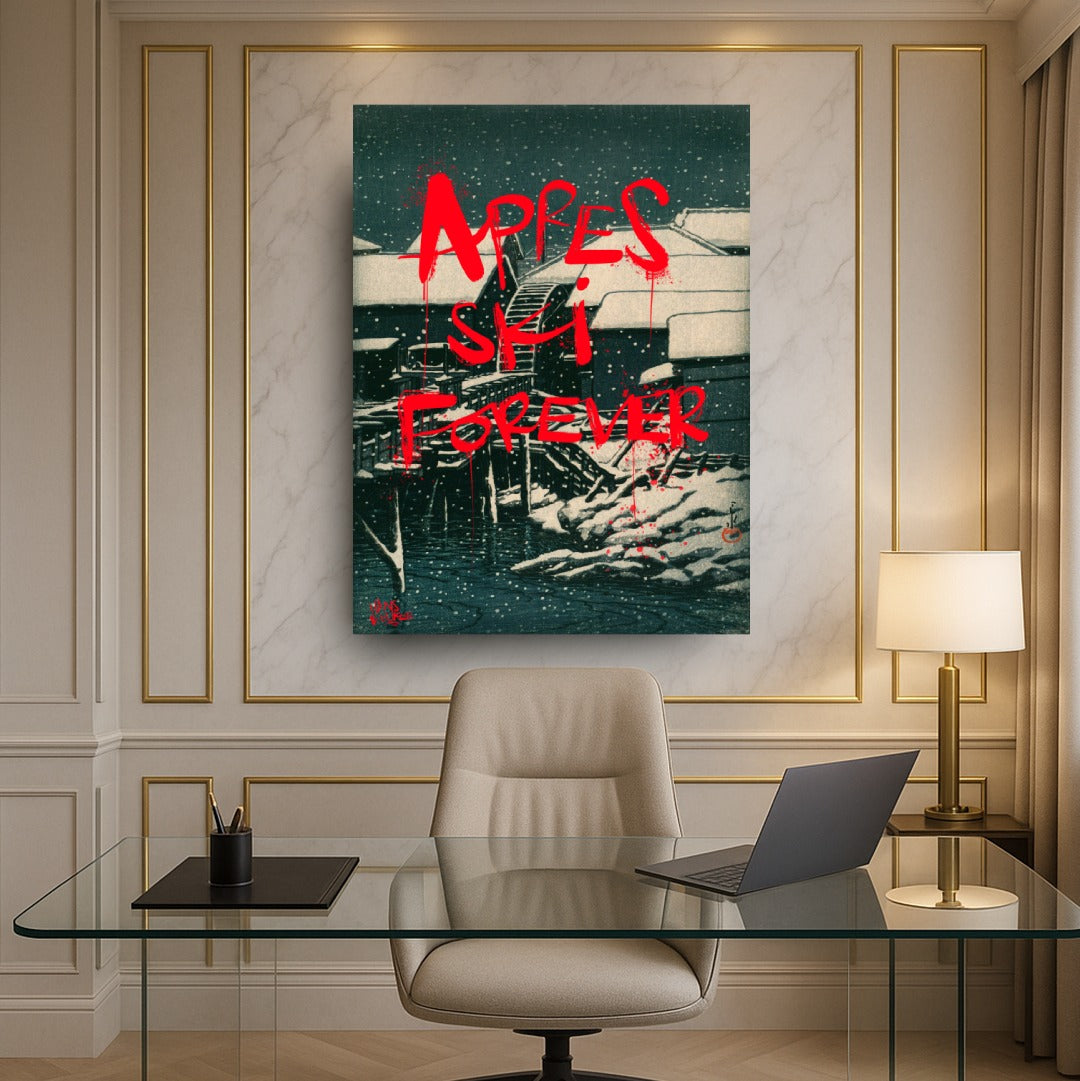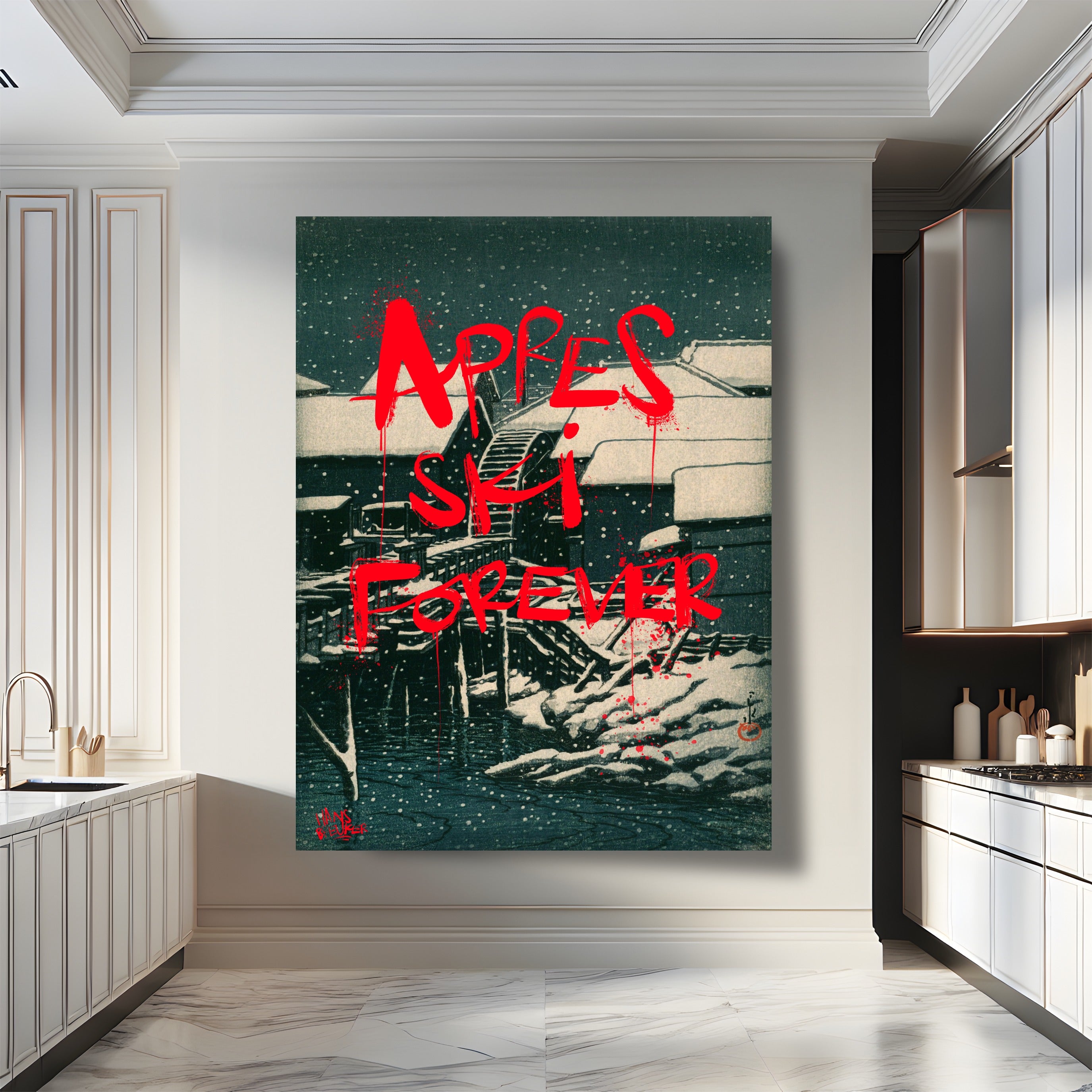 Après Ski Forever is gebaseerd op een aangepaste prent in de stijl van Kawase Hasui. Het besneeuwde landschap, de architectuur en de koele wintertinten ademen rust, eenvoud en verstilling. Japanse kunst vormt hier het decor voor een moment waarop alles even stilvalt — net na de afdaling.