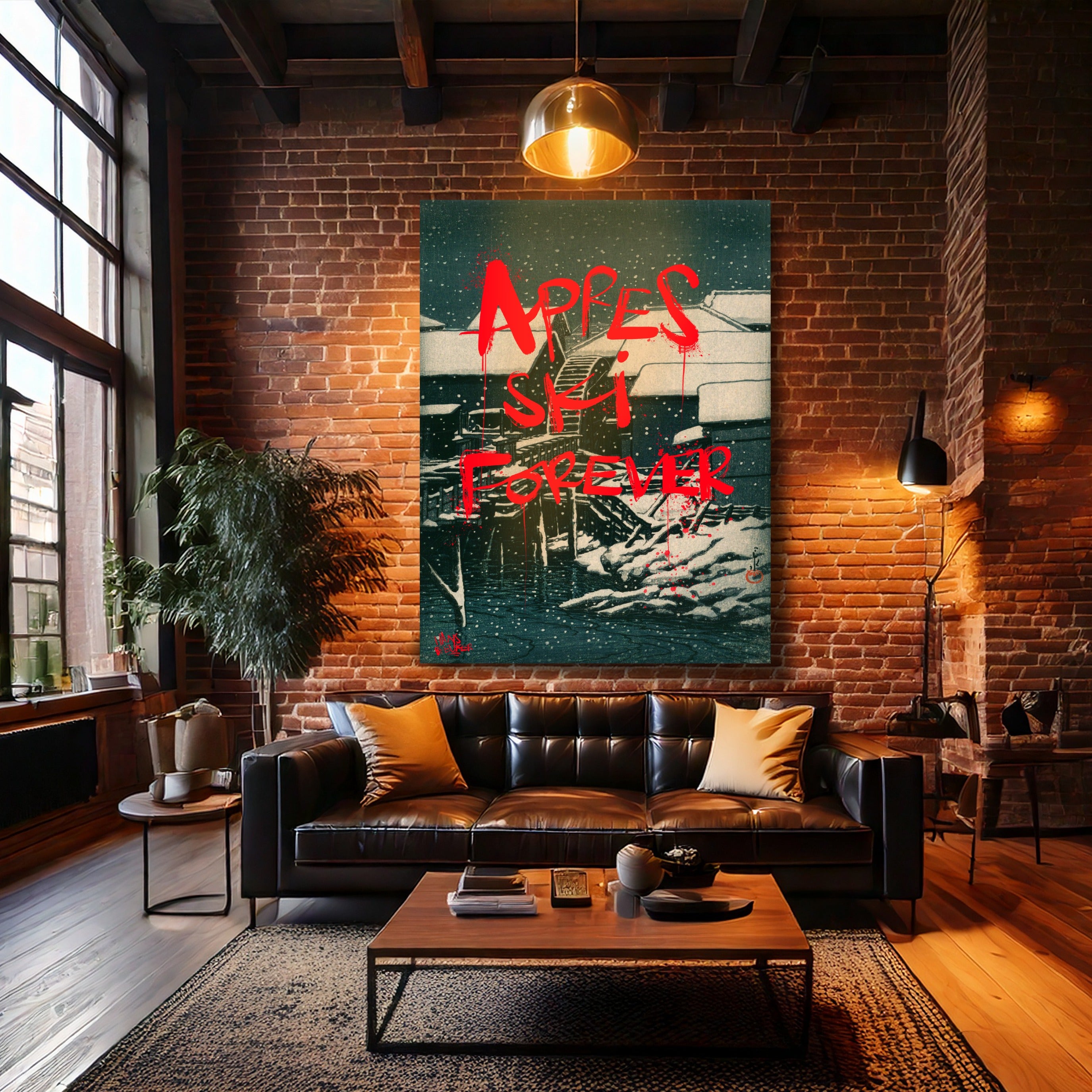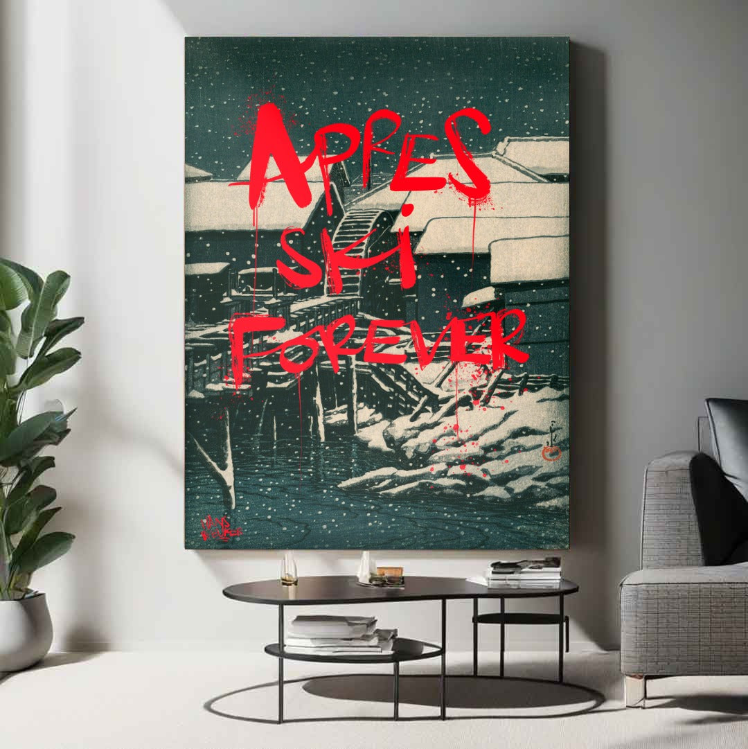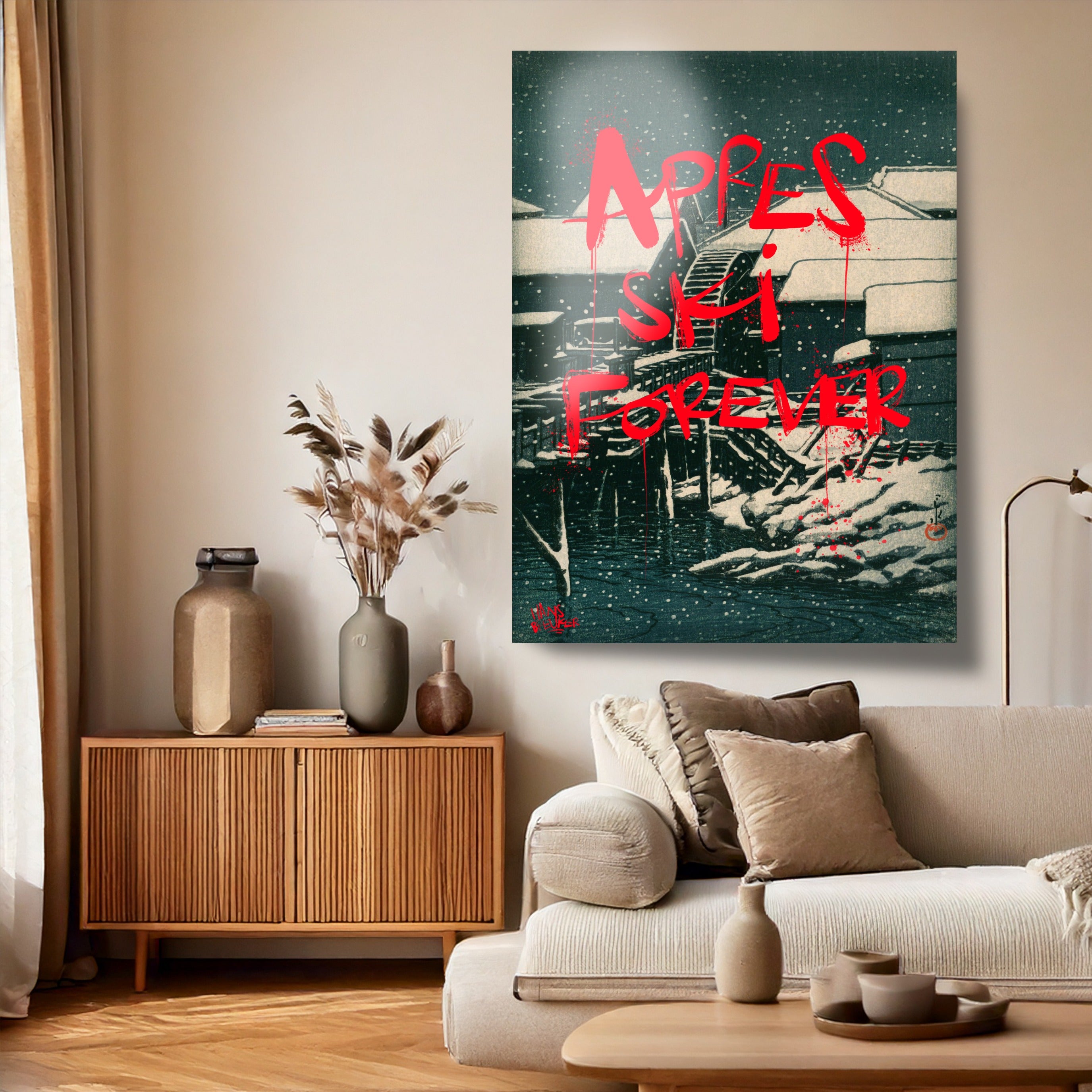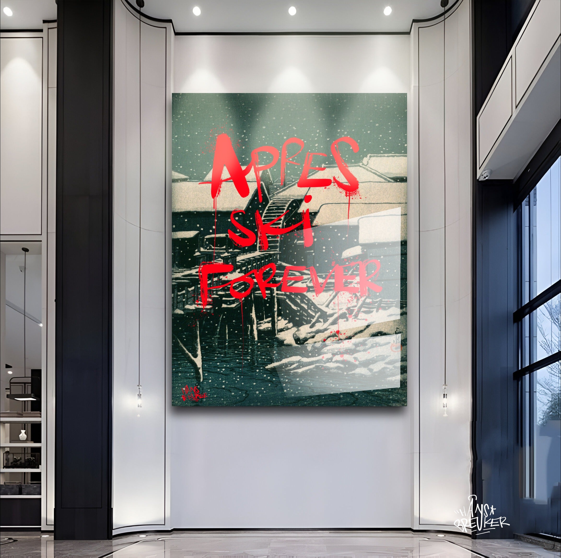 De donkere wintertinten en het besneeuwde decor geven het werk diepte en karakter, terwijl de rode typografie het schilderij laat knallen. Après Ski Forever is een stijlvol schilderij voor kantoren, chalets, woonkamers, horeca en interieurs waar energie, ambitie en plezier samenkomen.