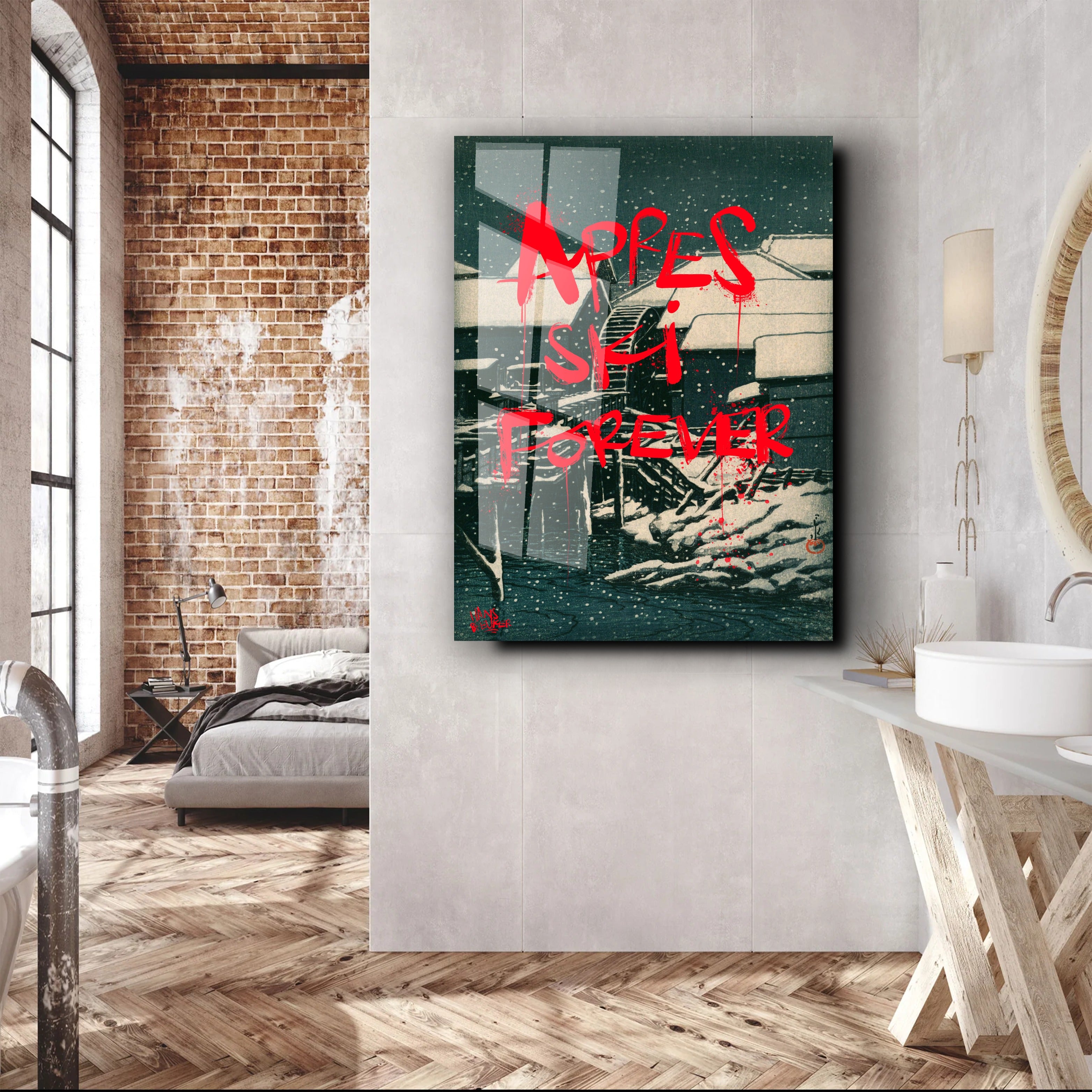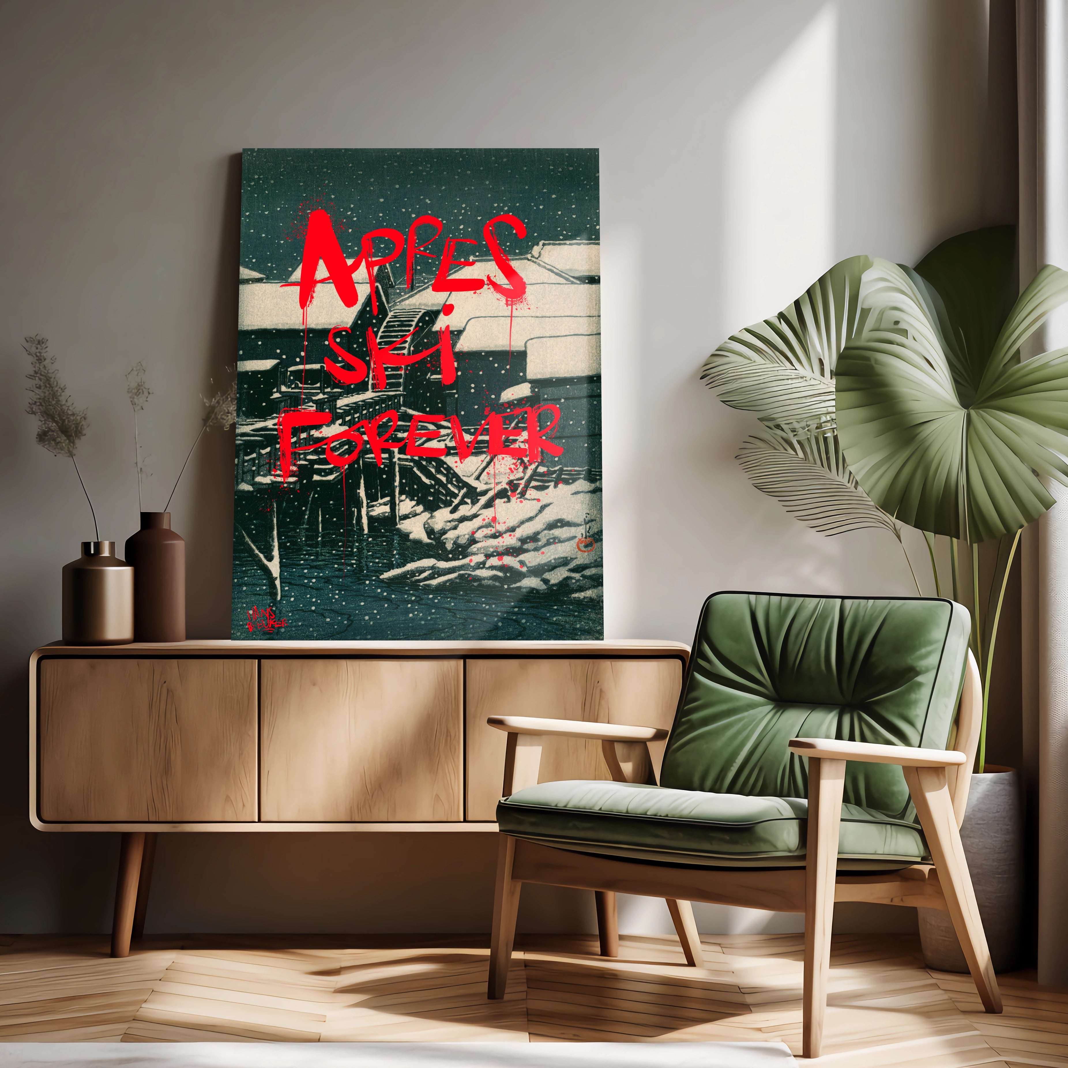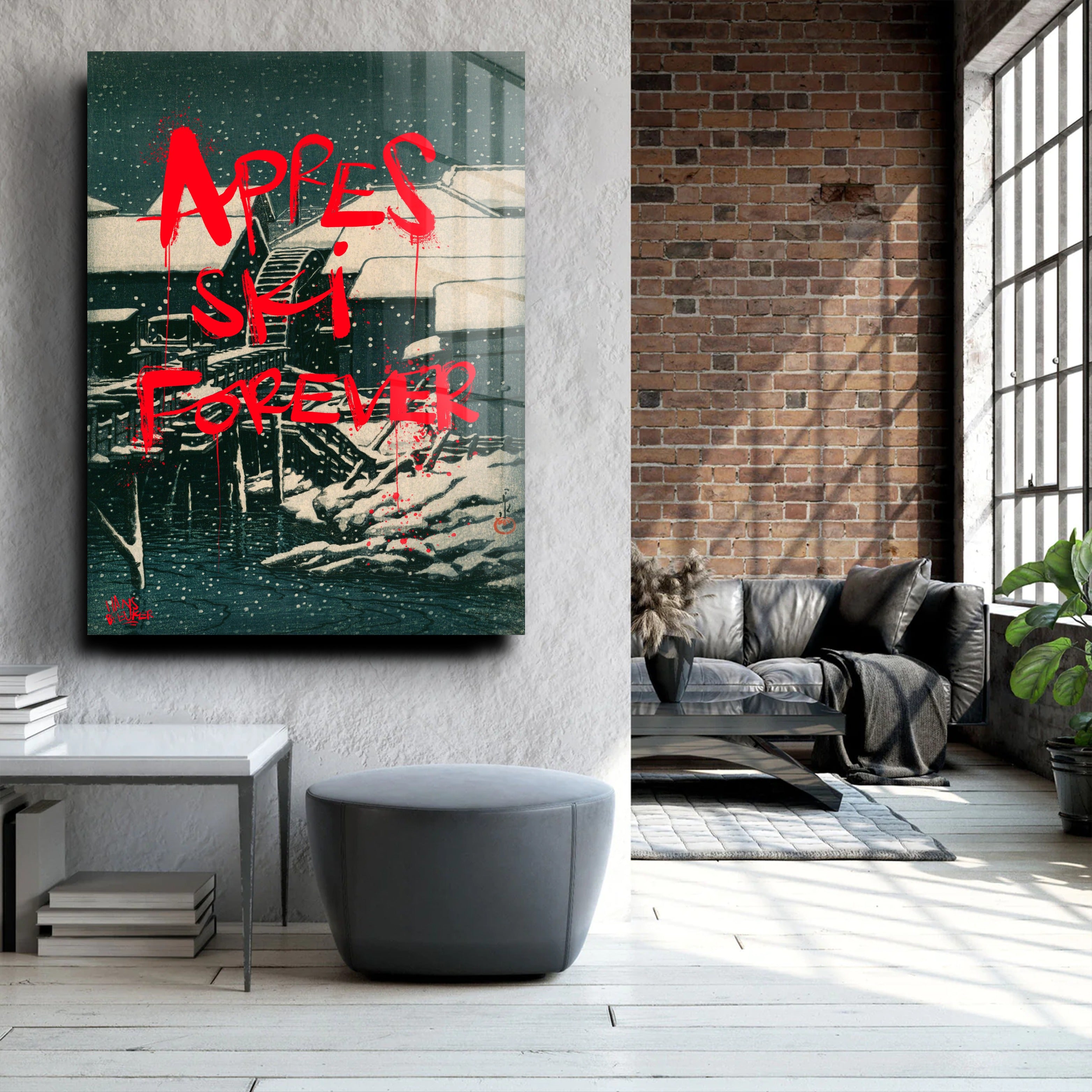 De donkere wintertinten en het besneeuwde decor geven het werk diepte en karakter, terwijl de rode typografie het schilderij laat knallen. Après Ski Forever is een stijlvol schilderij voor kantoren, chalets, woonkamers, horeca en interieurs waar energie, ambitie en plezier samenkomen.