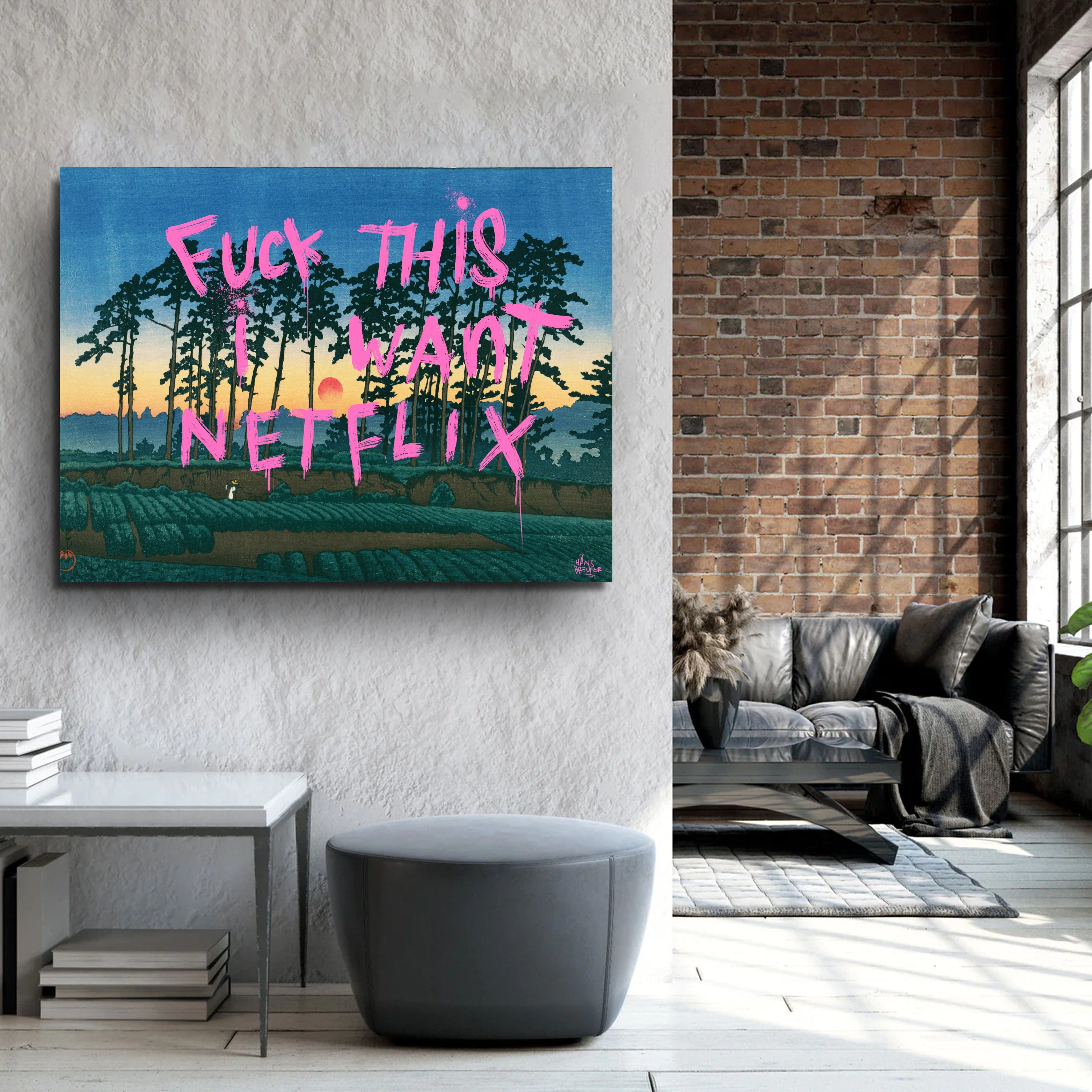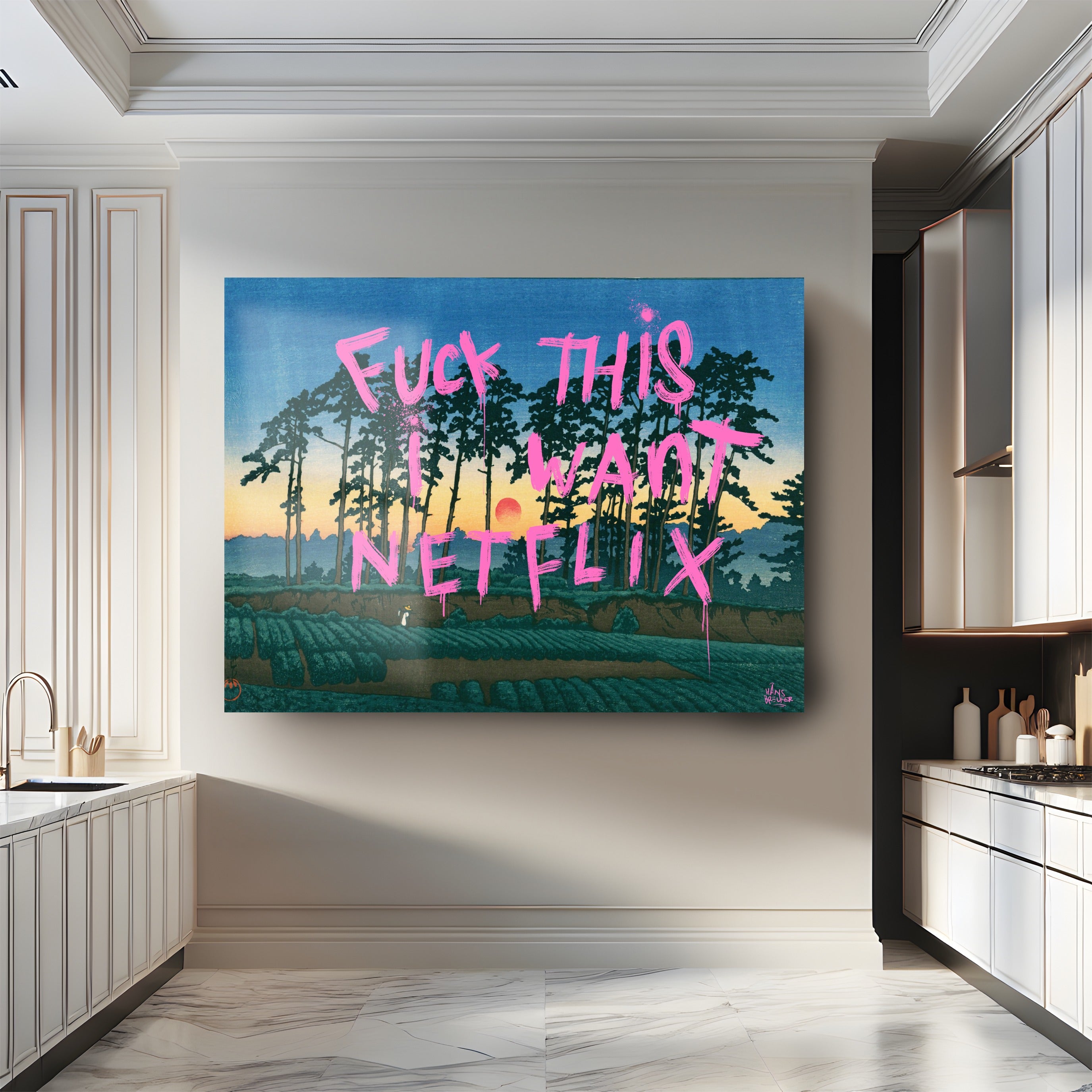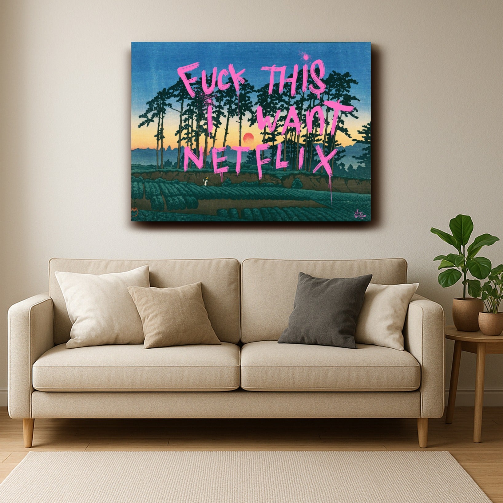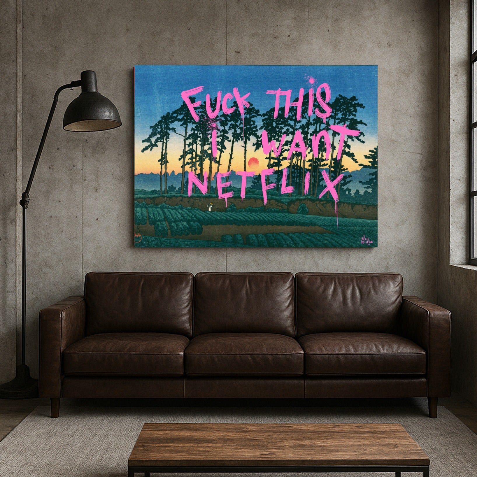 De quote “Fuck This I Want Netflix” van Hans Breuker doorbreekt die rust op brute, eerlijke wijze. Geen poëzie, geen omwegen — maar een herkenbaar moment van mentale uitcheck. Het werk gaat niet over luiheid, maar over autonomie: kiezen voor jezelf, voor rust, voor niets hoeven.