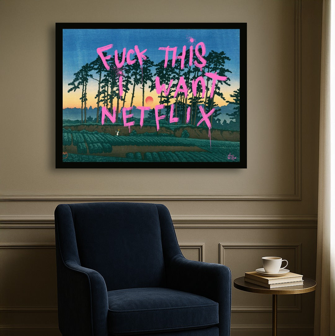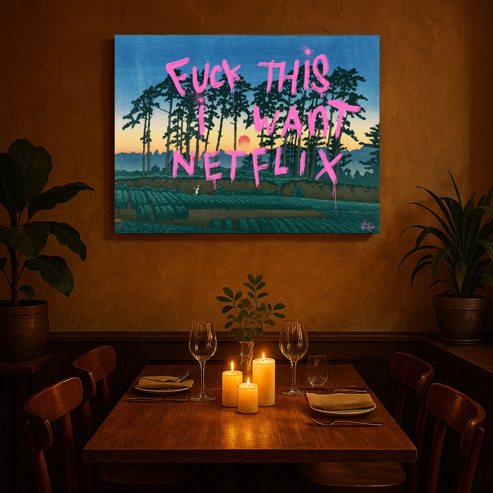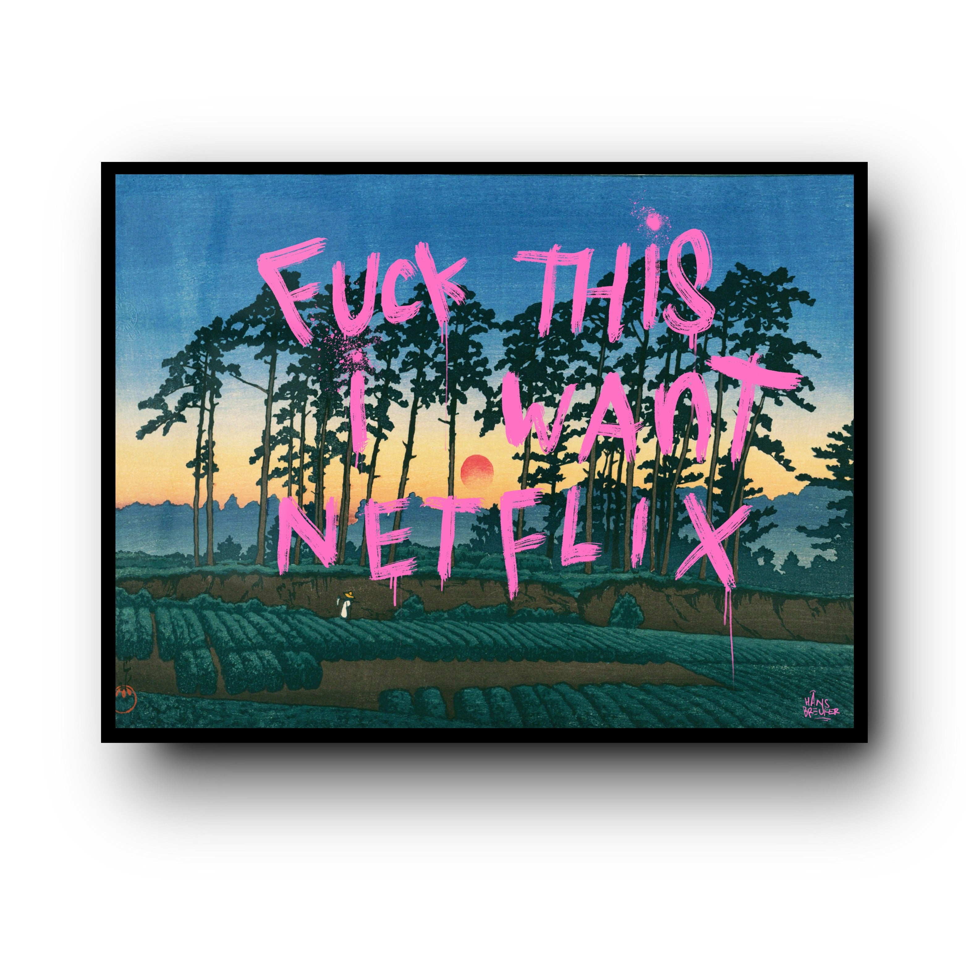 De quote “Fuck This I Want Netflix” van Hans Breuker doorbreekt die rust op brute, eerlijke wijze. Geen poëzie, geen omwegen — maar een herkenbaar moment van mentale uitcheck. Het werk gaat niet over luiheid, maar over autonomie: kiezen voor jezelf, voor rust, voor niets hoeven.