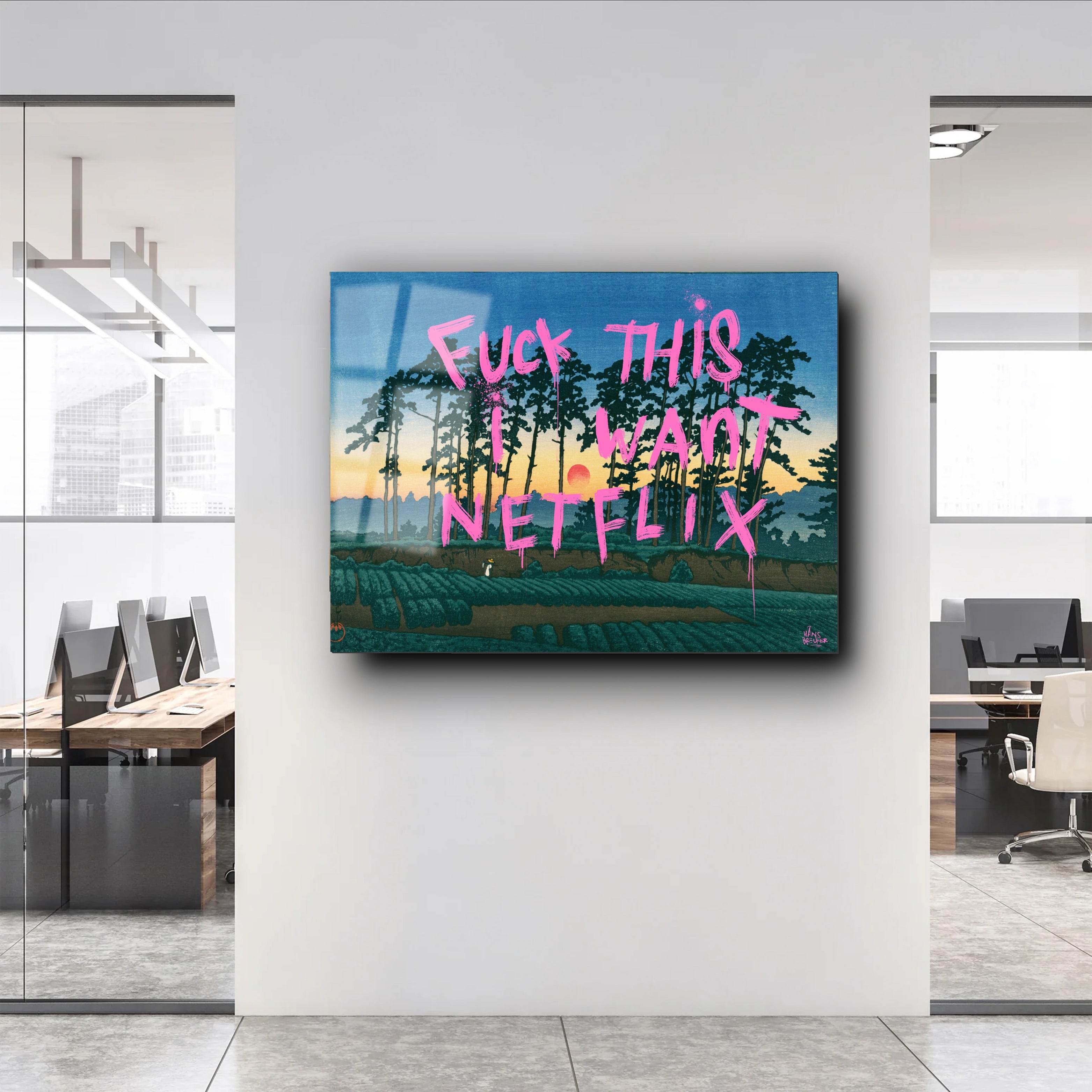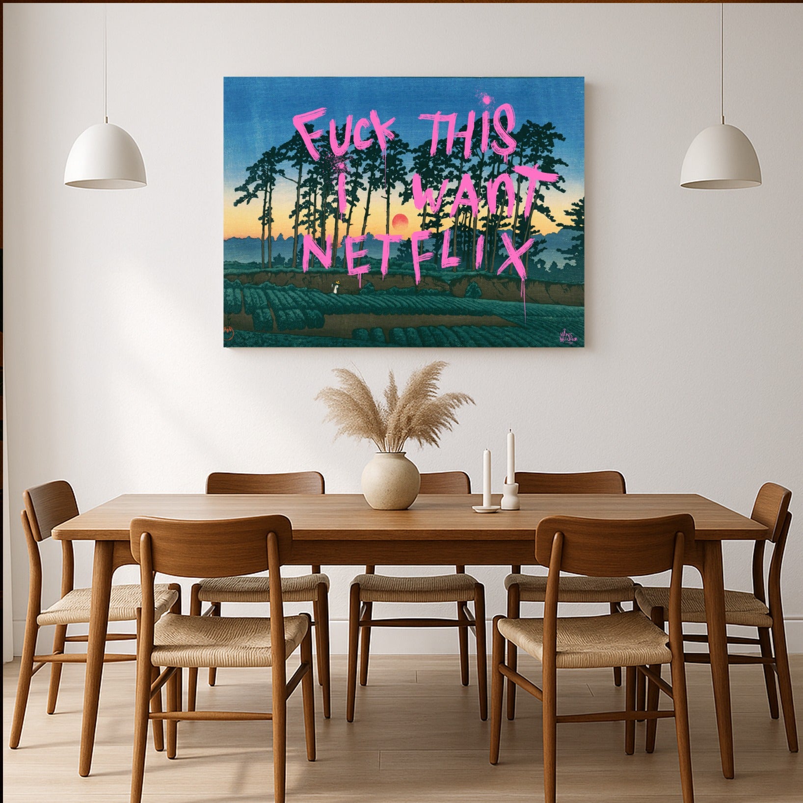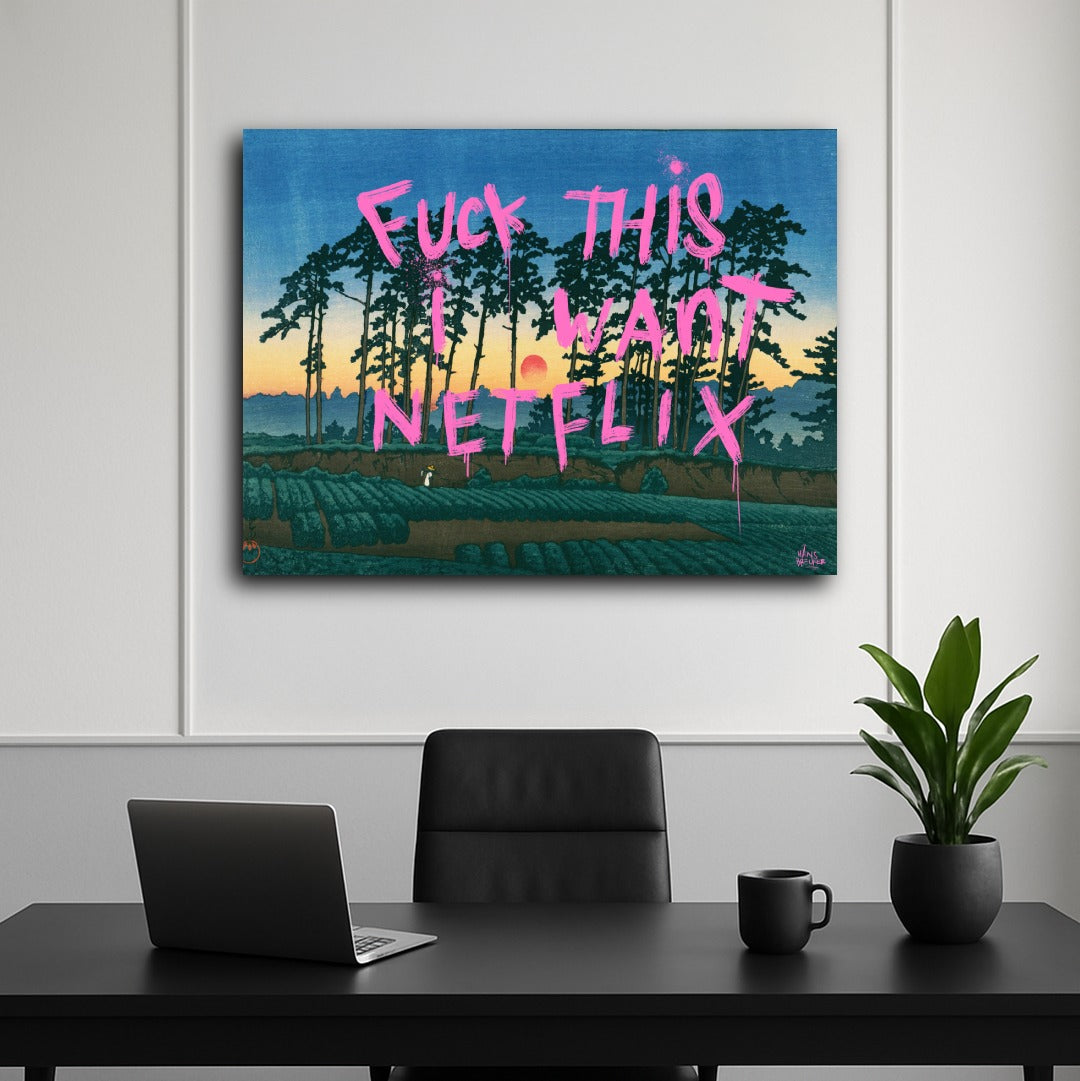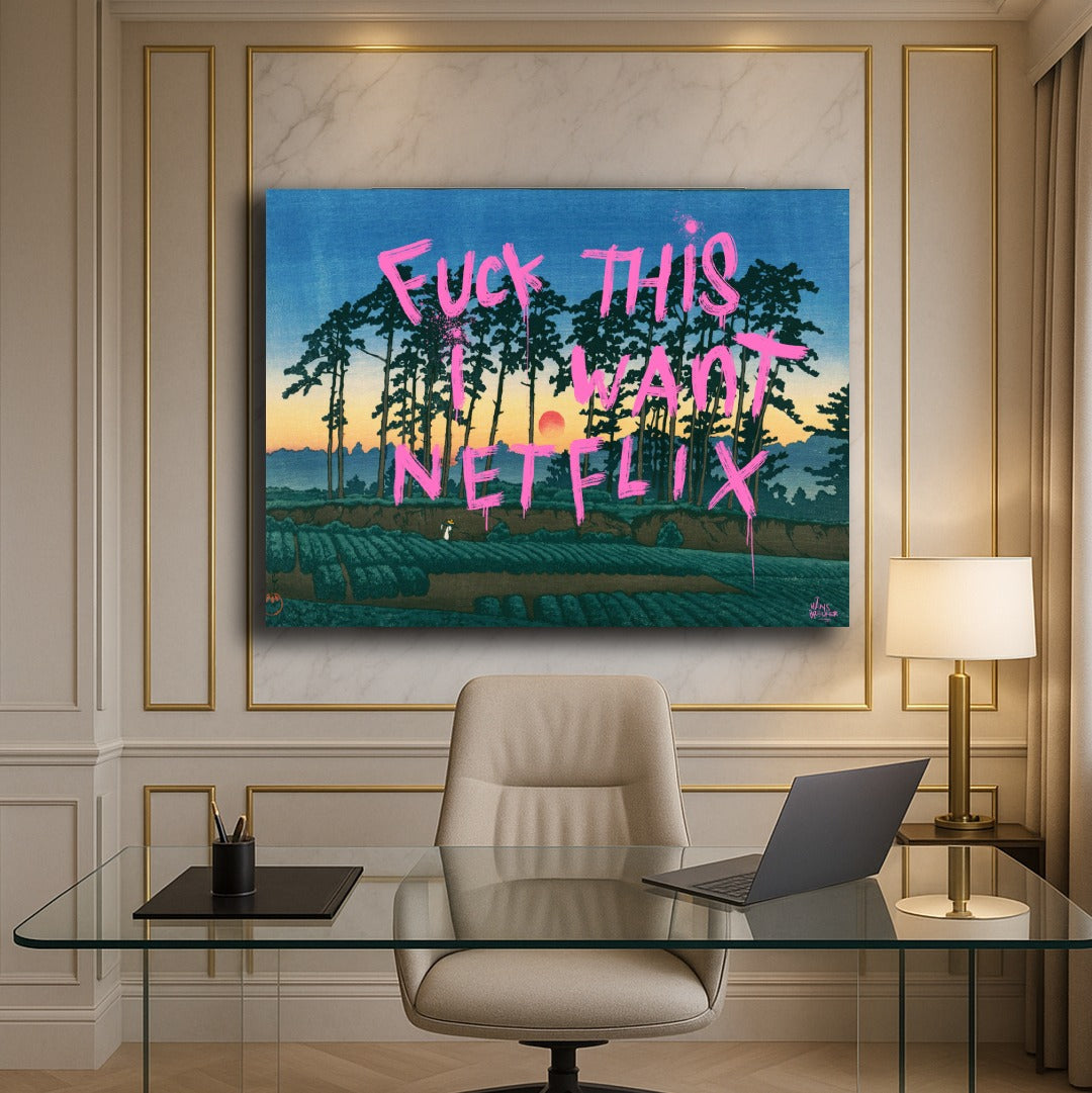 De quote “Fuck This I Want Netflix” van Hans Breuker doorbreekt die rust op brute, eerlijke wijze. Geen poëzie, geen omwegen — maar een herkenbaar moment van mentale uitcheck. Het werk gaat niet over luiheid, maar over autonomie: kiezen voor jezelf, voor rust, voor niets hoeven.