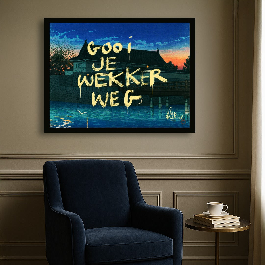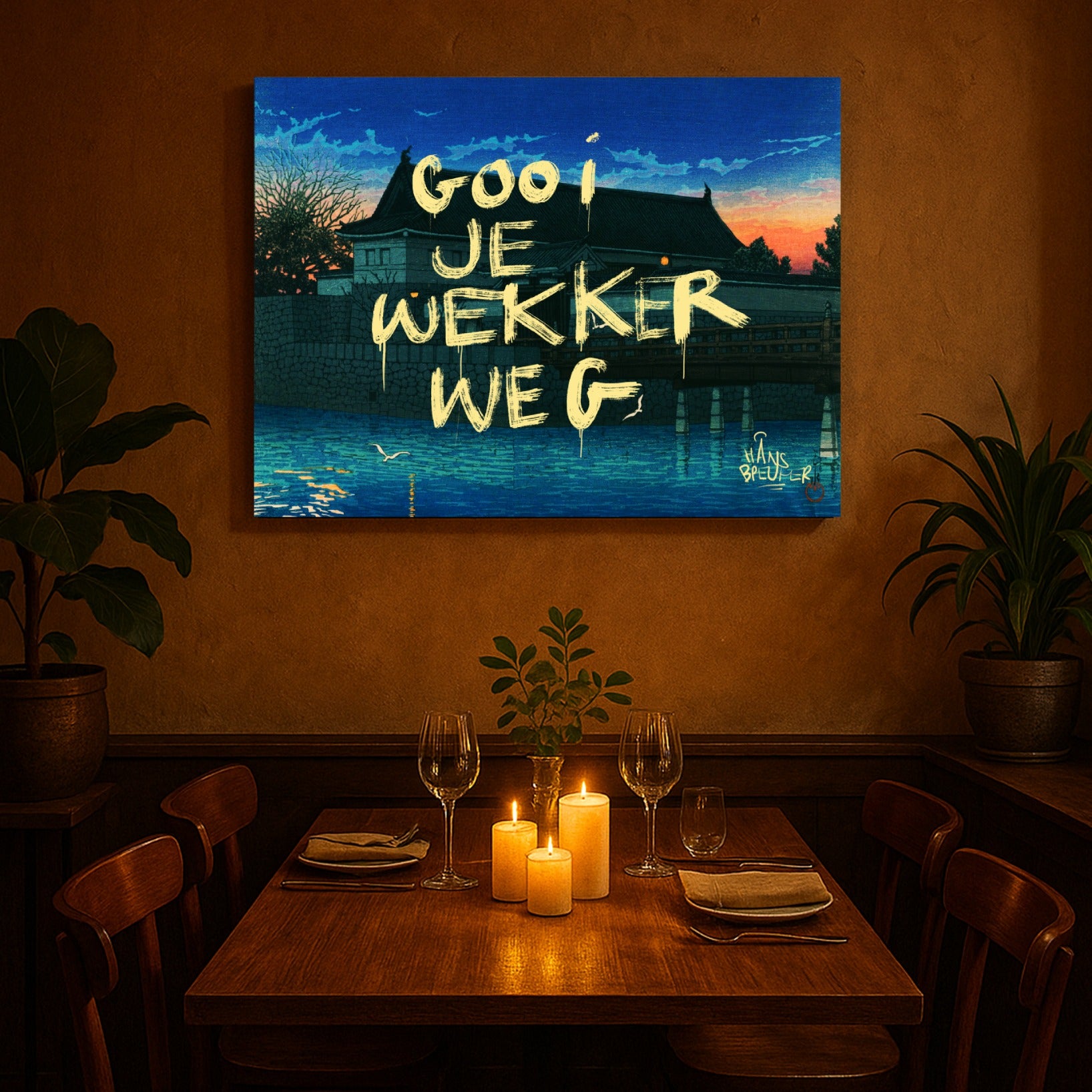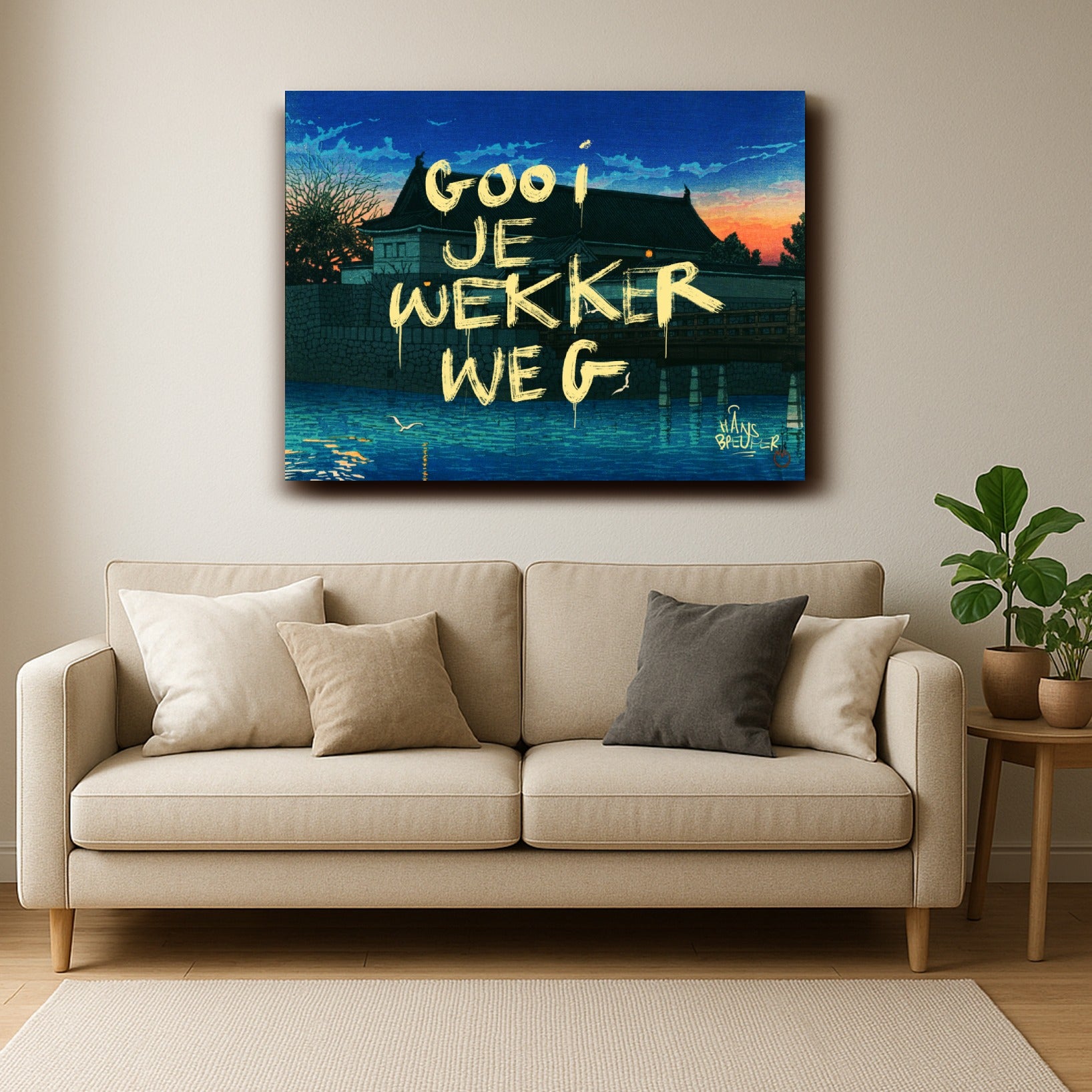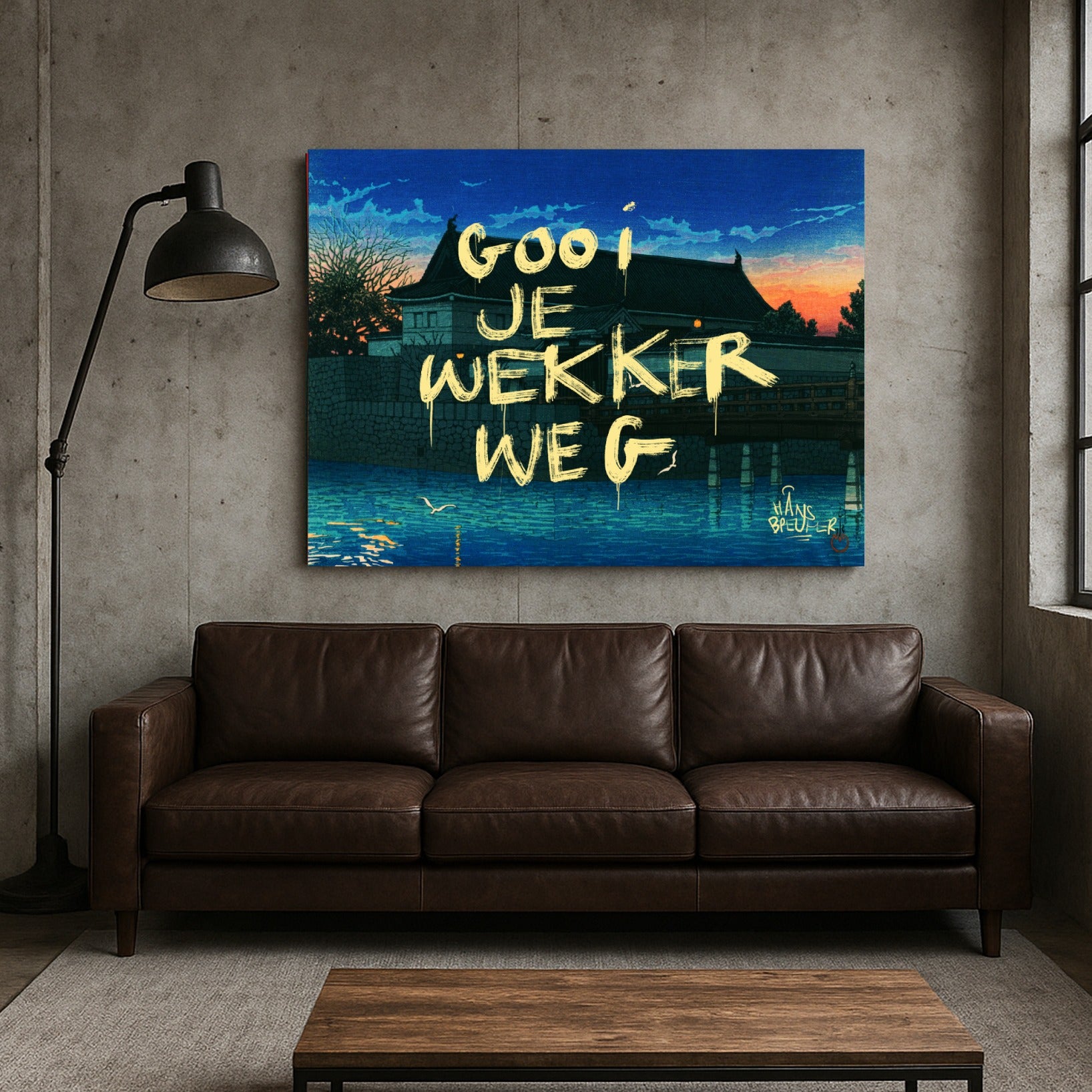 De combinatie van klassieke Japanse kunst en een moderne, handgeschreven quote creëert een spannend contrast. Waar Kawase Hasui bekendstaat om stilte en traditie, brengt Hans Breuker energie, lef en hedendaagse attitude. Samen maken zij dit werk tot een uniek kunstobject waarin oosterse rust en westerse vrijheid samenkomen.