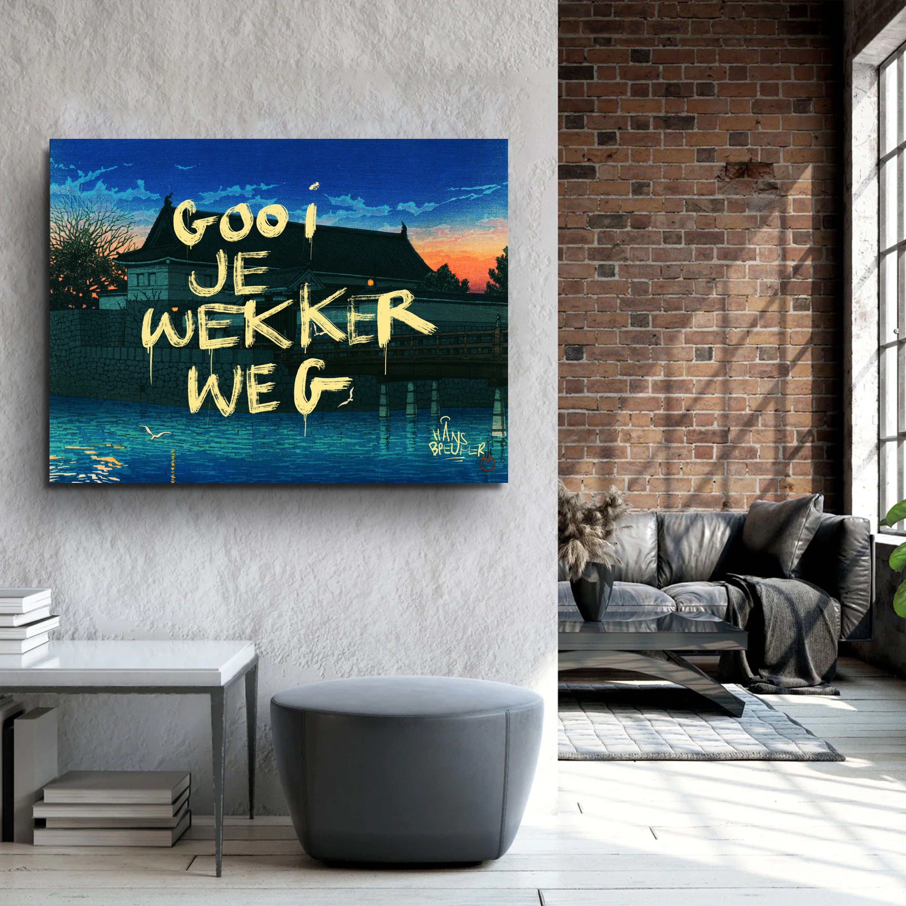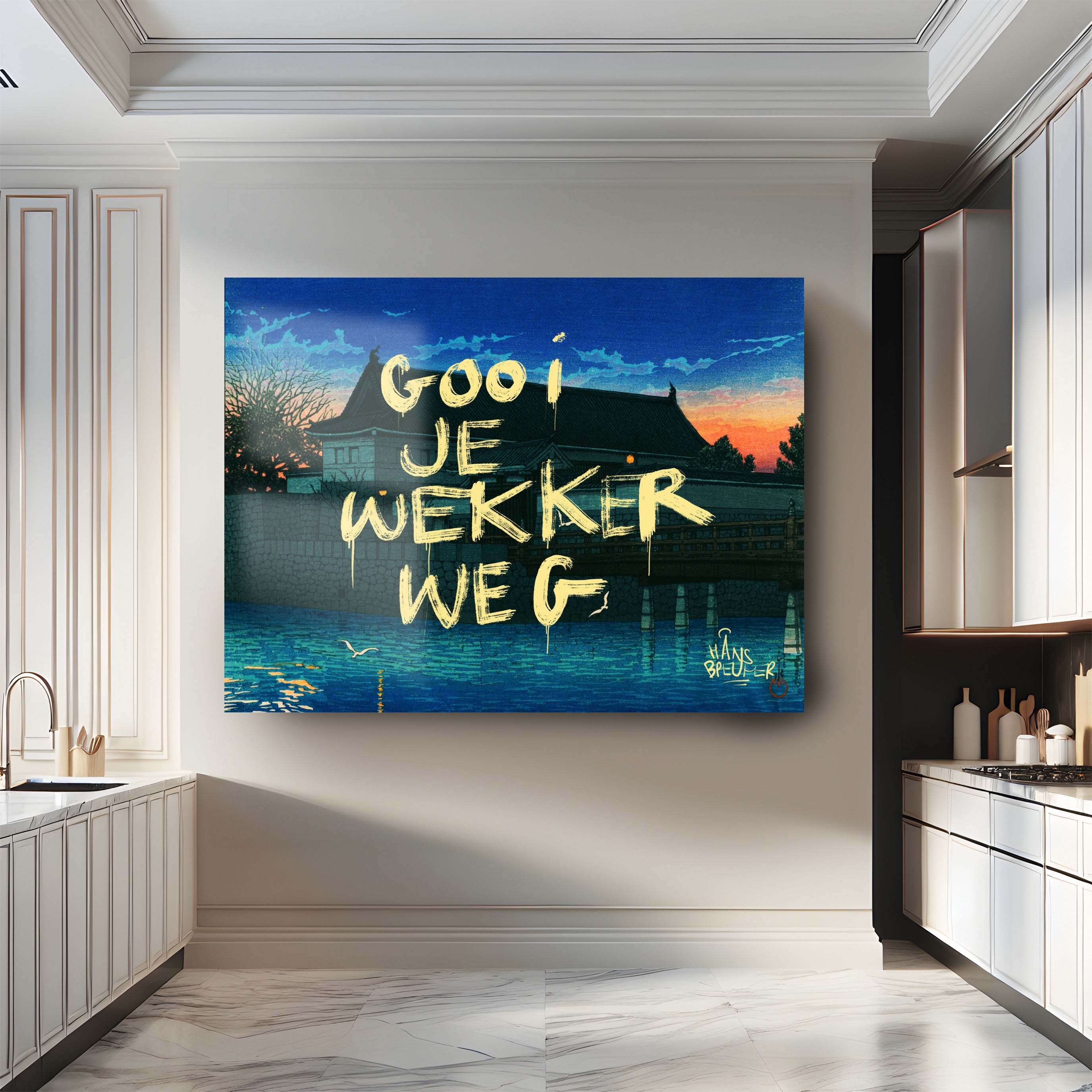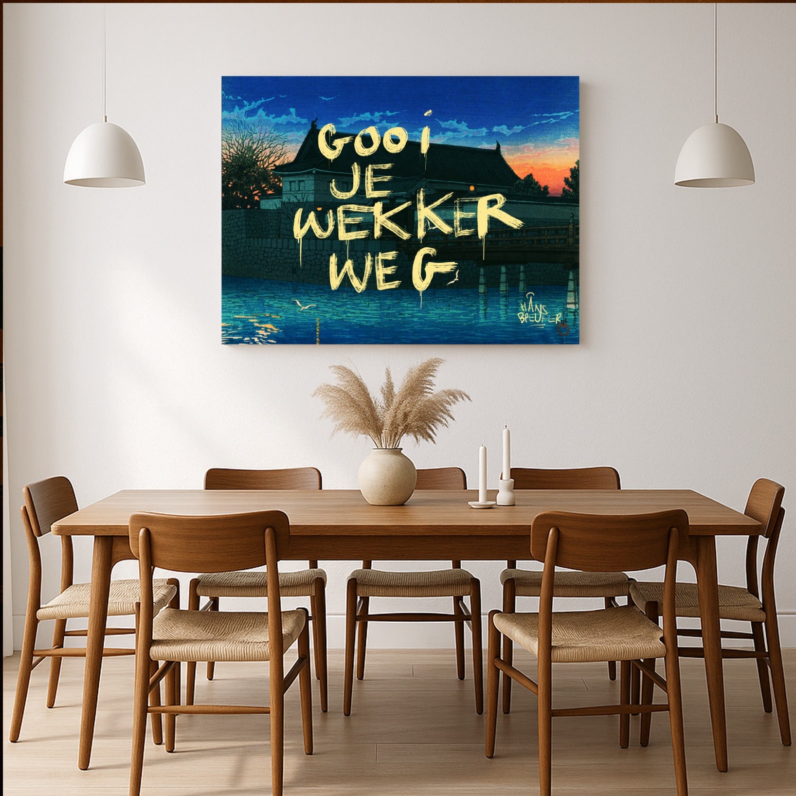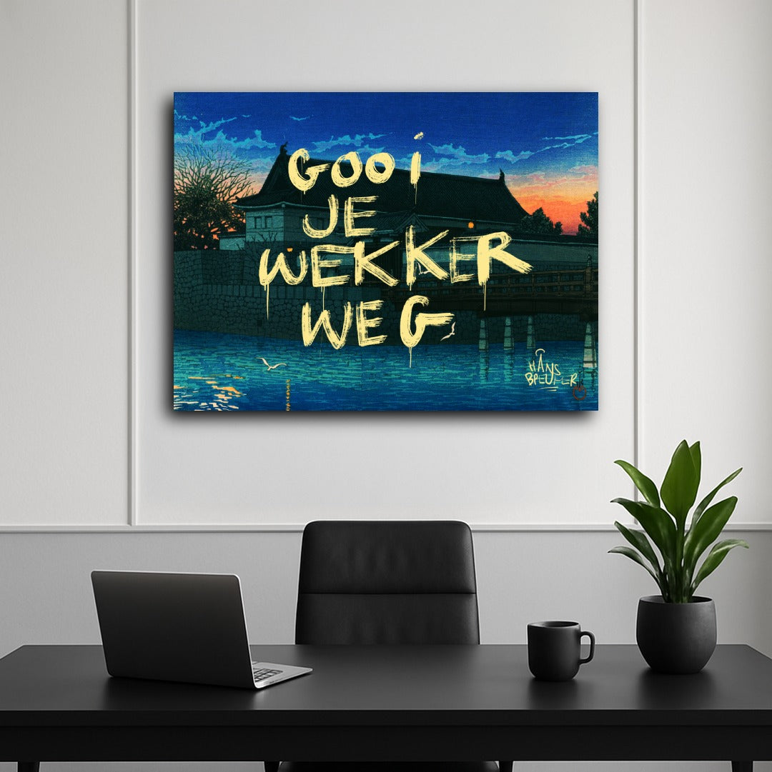 De combinatie van klassieke Japanse kunst en een moderne, handgeschreven quote creëert een spannend contrast. Waar Kawase Hasui bekendstaat om stilte en traditie, brengt Hans Breuker energie, lef en hedendaagse attitude. Samen maken zij dit werk tot een uniek kunstobject waarin oosterse rust en westerse vrijheid samenkomen.