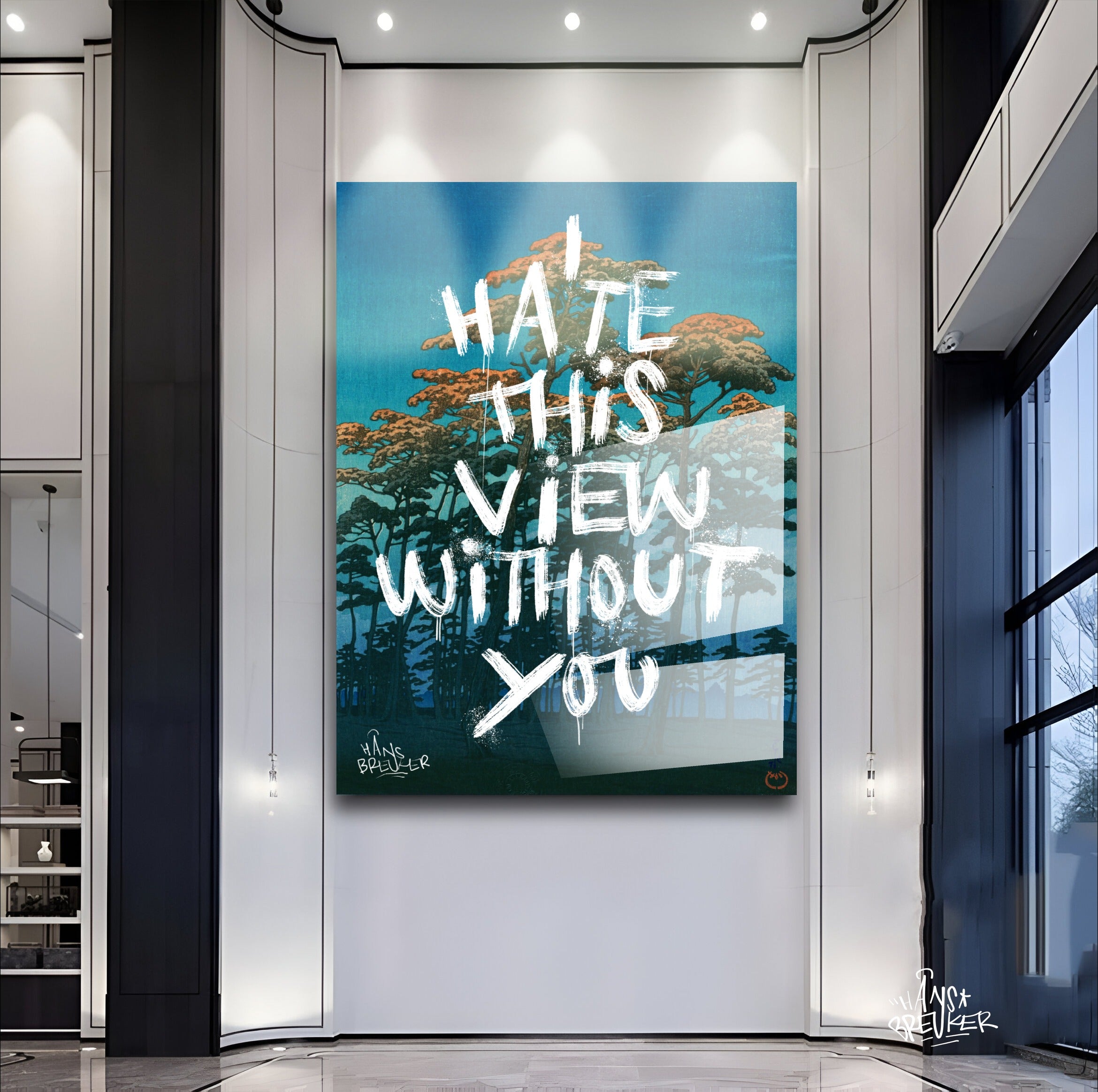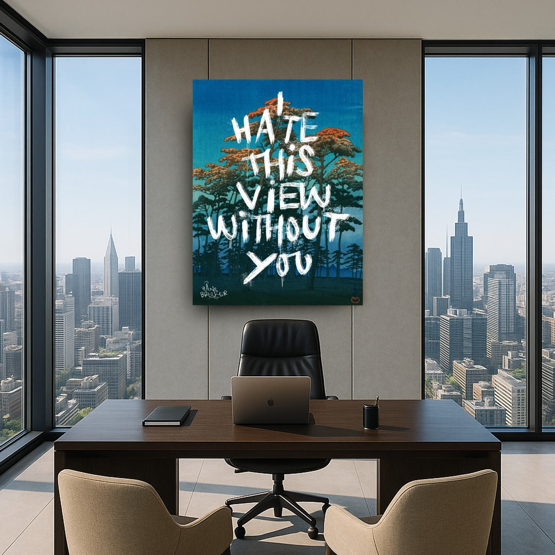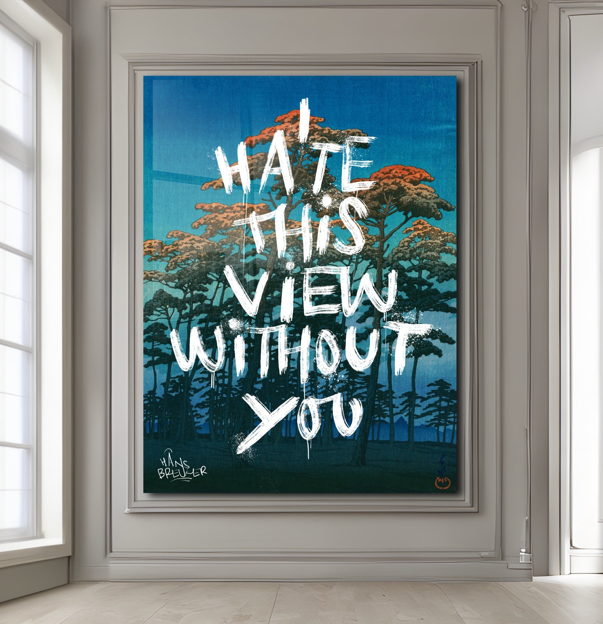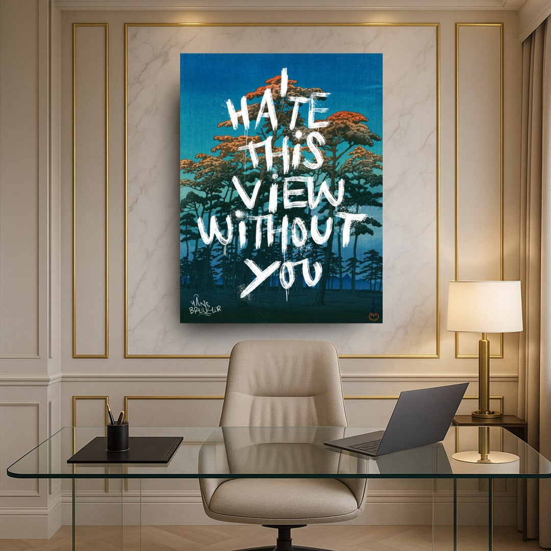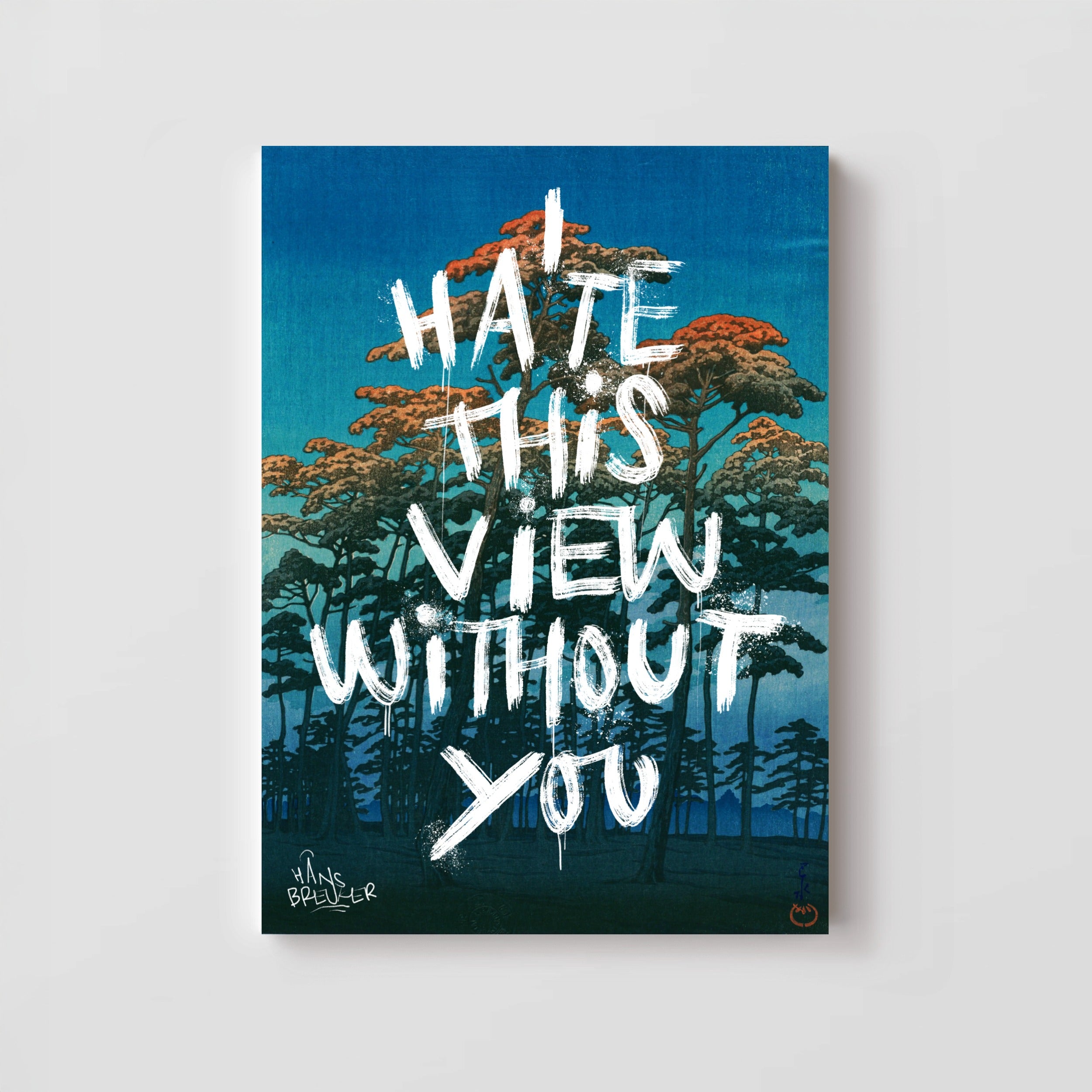 I Hate This View Without You is een romantische poster die draait om afwezigheid. Niet het landschap staat centraal, maar wat — of wie — ontbreekt. Het beeld is rustig, bijna tijdloos, maar de boodschap is rauw en eerlijk: schoonheid verliest betekenis als je haar niet kunt delen.