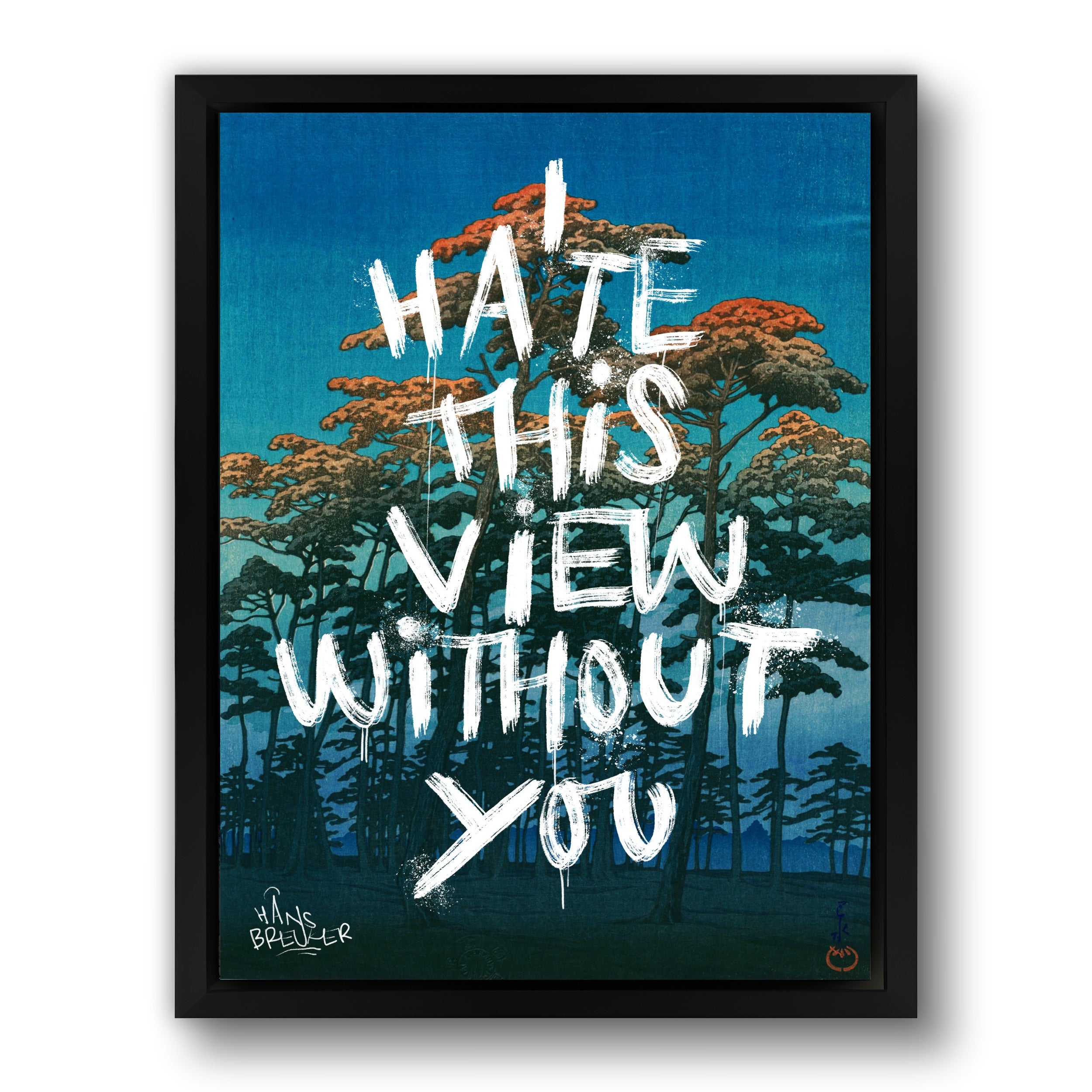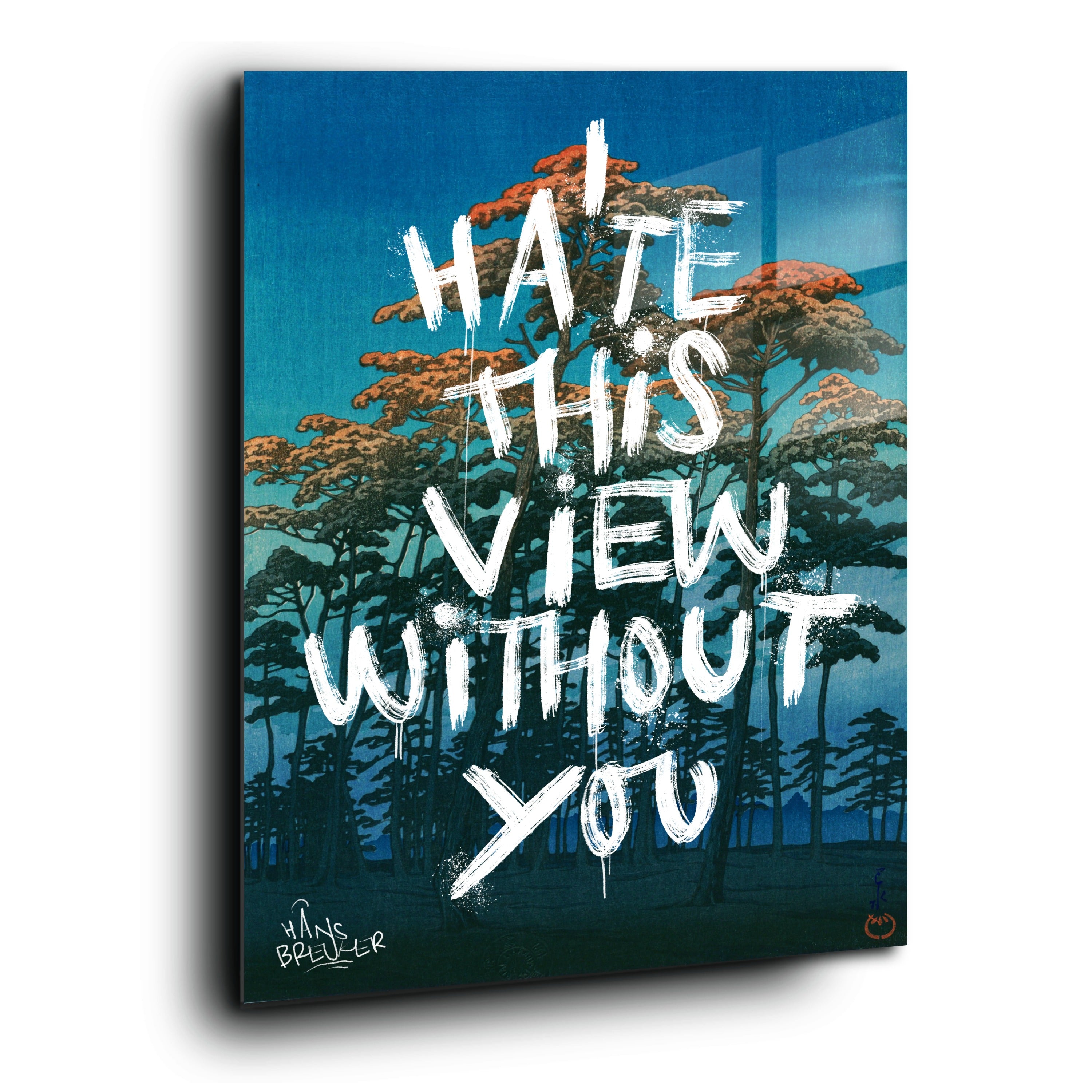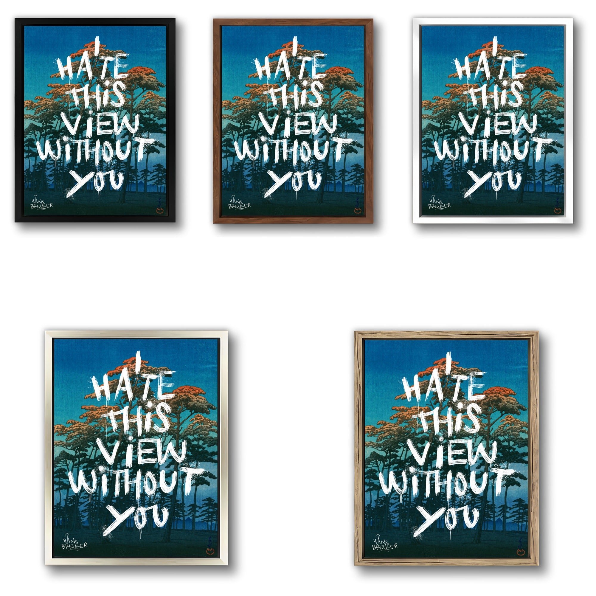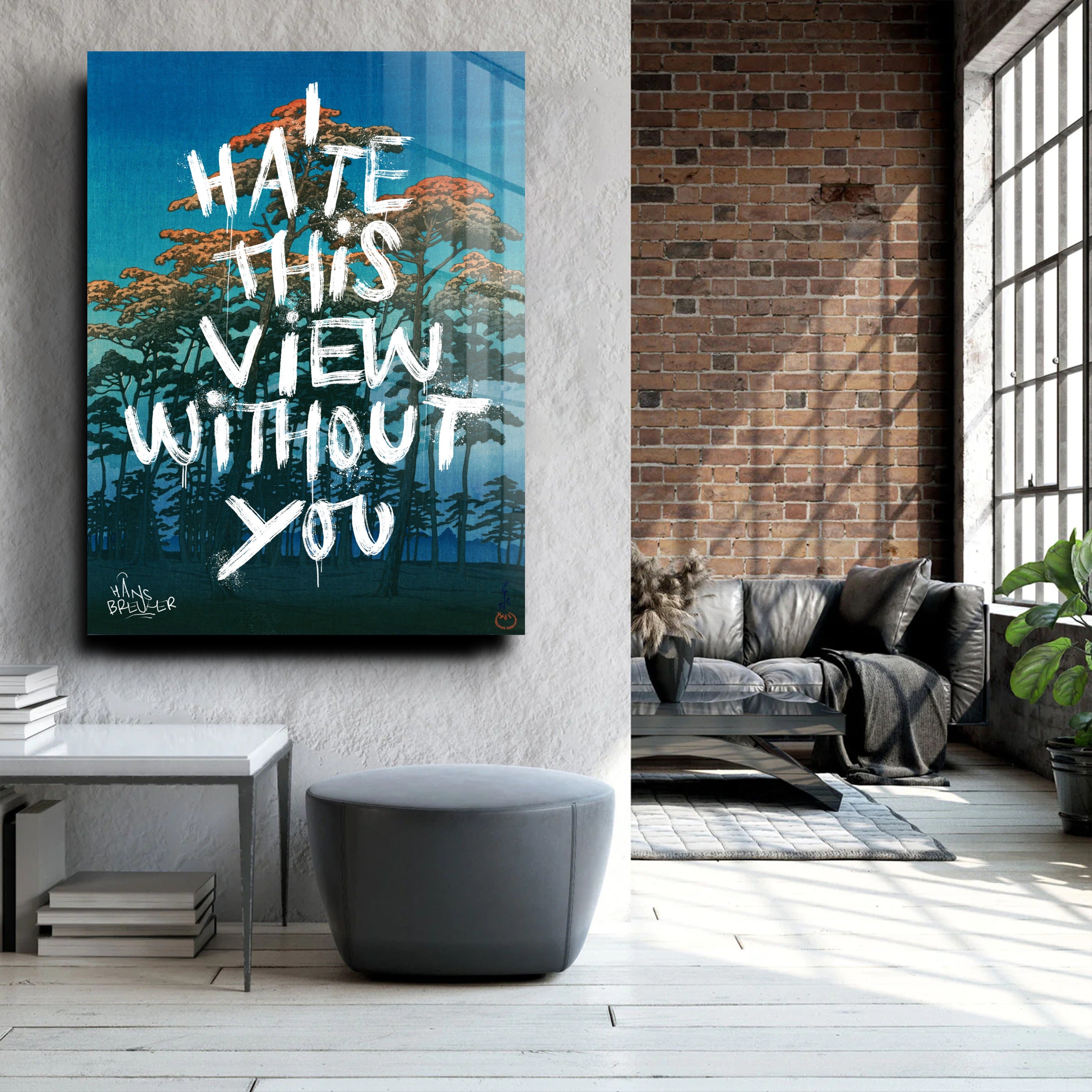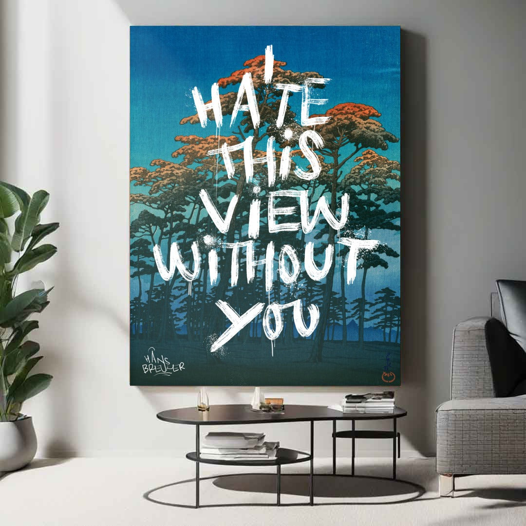 I Hate This View Without You is een romantische poster die draait om afwezigheid. Niet het landschap staat centraal, maar wat — of wie — ontbreekt. Het beeld is rustig, bijna tijdloos, maar de boodschap is rauw en eerlijk: schoonheid verliest betekenis als je haar niet kunt delen.