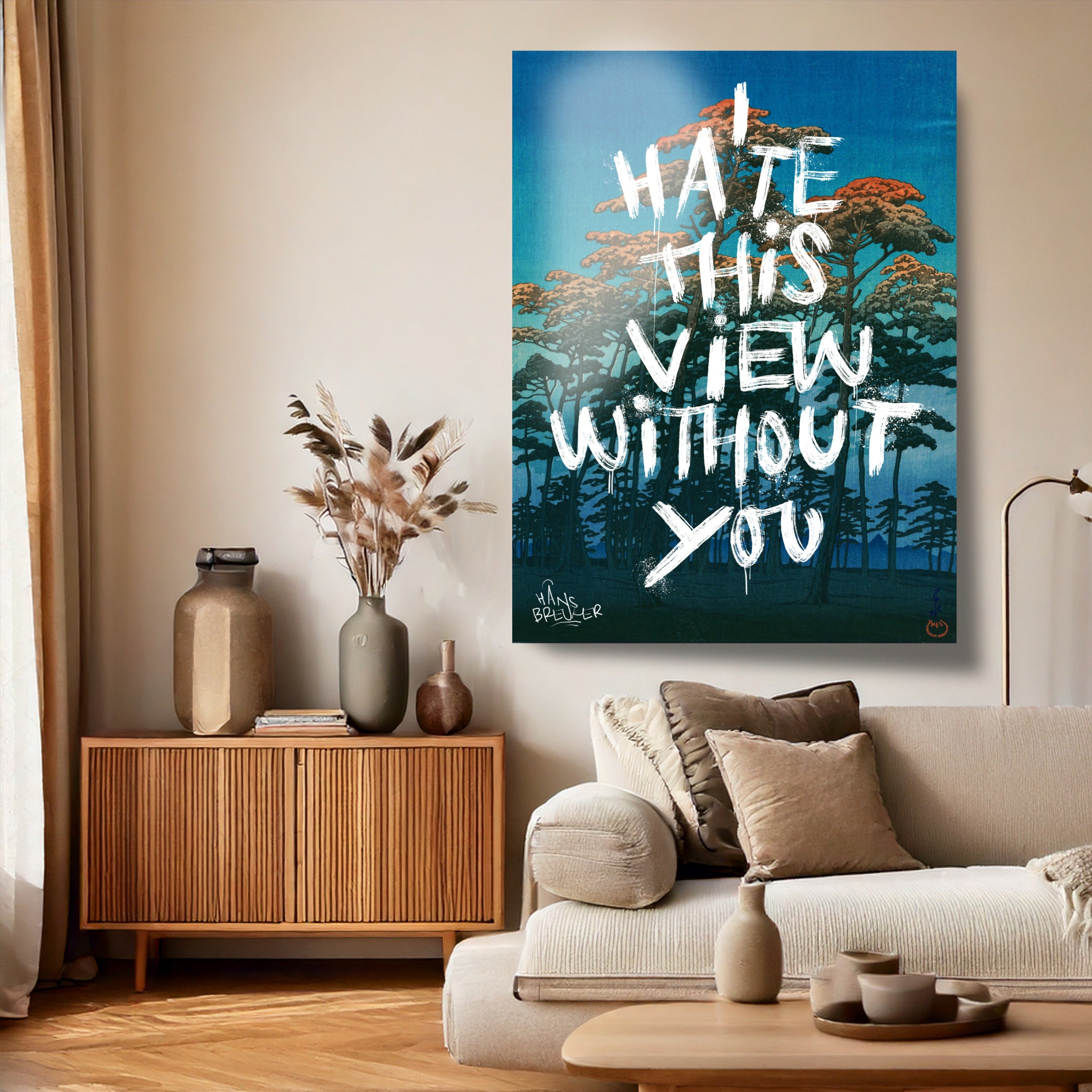 Dit kunstwerk is romantisch zonder zoet te zijn. Geen clichés, maar een volwassen benadering van liefde en verlangen. I Hate This View Without You past perfect in slaapkamers, woonkamers, hotelkamers of plekken waar emotie onderdeel mag zijn van het interieur.