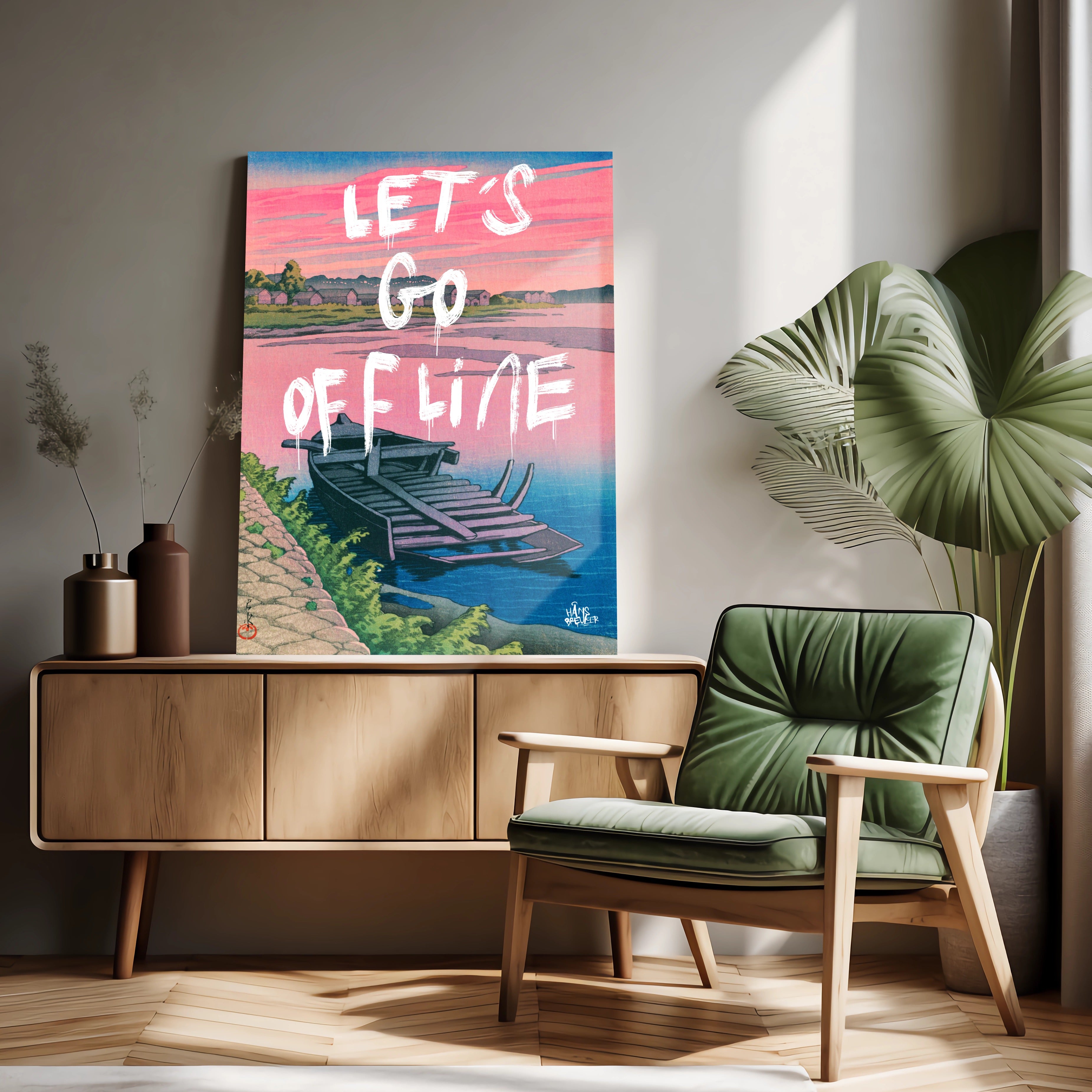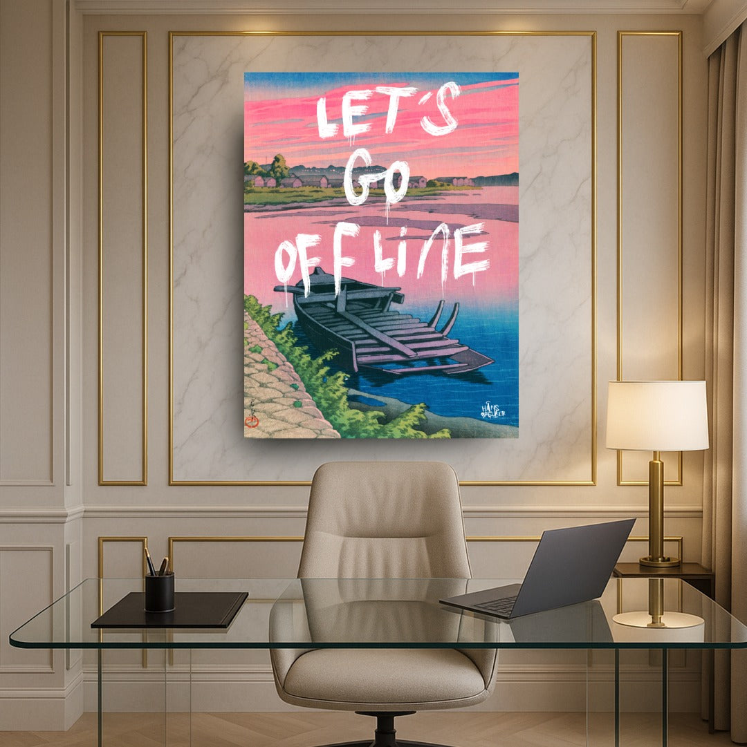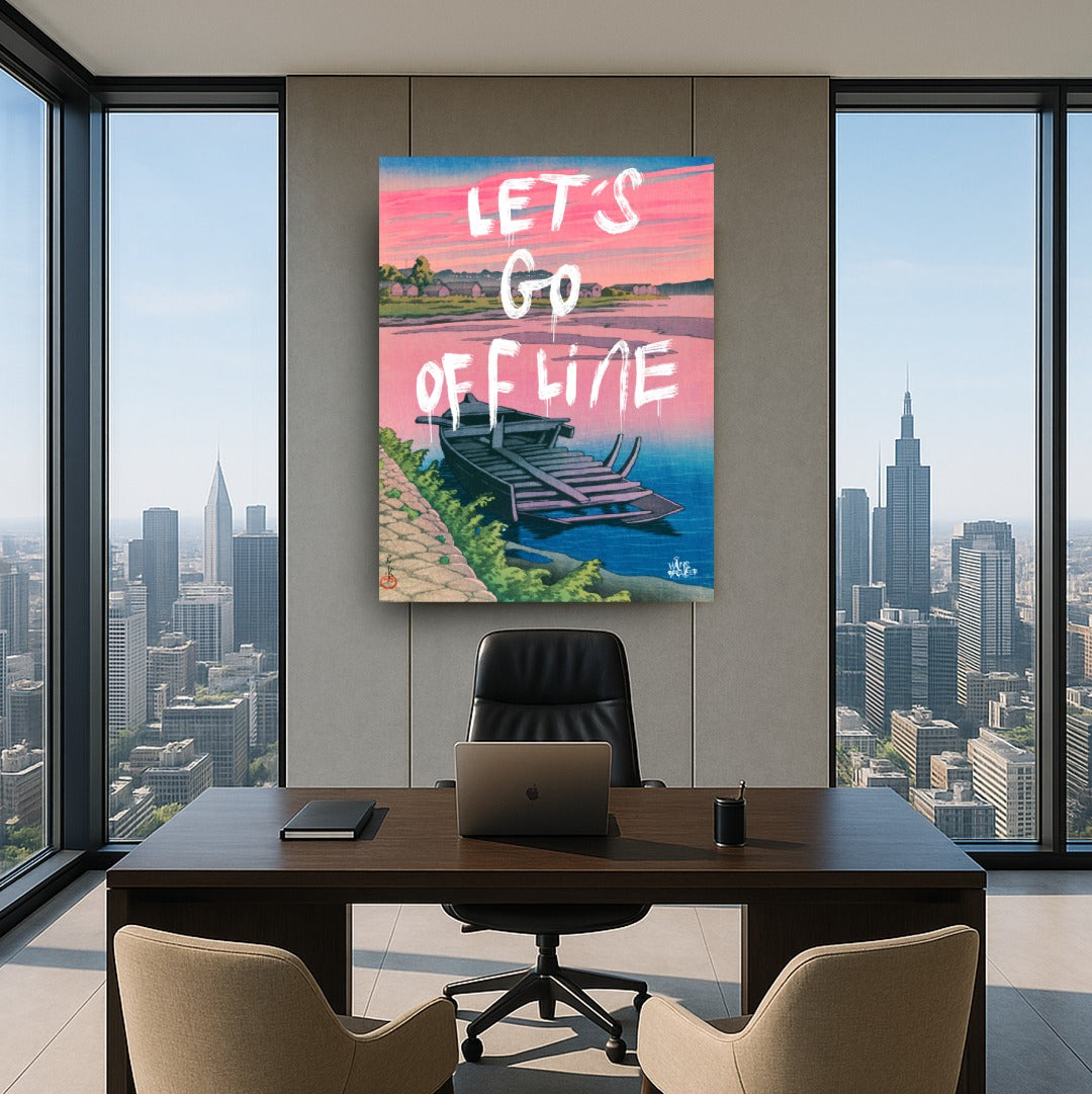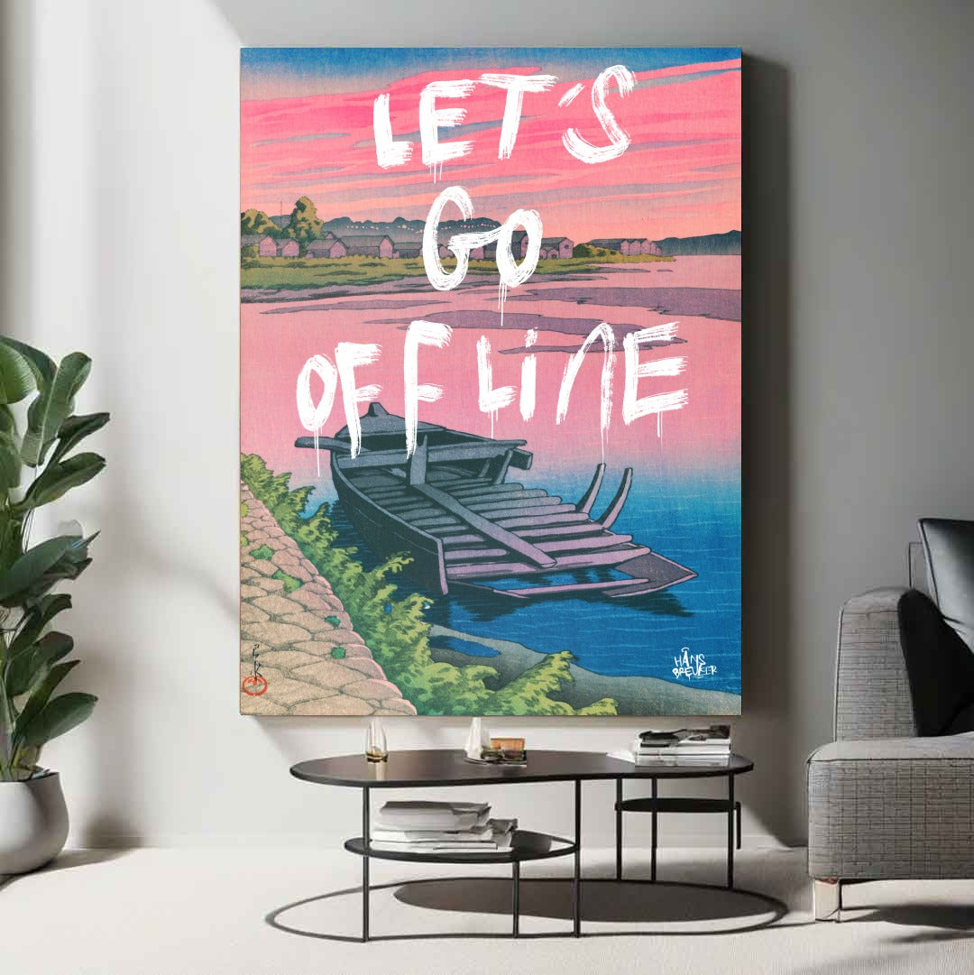 Let’s Go Offline verbeeldt het verlangen naar stilte in een wereld die nooit stopt. De rustige compositie, het water en het zachte avondlicht vormen een visuele pauze — een plek waar niets hoeft en niemand iets van je wil. Het werk ademt afstand nemen van deadlines, notificaties en eindeloze feeds.