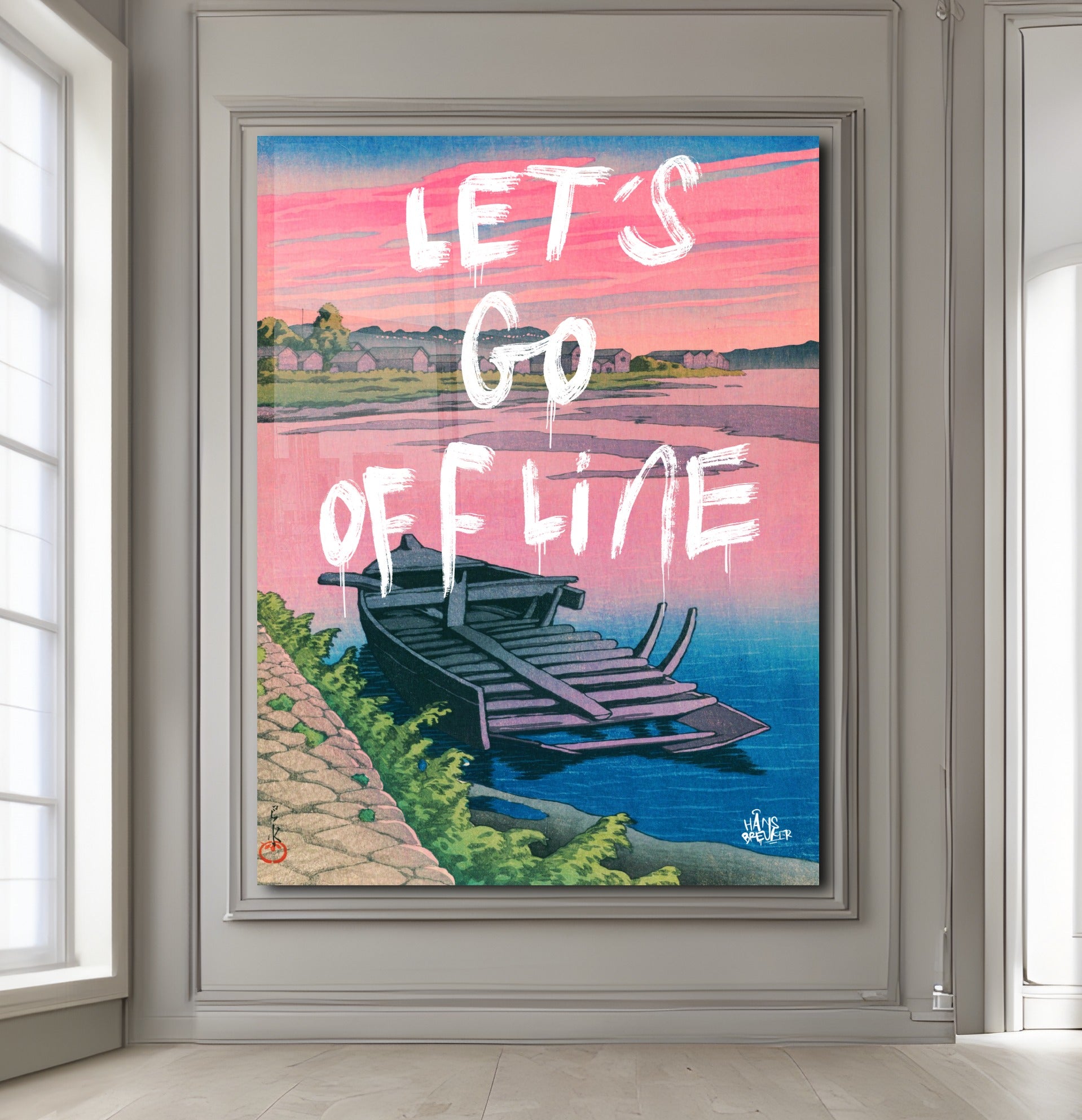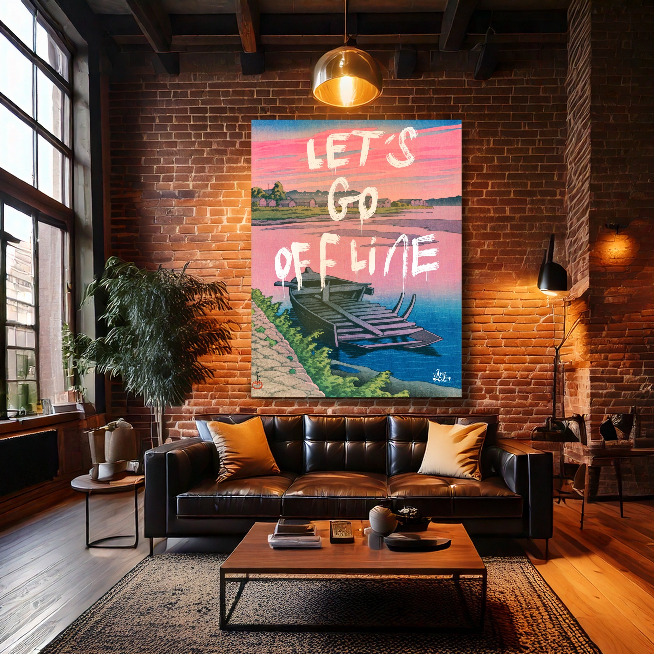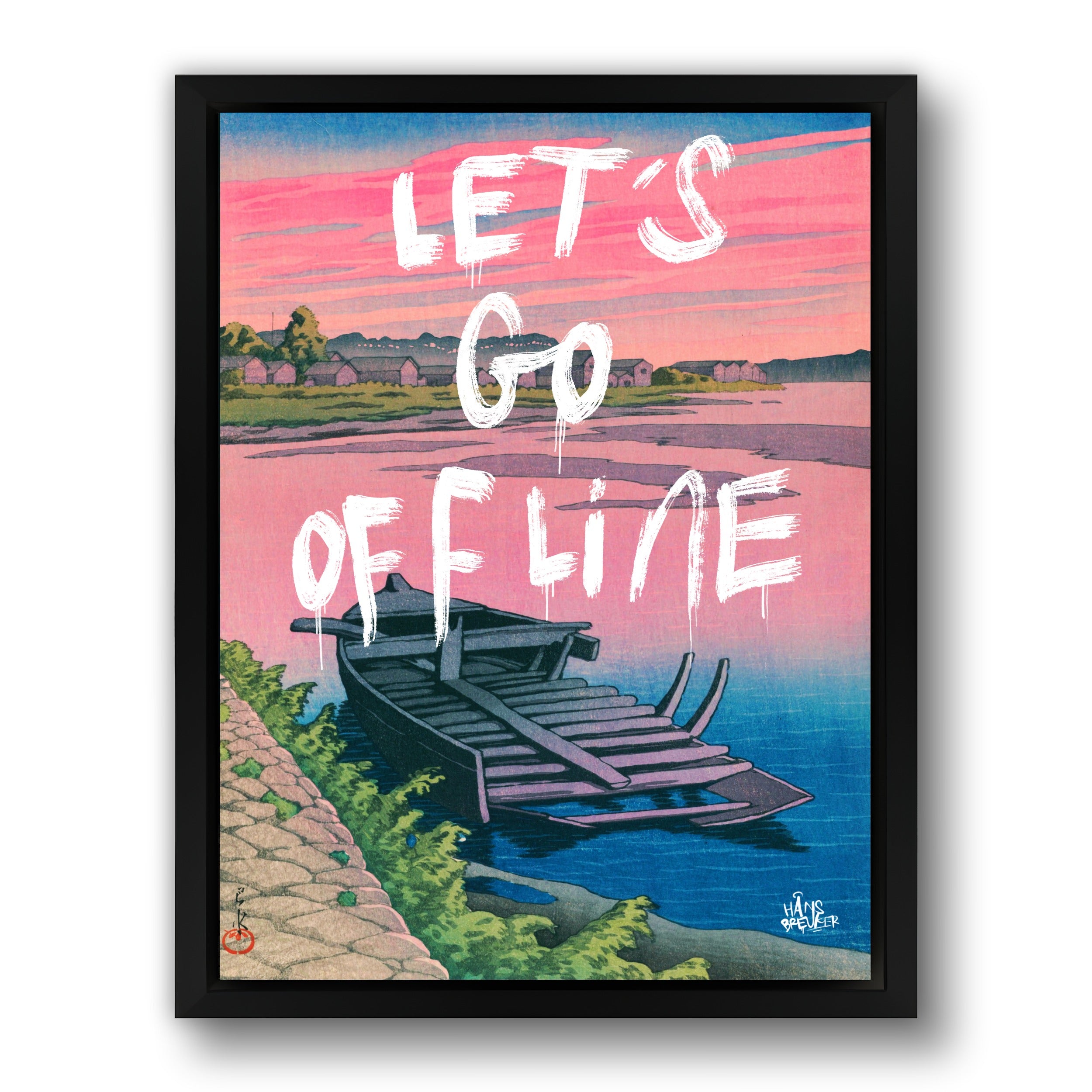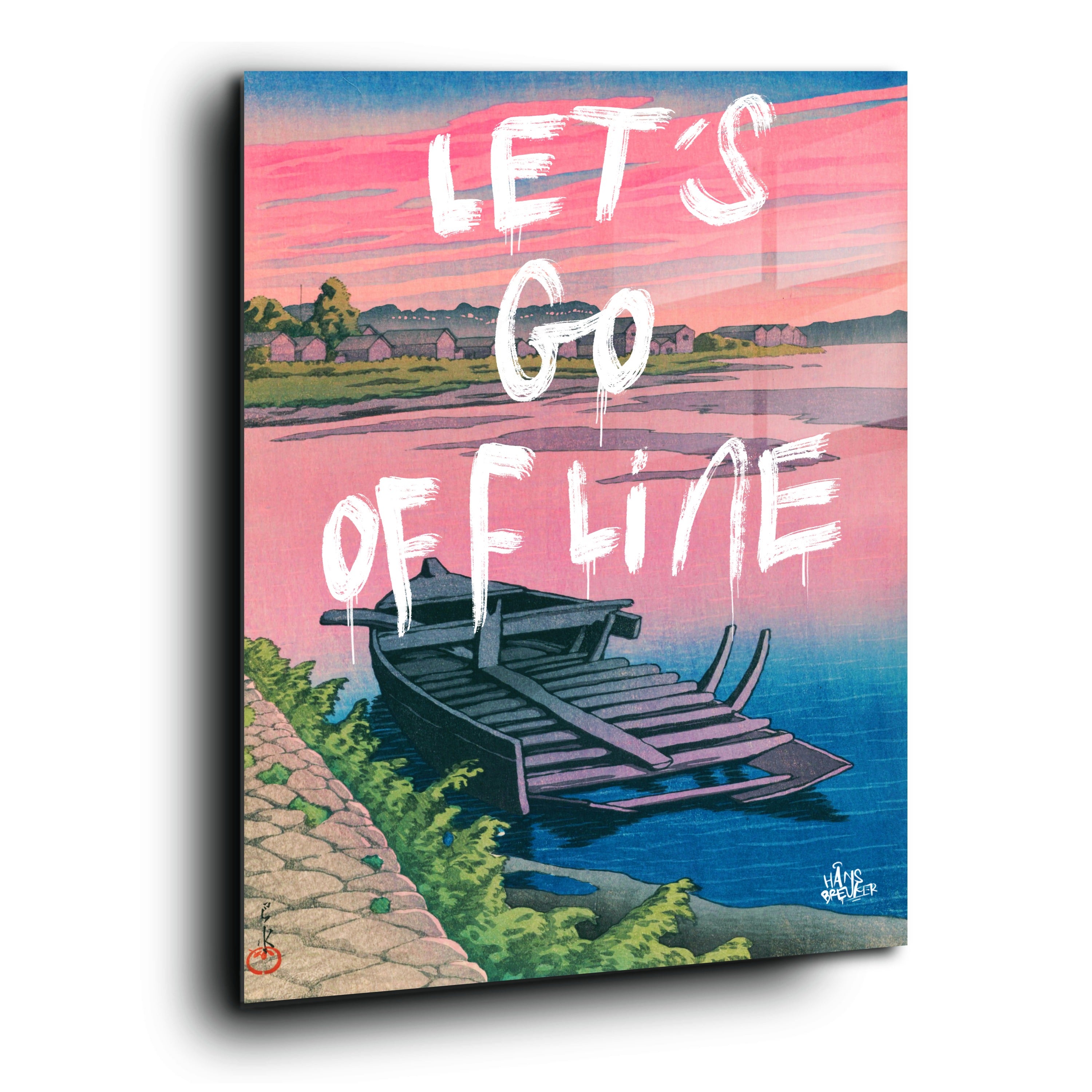 Let’s Go Offline verbeeldt het verlangen naar stilte in een wereld die nooit stopt. De rustige compositie, het water en het zachte avondlicht vormen een visuele pauze — een plek waar niets hoeft en niemand iets van je wil. Het werk ademt afstand nemen van deadlines, notificaties en eindeloze feeds.