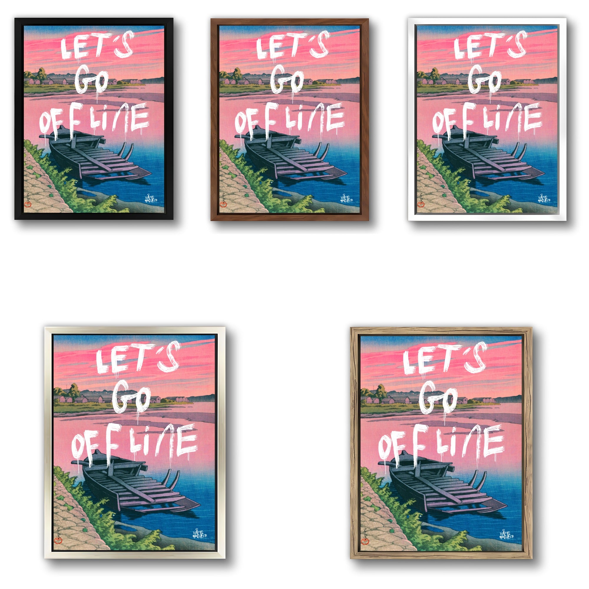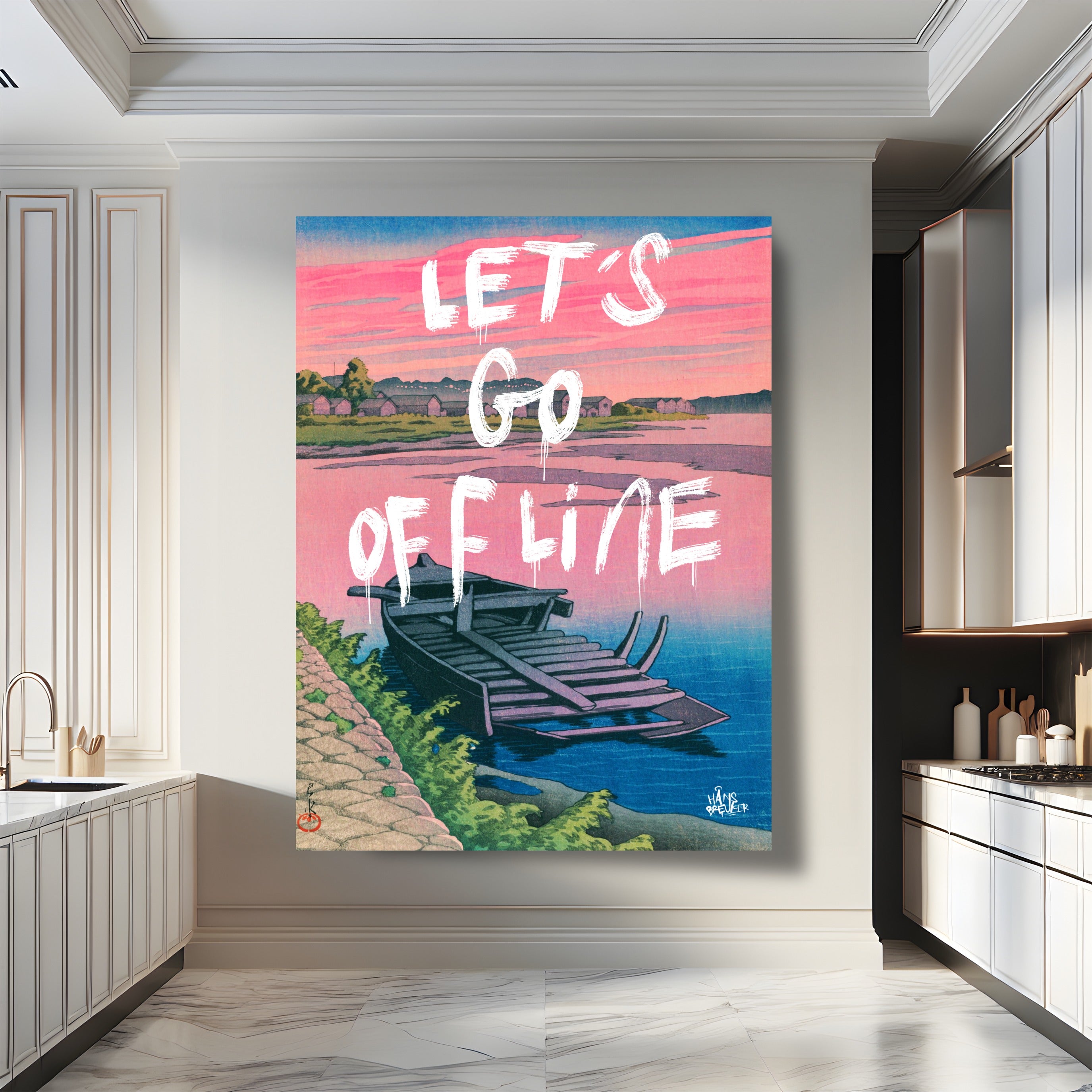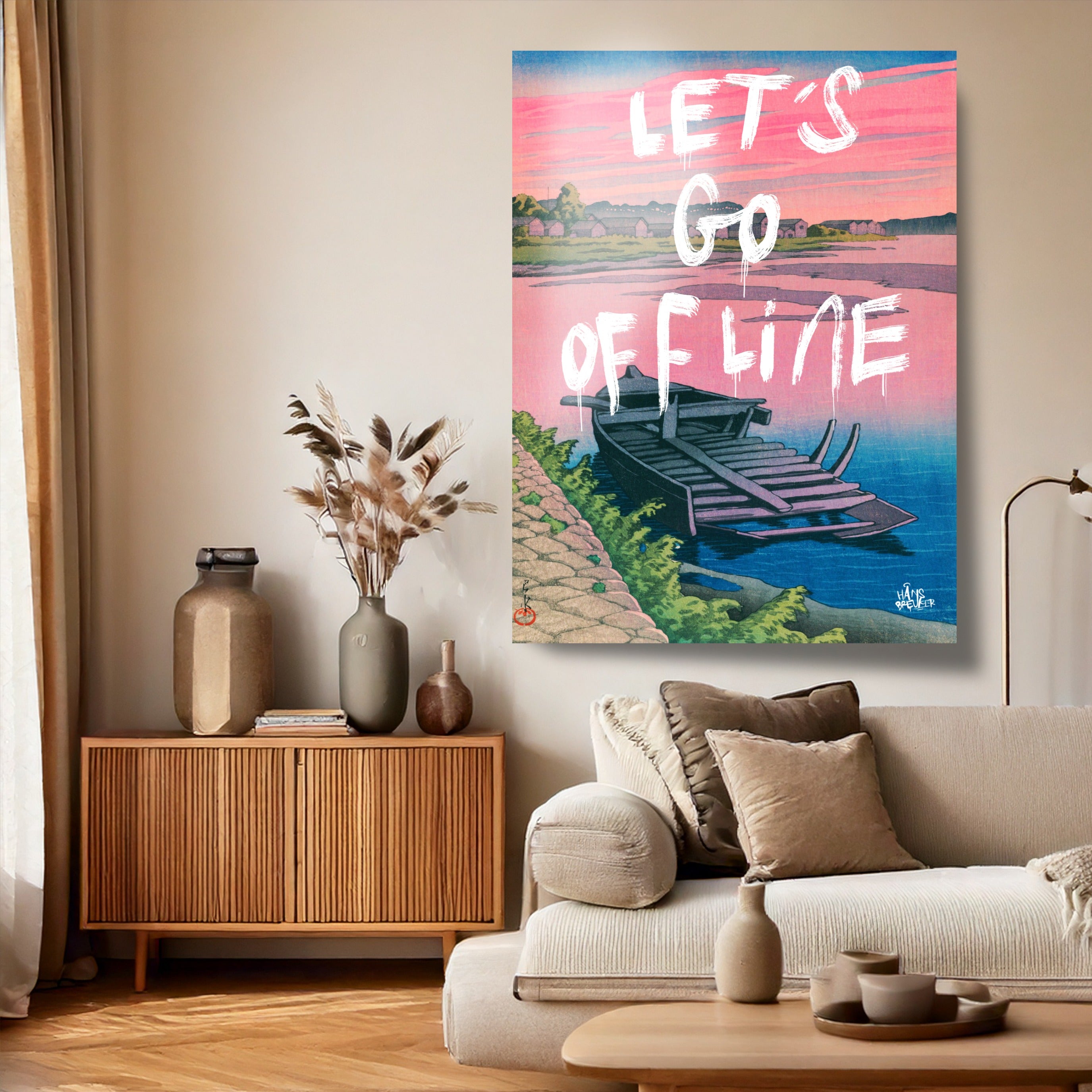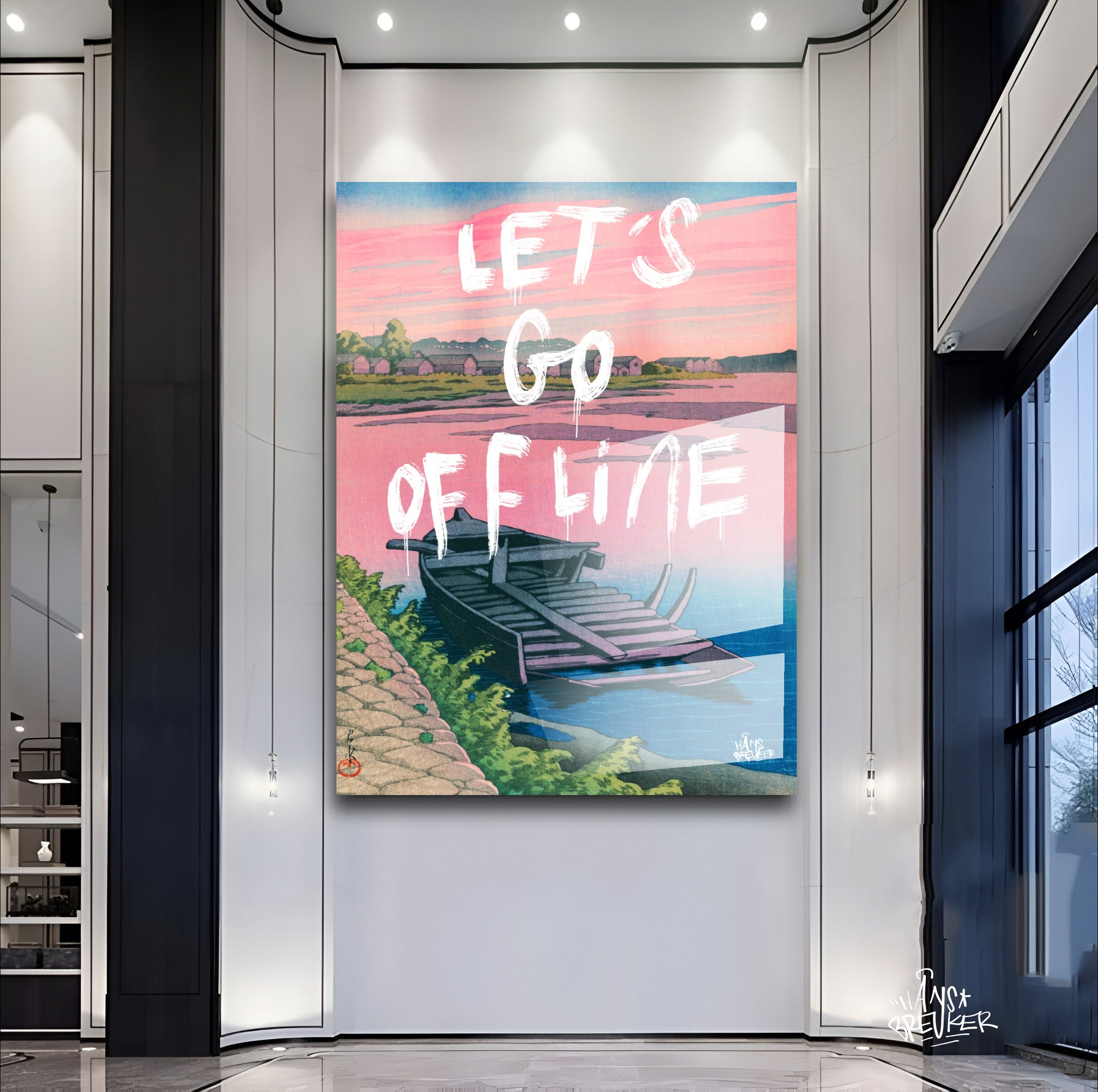 Let’s Go Offline verbeeldt het verlangen naar stilte in een wereld die nooit stopt. De rustige compositie, het water en het zachte avondlicht vormen een visuele pauze — een plek waar niets hoeft en niemand iets van je wil. Het werk ademt afstand nemen van deadlines, notificaties en eindeloze feeds.
