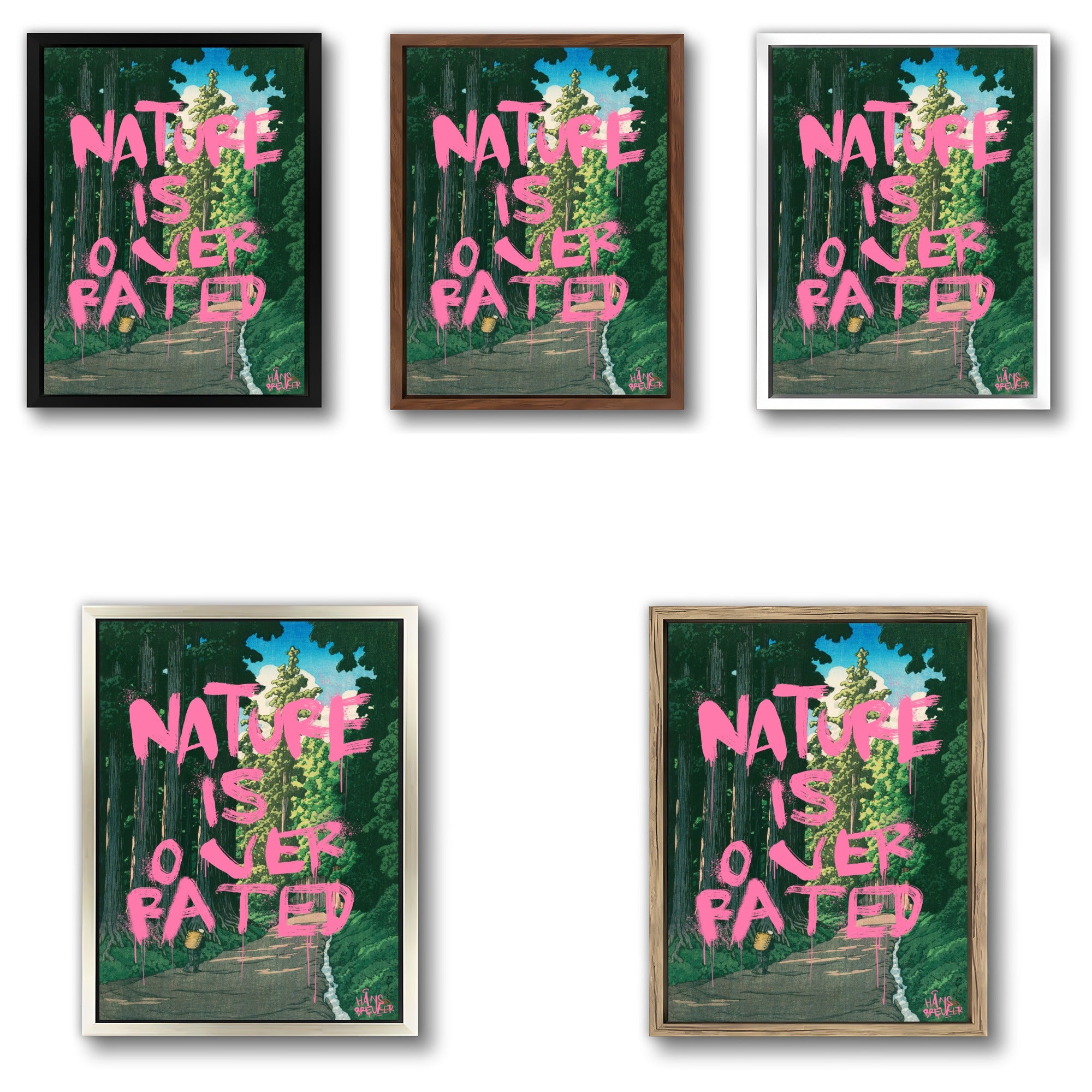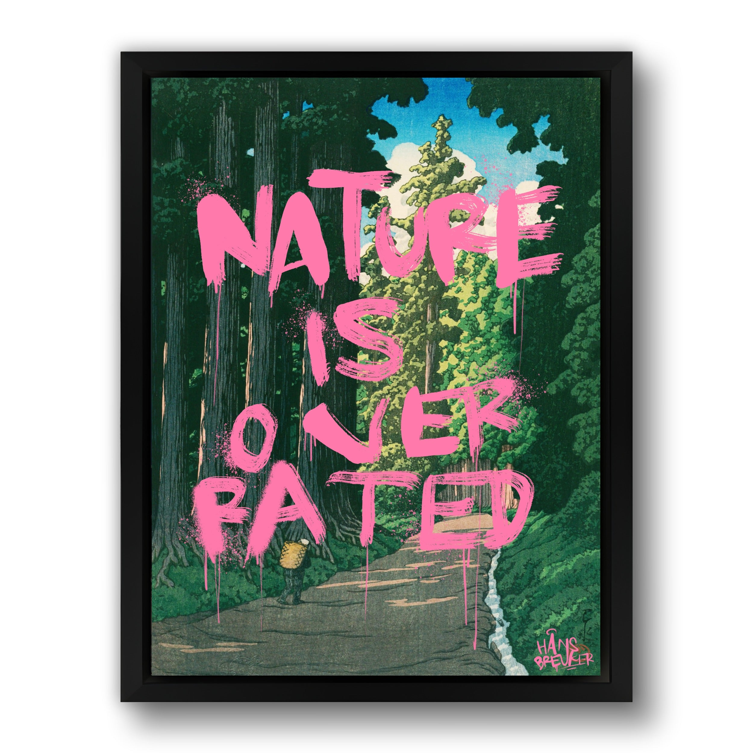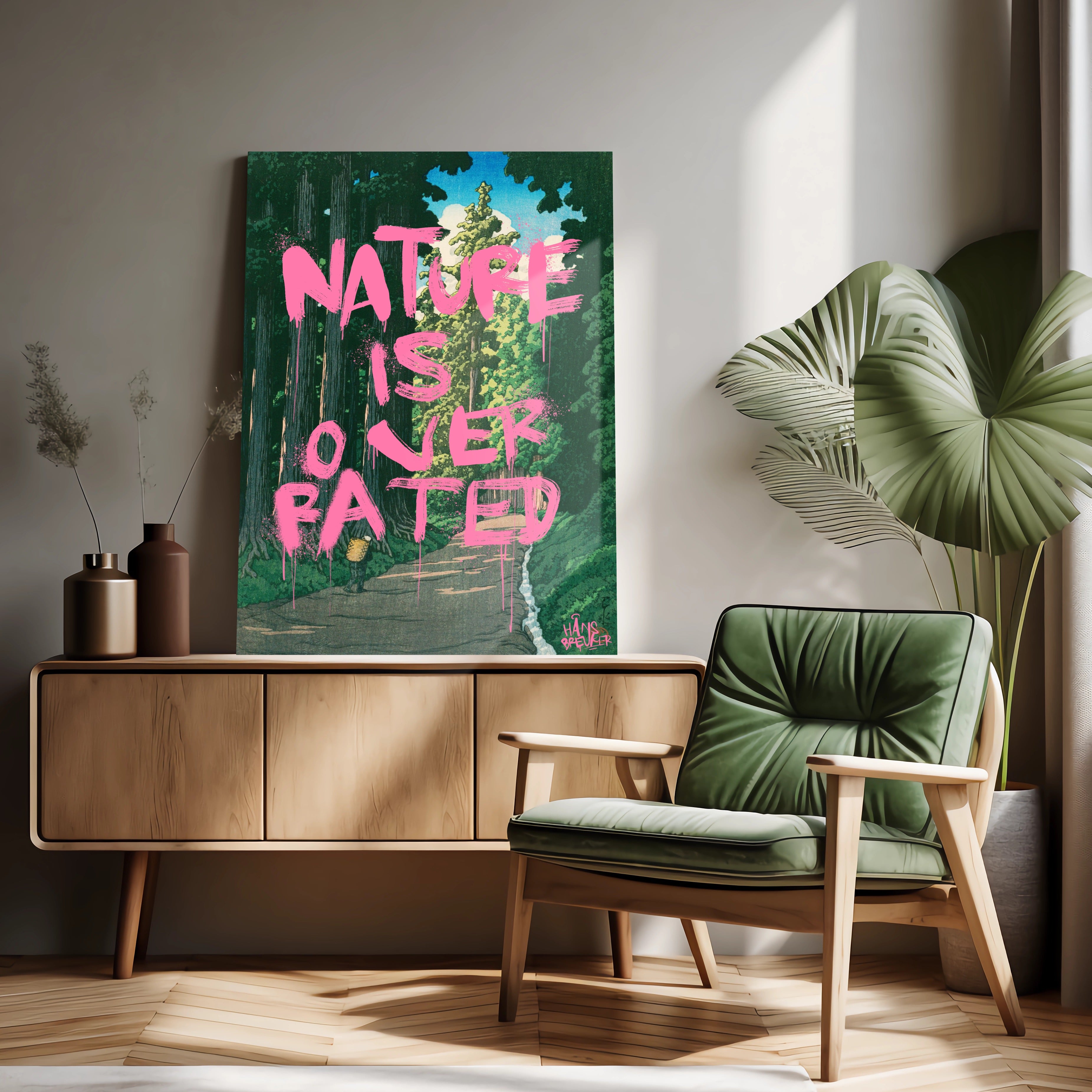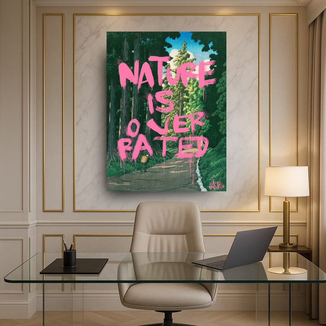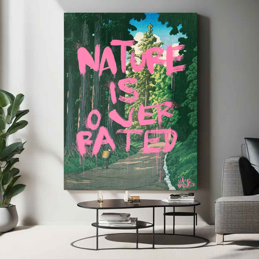 Nature Is Overrated is een bewuste provocatie. Tegen het decor van een verstild, klassiek Japans landschap wordt een uitspraak geplaatst die haaks staat op wat je ziet. Juist die botsing maakt dit werk spannend: rust en schoonheid tegenover een droge, bijna cynische quote.