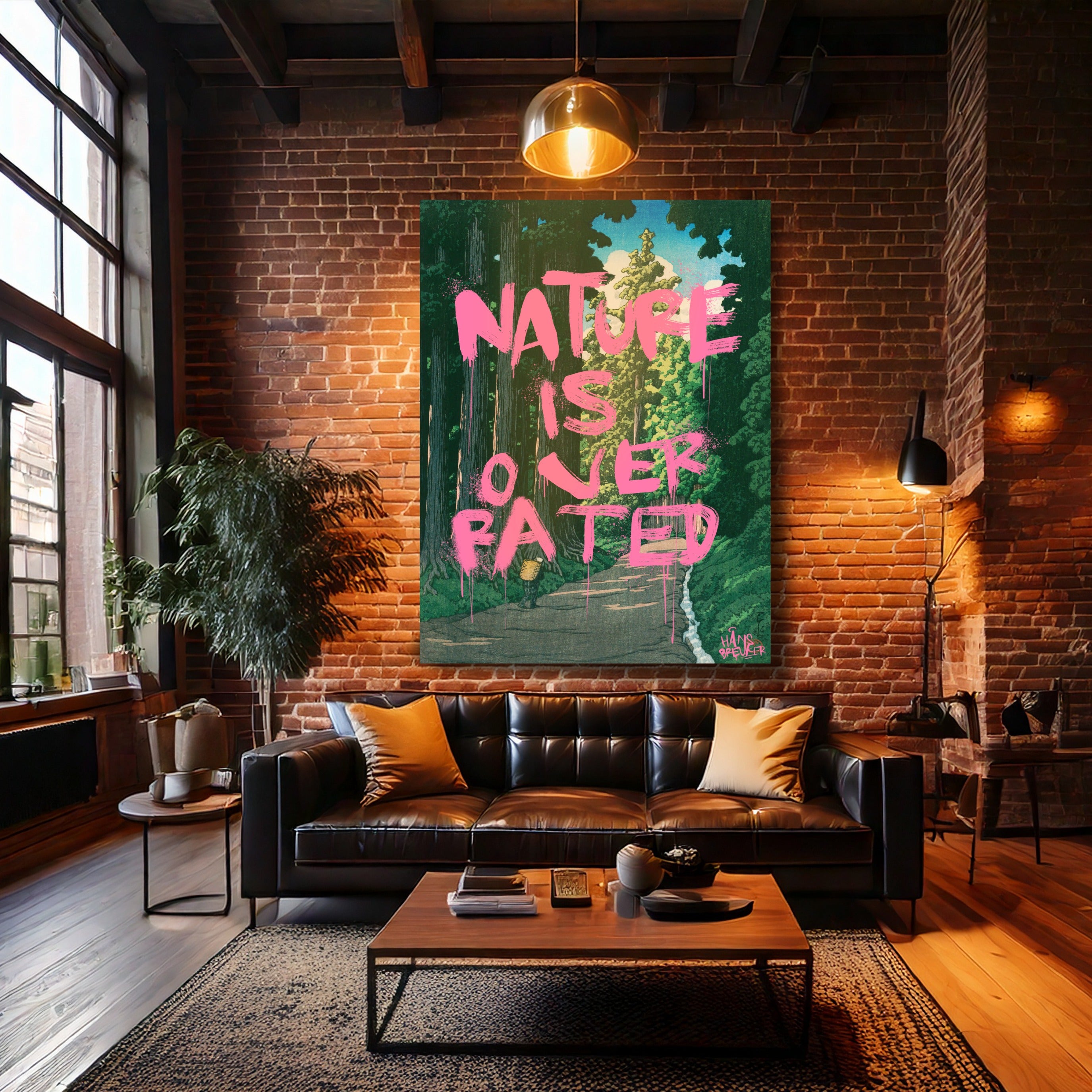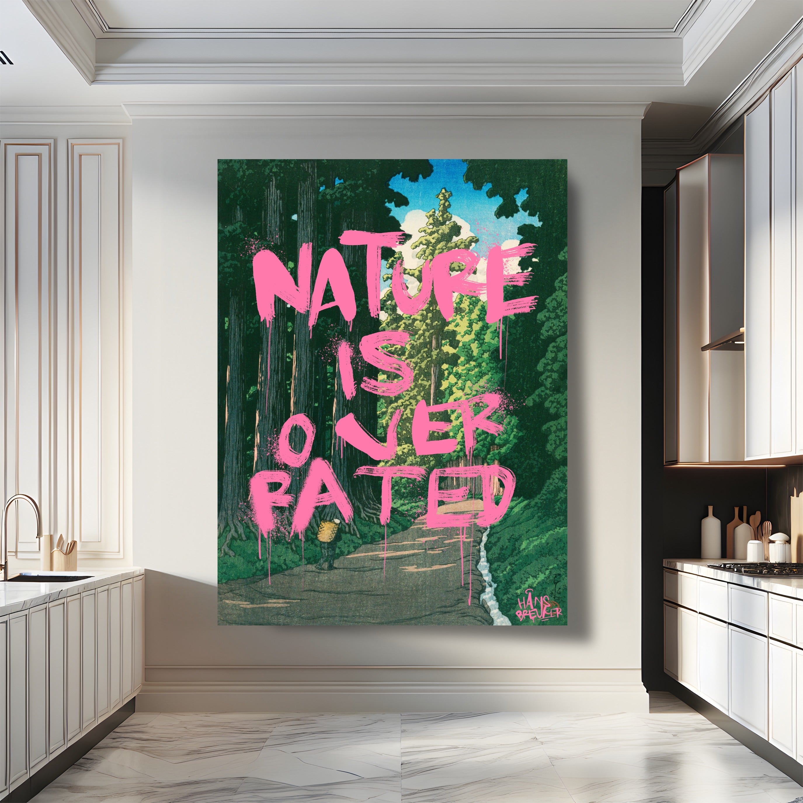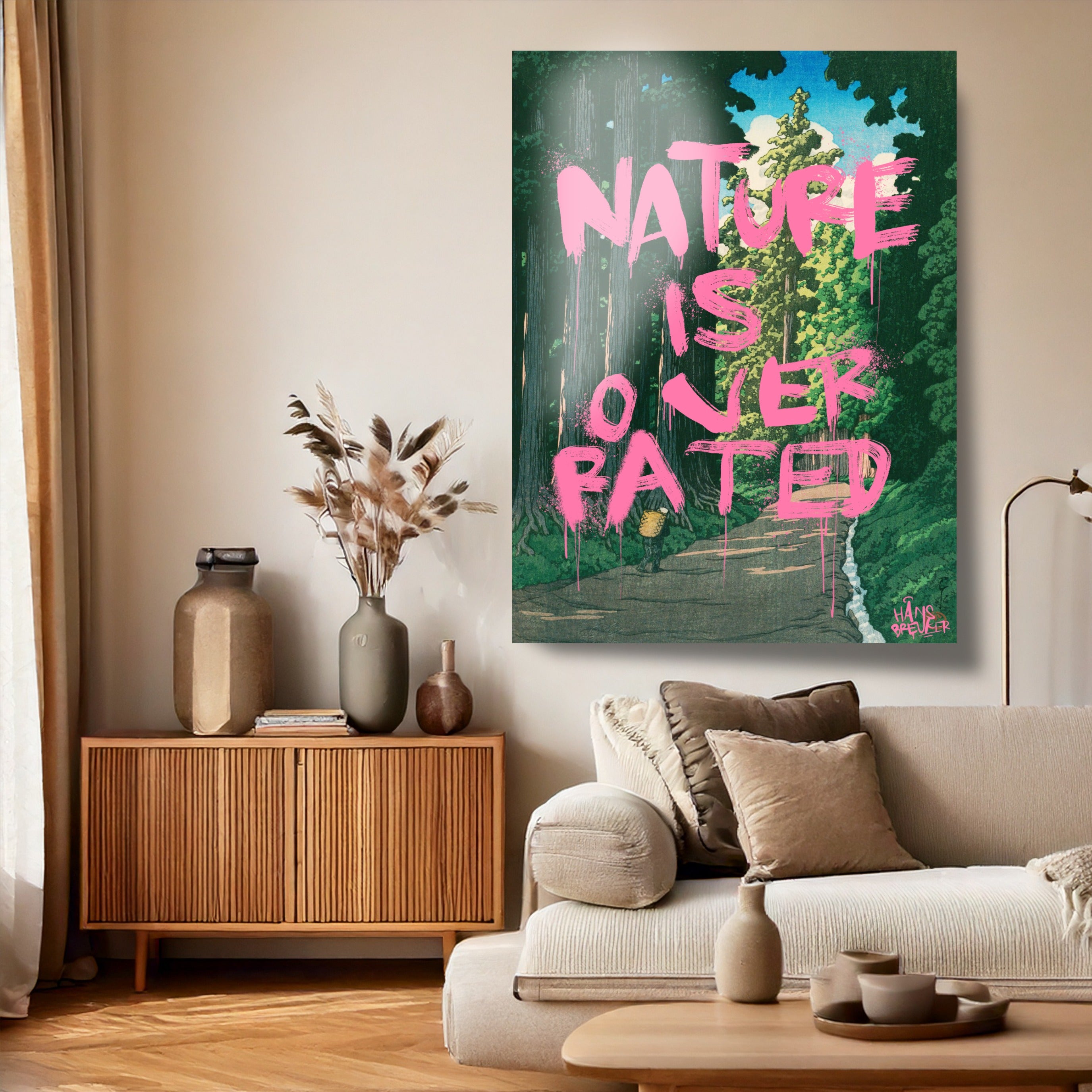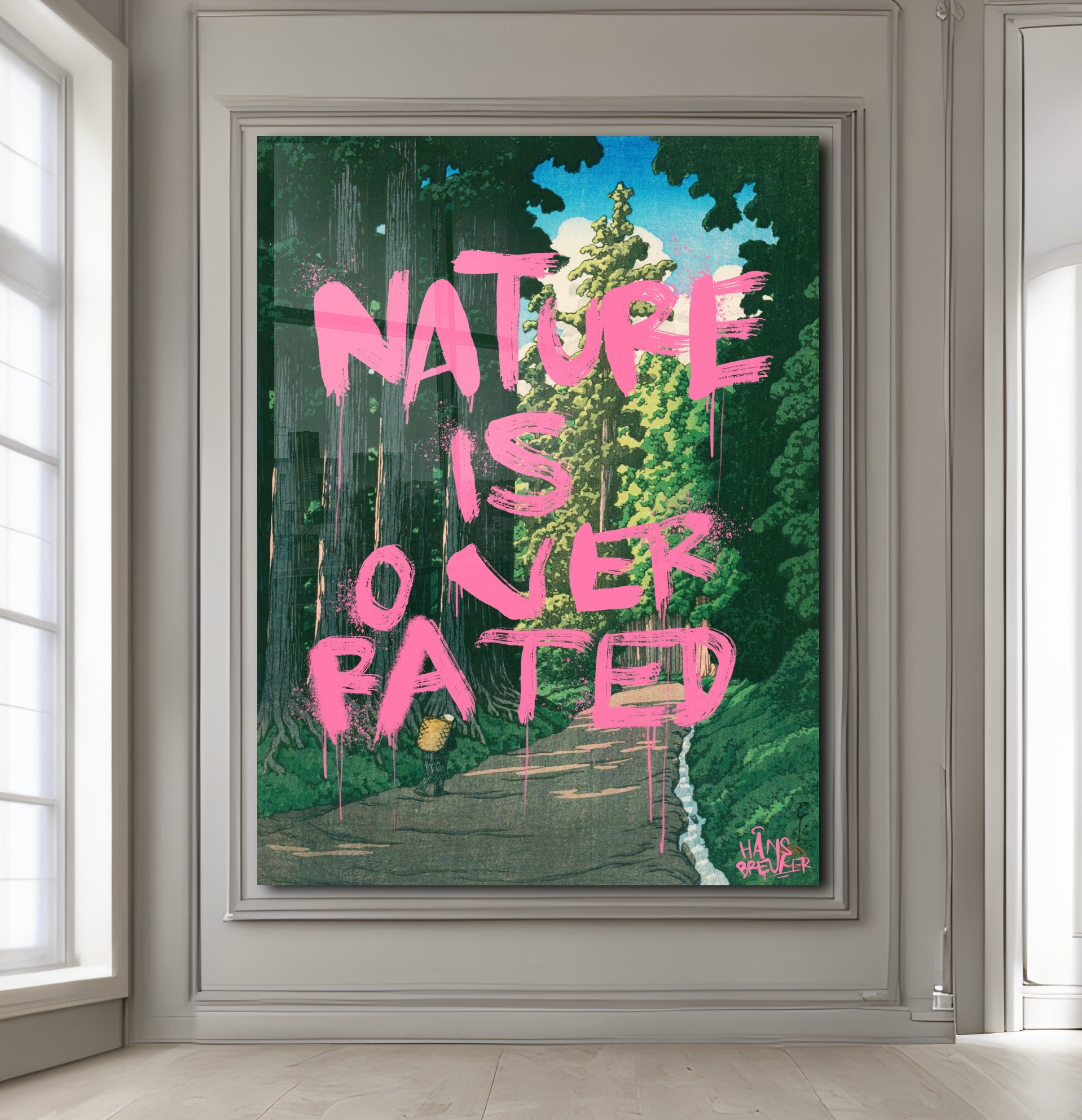 Nature Is Overrated is een bewuste provocatie. Tegen het decor van een verstild, klassiek Japans landschap wordt een uitspraak geplaatst die haaks staat op wat je ziet. Juist die botsing maakt dit werk spannend: rust en schoonheid tegenover een droge, bijna cynische quote.