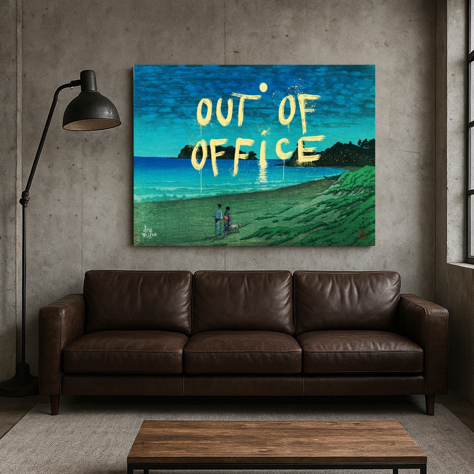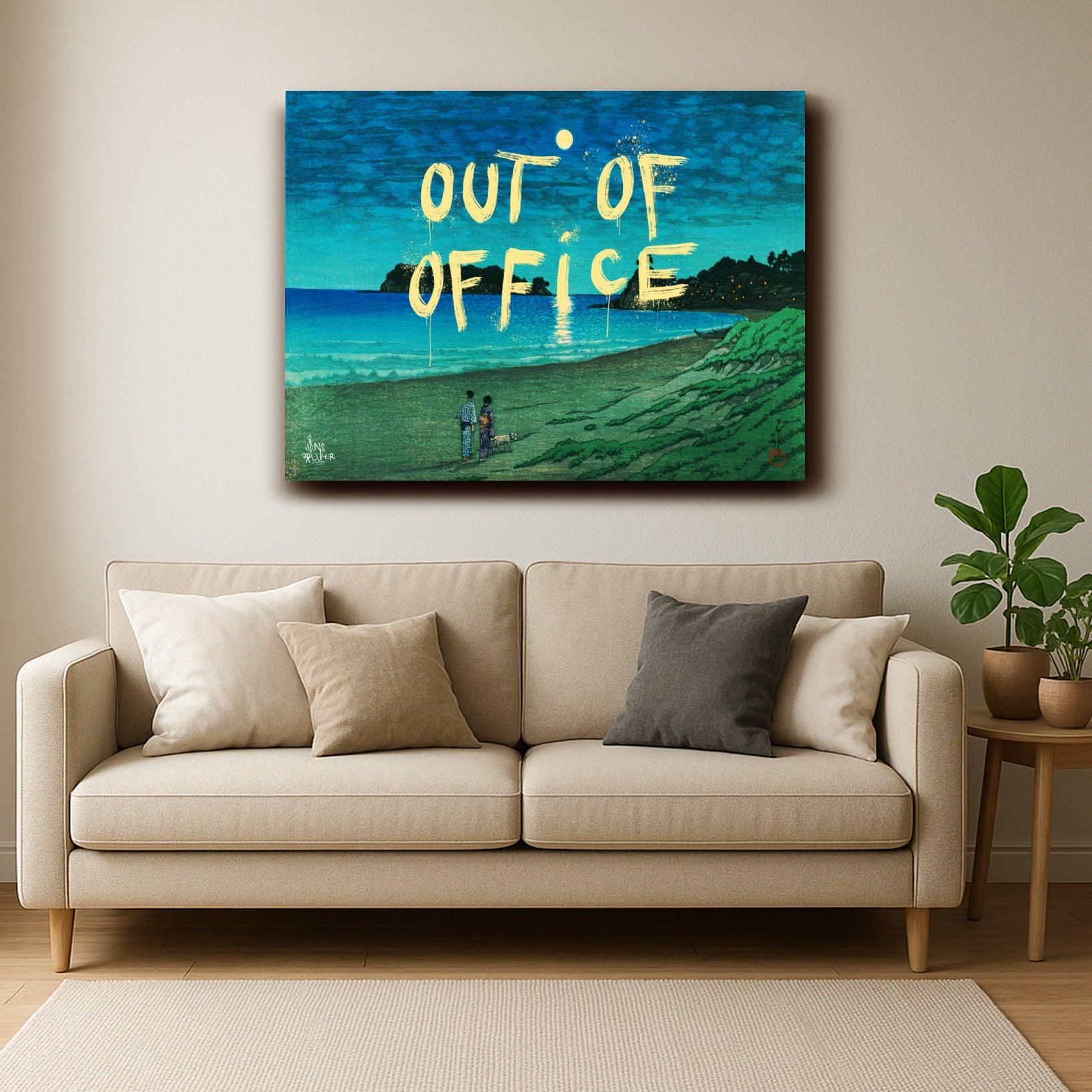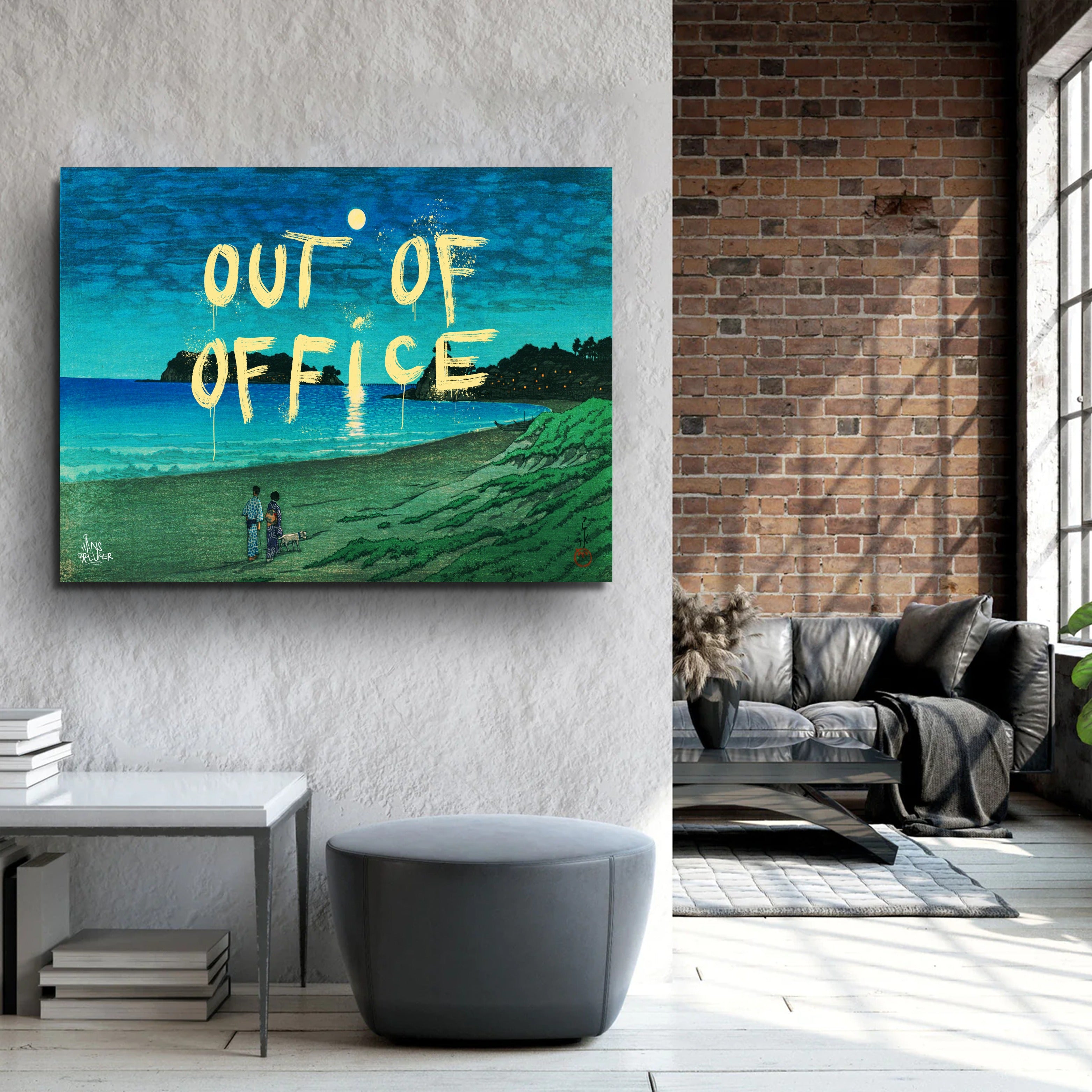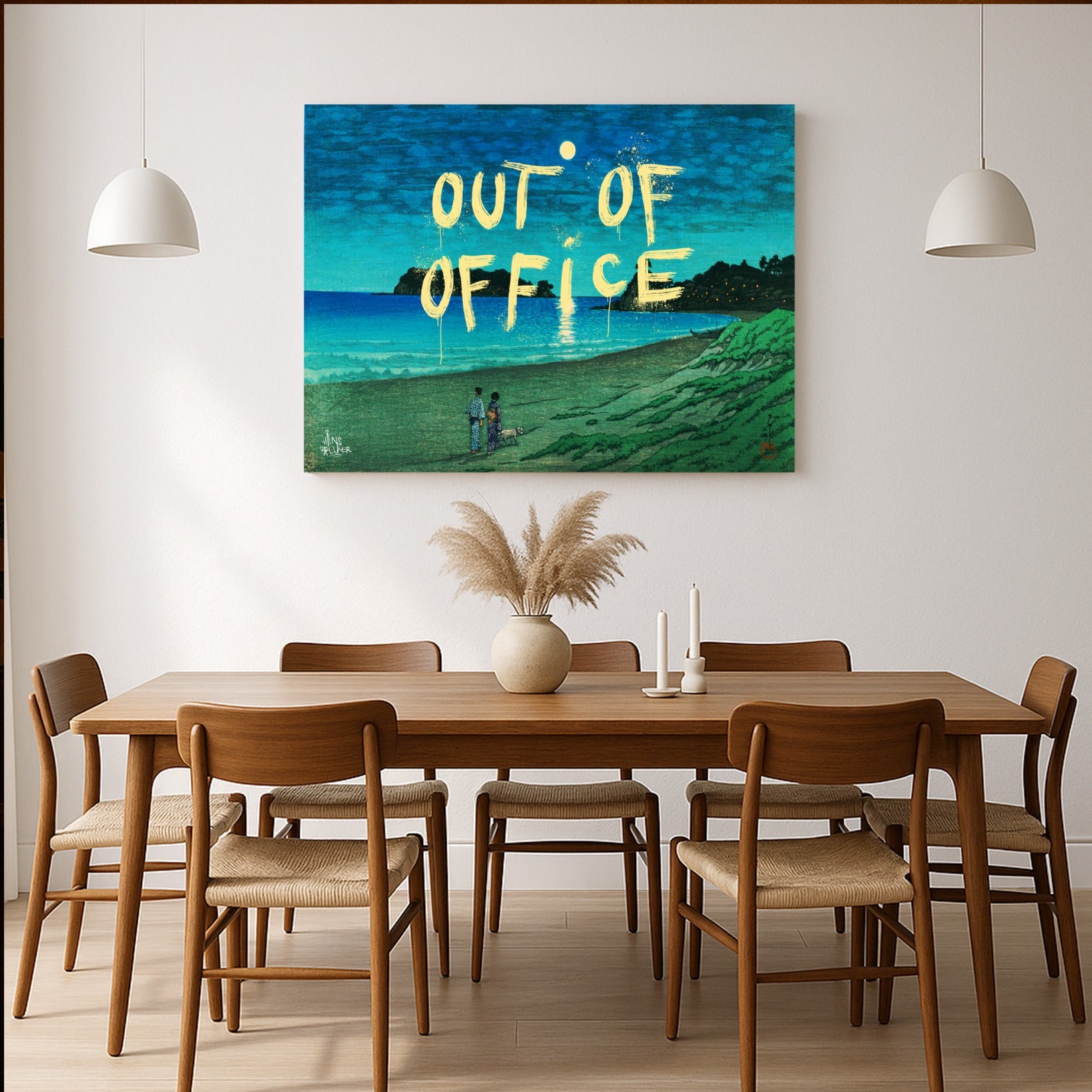De diepe blauwen, het maanlicht en het rustige strand zorgen voor een kalme basis, terwijl de quote het werk karakter en lef geeft. Out of Office past perfect in woonkamers, thuiskantoren, slaapkamers of inspirerende werkplekken waar vrijheid en balans centraal staan.