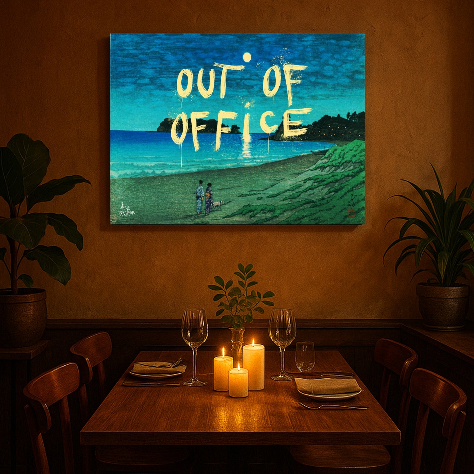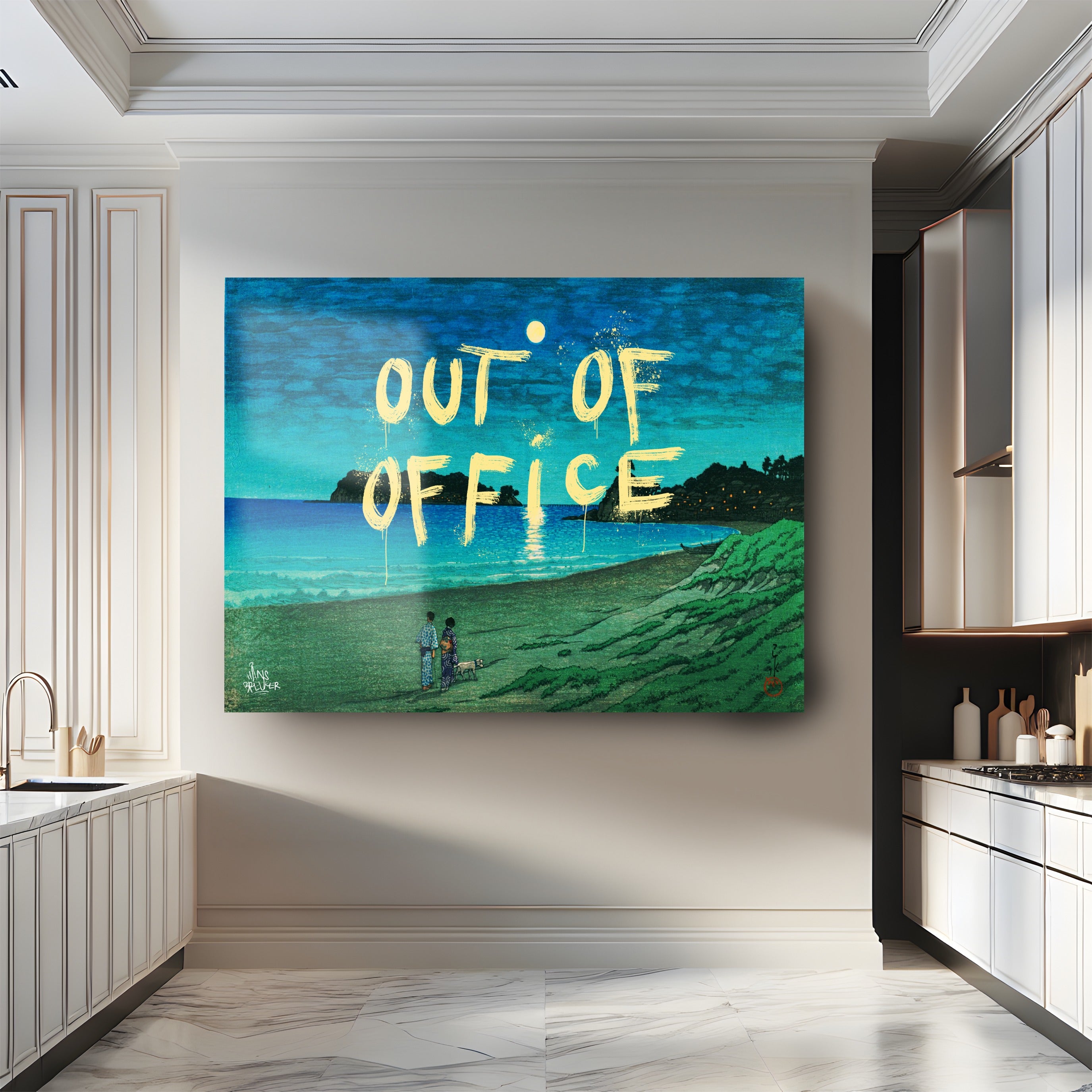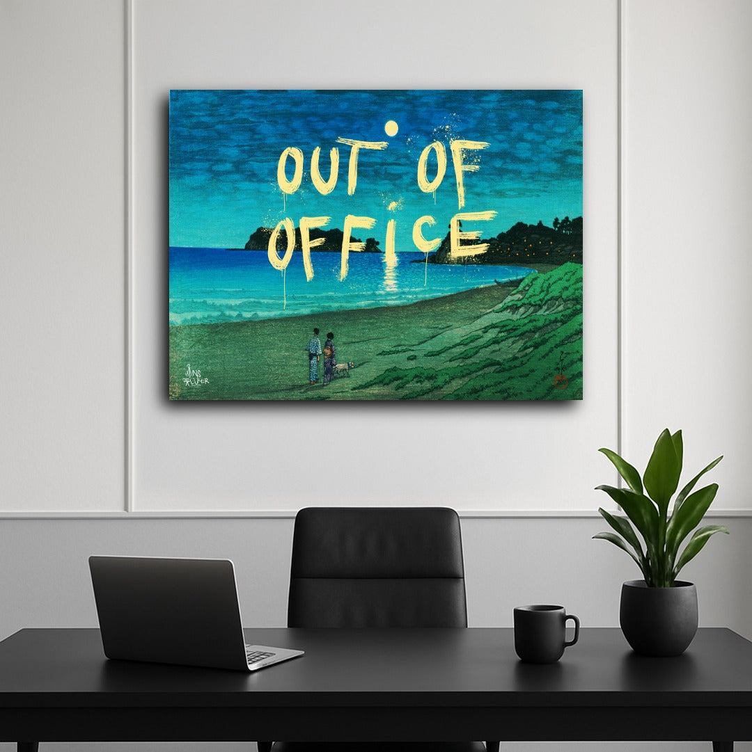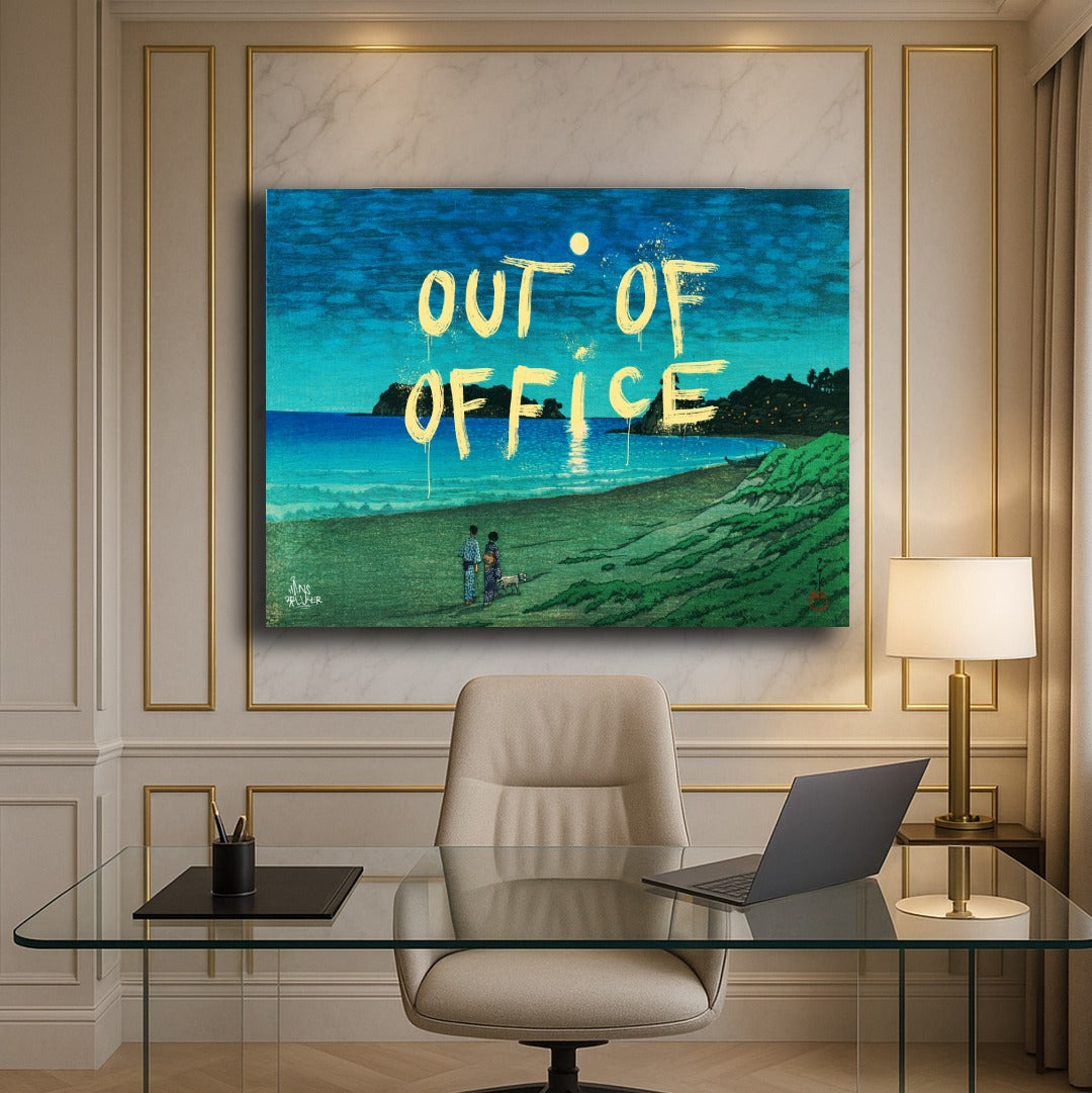 De diepe blauwen, het maanlicht en het rustige strand zorgen voor een kalme basis, terwijl de quote het werk karakter en lef geeft. Out of Office past perfect in woonkamers, thuiskantoren, slaapkamers of inspirerende werkplekken waar vrijheid en balans centraal staan.