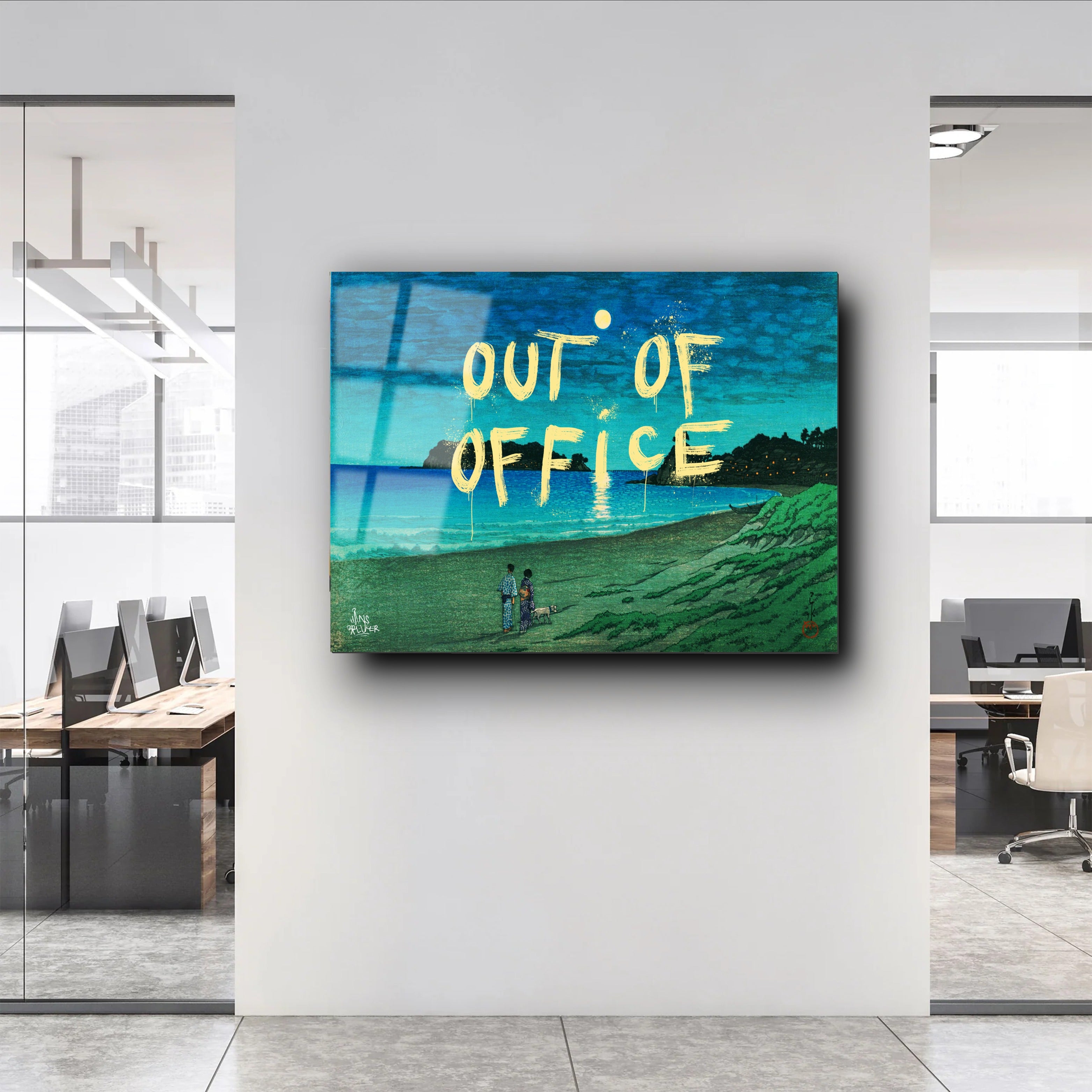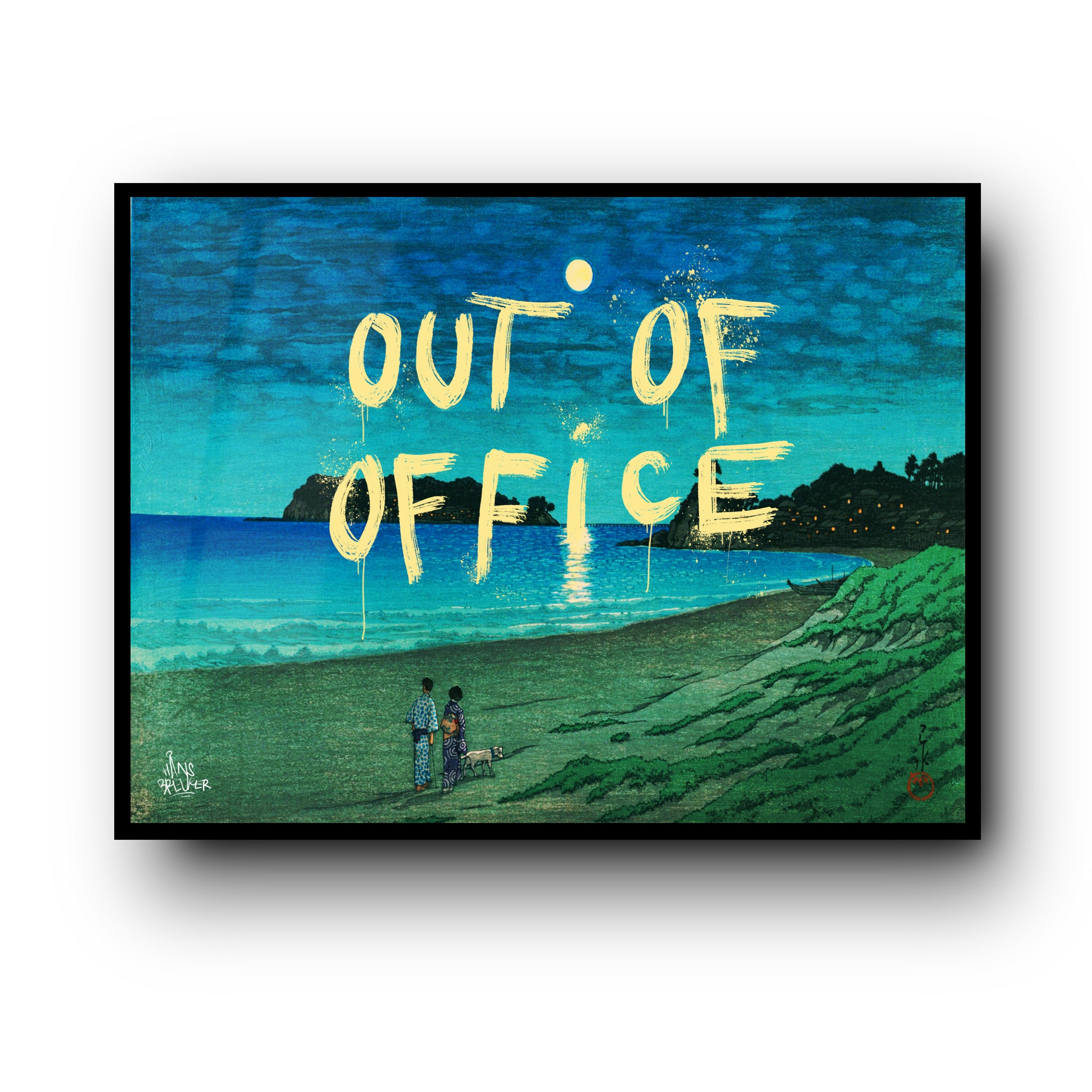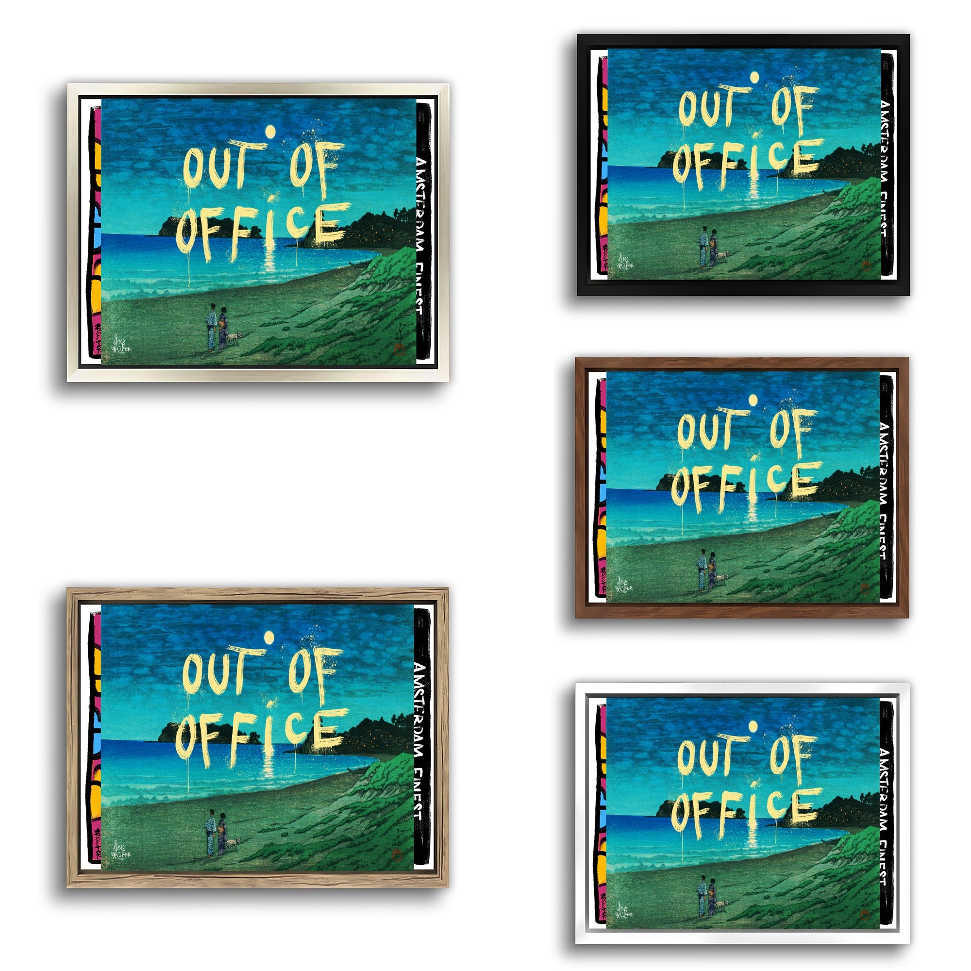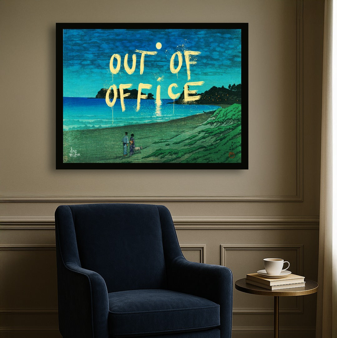 De diepe blauwen, het maanlicht en het rustige strand zorgen voor een kalme basis, terwijl de quote het werk karakter en lef geeft. Out of Office past perfect in woonkamers, thuiskantoren, slaapkamers of inspirerende werkplekken waar vrijheid en balans centraal staan.