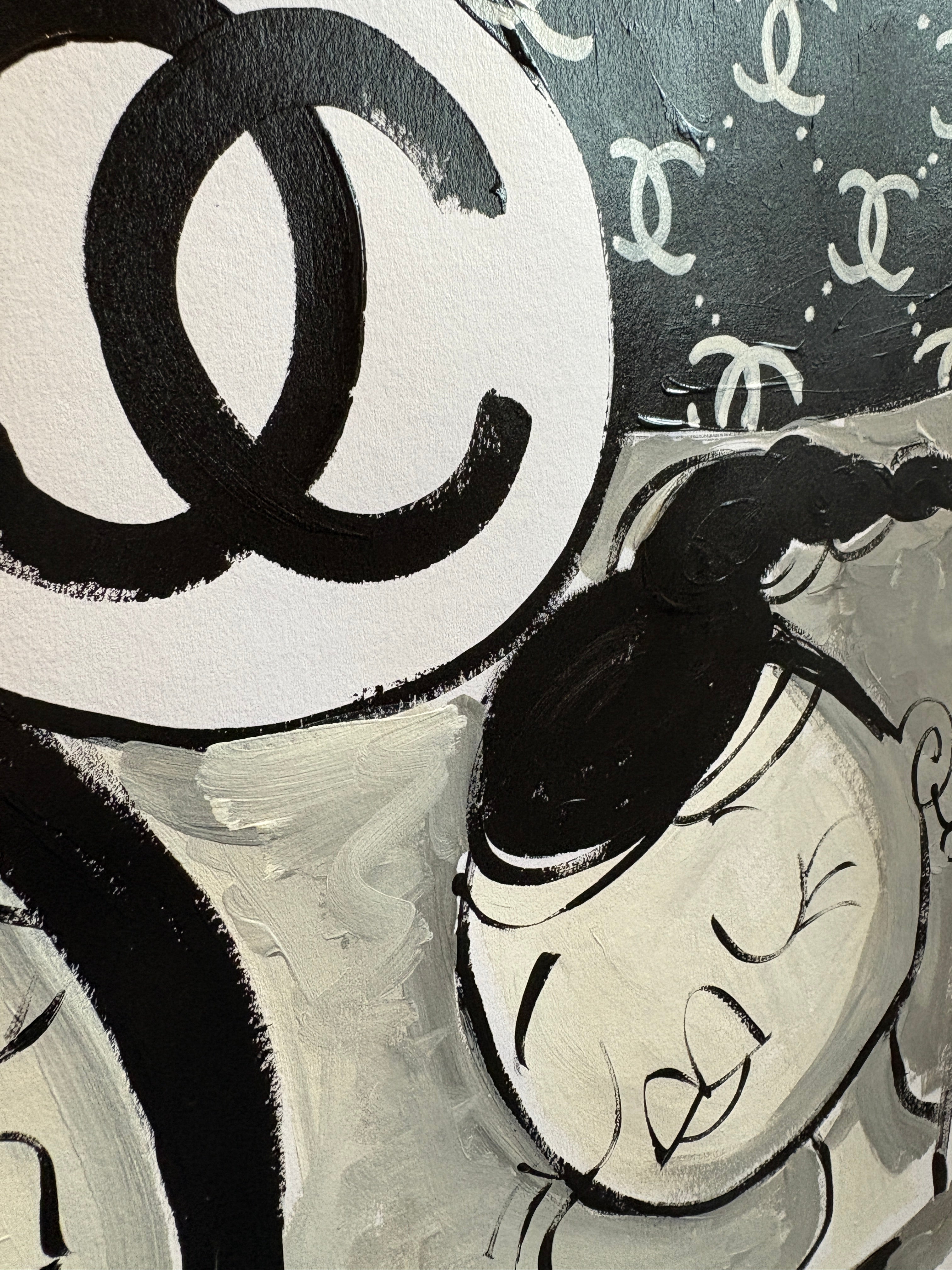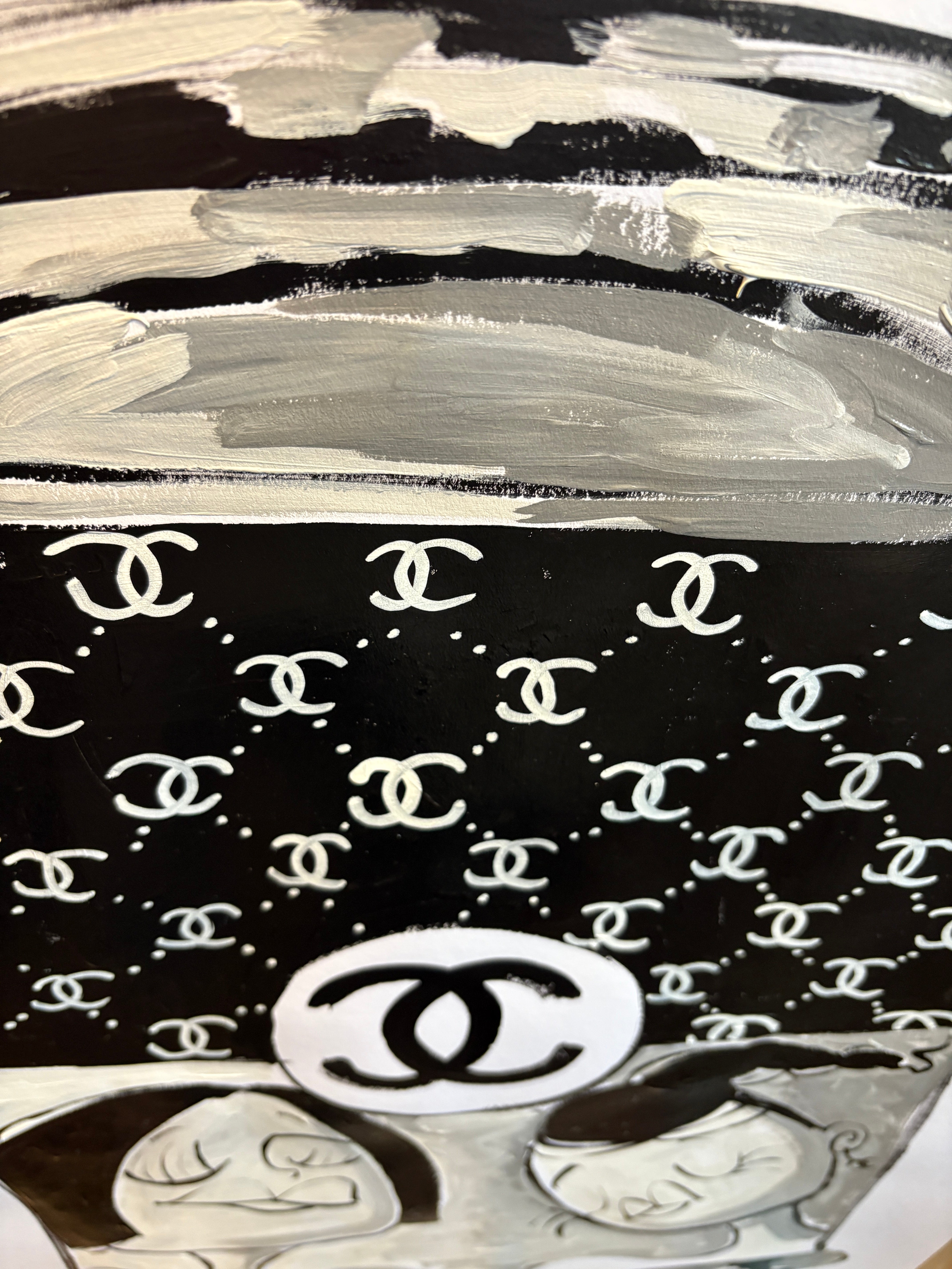 Die handgemalten Chanel-Muster, die ausdrucksstarken Linien und die sichtbaren Pinselstriche verleihen diesem Werk Lebendigkeit und Authentizität. Der Kontrast zwischen luxuriöser Symbolik und einer lässigen, fast nonchalanten Ausführung ist es, der diesem Stück seine Kraft verleiht: müheloser Stil, unprätentiöse Klasse.