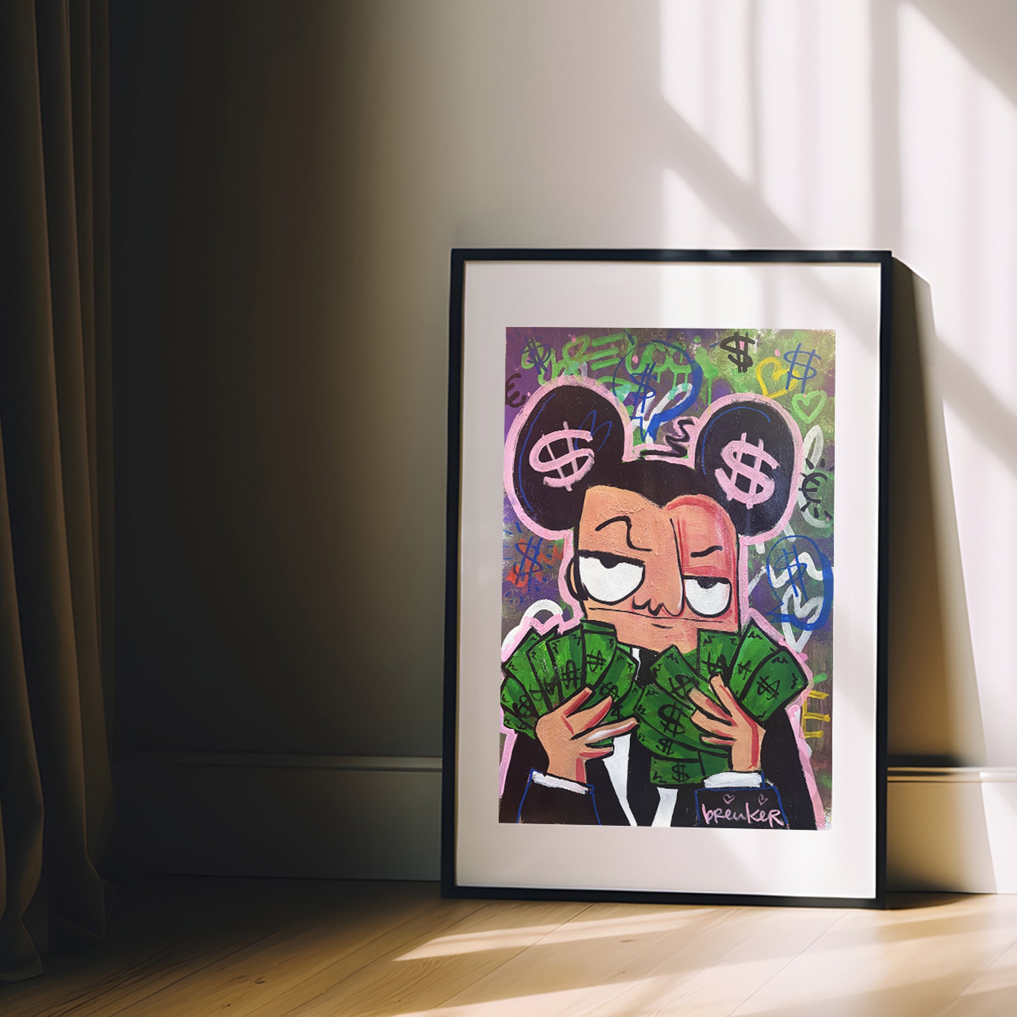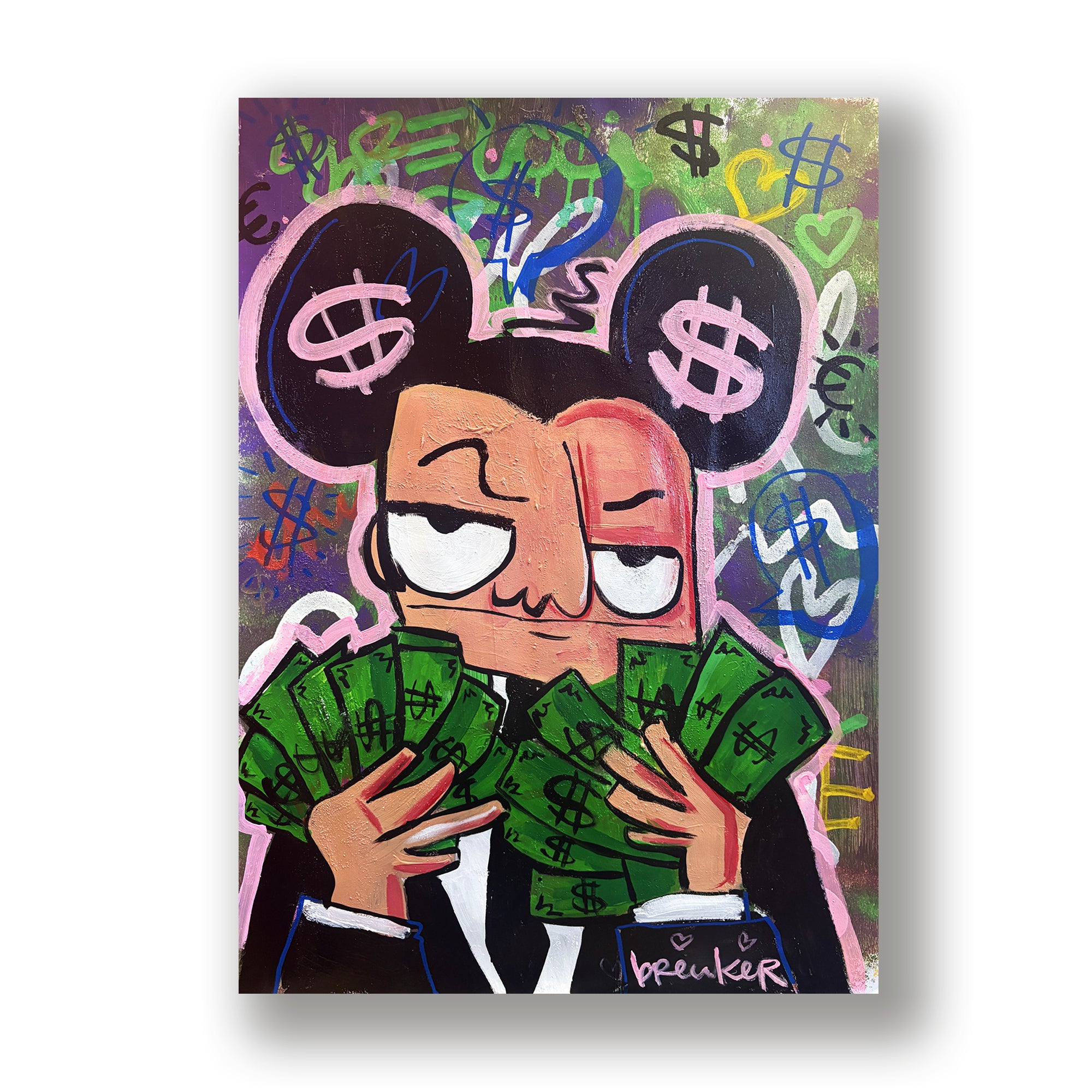 Mickey Mouse Money is een rauw en energiek geschilderd werk waarin popcultuur, ambitie en geld samenkomen. Het iconische figuur is bewust vervormd en eigen gemaakt, geschilderd met verf en spuitbus op papier, wat het werk een directe, almost street-achtige intensiteit geeft. De felle kleuren, grove lijnen en symbolen van valuta en overvloed versterken het gevoel van drive, lef en vrijheid.