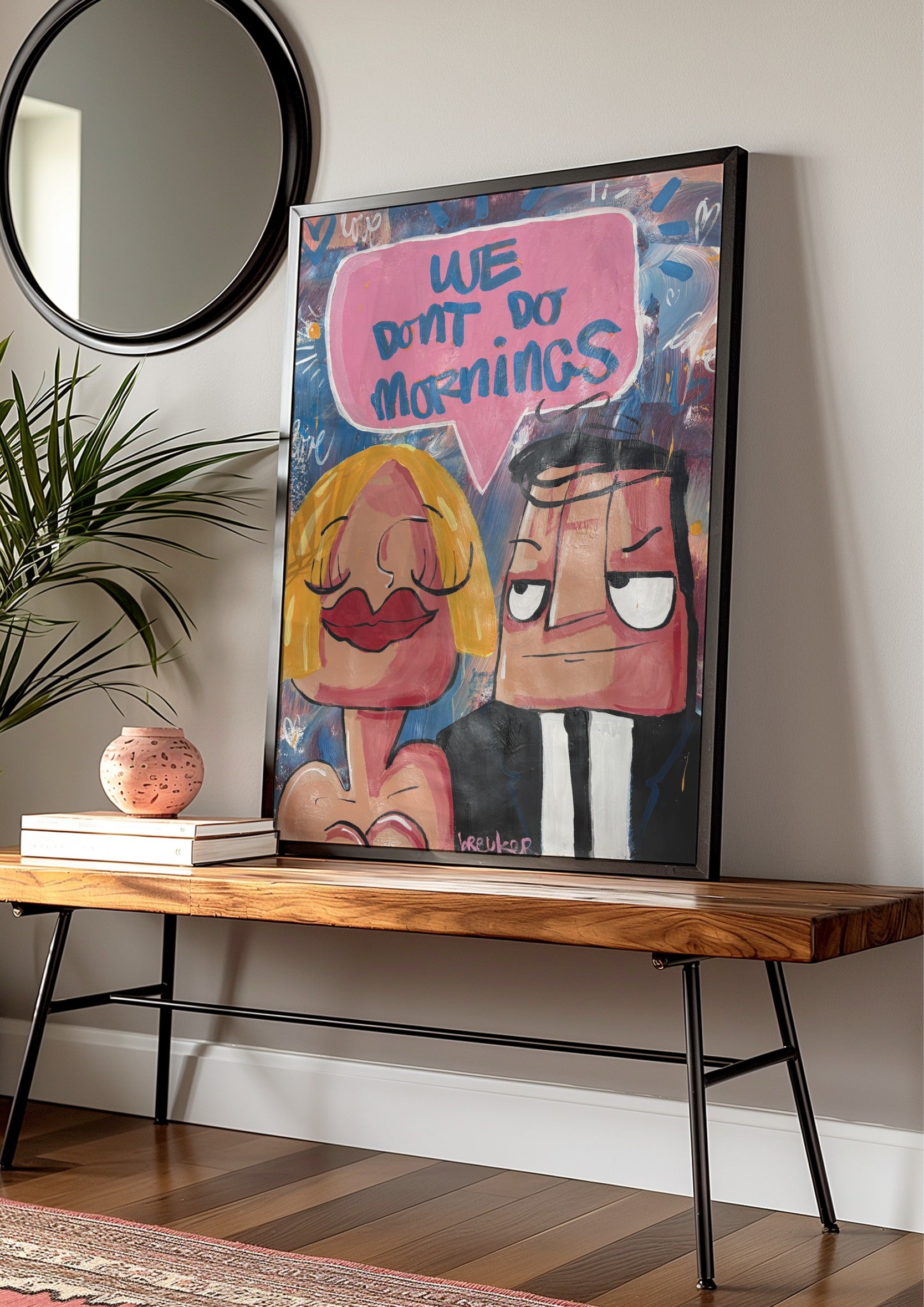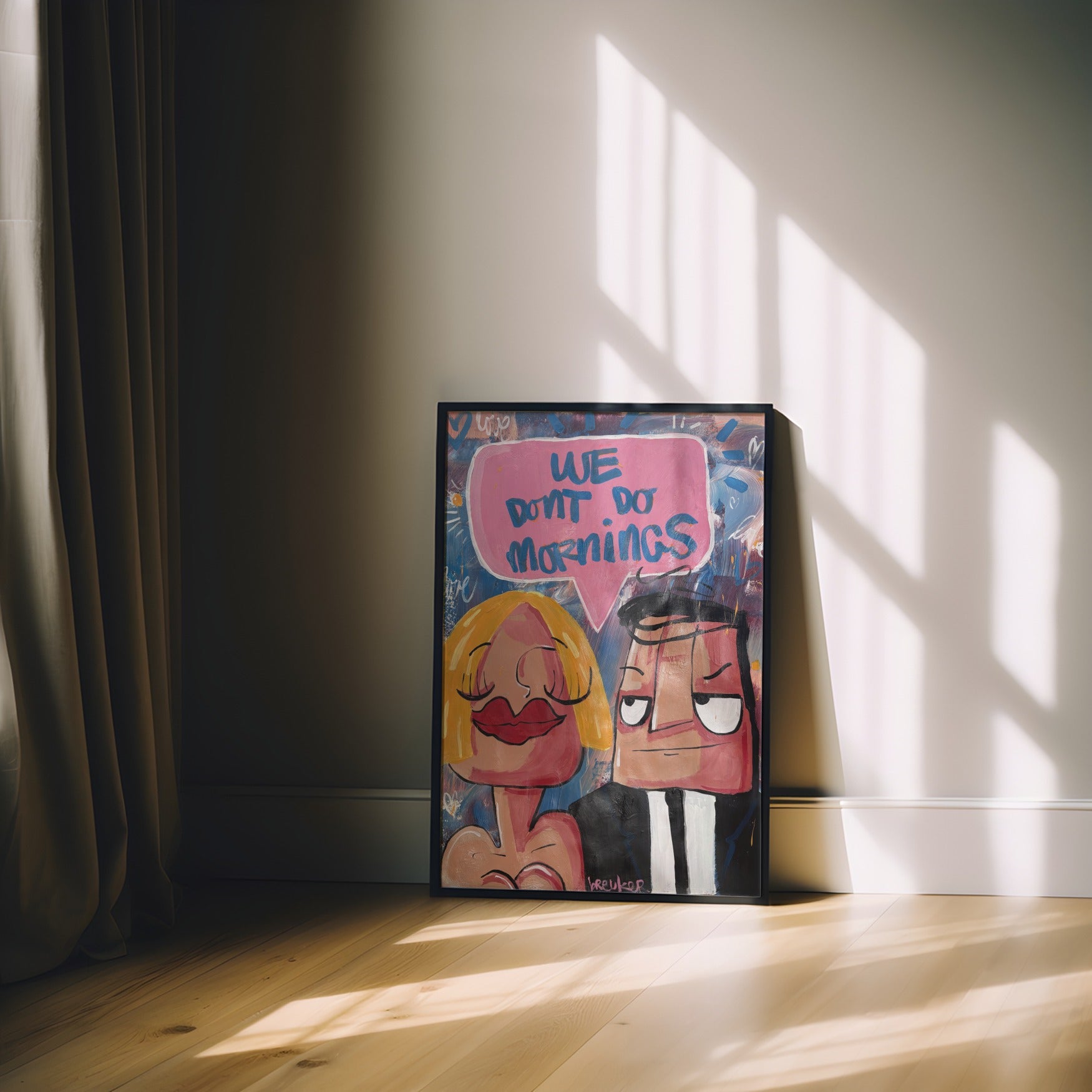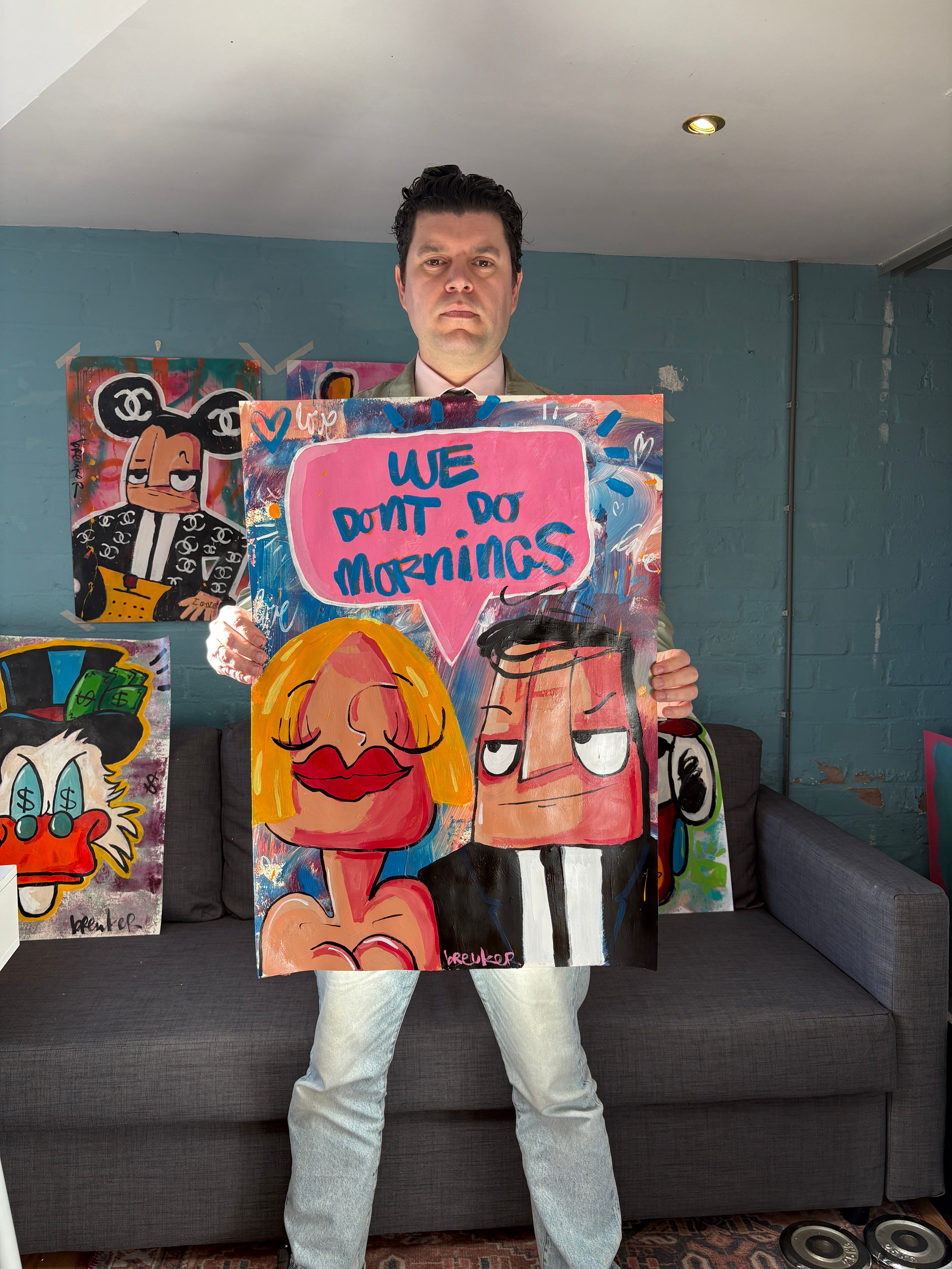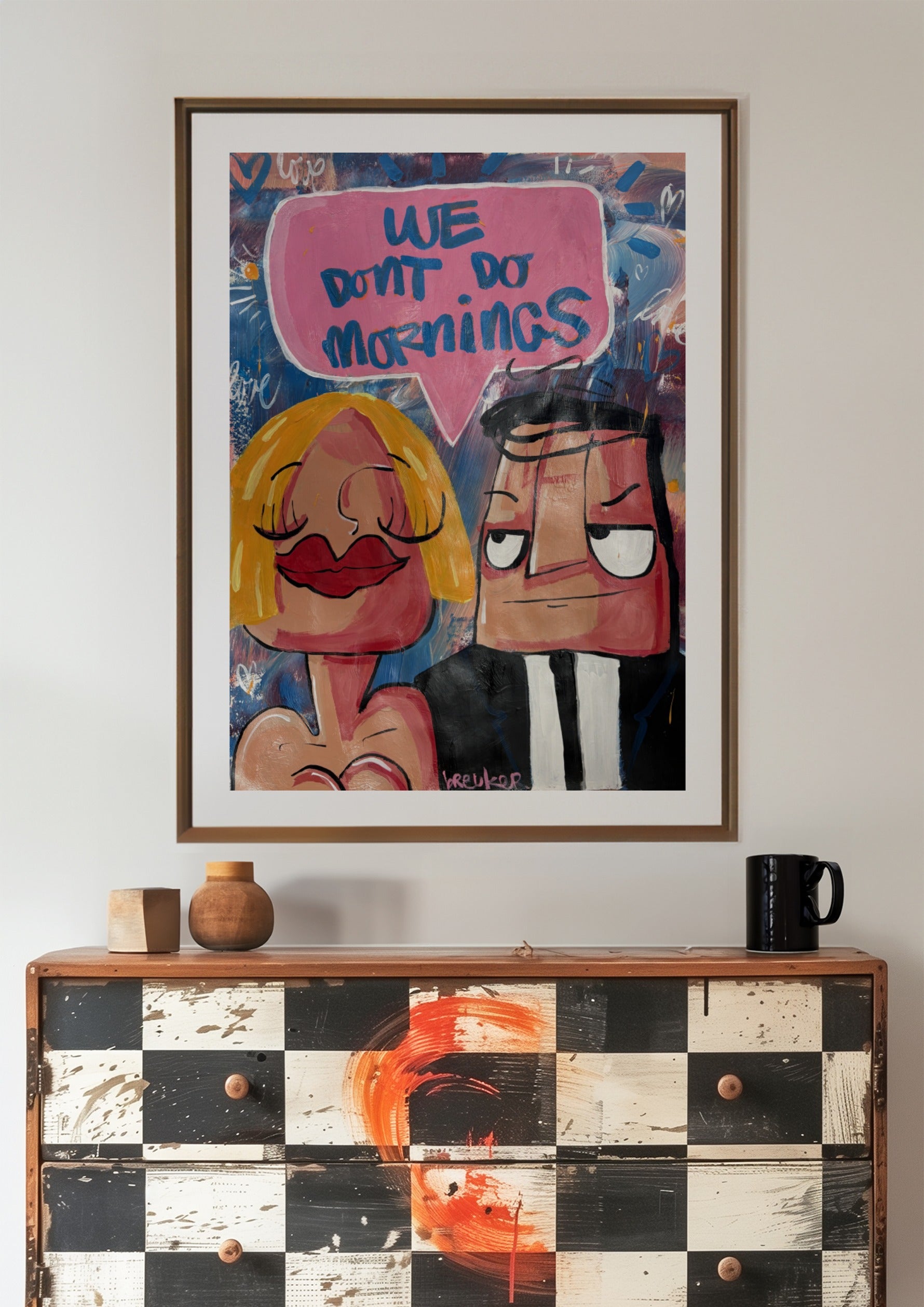 Dieses Werk zeigt zwei ikonische Figuren Breukers: sie entspannt, er leicht gereizt – eingefangen in einem Moment, den jeder kennt. Die ausdrucksstarken Gesichter, die kräftigen Linien und die verspielten Farben erzeugen Humor mit Charakter. Der Text in der pinkfarbenen Sprechblase sagt alles, ohne Erklärung.