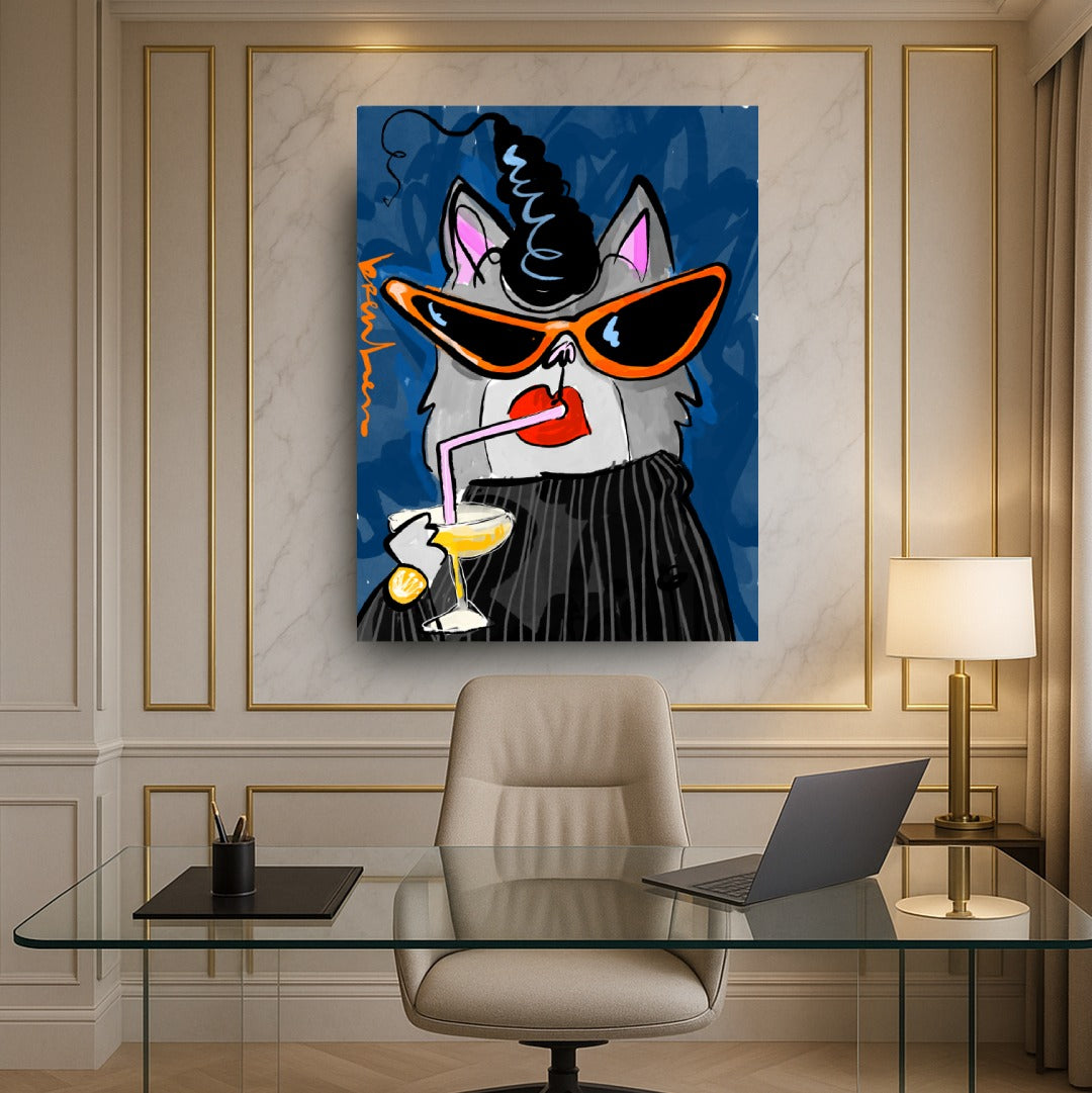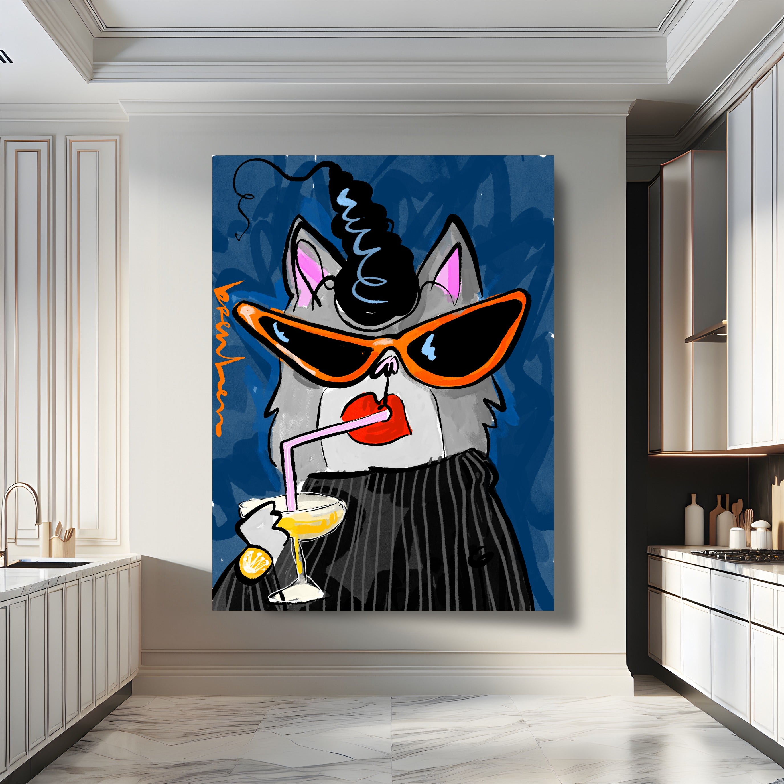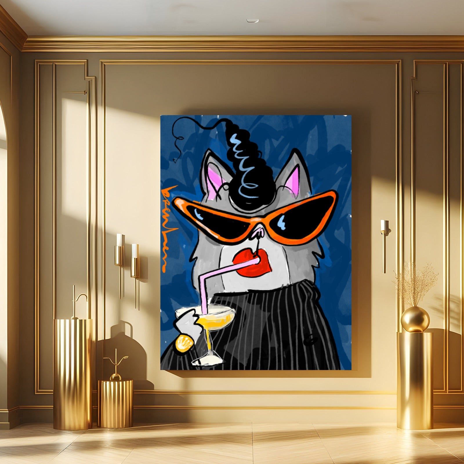 „Champagner mit Strohhalm“ bringt pure Diva-Energie an Ihre Wand. Eine stylische, selbstbewusste Katze mit hohem Schopf, knallroten Lippen, übergroßer Sonnenbrille und … natürlich … einem Glas Champagner, das sie lässig mit einem Strohhalm nippt. Dieser Katze ist alles egal – sie hat den Raum fest im Griff.