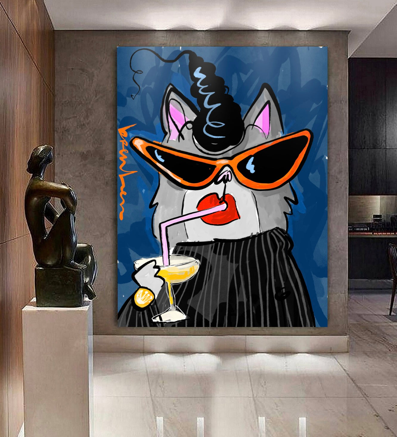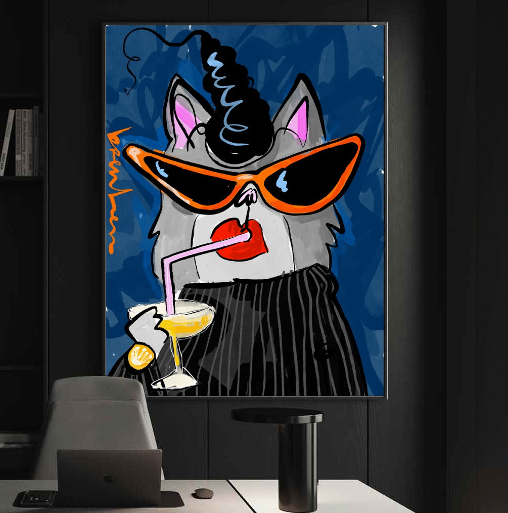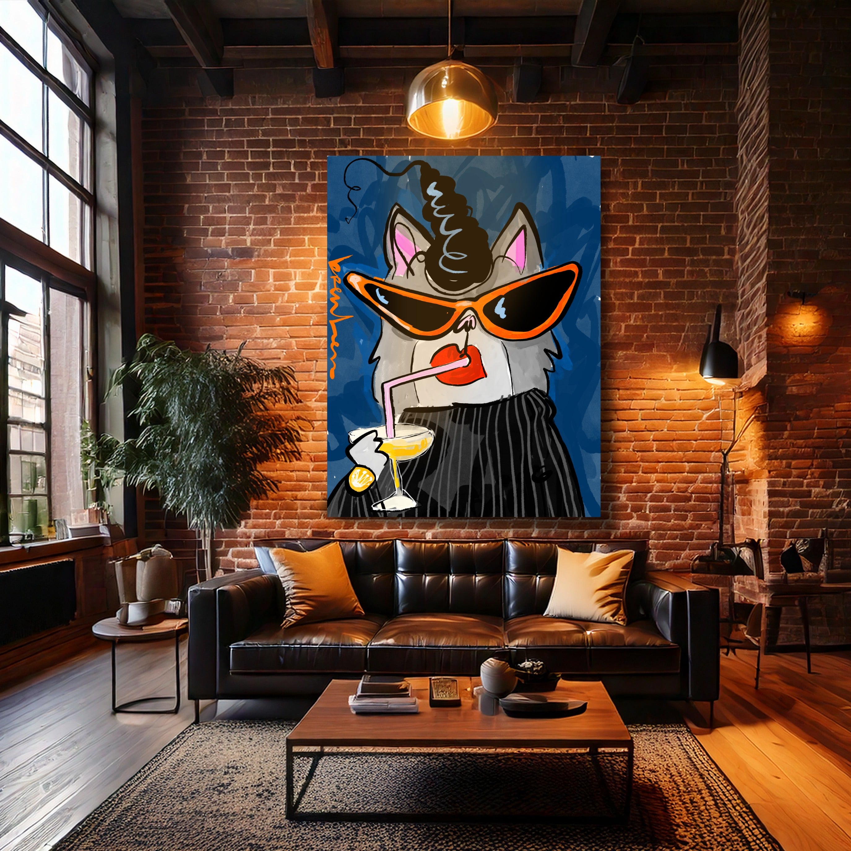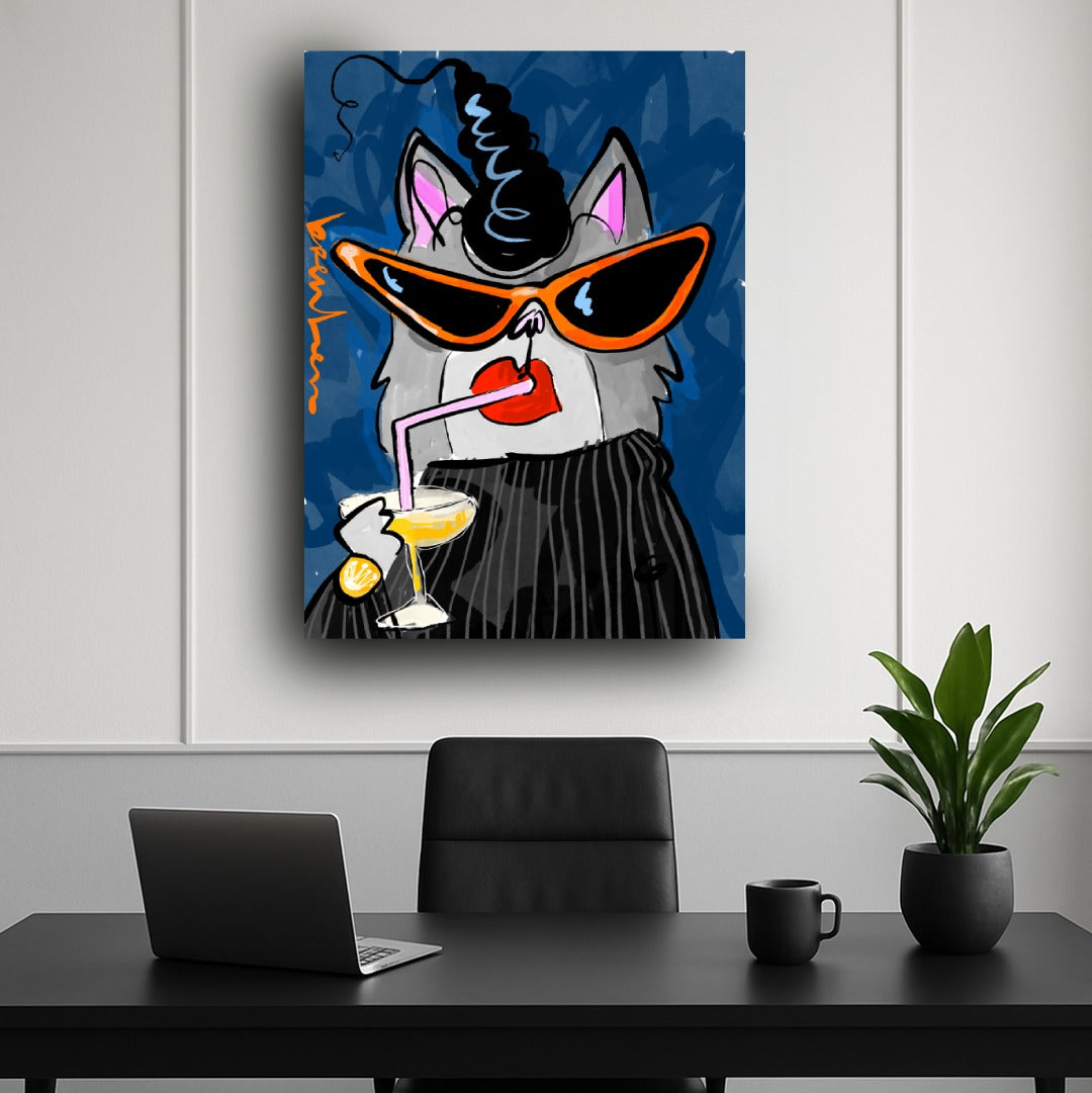 „Champagner mit Strohhalm“ bringt pure Diva-Energie an Ihre Wand. Eine stylische, selbstbewusste Katze mit hohem Schopf, knallroten Lippen, übergroßer Sonnenbrille und … natürlich … einem Glas Champagner, das sie lässig mit einem Strohhalm nippt. Dieser Katze ist alles egal – sie hat den Raum fest im Griff.