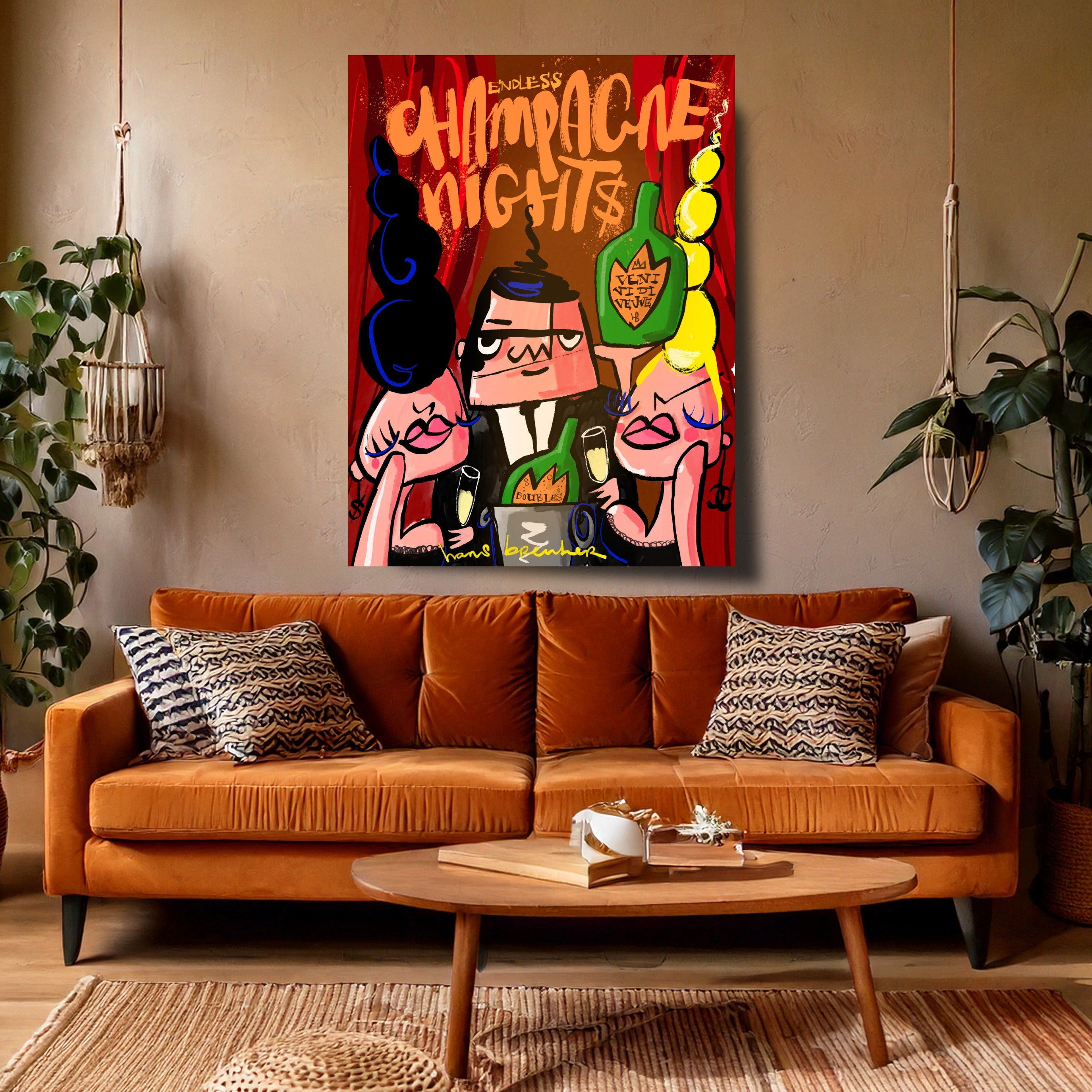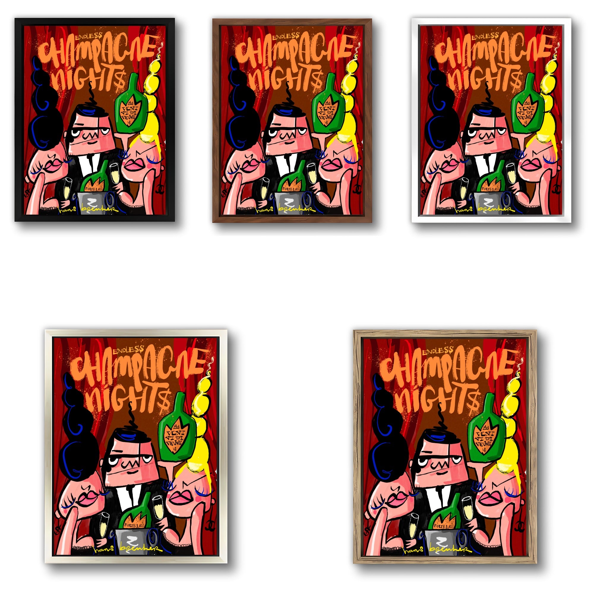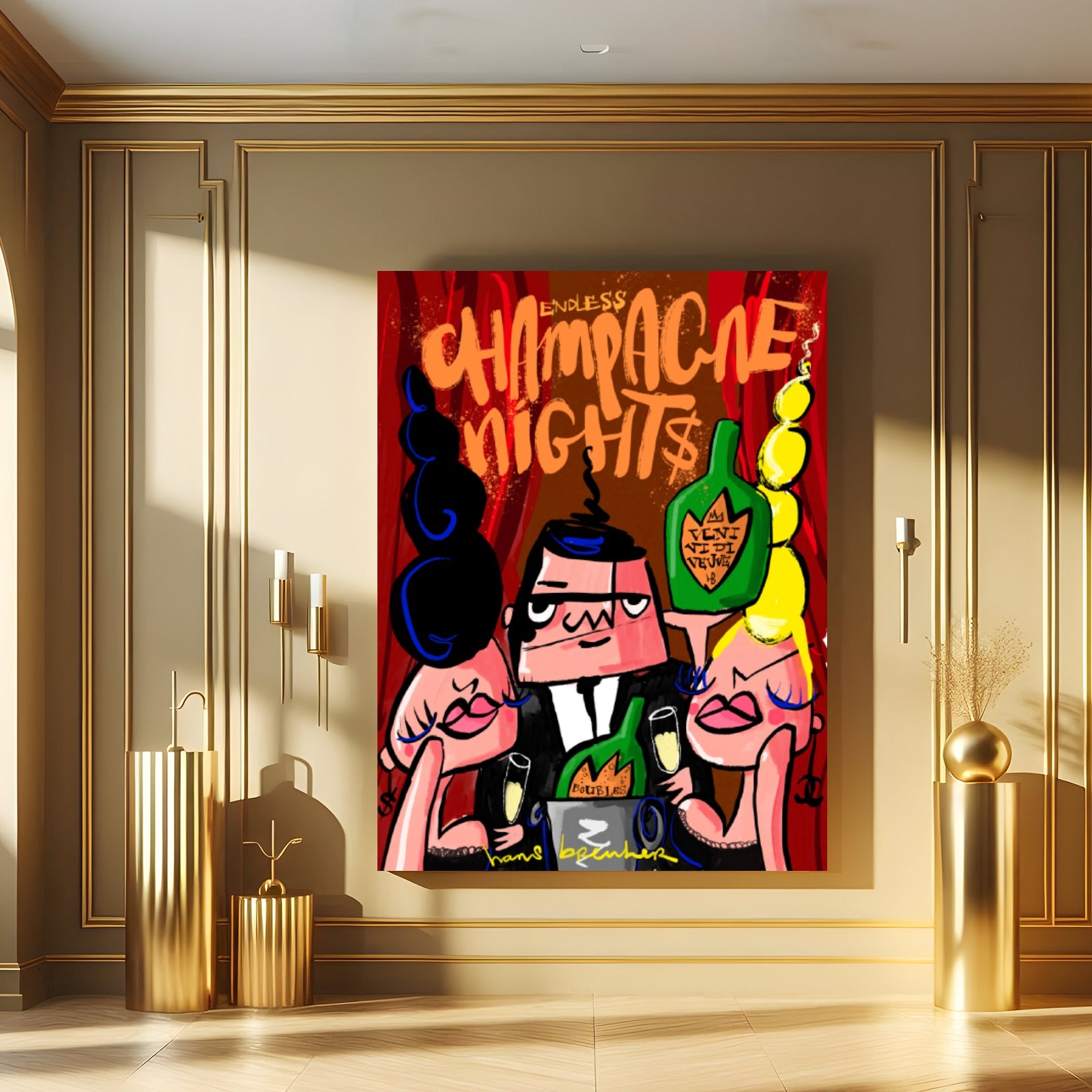 Dit moderne champagne kunstwerk draait om beleving. De centrale figuur, geflankeerd door glamoureuze vrouwen en omringd door champagneflessen en bubbels, straalt zelfvertrouwen en overwinning uit.