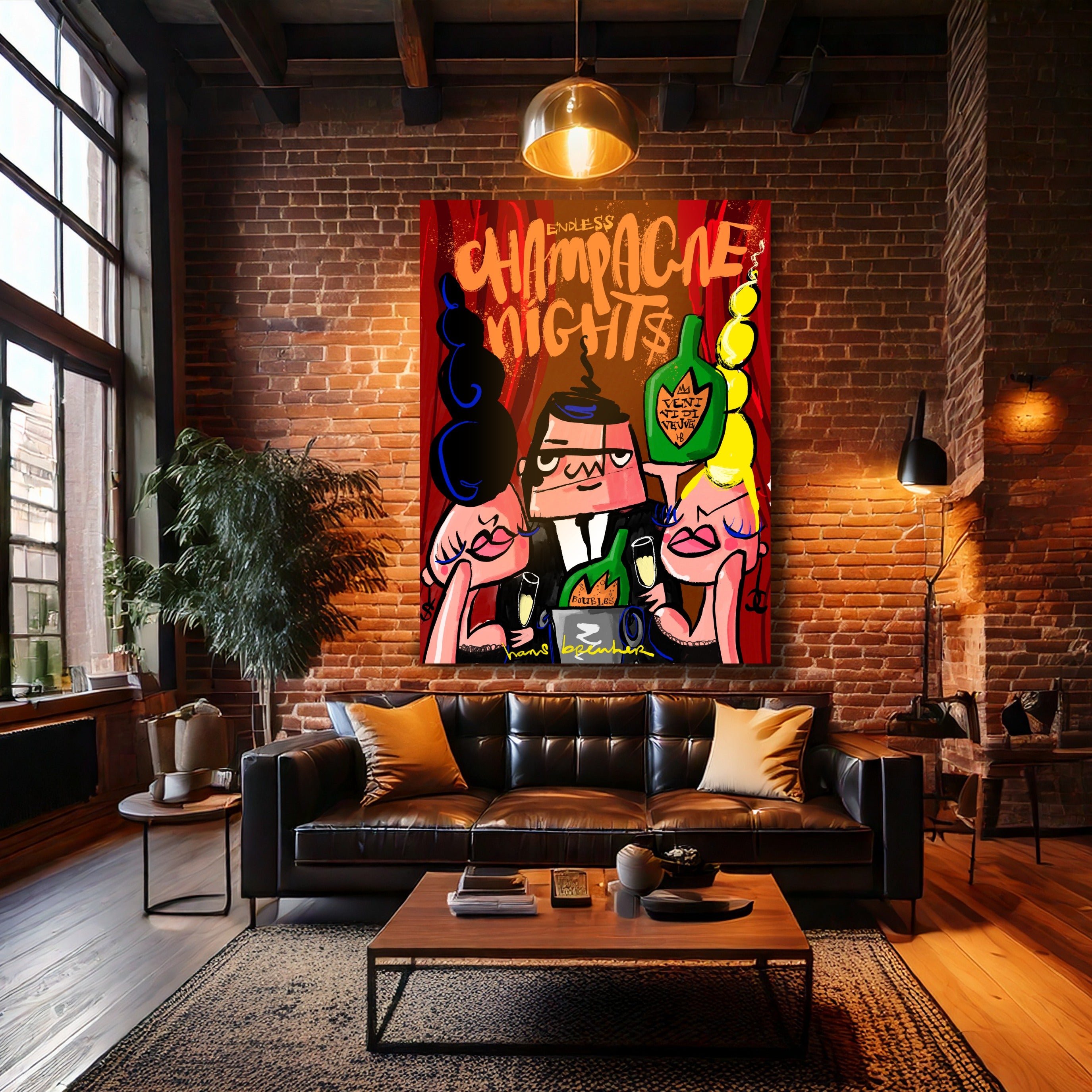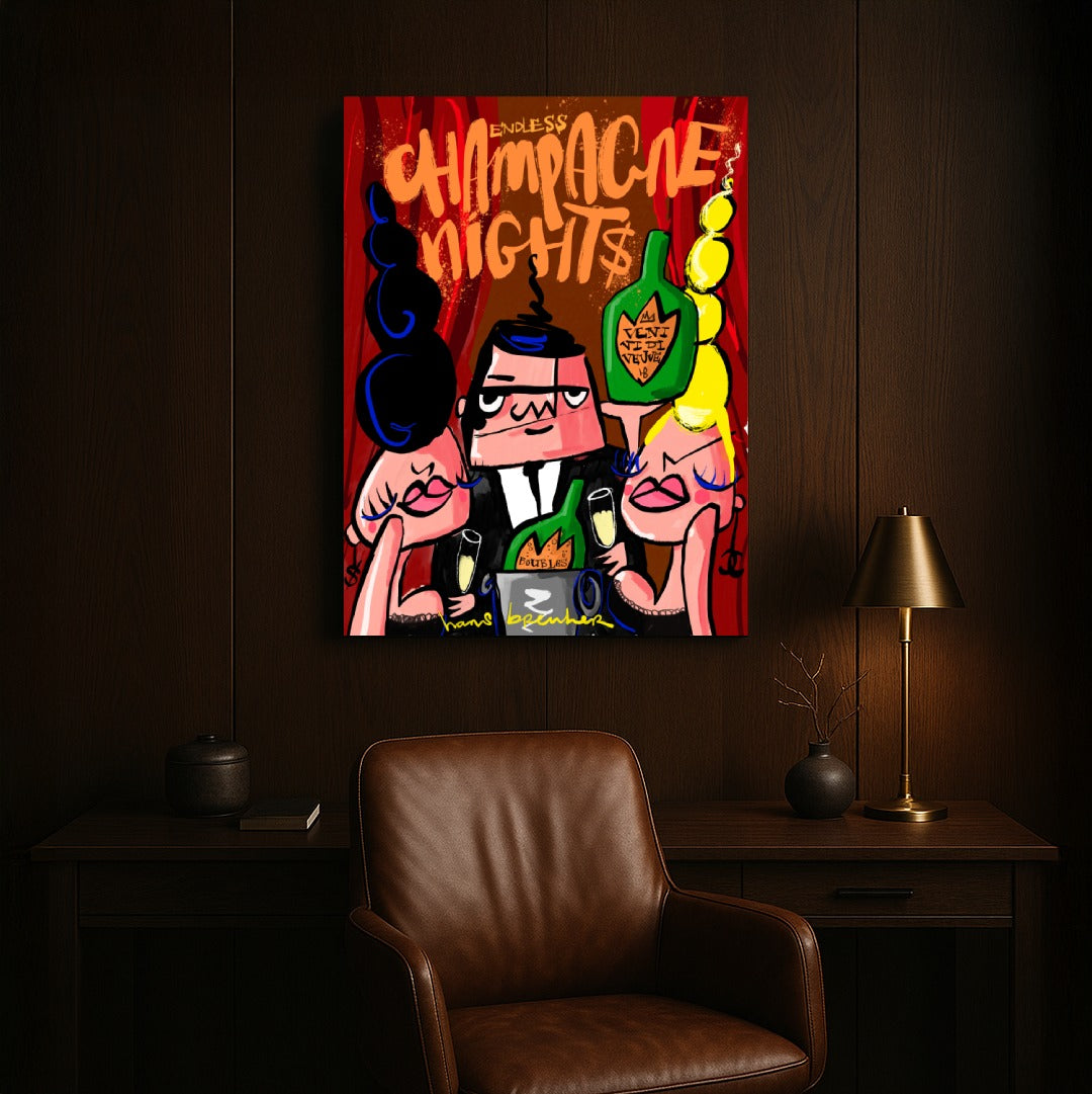 Endless Champagne Nights is een modern champagne schilderij dat luxe, nachtleven en succes viert in krachtige pop art stijl. Dit exclusieve kunstwerk van Hans Breuker combineert warme rode tinten, grafische lijnen en urban typografie tot een echte statement wanddecoratie.
