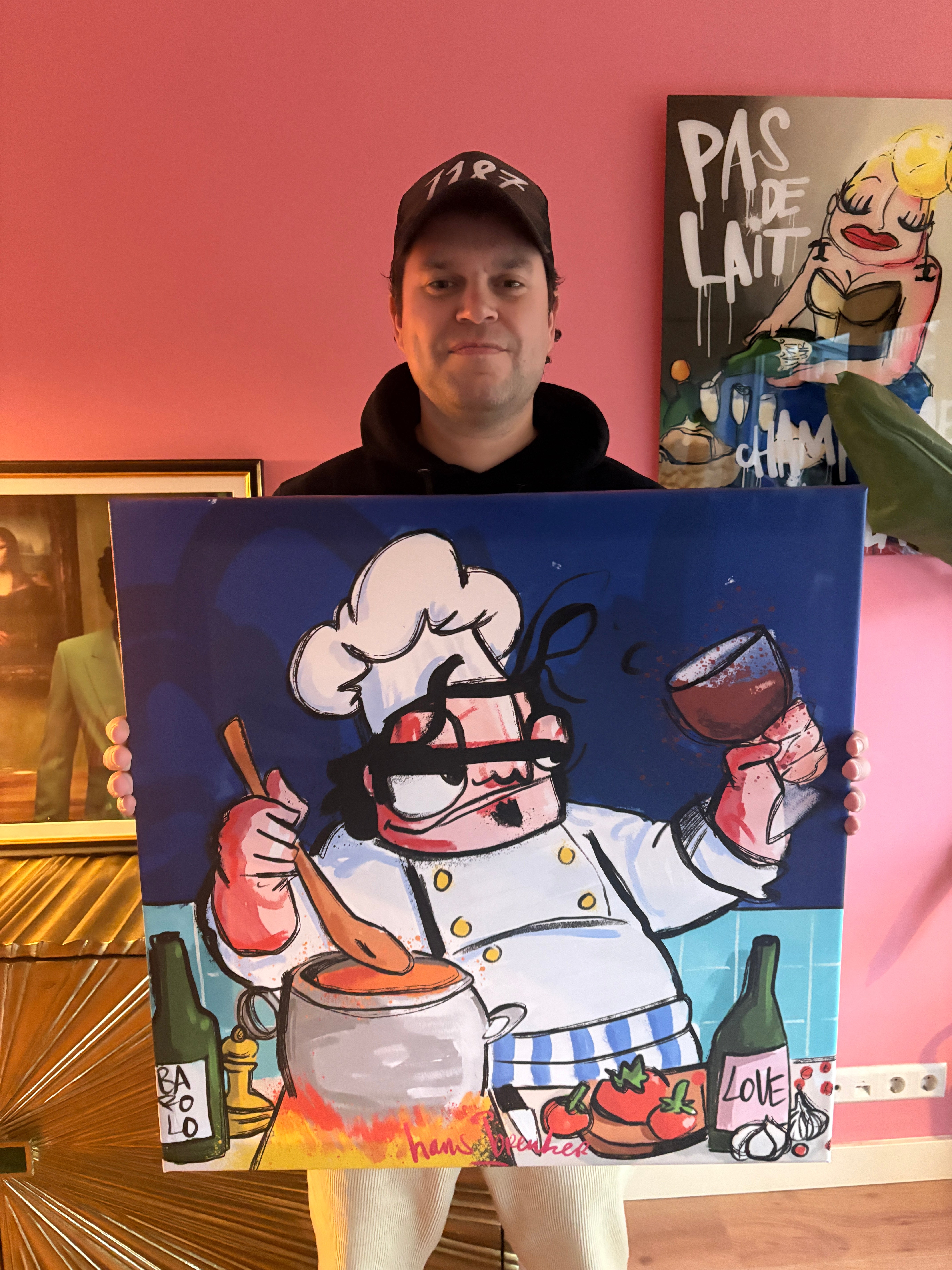 Discover "Wine for Dinner", a sparkling work of art from the Mad Chefs collection of Hans Breuker. This lively painting shows a voluptuous, crazy chef holding up a large glass of wine with great dedication, while he is happily cooking. The chef radiates an unprecedented energy, perfectly embodied in his playful attitude and passion for the culinary art.