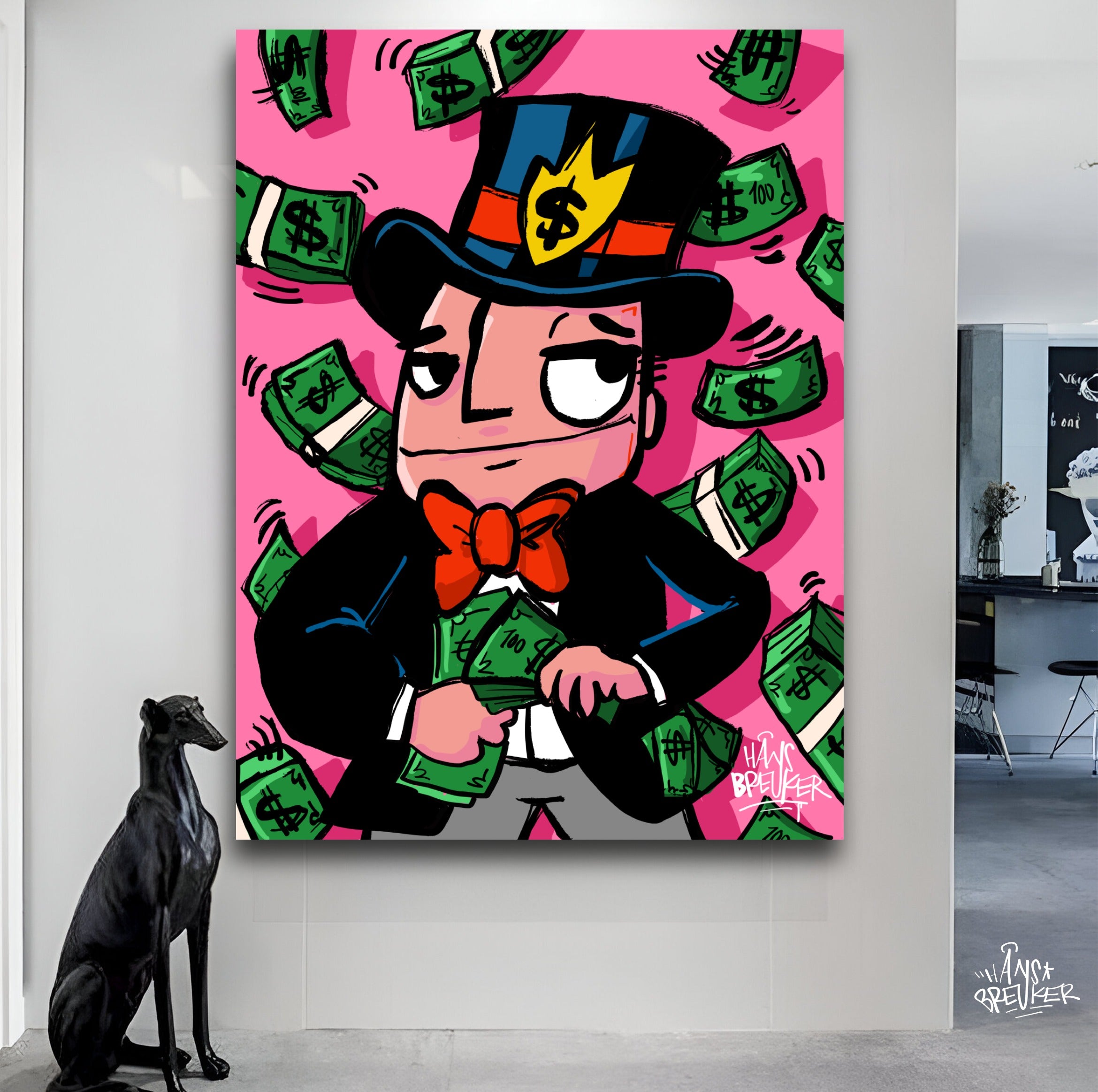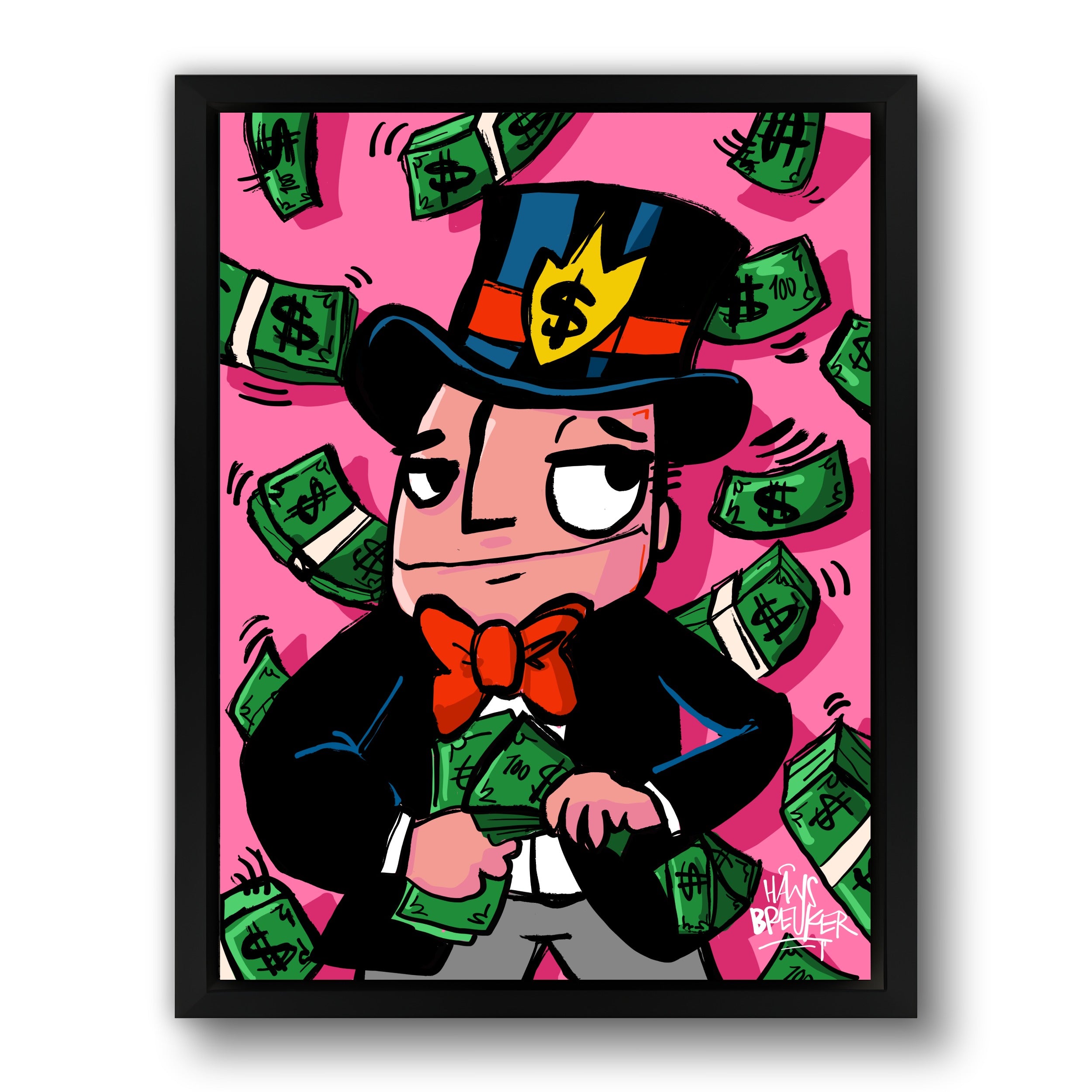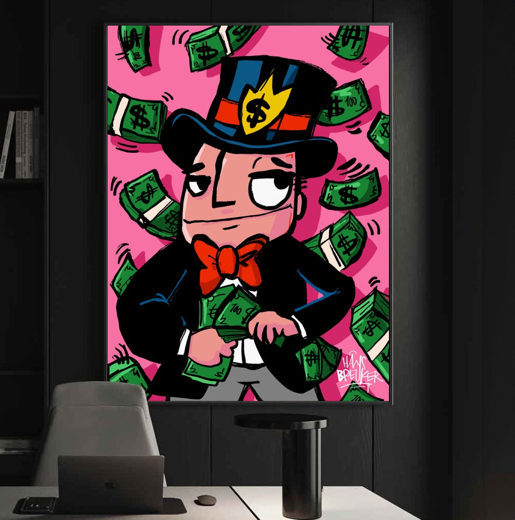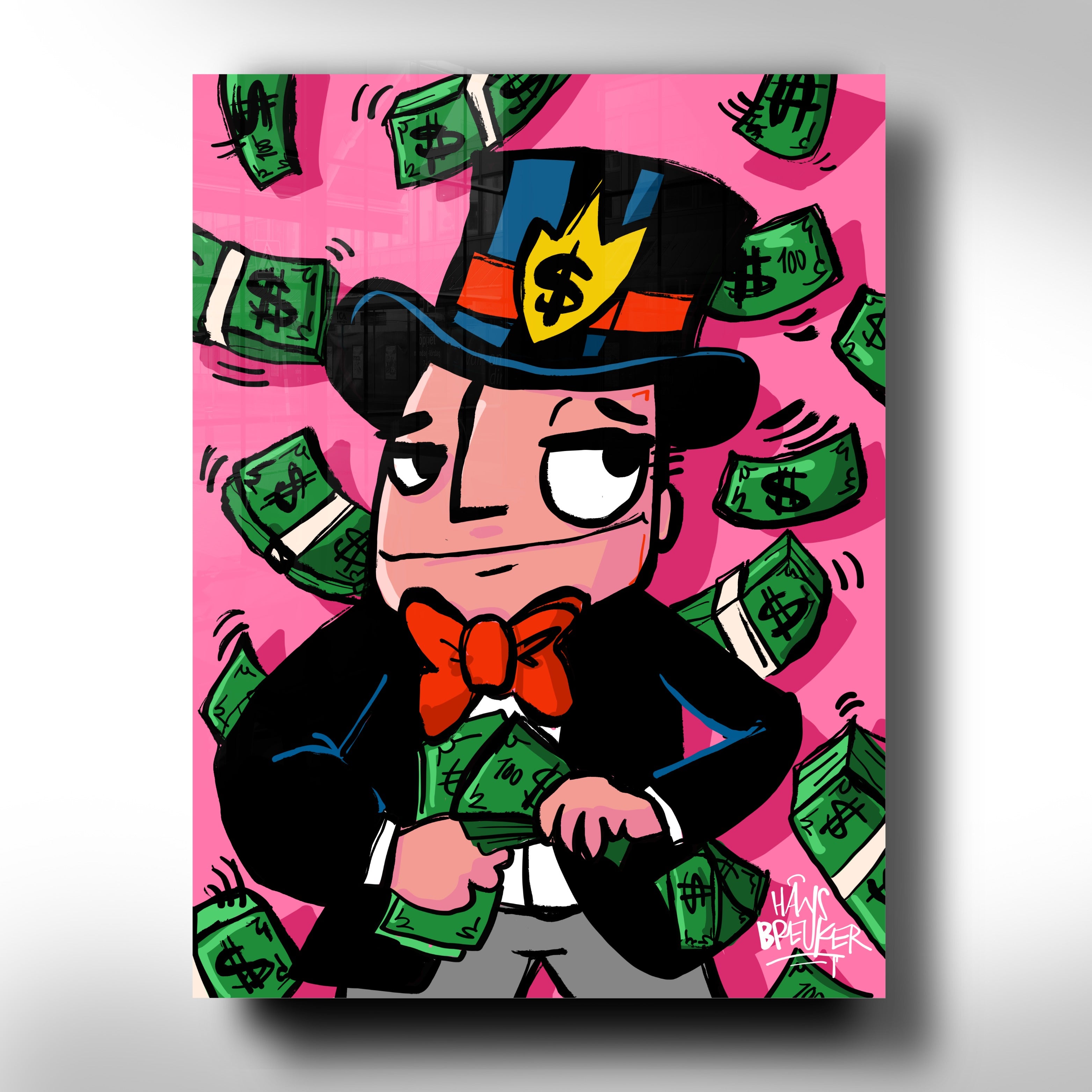 Hans Breuker brings another cracker of a piece of art to his pop art collection with "Cash Rain, Mr. Cash". This piece of art is a visual spectacle, perfect for lovers of bold and vibrant art.
