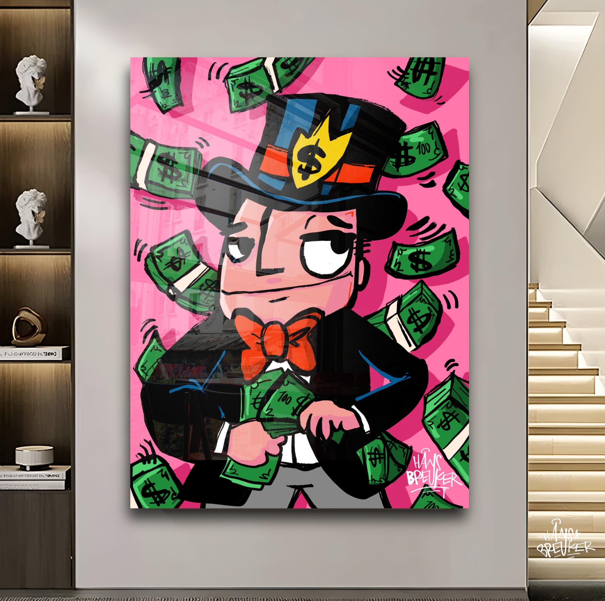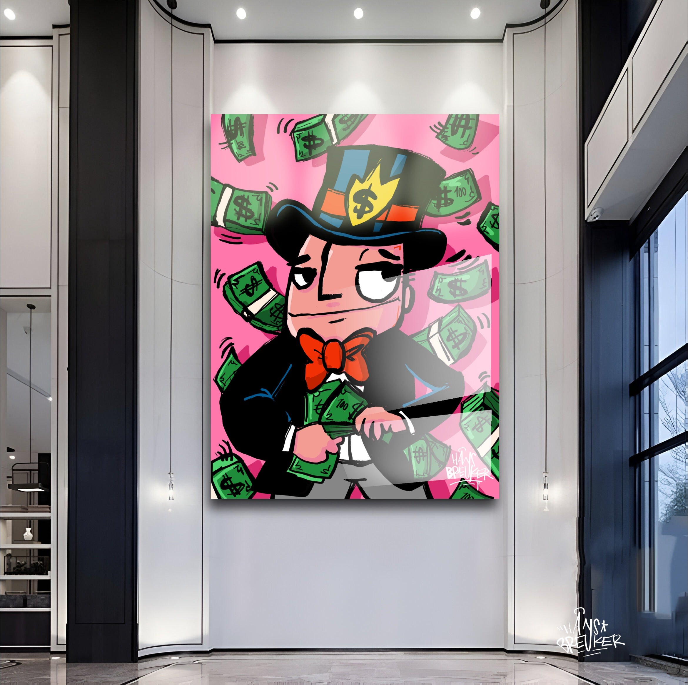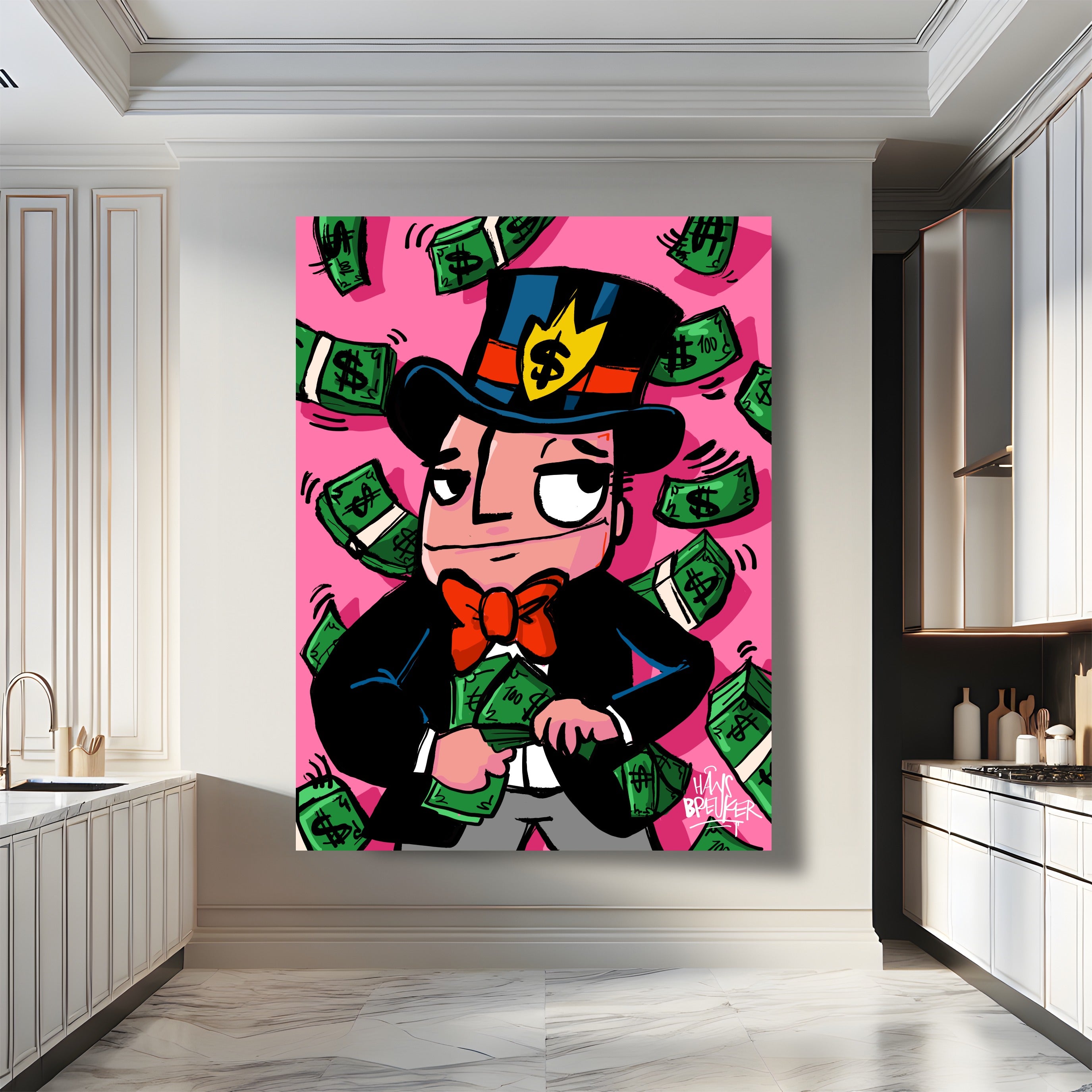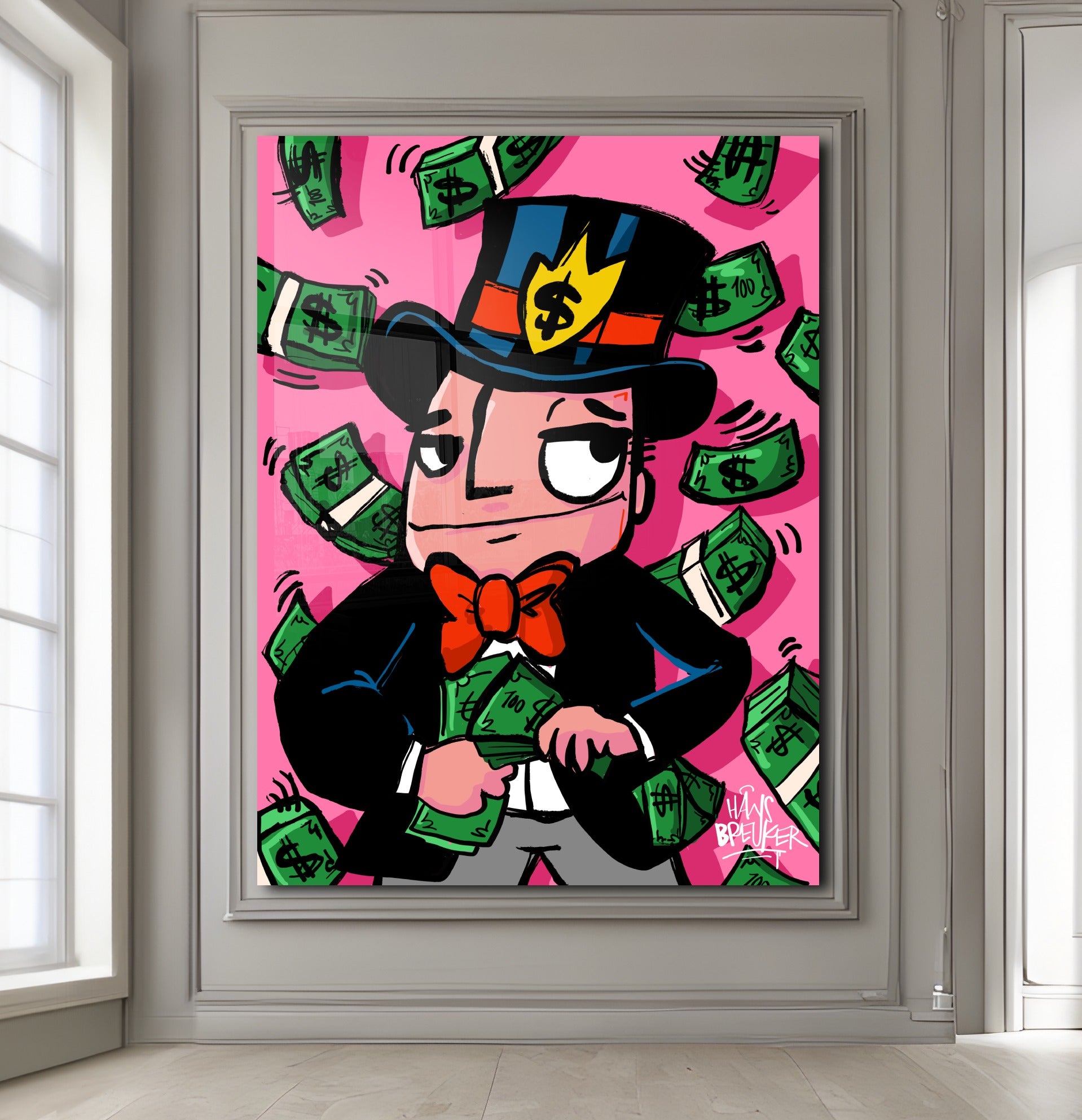 Hans Breuker brings another cracker of a piece of art to his pop art collection with "Cash Rain, Mr. Cash". This piece of art is a visual spectacle, perfect for lovers of bold and vibrant art.