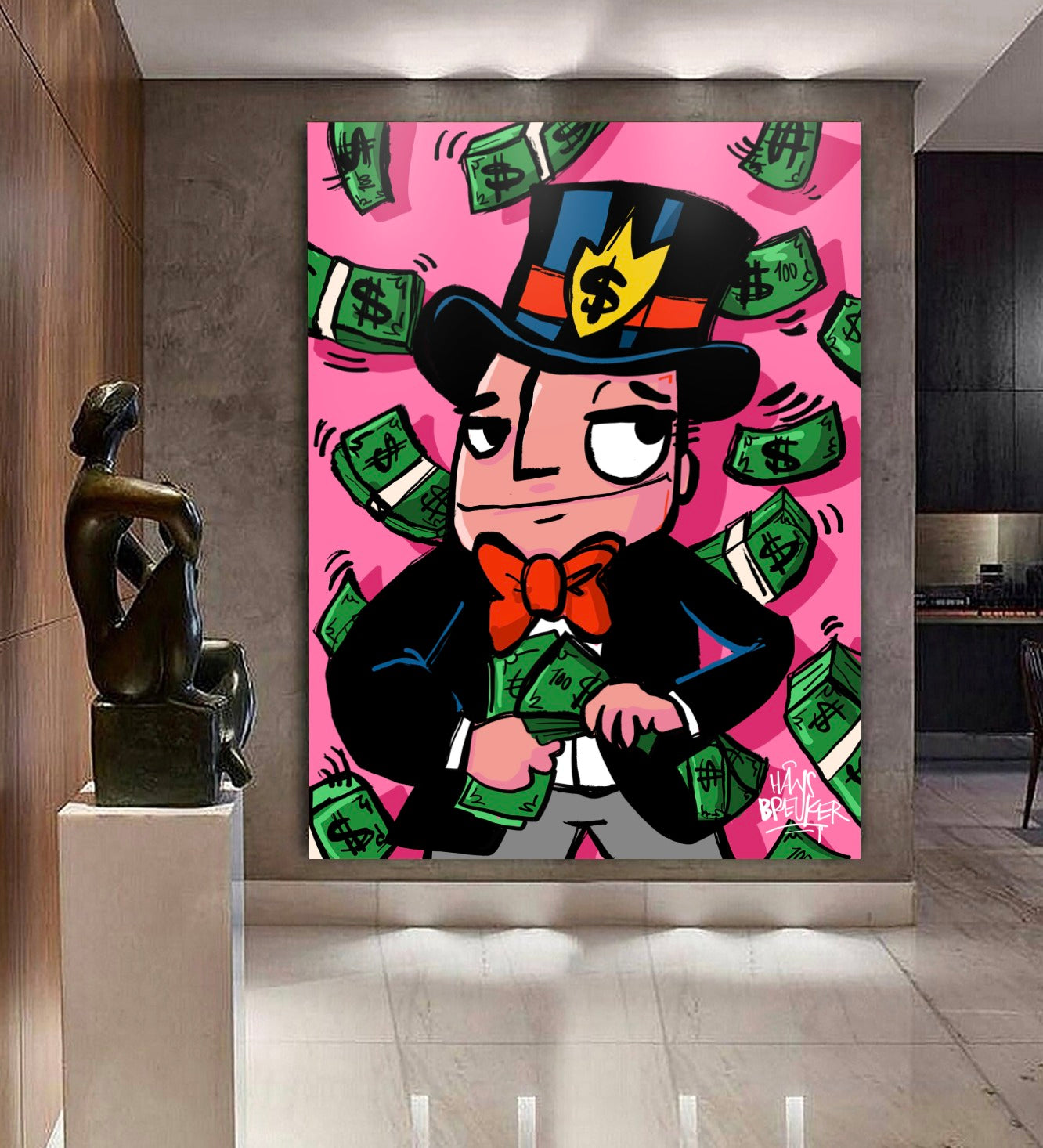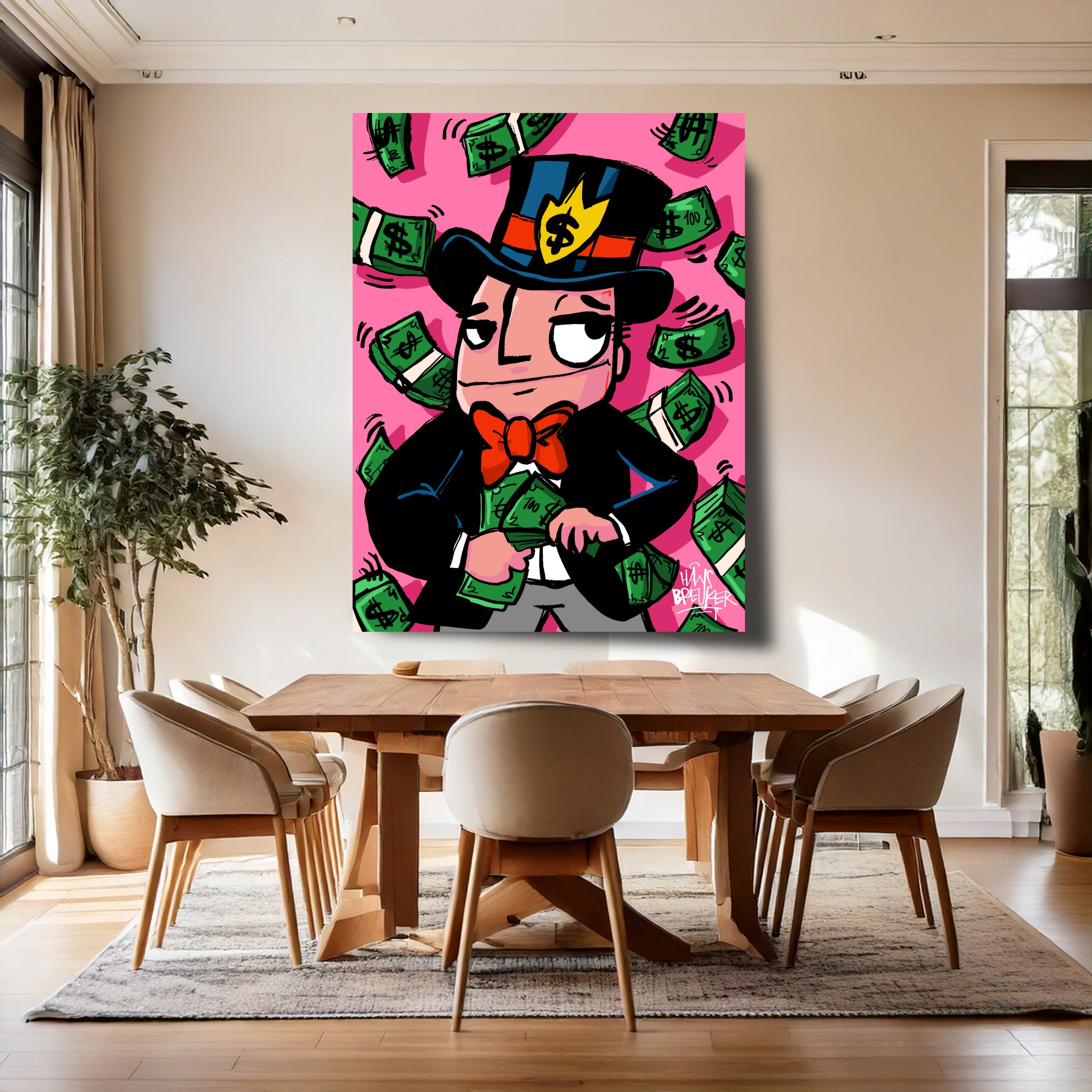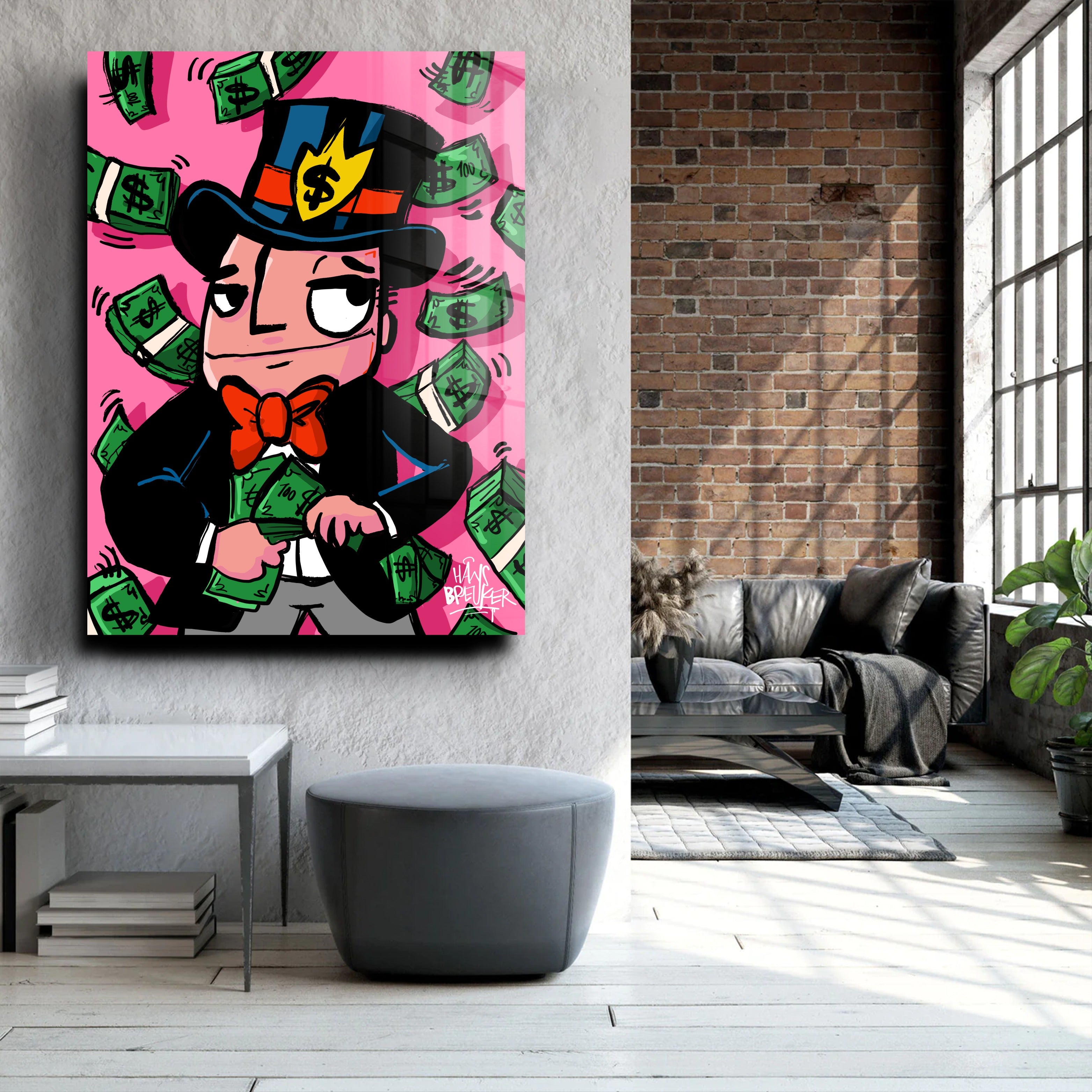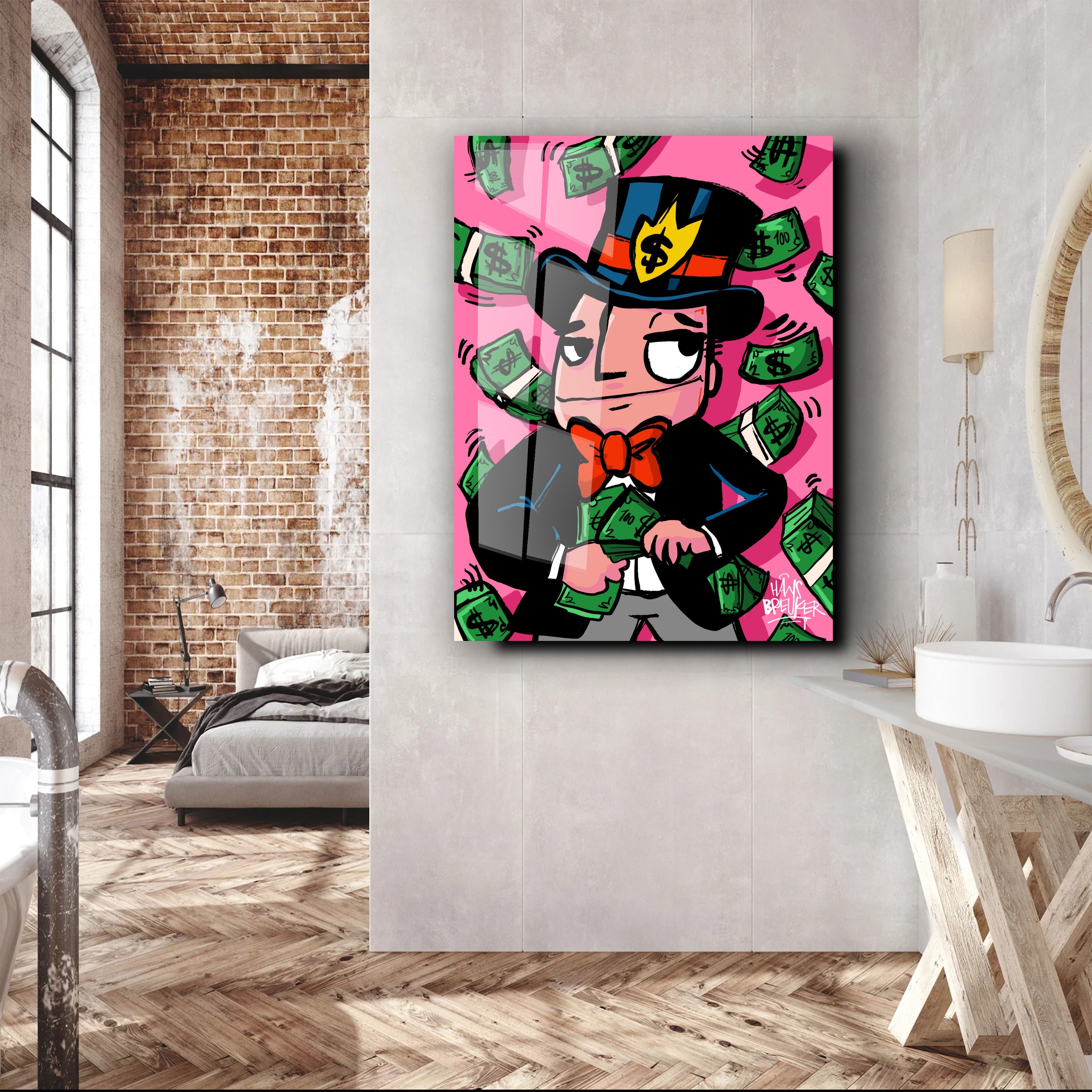 Hans Breuker brings another cracker of a piece of art to his pop art collection with "Cash Rain, Mr. Cash". This piece of art is a visual spectacle, perfect for lovers of bold and vibrant art.