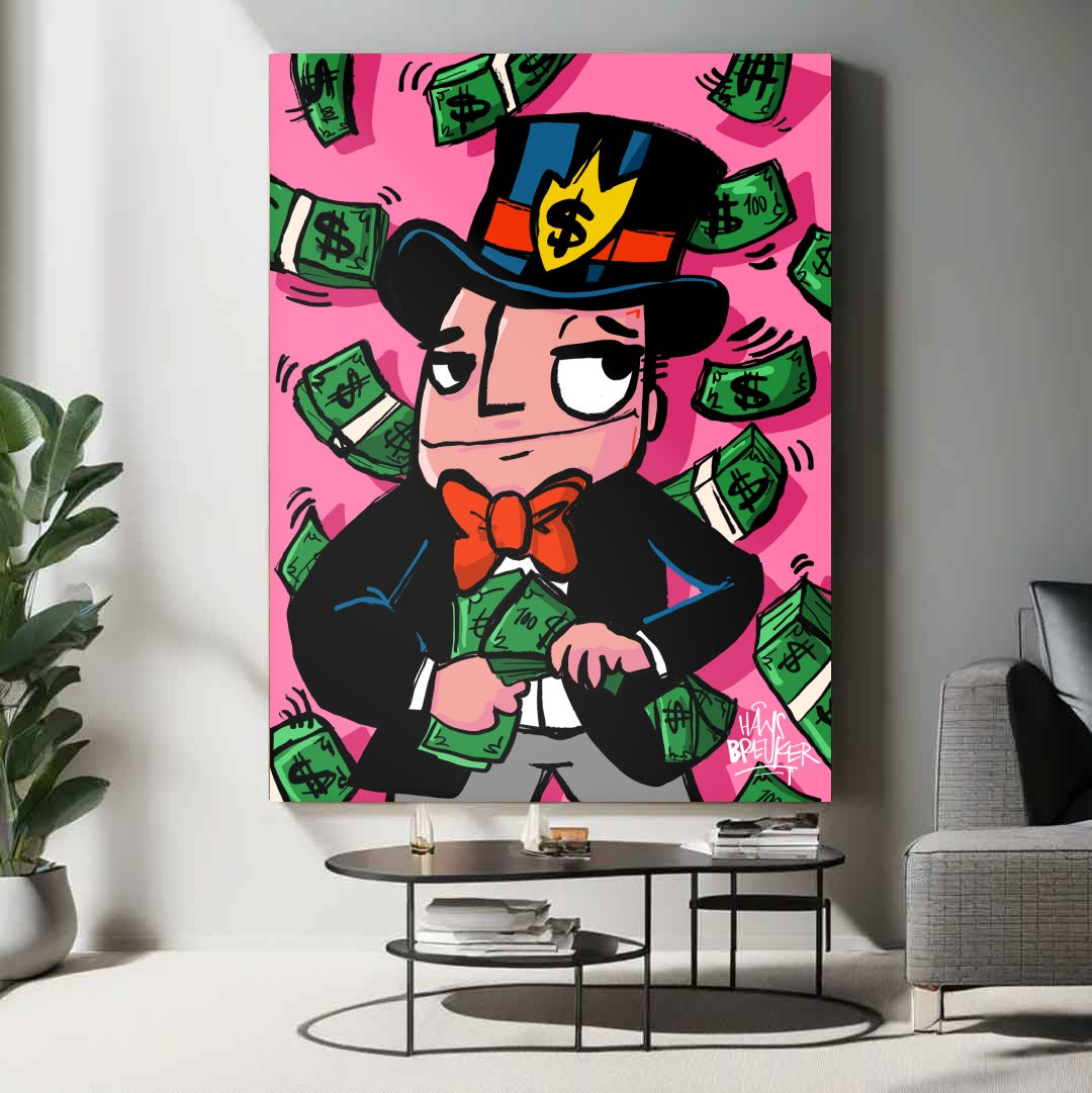 In "Cash Rain, Mr. Cash" we see Mr. Cash depicted wearing a top hat in classic English style, standing against a background that is bright pink. Dollar bills and wads of money flutter down around him, giving the entire artwork a dynamic and rich effect. The bright background and the detailed rendering of the money create an exciting contrast that immediately draws in and captivates the viewer.